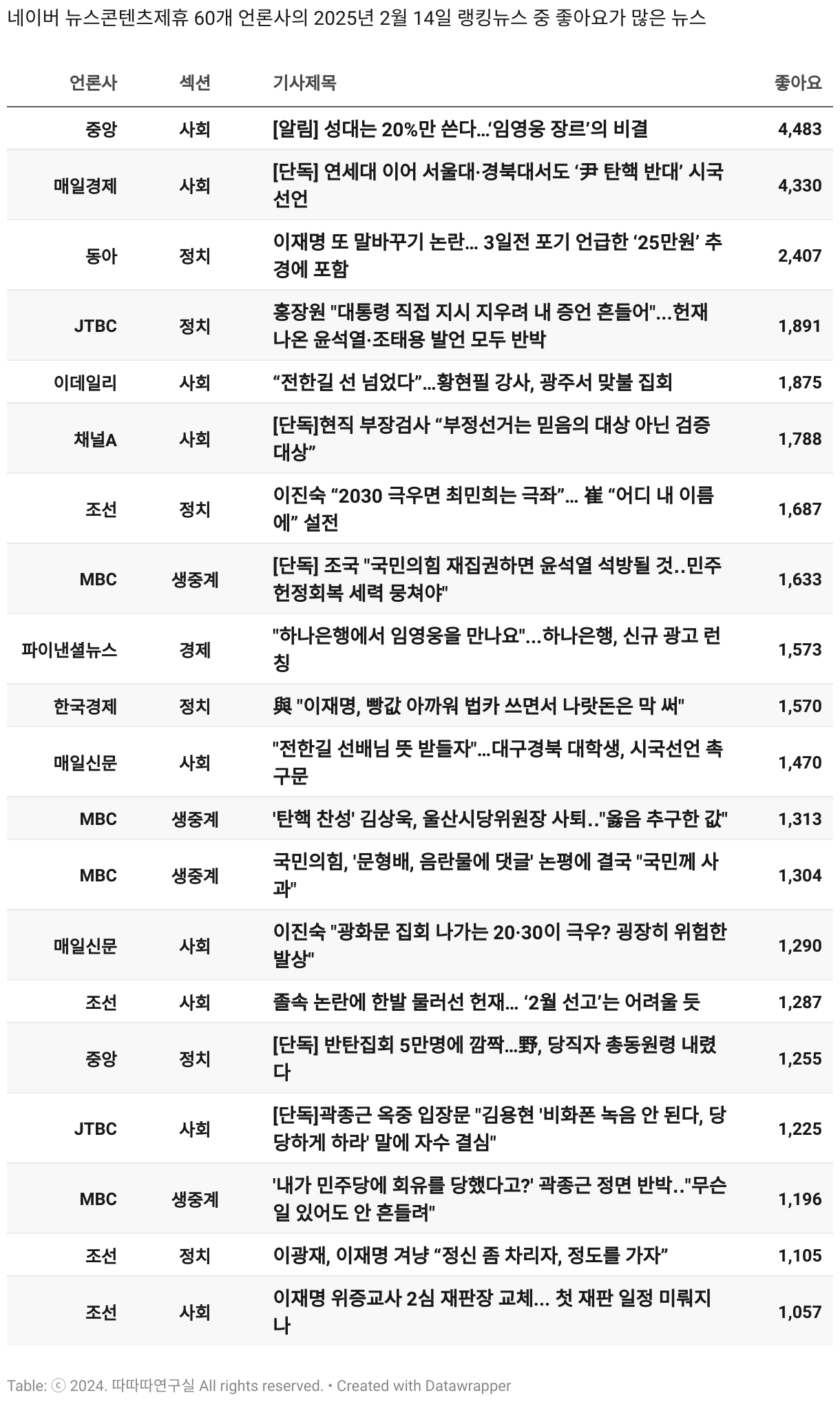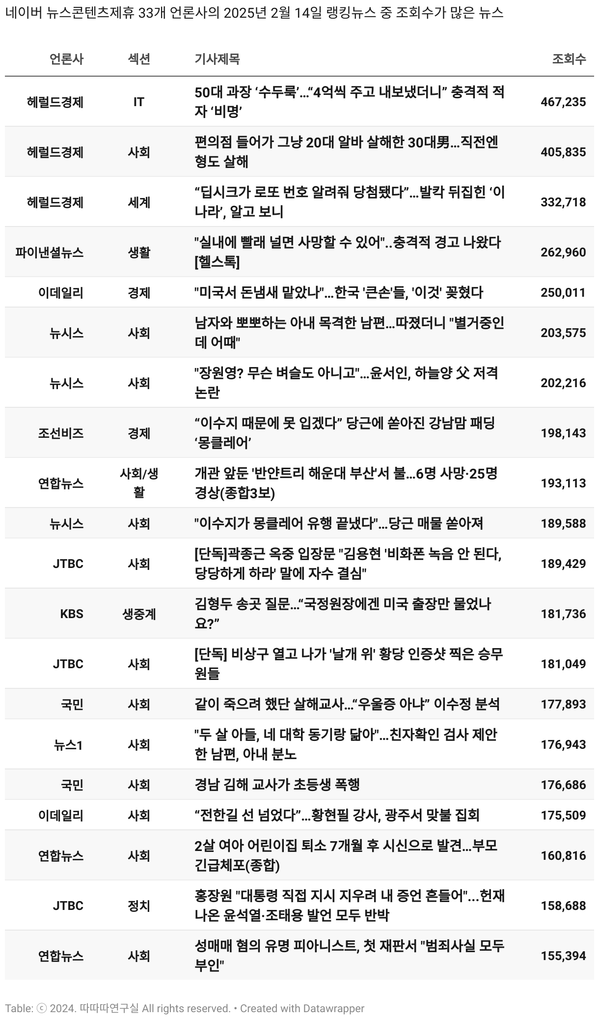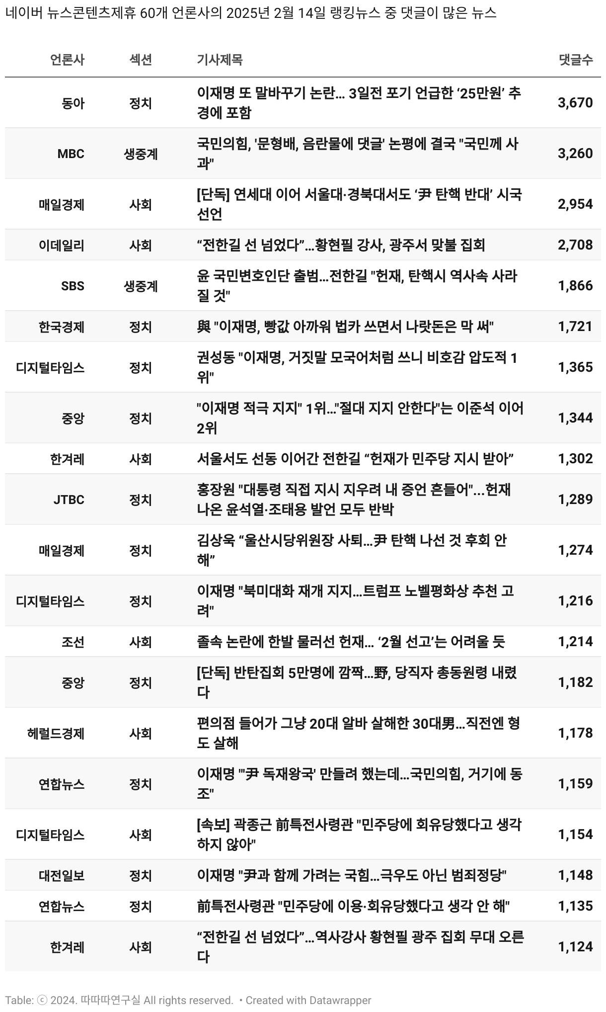 *데이터 수집 기간 : 2024년 6월 10일 *데이터 수집 대상 : 네이버 뉴스콘텐츠제휴 60개 언론사. 종합일간지 10개(경향신문, 국민일보, 동아일보, 문화일보, 서울신문, 세계일보, 조선일보, 중앙일보, 한겨레신문, 한국일보), 방송/통신사 14개(뉴스1, 뉴시스, 연합뉴스, 연합뉴스TV, 채널A, 한국경제TV, JTBC, KBS, MBC, MBN, SBS, SBS BIZ, TV조선, YTN), 경제지 11개(매일경제, 머니투데이, 비즈워치, 서울경제, 아시아경제, 이데일리, 조선비즈, 조세일보, 파이낸셜뉴스, 한국경제(유튜브제외), 헤럴드경제) 인터넷 8개(노컷뉴스, 더팩트, 데일리안, 머니S, 미디어오늘, 아이뉴스24, 오마이뉴스, 프레시안), IT 5개(디지털데일리,디지털타임스, 블로터, 전자신문, 지디넷코리아), 지역 12개(강원도민일보, 강원일보, 경기일보, 국제신문, 대구MBC, 대전일보, 매일신문, 부산일보, 전주MBC, CJB청주방송, JIBS, kbc광주방송)