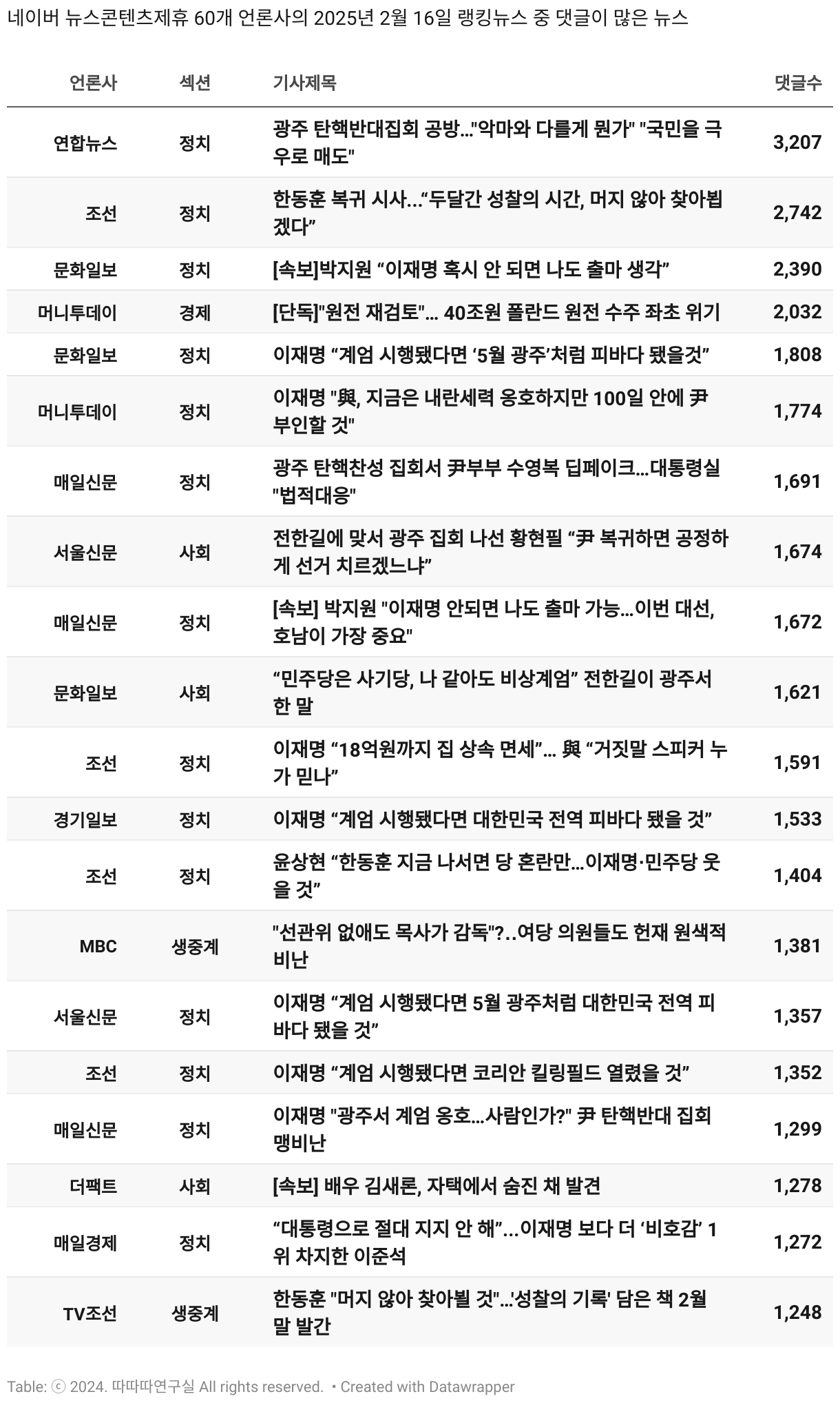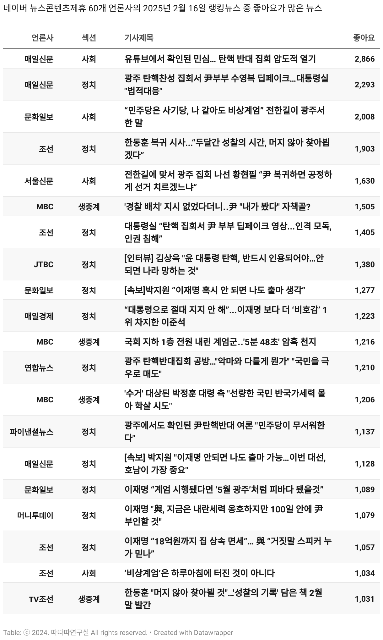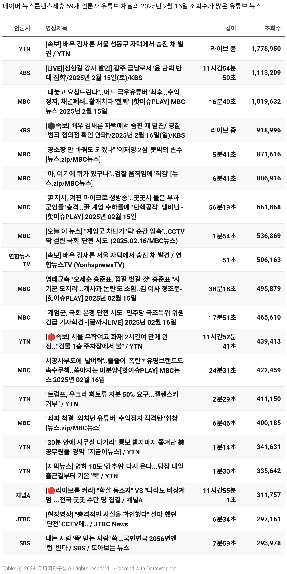 *데이터 수집 기간 : 2024년 6월 10일 *데이터 수집 대상 : 네이버 뉴스콘텐츠제휴 60개 언론사. 종합일간지 10개(경향신문, 국민일보, 동아일보, 문화일보, 서울신문, 세계일보, 조선일보, 중앙일보, 한겨레신문, 한국일보), 방송/통신사 14개(뉴스1, 뉴시스, 연합뉴스, 연합뉴스TV, 채널A, 한국경제TV, JTBC, KBS, MBC, MBN, SBS, SBS BIZ, TV조선, YTN), 경제지 11개(매일경제, 머니투데이, 비즈워치, 서울경제, 아시아경제, 이데일리, 조선비즈, 조세일보, 파이낸셜뉴스, 한국경제(유튜브제외), 헤럴드경제) 인터넷 8개(노컷뉴스, 더팩트, 데일리안, 머니S, 미디어오늘, 아이뉴스24, 오마이뉴스, 프레시안), IT 5개(디지털데일리,디지털타임스, 블로터, 전자신문, 지디넷코리아), 지역 12개(강원도민일보, 강원일보, 경기일보, 국제신문, 대구MBC, 대전일보, 매일신문, 부산일보, 전주MBC, CJB청주방송, JIBS, kbc광주방송)