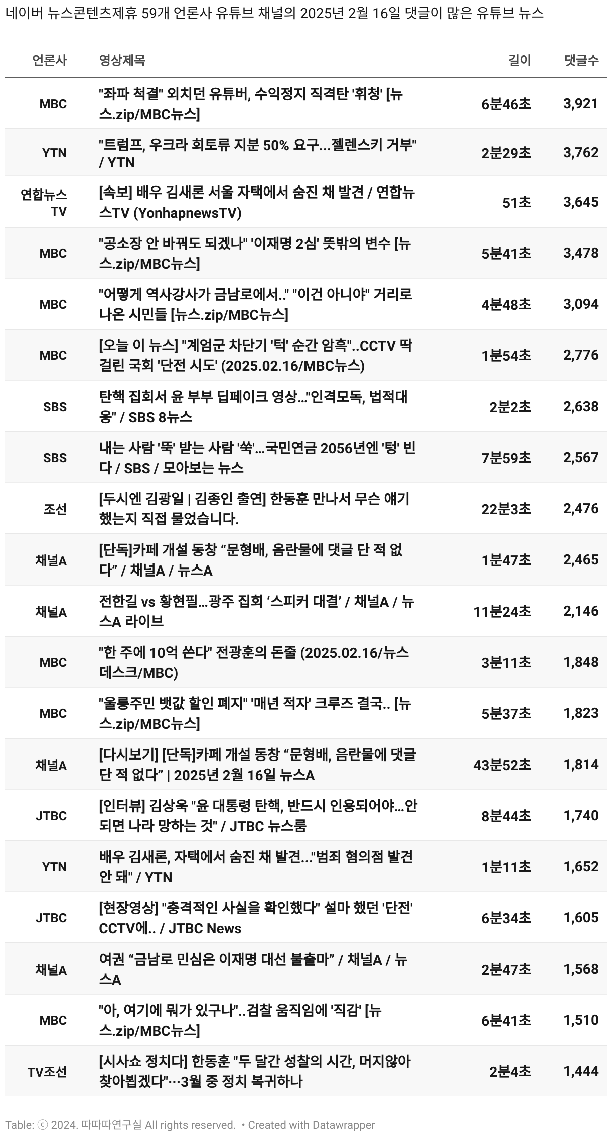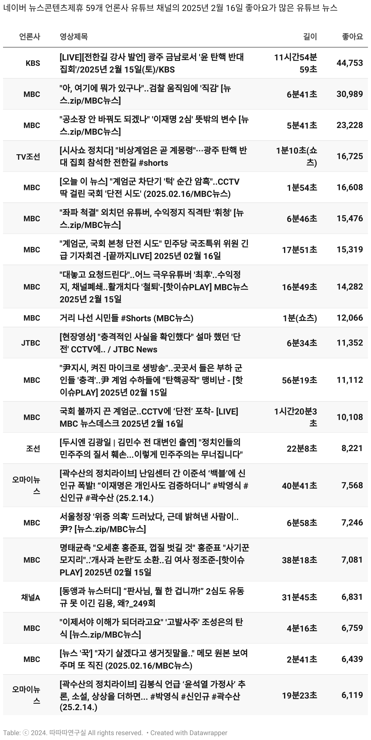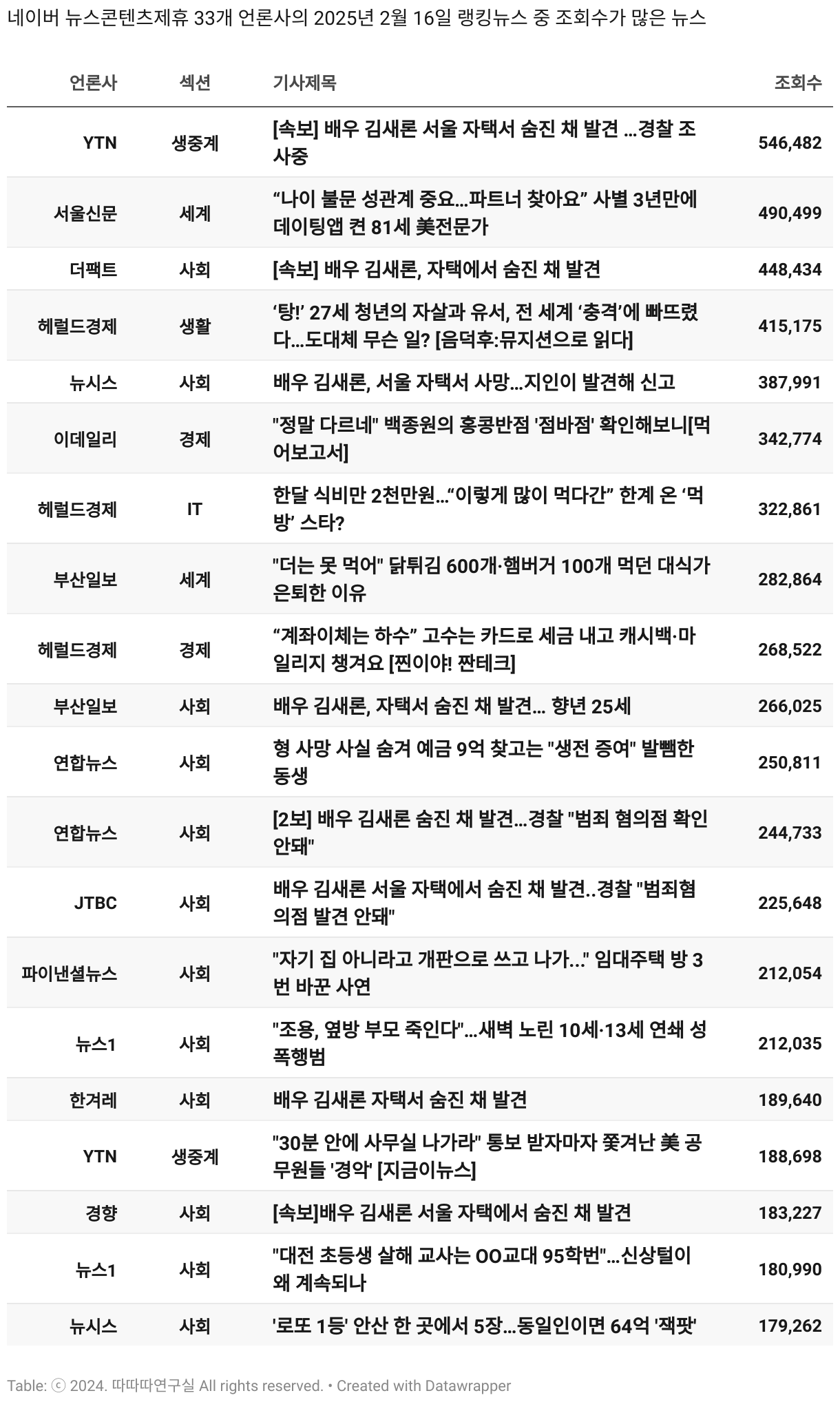 *데이터 수집 기간 : 2024년 6월 10일 *데이터 수집 대상 : 네이버 뉴스콘텐츠제휴 60개 언론사. 종합일간지 10개(경향신문, 국민일보, 동아일보, 문화일보, 서울신문, 세계일보, 조선일보, 중앙일보, 한겨레신문, 한국일보), 방송/통신사 14개(뉴스1, 뉴시스, 연합뉴스, 연합뉴스TV, 채널A, 한국경제TV, JTBC, KBS, MBC, MBN, SBS, SBS BIZ, TV조선, YTN), 경제지 11개(매일경제, 머니투데이, 비즈워치, 서울경제, 아시아경제, 이데일리, 조선비즈, 조세일보, 파이낸셜뉴스, 한국경제(유튜브제외), 헤럴드경제) 인터넷 8개(노컷뉴스, 더팩트, 데일리안, 머니S, 미디어오늘, 아이뉴스24, 오마이뉴스, 프레시안), IT 5개(디지털데일리,디지털타임스, 블로터, 전자신문, 지디넷코리아), 지역 12개(강원도민일보, 강원일보, 경기일보, 국제신문, 대구MBC, 대전일보, 매일신문, 부산일보, 전주MBC, CJB청주방송, JIBS, kbc광주방송)