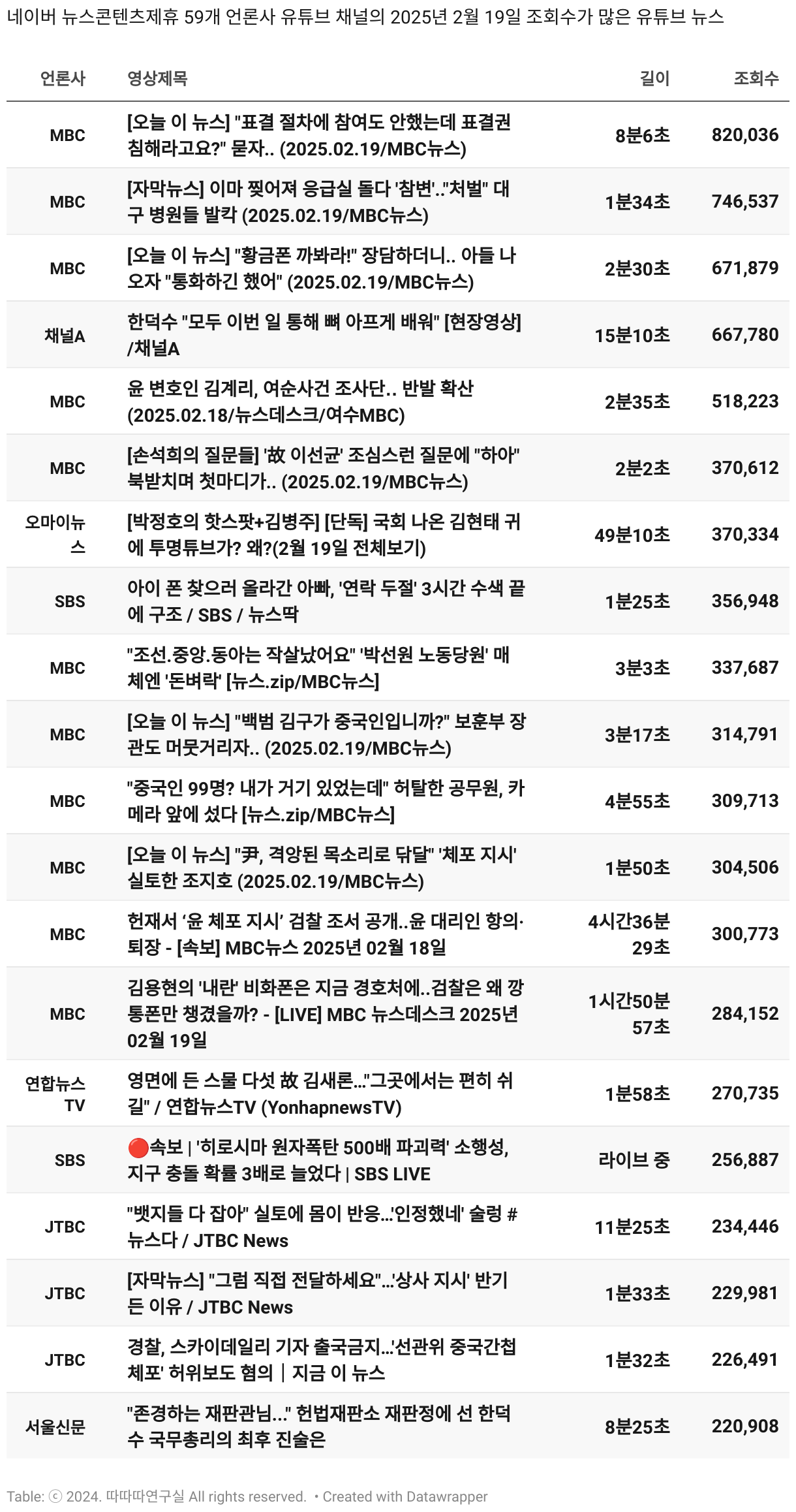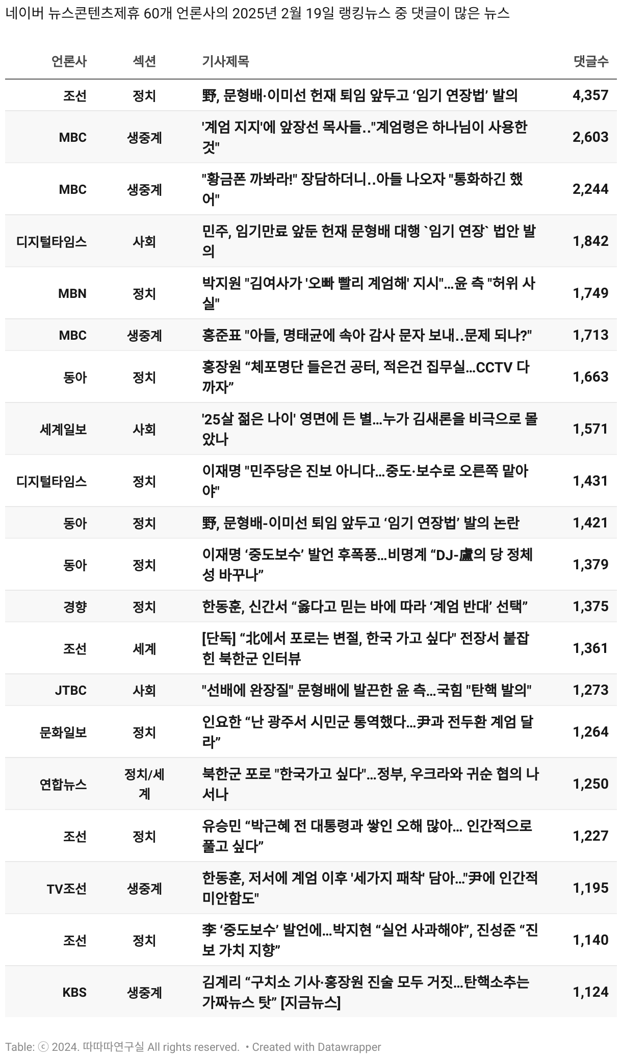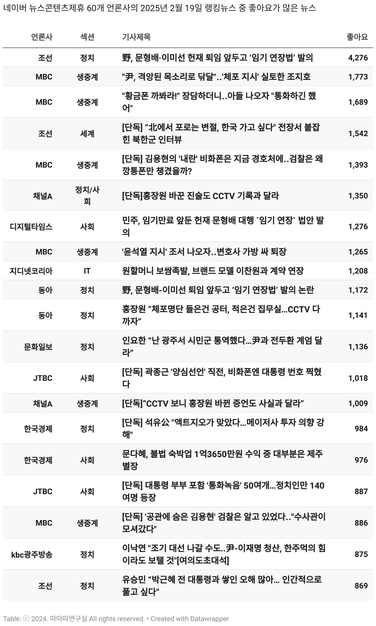 *데이터 수집 기간 : 2024년 6월 10일 *데이터 수집 대상 : 네이버 뉴스콘텐츠제휴 60개 언론사. 종합일간지 10개(경향신문, 국민일보, 동아일보, 문화일보, 서울신문, 세계일보, 조선일보, 중앙일보, 한겨레신문, 한국일보), 방송/통신사 14개(뉴스1, 뉴시스, 연합뉴스, 연합뉴스TV, 채널A, 한국경제TV, JTBC, KBS, MBC, MBN, SBS, SBS BIZ, TV조선, YTN), 경제지 11개(매일경제, 머니투데이, 비즈워치, 서울경제, 아시아경제, 이데일리, 조선비즈, 조세일보, 파이낸셜뉴스, 한국경제(유튜브제외), 헤럴드경제) 인터넷 8개(노컷뉴스, 더팩트, 데일리안, 머니S, 미디어오늘, 아이뉴스24, 오마이뉴스, 프레시안), IT 5개(디지털데일리,디지털타임스, 블로터, 전자신문, 지디넷코리아), 지역 12개(강원도민일보, 강원일보, 경기일보, 국제신문, 대구MBC, 대전일보, 매일신문, 부산일보, 전주MBC, CJB청주방송, JIBS, kbc광주방송)