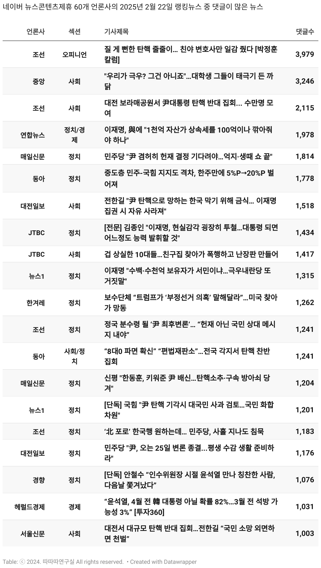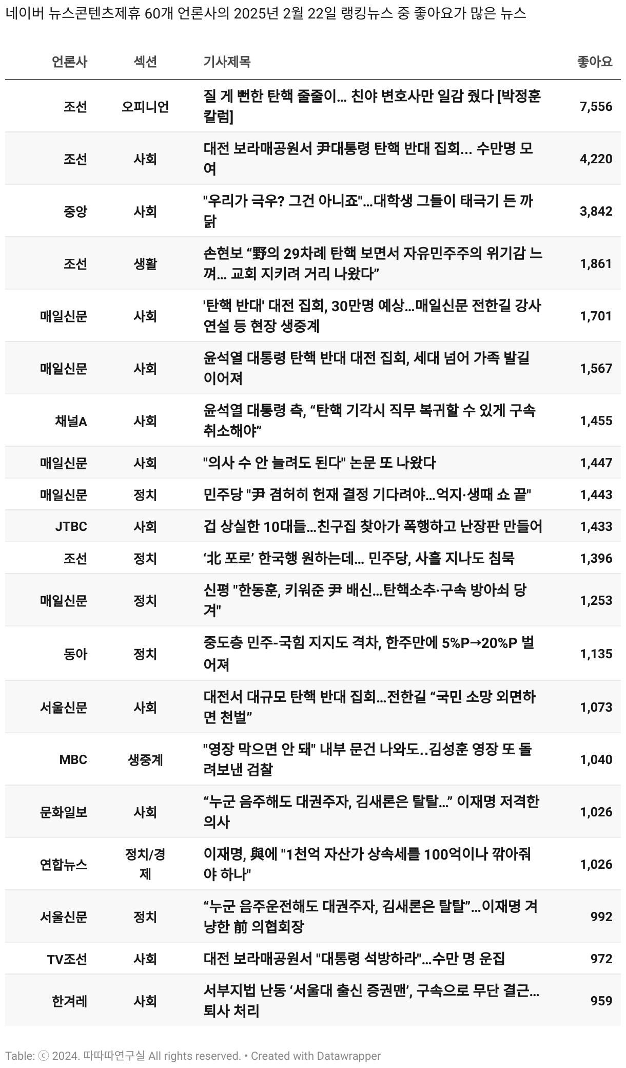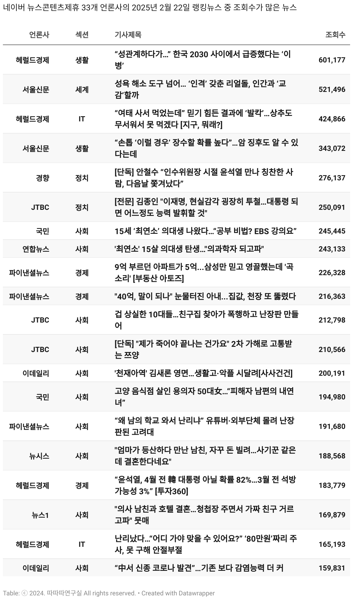 *데이터 수집 기간 : 2024년 6월 10일 *데이터 수집 대상 : 네이버 뉴스콘텐츠제휴 60개 언론사. 종합일간지 10개(경향신문, 국민일보, 동아일보, 문화일보, 서울신문, 세계일보, 조선일보, 중앙일보, 한겨레신문, 한국일보), 방송/통신사 14개(뉴스1, 뉴시스, 연합뉴스, 연합뉴스TV, 채널A, 한국경제TV, JTBC, KBS, MBC, MBN, SBS, SBS BIZ, TV조선, YTN), 경제지 11개(매일경제, 머니투데이, 비즈워치, 서울경제, 아시아경제, 이데일리, 조선비즈, 조세일보, 파이낸셜뉴스, 한국경제(유튜브제외), 헤럴드경제) 인터넷 8개(노컷뉴스, 더팩트, 데일리안, 머니S, 미디어오늘, 아이뉴스24, 오마이뉴스, 프레시안), IT 5개(디지털데일리,디지털타임스, 블로터, 전자신문, 지디넷코리아), 지역 12개(강원도민일보, 강원일보, 경기일보, 국제신문, 대구MBC, 대전일보, 매일신문, 부산일보, 전주MBC, CJB청주방송, JIBS, kbc광주방송)