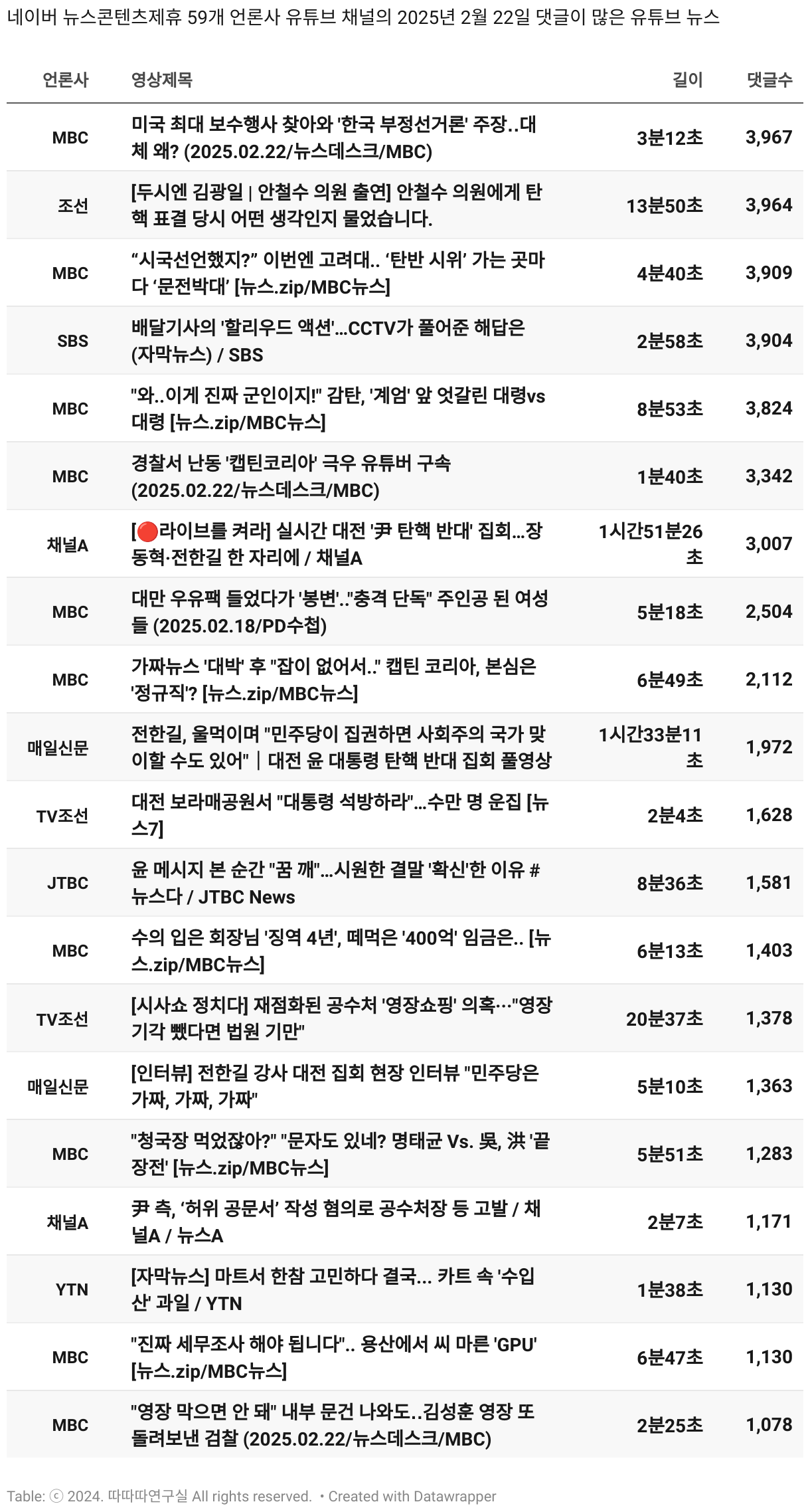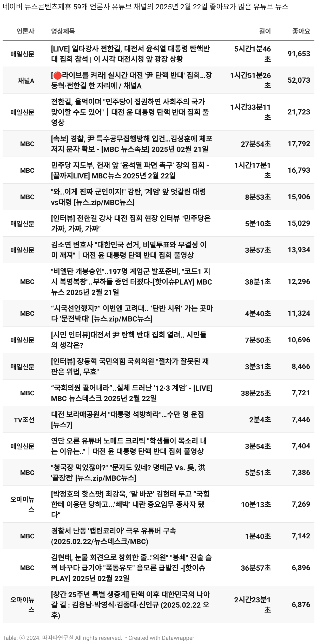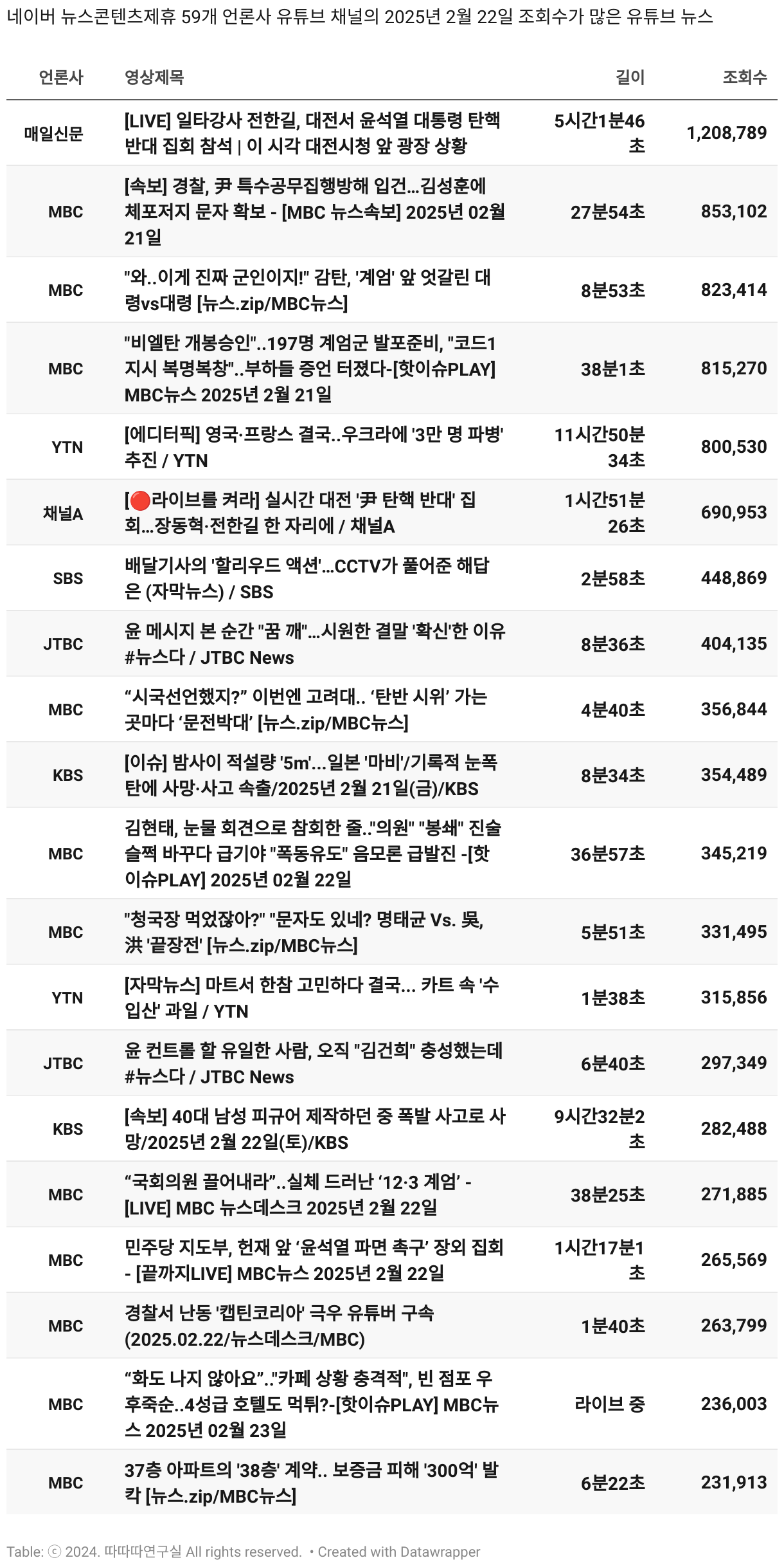*데이터 수집 기간 : 2024년 6월 10일 *데이터 수집 대상 : 네이버 뉴스콘텐츠제휴 60개 언론사. 종합일간지 10개(경향신문, 국민일보, 동아일보, 문화일보, 서울신문, 세계일보, 조선일보, 중앙일보, 한겨레신문, 한국일보), 방송/통신사 14개(뉴스1, 뉴시스, 연합뉴스, 연합뉴스TV, 채널A, 한국경제TV, JTBC, KBS, MBC, MBN, SBS, SBS BIZ, TV조선, YTN), 경제지 11개(매일경제, 머니투데이, 비즈워치, 서울경제, 아시아경제, 이데일리, 조선비즈, 조세일보, 파이낸셜뉴스, 한국경제(유튜브제외), 헤럴드경제) 인터넷 8개(노컷뉴스, 더팩트, 데일리안, 머니S, 미디어오늘, 아이뉴스24, 오마이뉴스, 프레시안), IT 5개(디지털데일리,디지털타임스, 블로터, 전자신문, 지디넷코리아), 지역 12개(강원도민일보, 강원일보, 경기일보, 국제신문, 대구MBC, 대전일보, 매일신문, 부산일보, 전주MBC, CJB청주방송, JIBS, kbc광주방송)