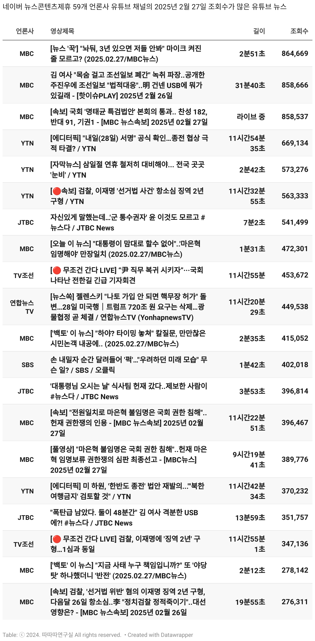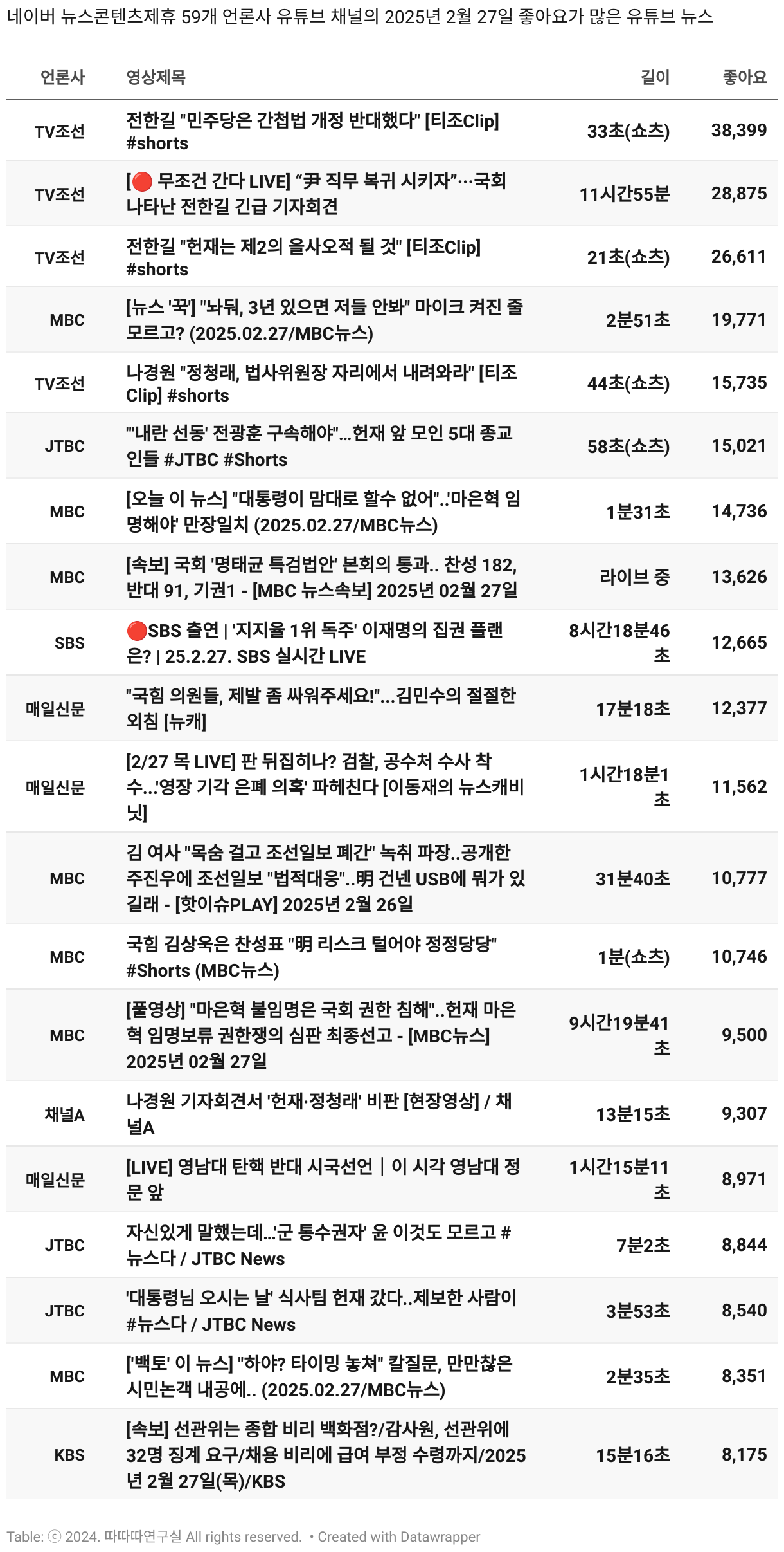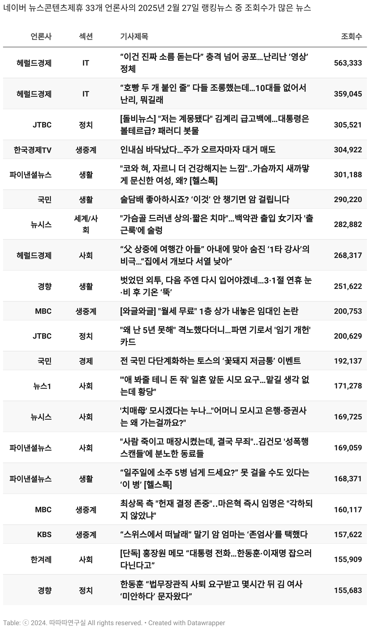 2025년 02월 28일 읽는데 107분 걸림 일간분석 일간 흥한 뉴스 - 2월 27일 목요일 네이버와 유튜브 뉴스 데이터로 매일매일 흥한 뉴스를 확인해보세요! 댓글수 조회수 좋아요 댓글수 조회수 좋아요 따따따연구실의 멤버가 되어주세요! 새로운 미디어 분석 소식을 업데이트 해 드립니다. 회원가입 Email sent! Check your inbox to complete your signup.