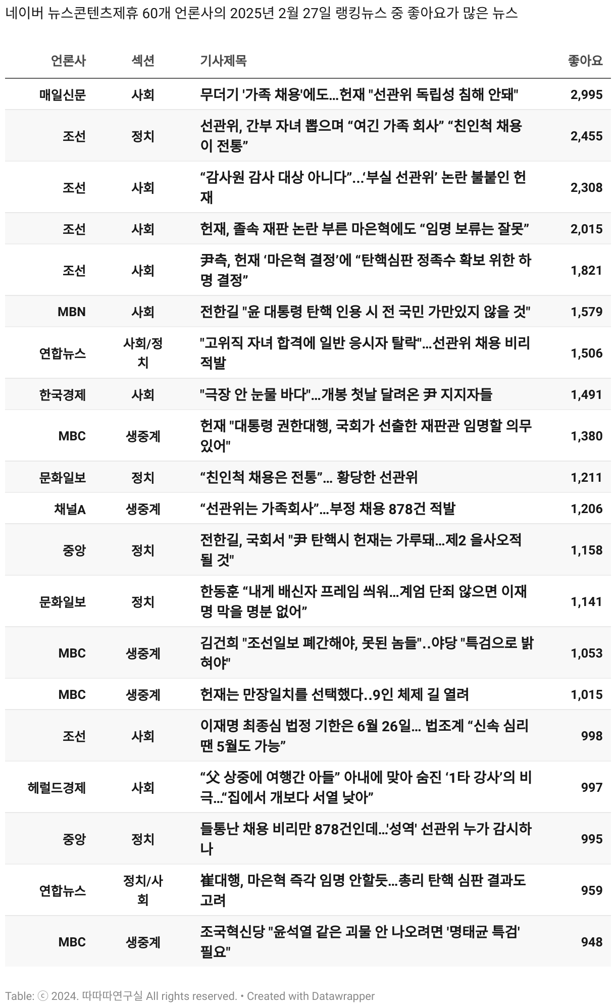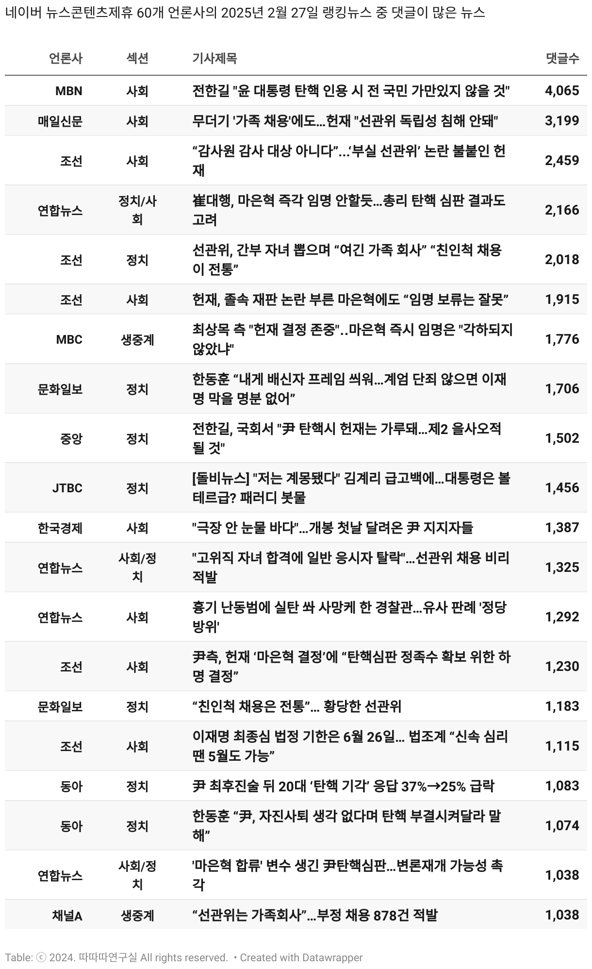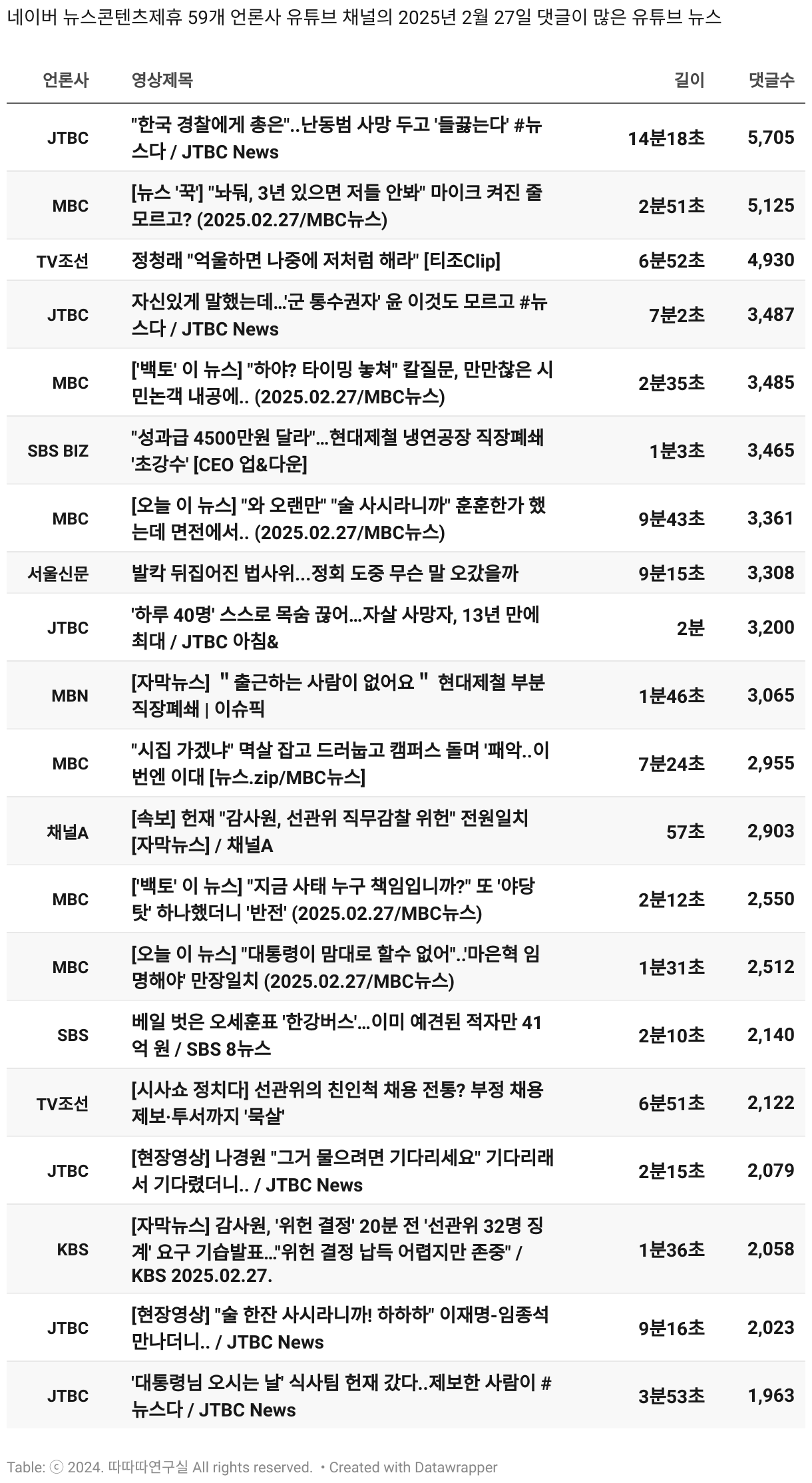 2025년 02월 28일 읽는데 107분 걸림 일간분석 일간 흥한 뉴스 - 2월 27일 목요일 네이버와 유튜브 뉴스 데이터로 매일매일 흥한 뉴스를 확인해보세요! 댓글수 조회수 좋아요 댓글수 조회수 좋아요 따따따연구실의 멤버가 되어주세요! 새로운 미디어 분석 소식을 업데이트 해 드립니다. 회원가입 Email sent! Check your inbox to complete your signup.