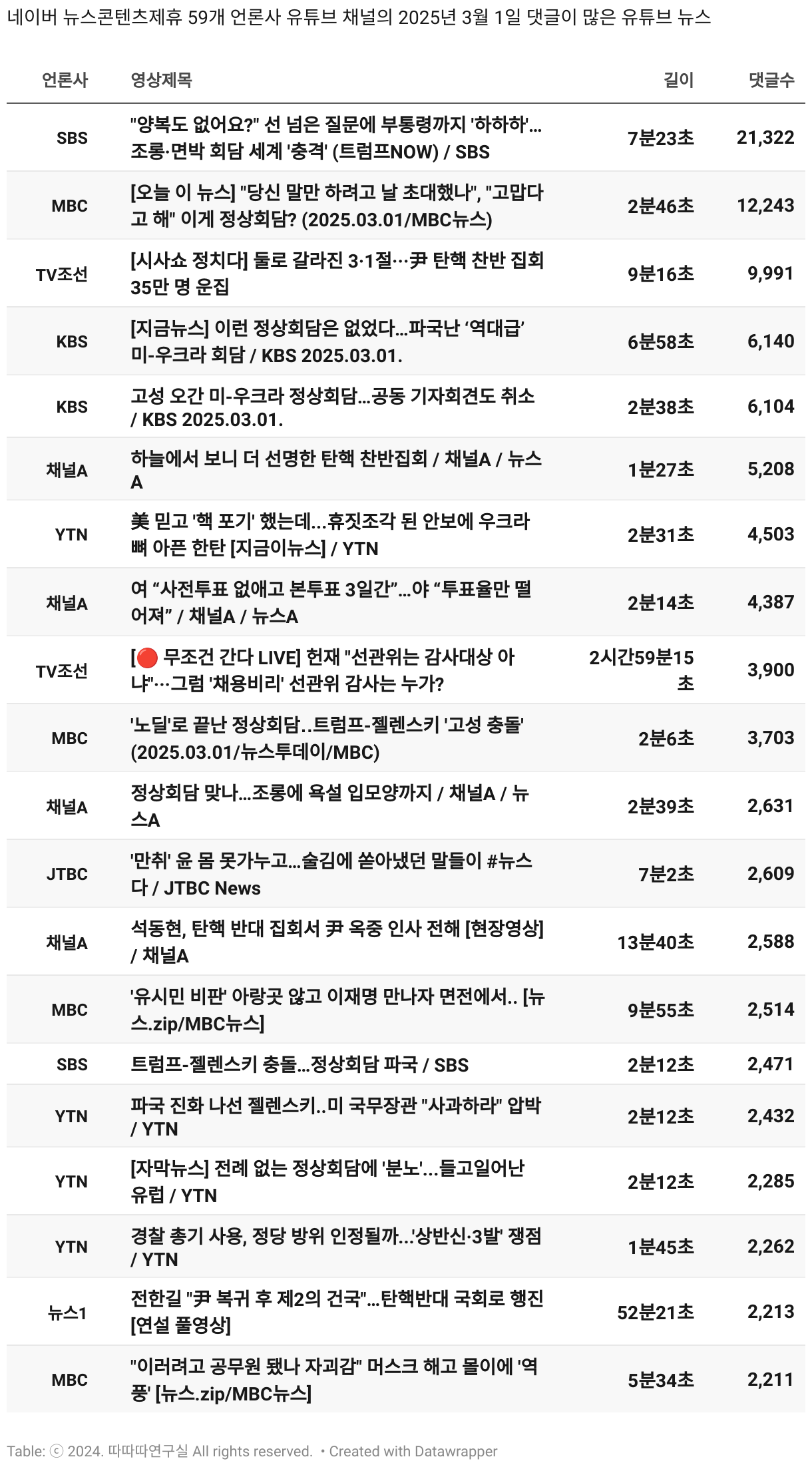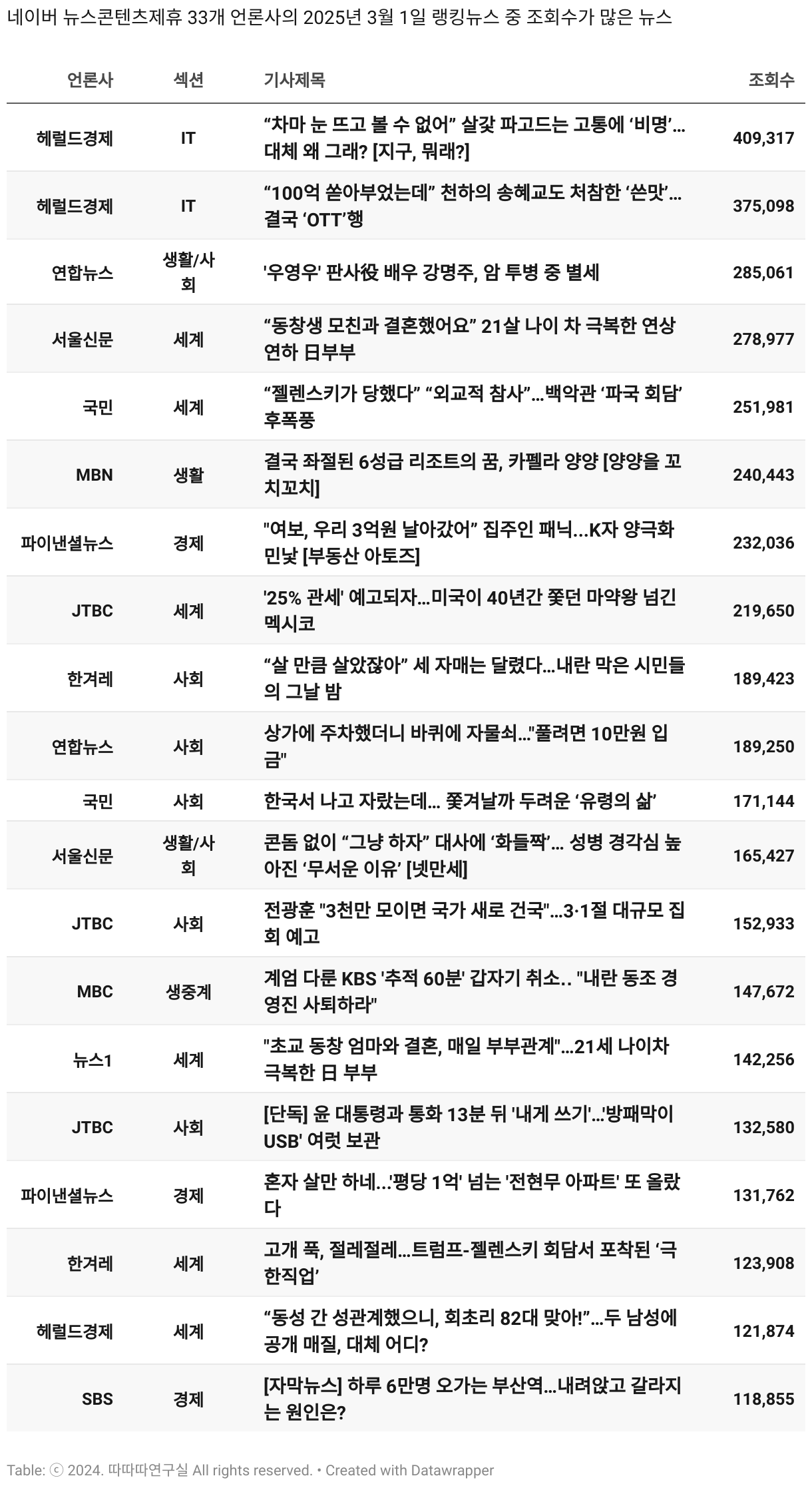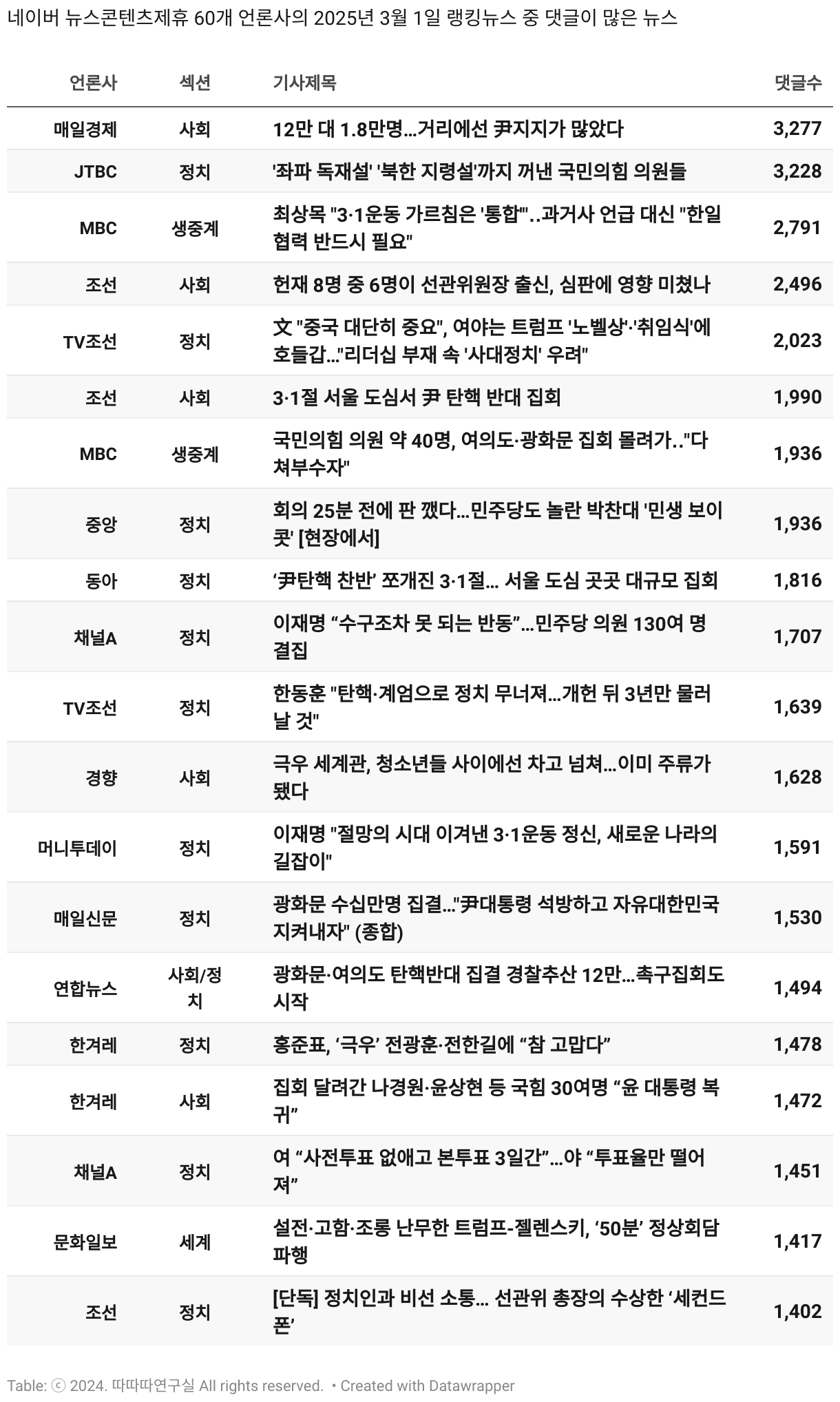 2025년 03월 05일 읽는데 112분 걸림 일간분석 일간 흥한 뉴스 - 3월 1일 토요일 네이버와 유튜브 뉴스 데이터로 매일매일 흥한 뉴스를 확인해보세요! 댓글수 조회수 좋아요 댓글수 조회수 좋아요 따따따연구실의 멤버가 되어주세요! 새로운 미디어 분석 소식을 업데이트 해 드립니다. 회원가입 Email sent! Check your inbox to complete your signup.