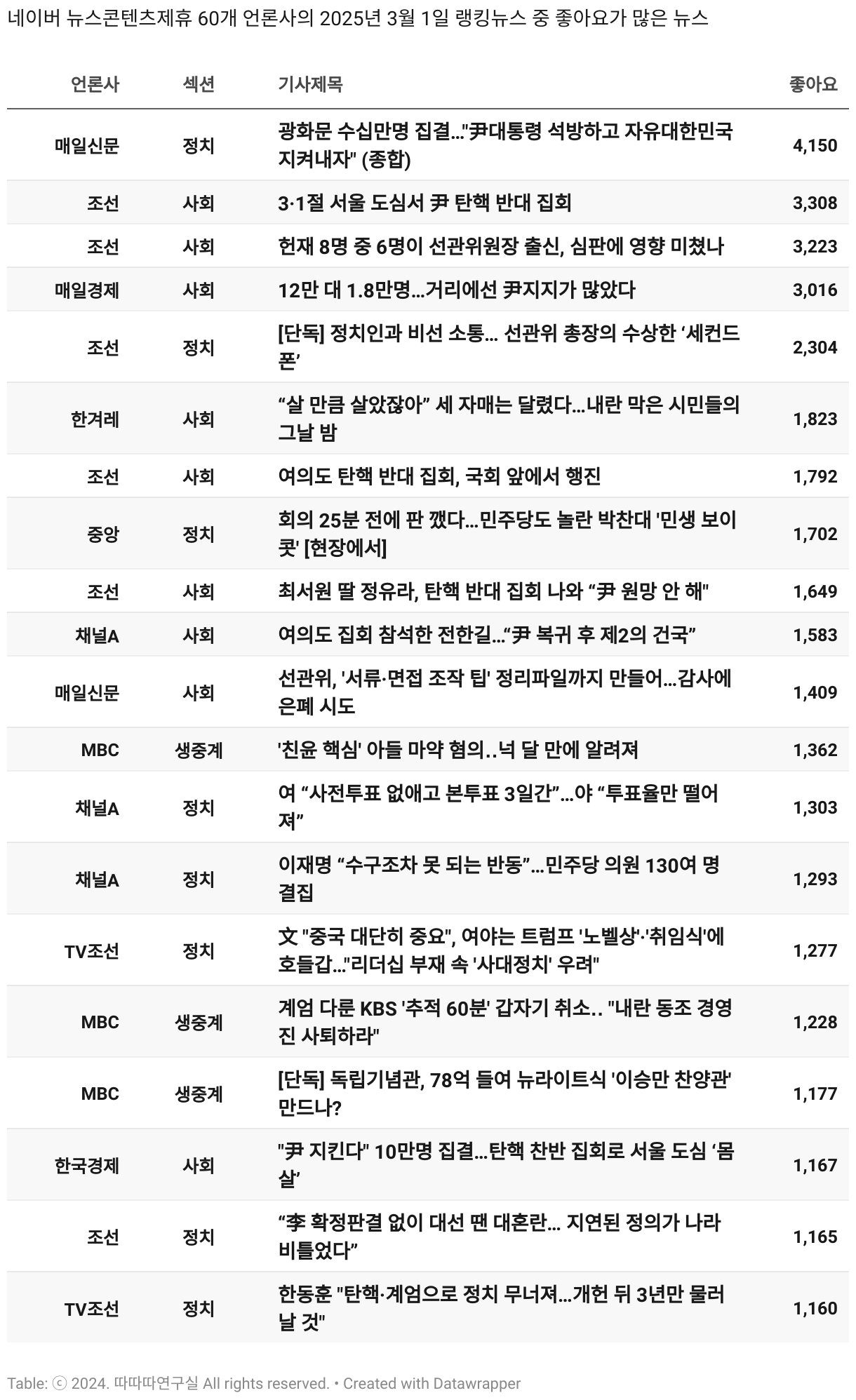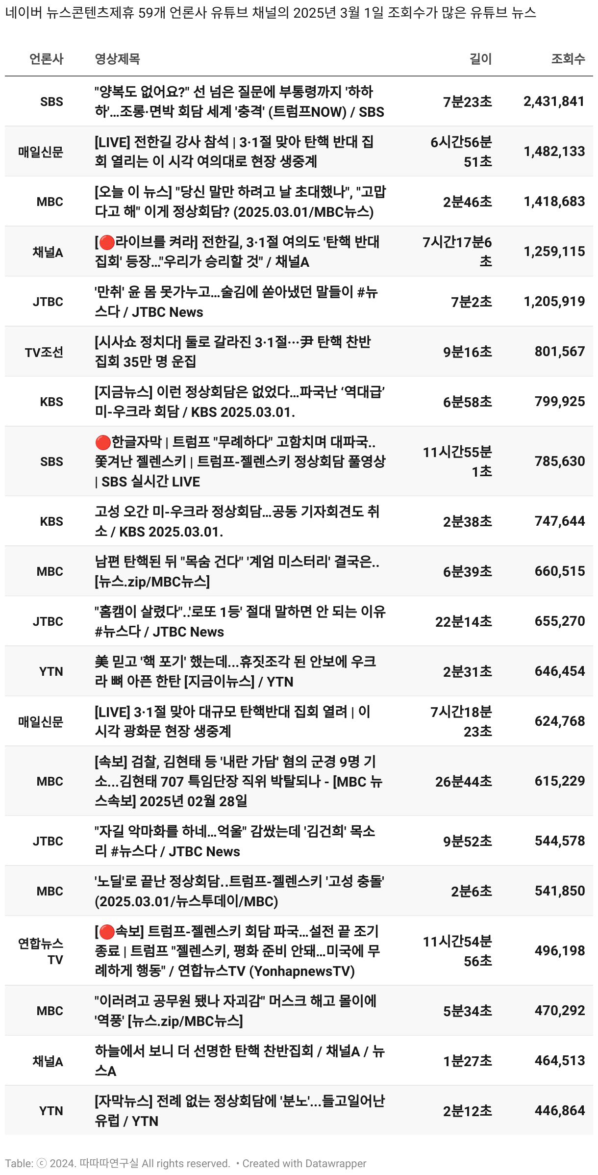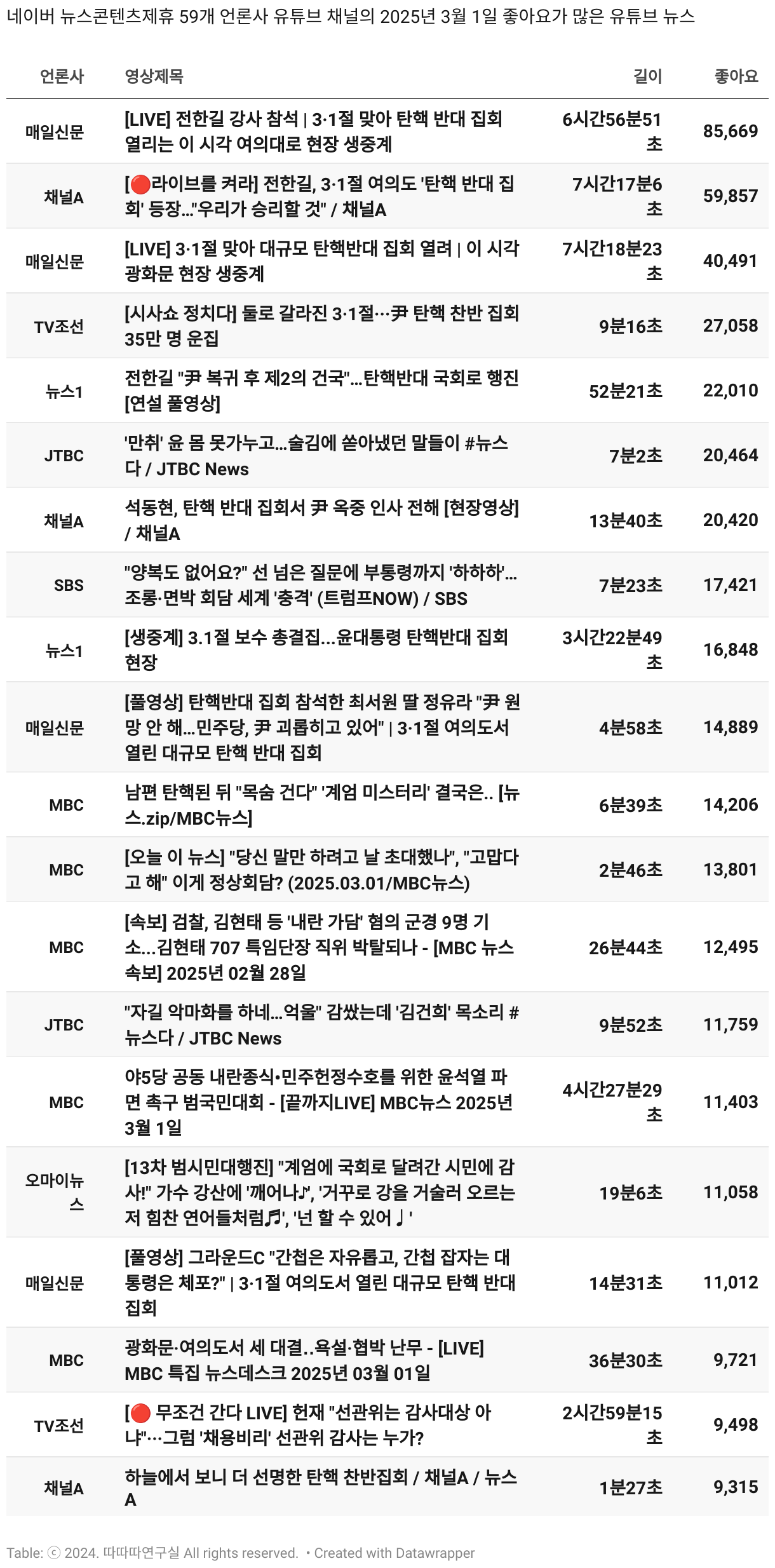 2025년 03월 05일 읽는데 112분 걸림 일간분석 일간 흥한 뉴스 - 3월 1일 토요일 네이버와 유튜브 뉴스 데이터로 매일매일 흥한 뉴스를 확인해보세요! 댓글수 조회수 좋아요 댓글수 조회수 좋아요 따따따연구실의 멤버가 되어주세요! 새로운 미디어 분석 소식을 업데이트 해 드립니다. 회원가입 Email sent! Check your inbox to complete your signup.
