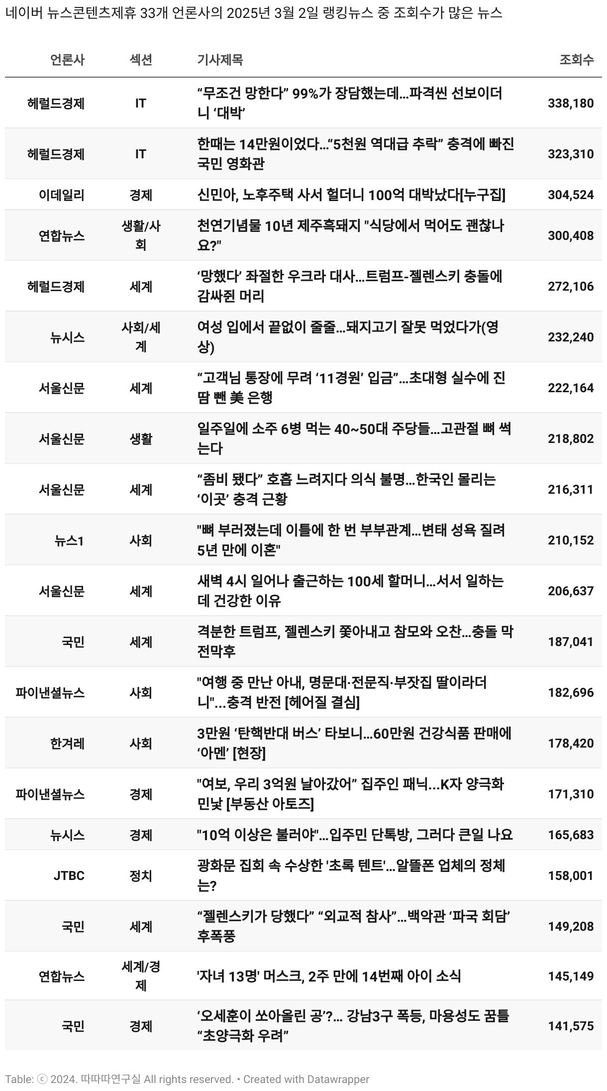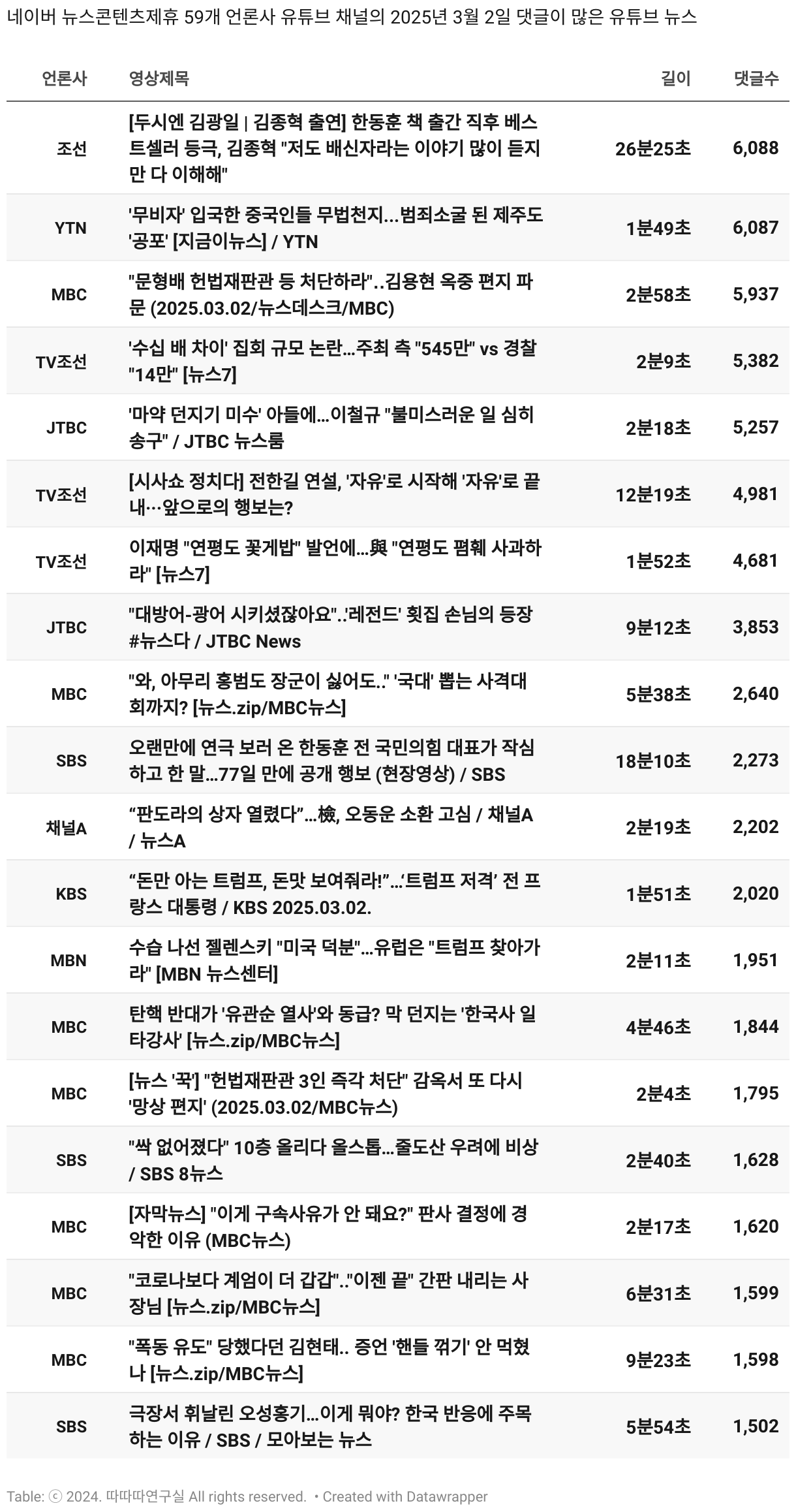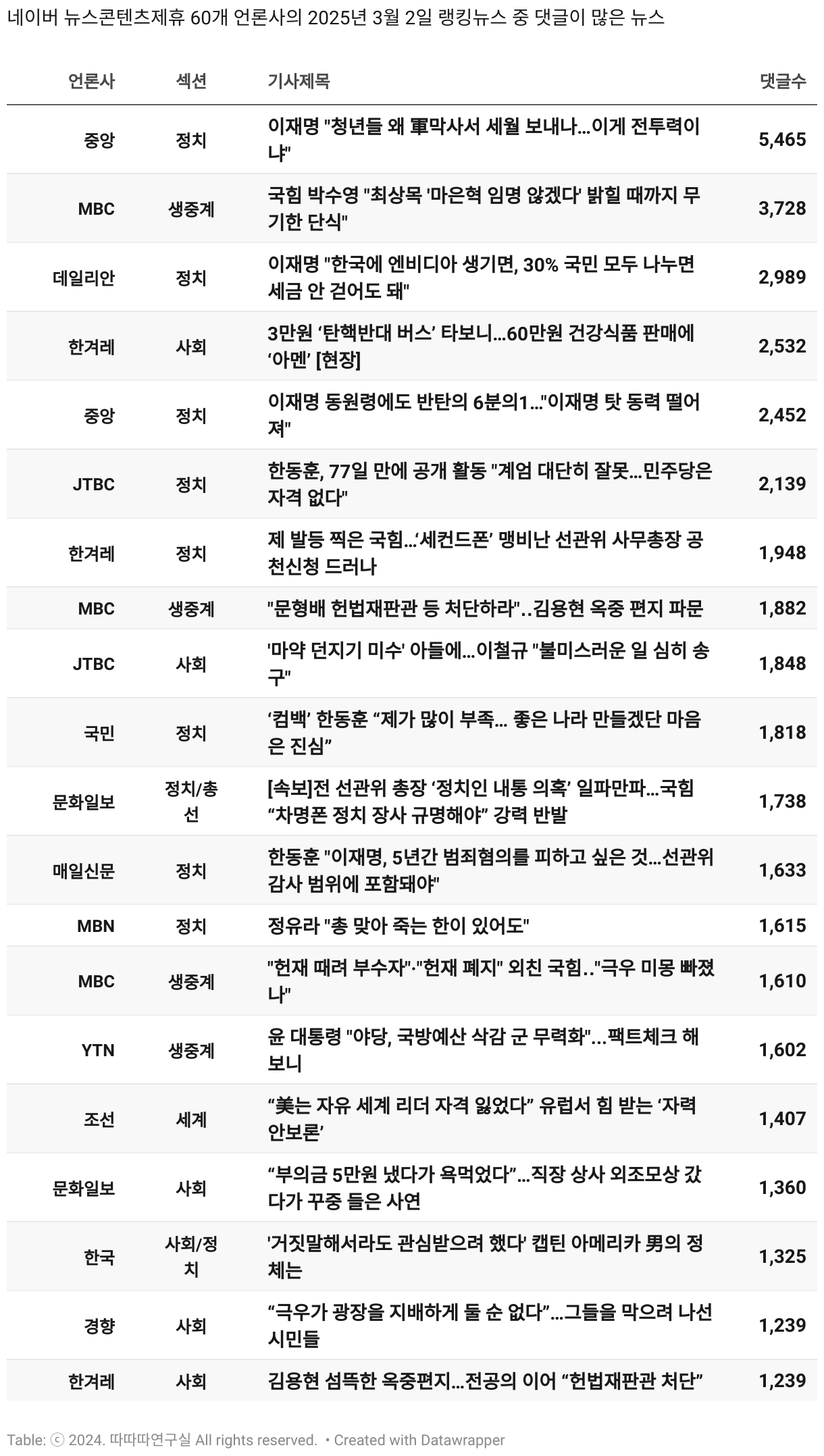 2025년 03월 05일 읽는데 112분 걸림 일간분석 일간 흥한 뉴스 - 3월 2일 일요일 네이버와 유튜브 뉴스 데이터로 매일매일 흥한 뉴스를 확인해보세요! 댓글수 조회수 좋아요 댓글수 조회수 좋아요 따따따연구실의 멤버가 되어주세요! 새로운 미디어 분석 소식을 업데이트 해 드립니다. 회원가입 Email sent! Check your inbox to complete your signup.