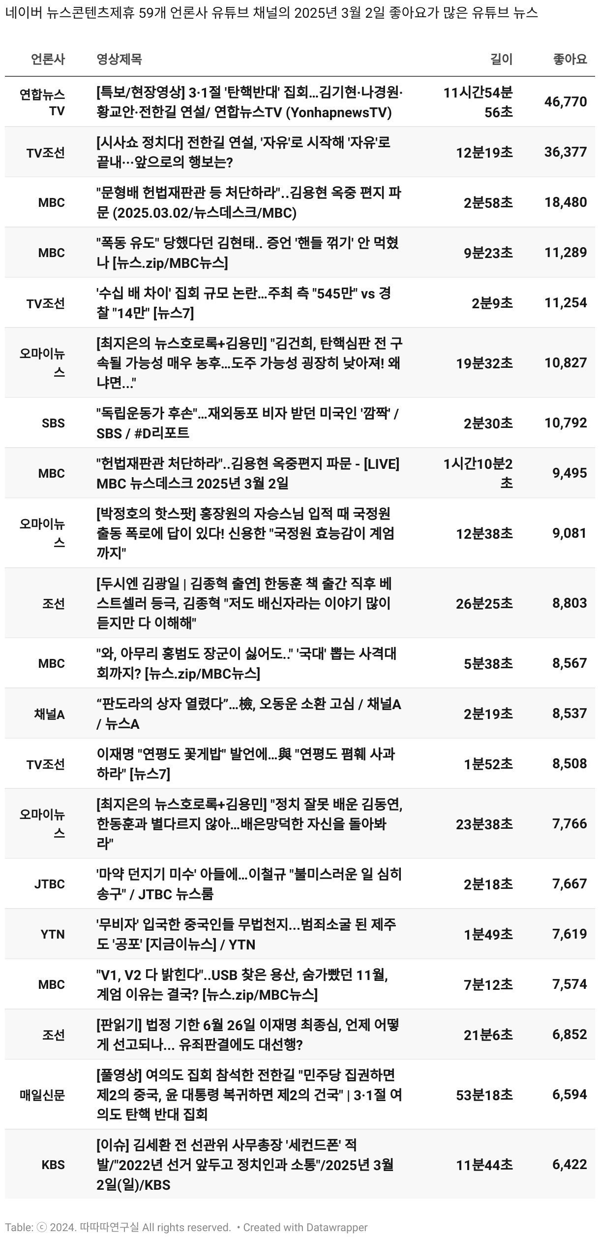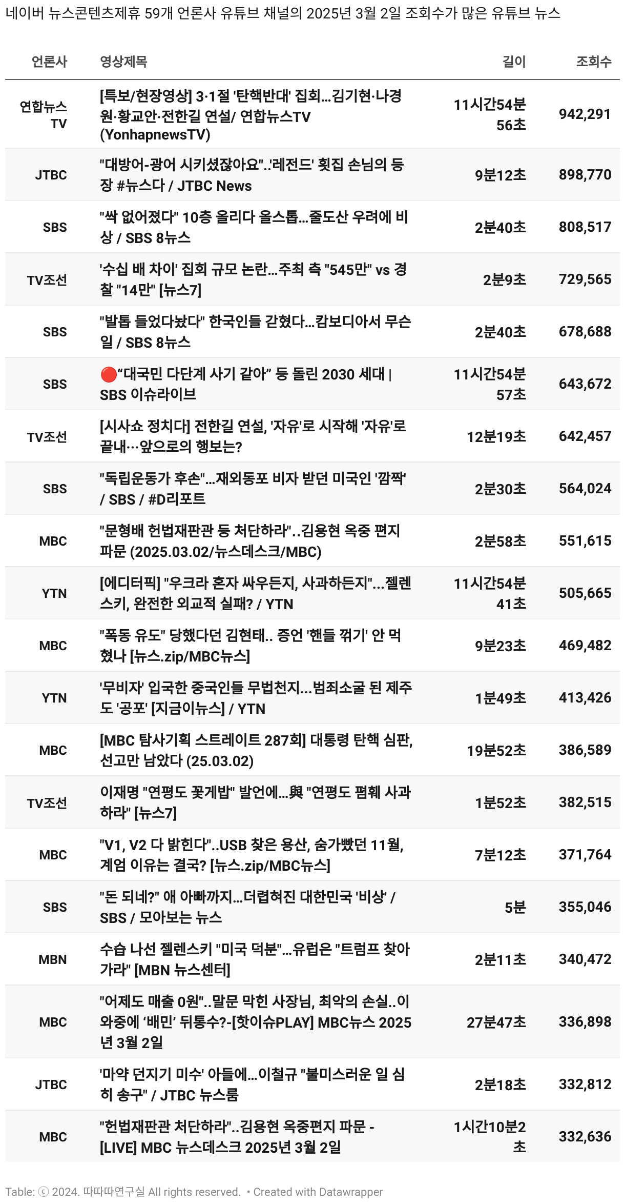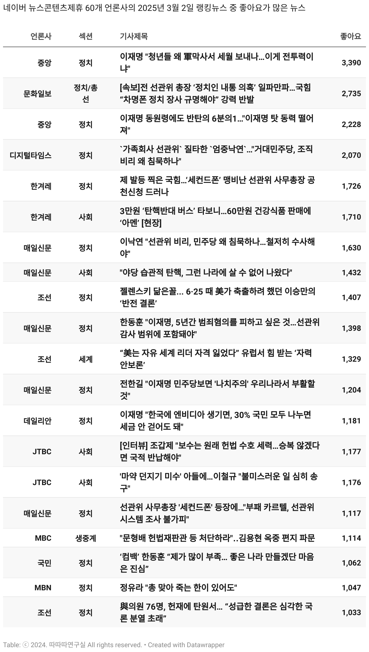2025년 03월 05일 읽는데 112분 걸림 일간분석 일간 흥한 뉴스 - 3월 2일 일요일 네이버와 유튜브 뉴스 데이터로 매일매일 흥한 뉴스를 확인해보세요! 댓글수 조회수 좋아요 댓글수 조회수 좋아요 따따따연구실의 멤버가 되어주세요! 새로운 미디어 분석 소식을 업데이트 해 드립니다. 회원가입 Email sent! Check your inbox to complete your signup.