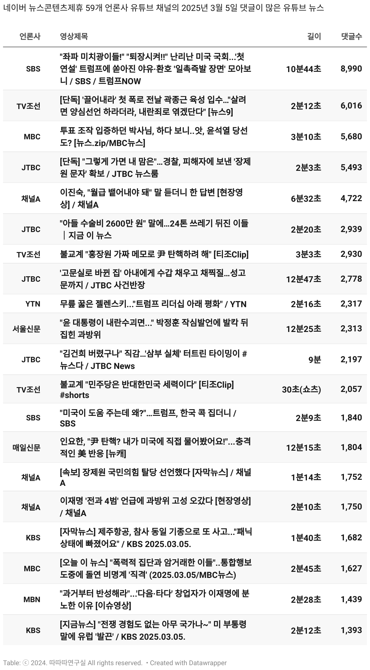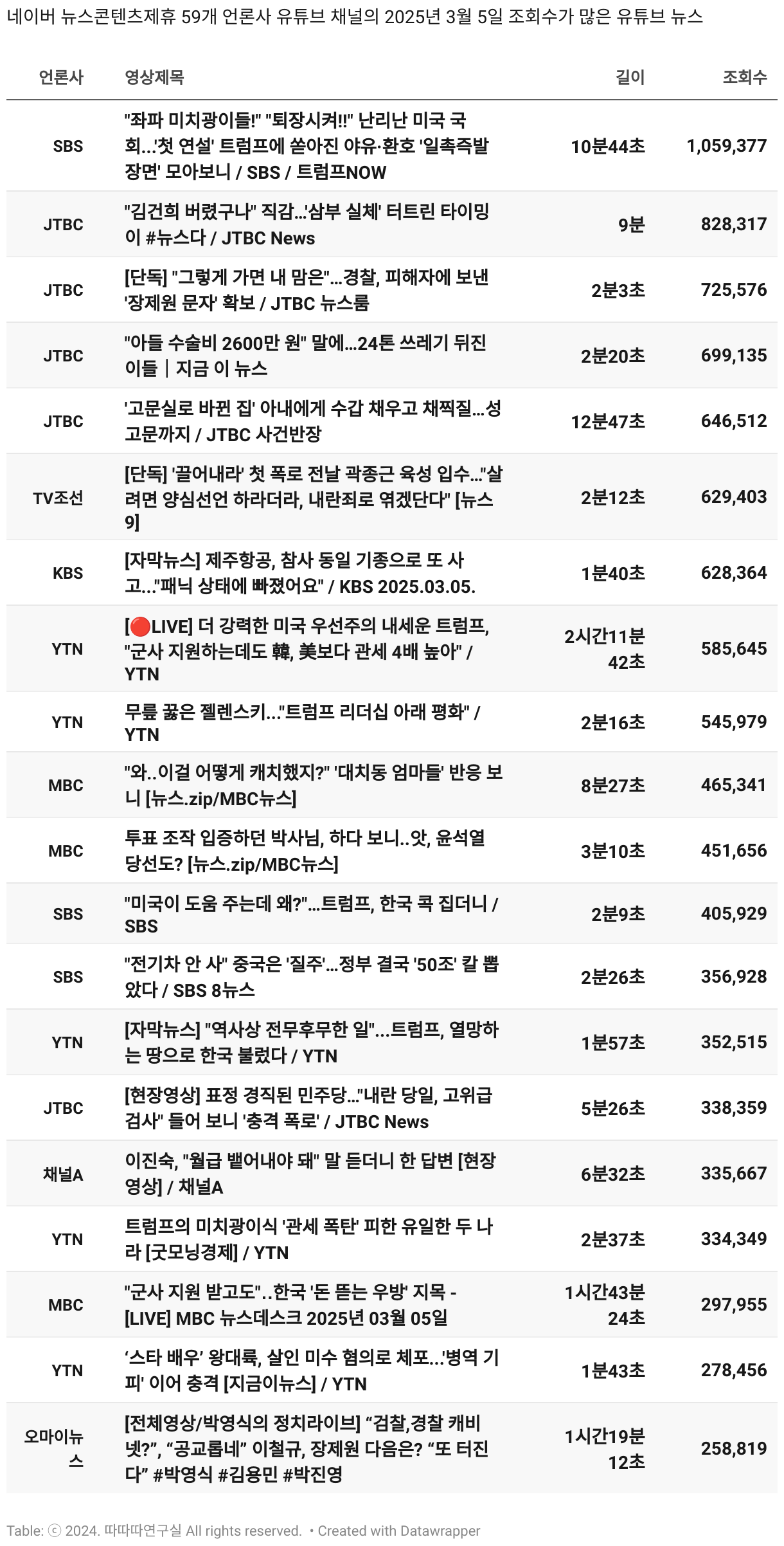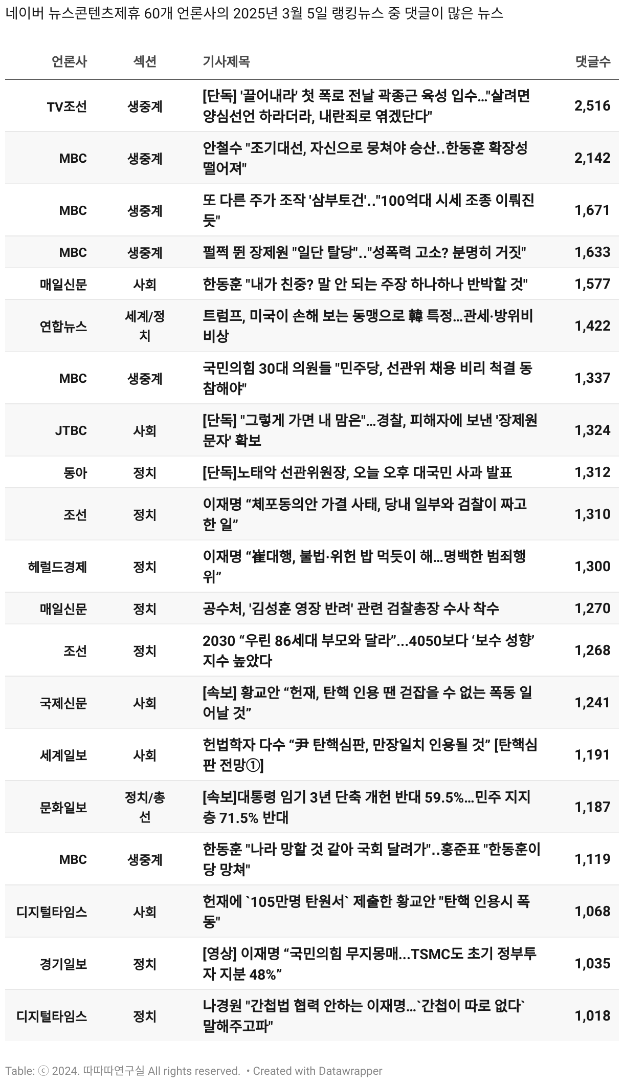 2025년 03월 06일 읽는데 106분 걸림 일간분석 일간 흥한 뉴스 - 3월 5일 수요일 네이버와 유튜브 뉴스 데이터로 매일매일 흥한 뉴스를 확인해보세요! 댓글수 조회수 좋아요 댓글수 조회수 좋아요 따따따연구실의 멤버가 되어주세요! 새로운 미디어 분석 소식을 업데이트 해 드립니다. 회원가입 Email sent! Check your inbox to complete your signup.