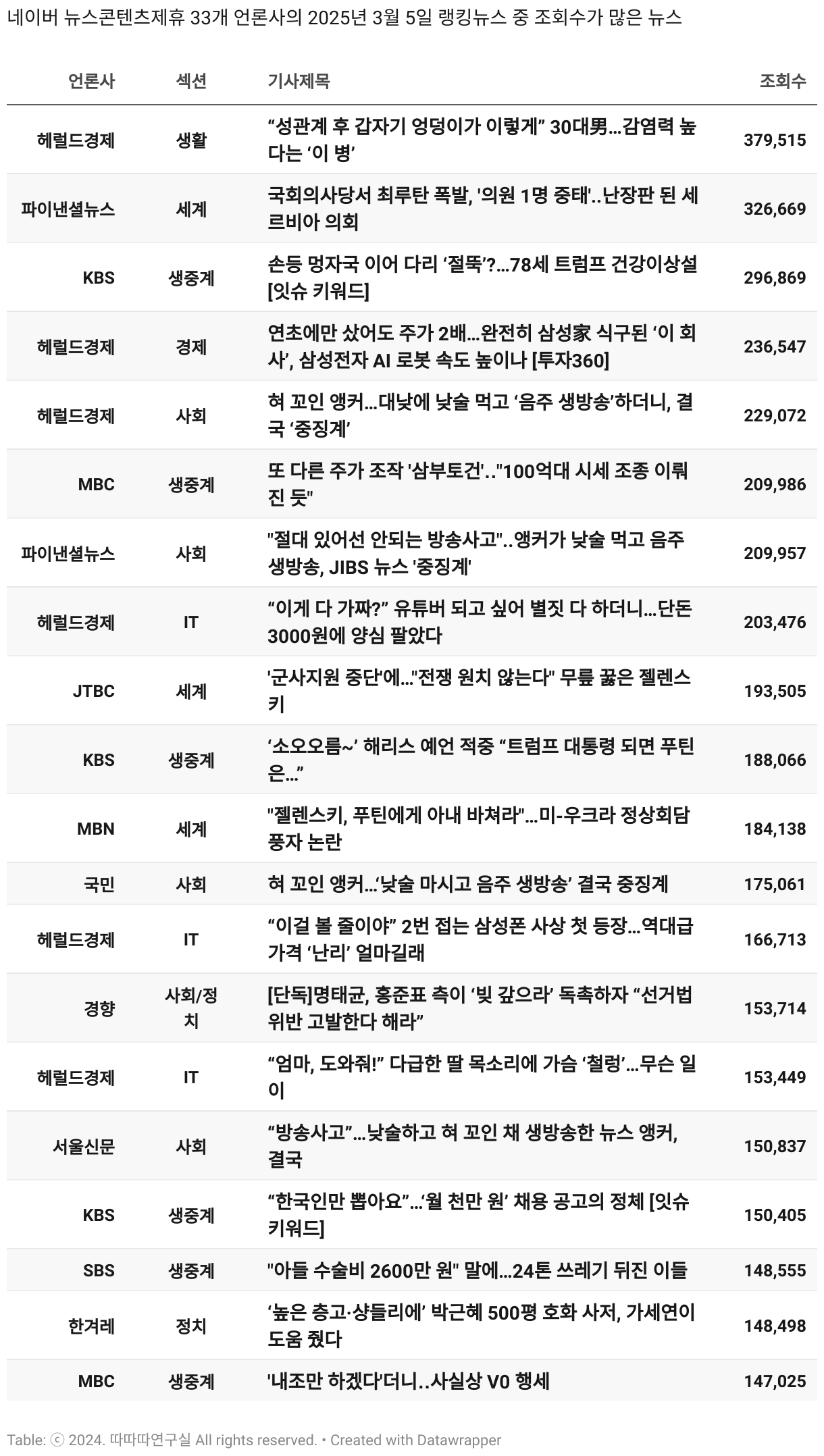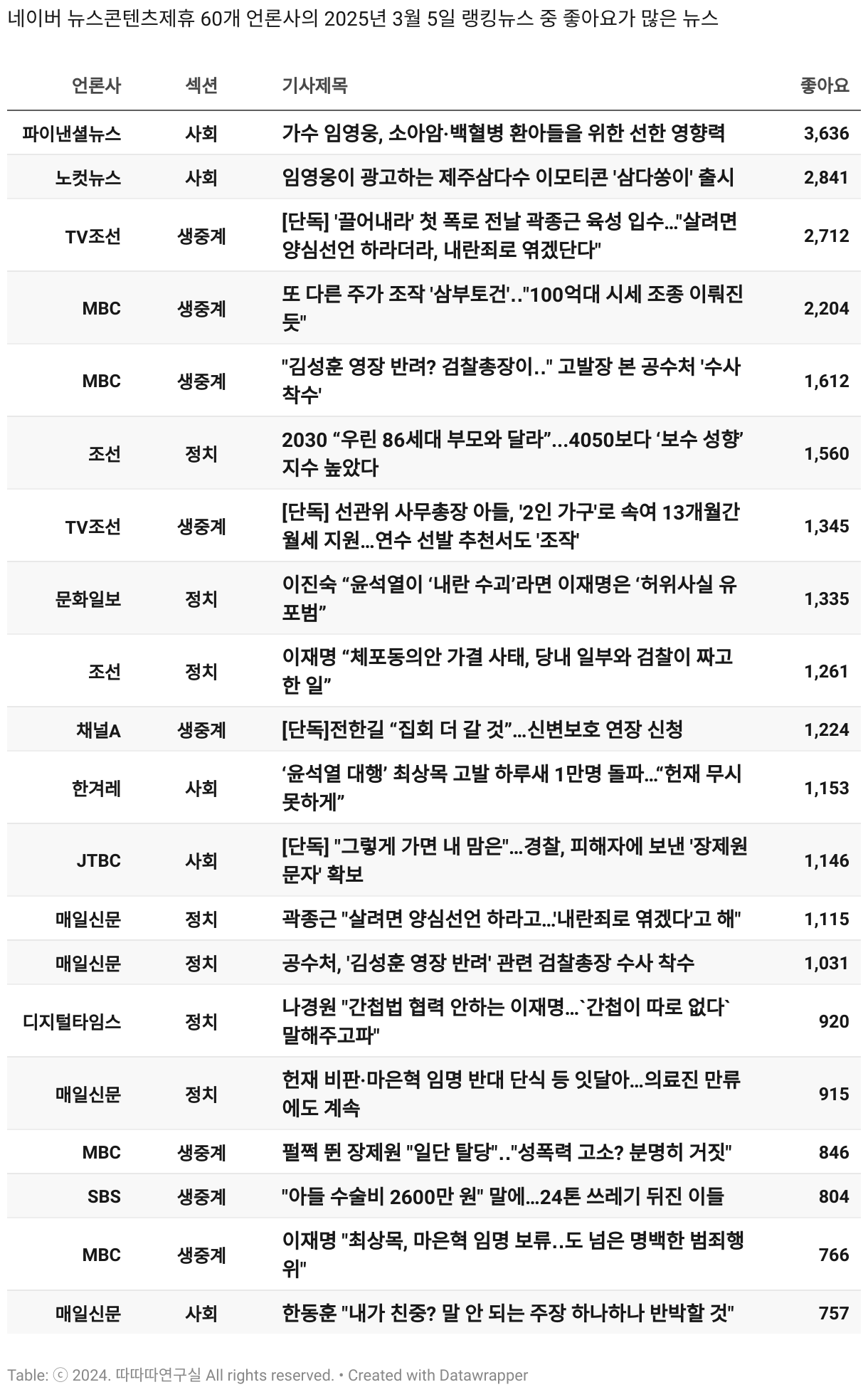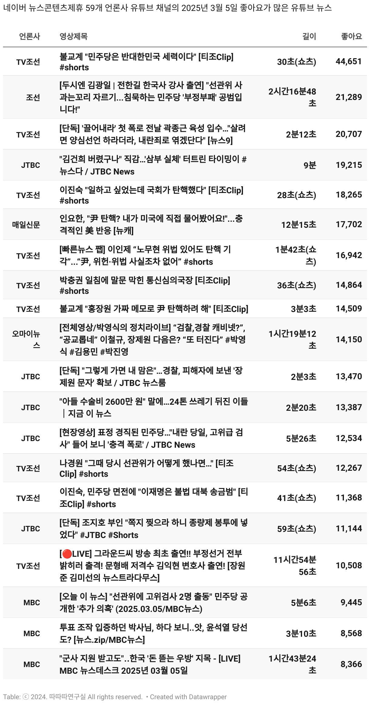 2025년 03월 06일 읽는데 106분 걸림 일간분석 일간 흥한 뉴스 - 3월 5일 수요일 네이버와 유튜브 뉴스 데이터로 매일매일 흥한 뉴스를 확인해보세요! 댓글수 조회수 좋아요 댓글수 조회수 좋아요 따따따연구실의 멤버가 되어주세요! 새로운 미디어 분석 소식을 업데이트 해 드립니다. 회원가입 Email sent! Check your inbox to complete your signup.