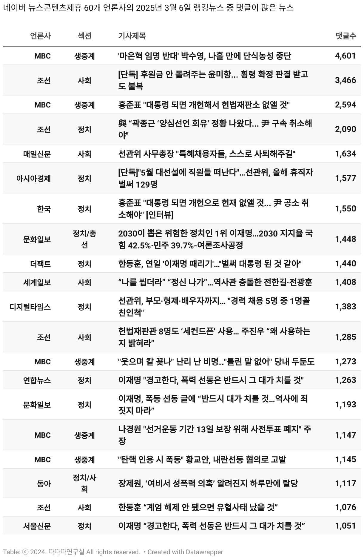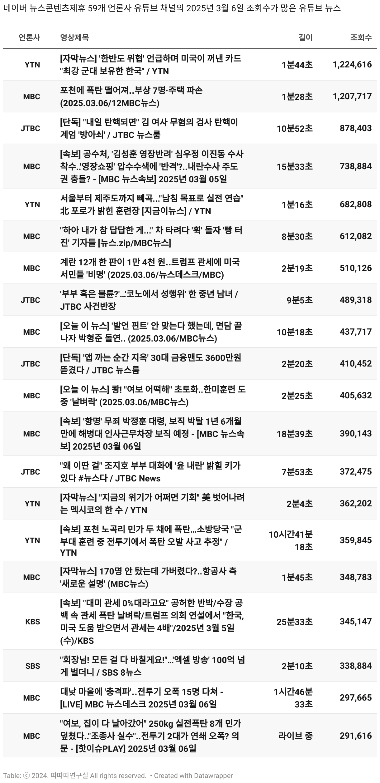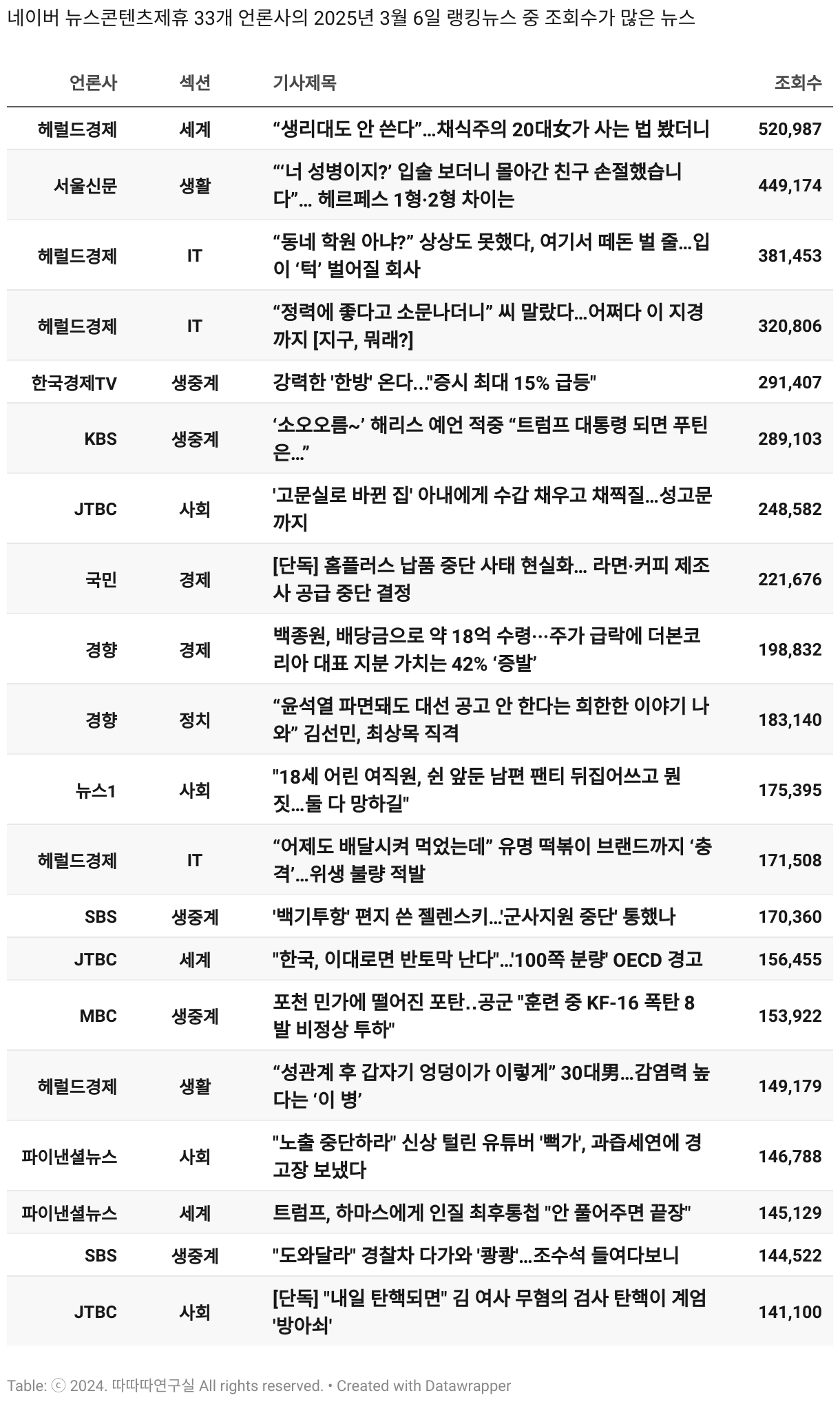2025년 03월 07일 읽는데 107분 걸림 일간분석 일간 흥한 뉴스 - 3월 6일 목요일 네이버와 유튜브 뉴스 데이터로 매일매일 흥한 뉴스를 확인해보세요! 댓글수 조회수 좋아요 댓글수 조회수 좋아요 따따따연구실의 멤버가 되어주세요! 새로운 미디어 분석 소식을 업데이트 해 드립니다. 회원가입 Email sent! Check your inbox to complete your signup.