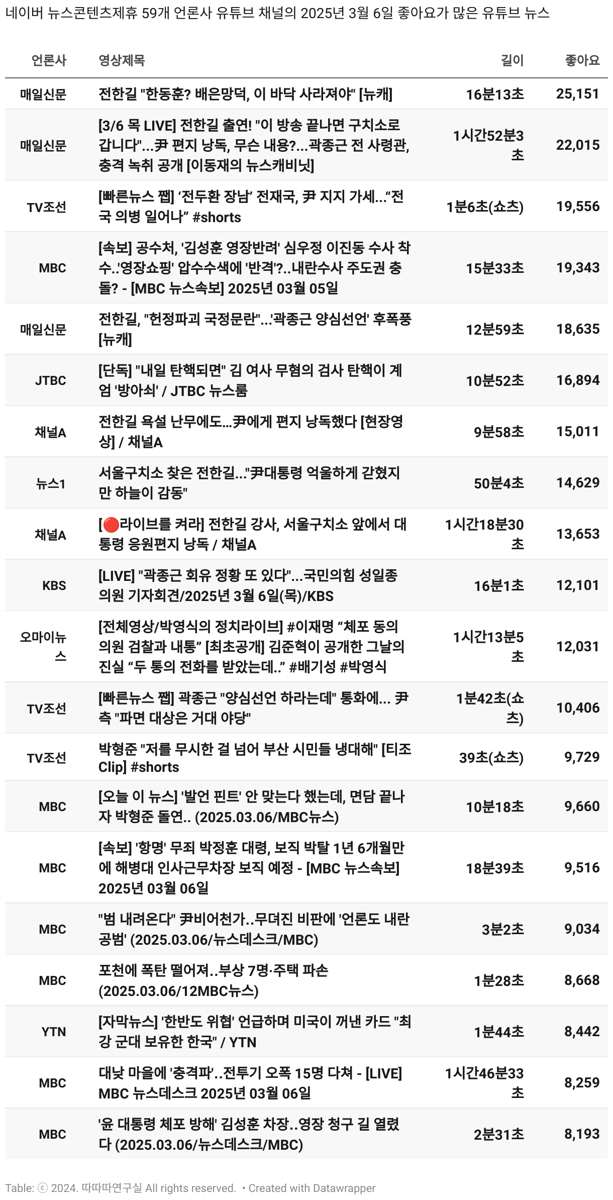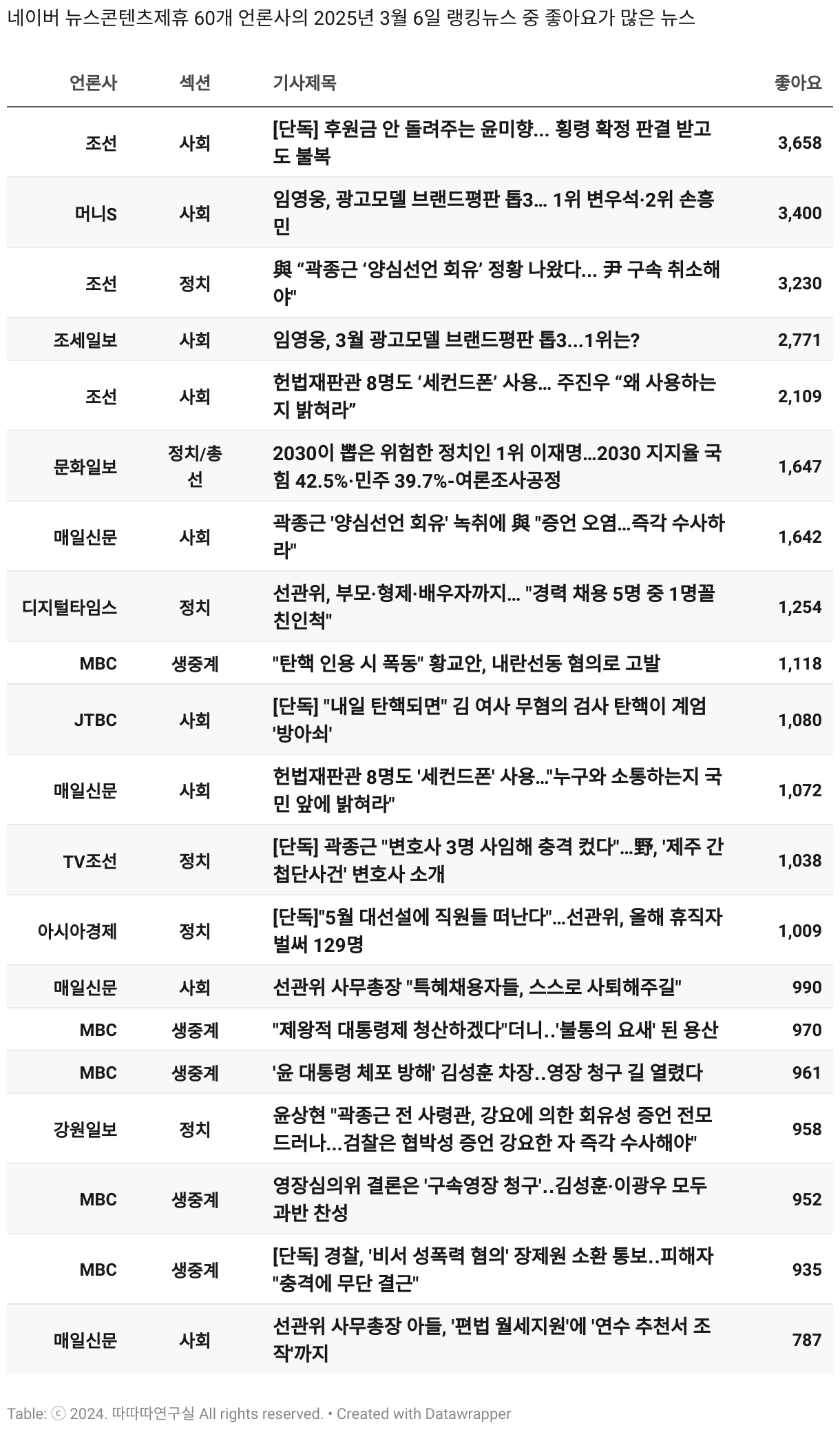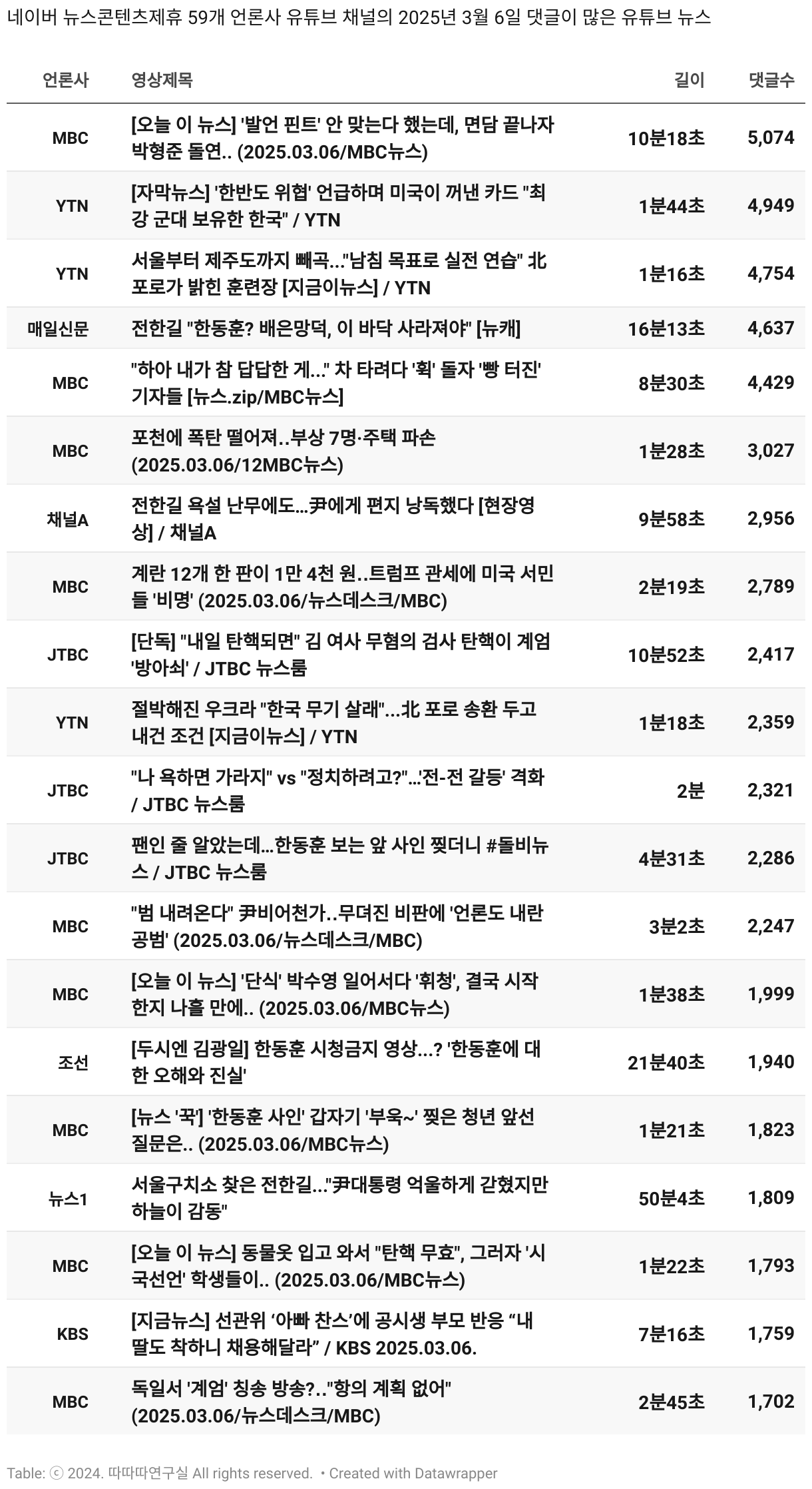 2025년 03월 07일 읽는데 107분 걸림 일간분석 일간 흥한 뉴스 - 3월 6일 목요일 네이버와 유튜브 뉴스 데이터로 매일매일 흥한 뉴스를 확인해보세요! 댓글수 조회수 좋아요 댓글수 조회수 좋아요 따따따연구실의 멤버가 되어주세요! 새로운 미디어 분석 소식을 업데이트 해 드립니다. 회원가입 Email sent! Check your inbox to complete your signup.
