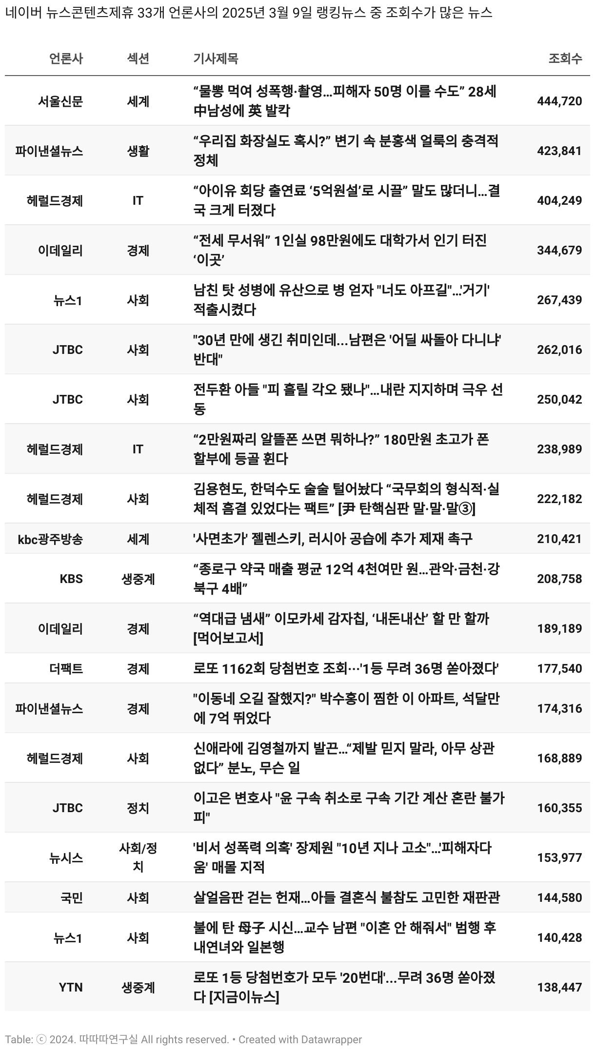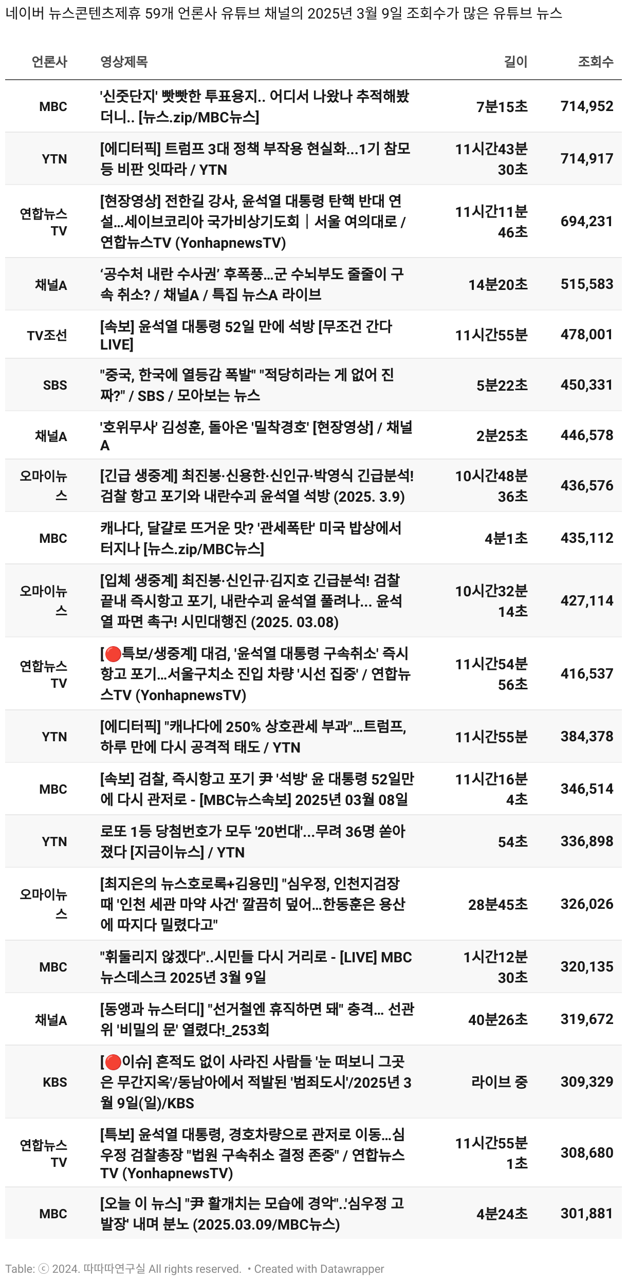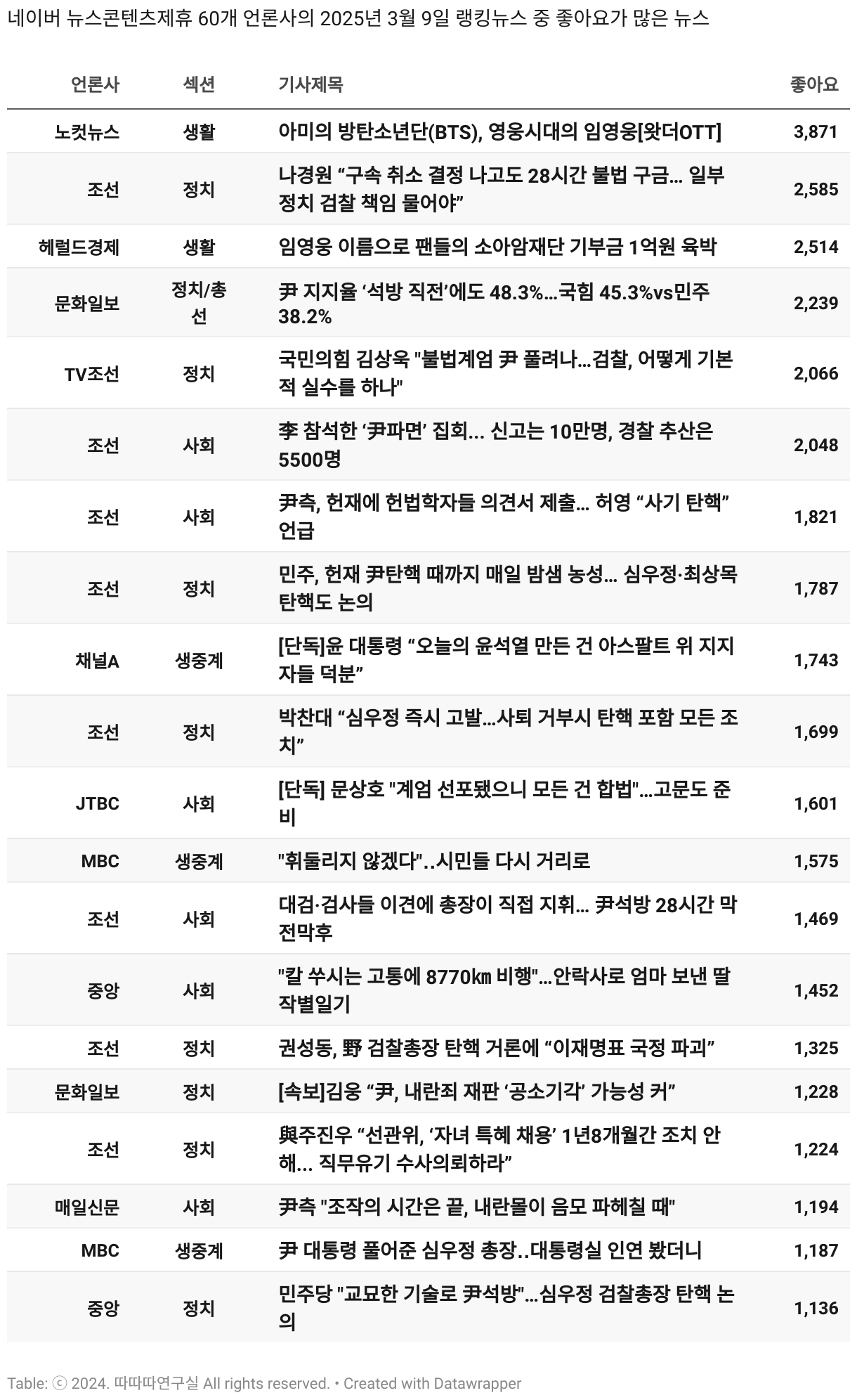 2025년 03월 10일 읽는데 107분 걸림 일간분석 일간 흥한 뉴스 - 3월 9일 일요일 네이버와 유튜브 뉴스 데이터로 매일매일 흥한 뉴스를 확인해보세요! 댓글수 조회수 좋아요 댓글수 조회수 좋아요 따따따연구실의 멤버가 되어주세요! 새로운 미디어 분석 소식을 업데이트 해 드립니다. 회원가입 Email sent! Check your inbox to complete your signup.