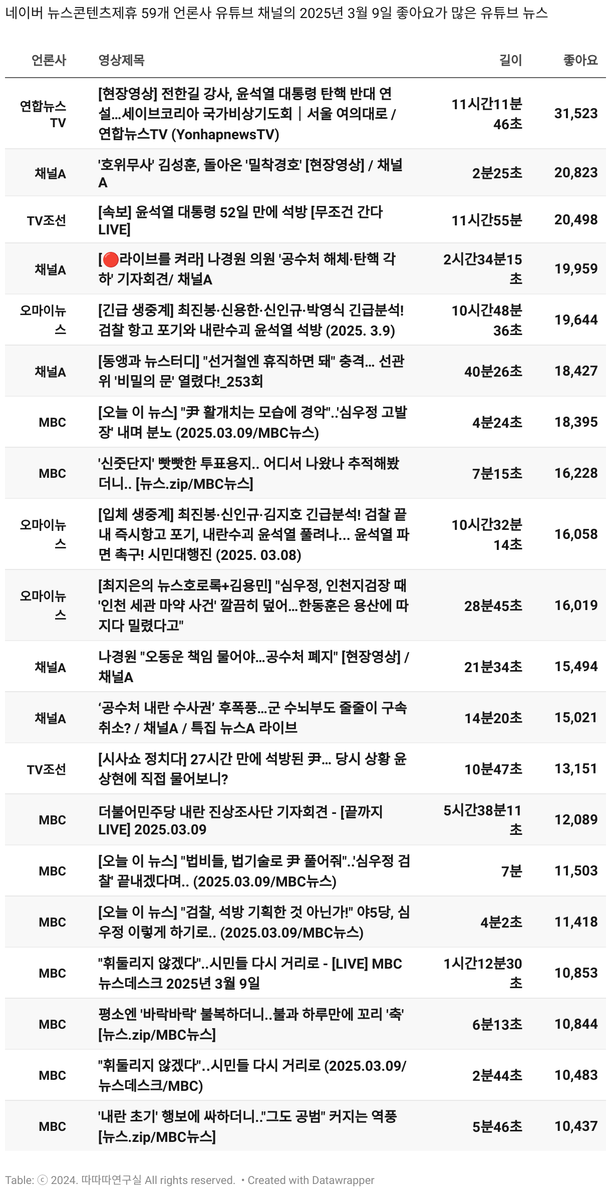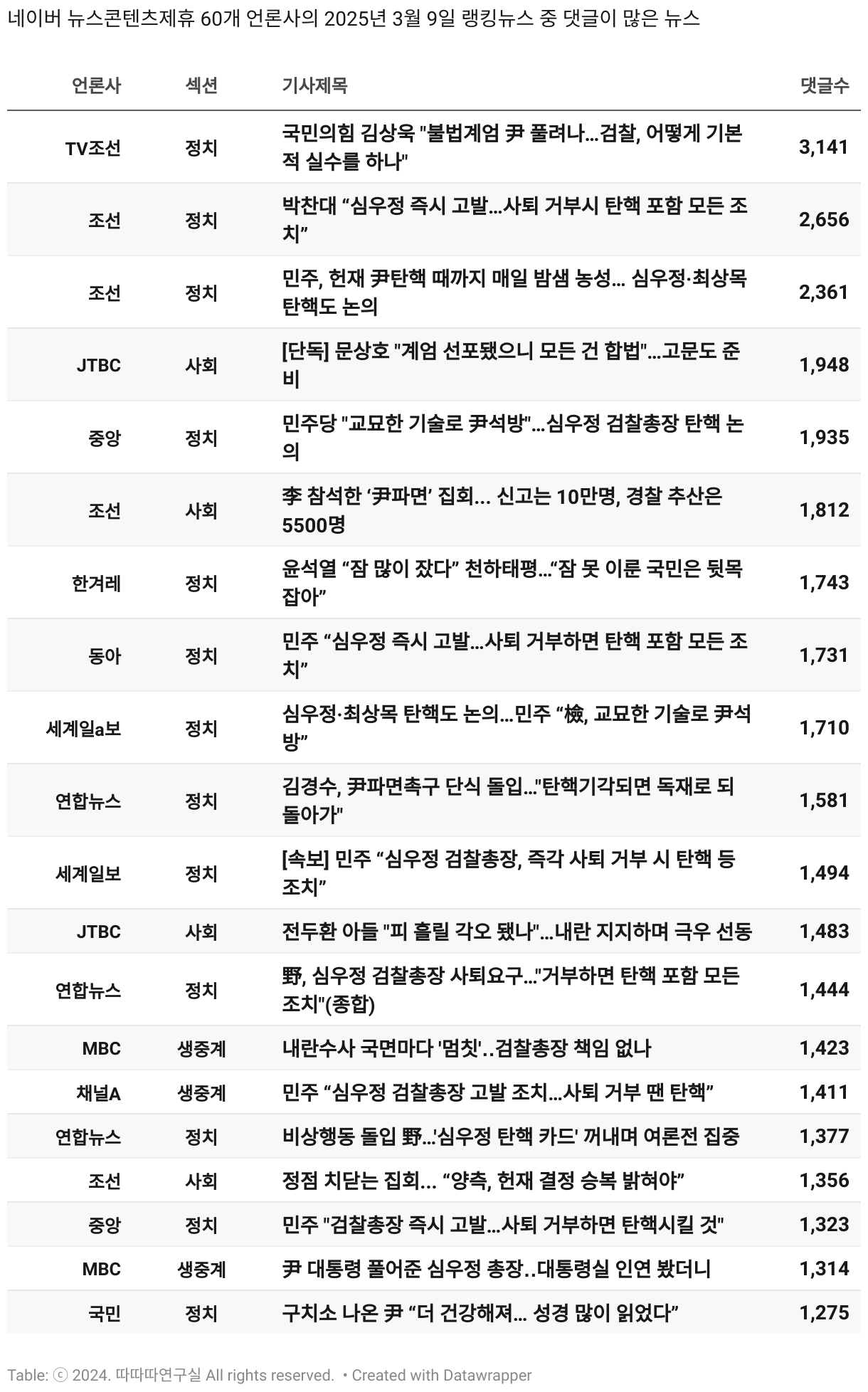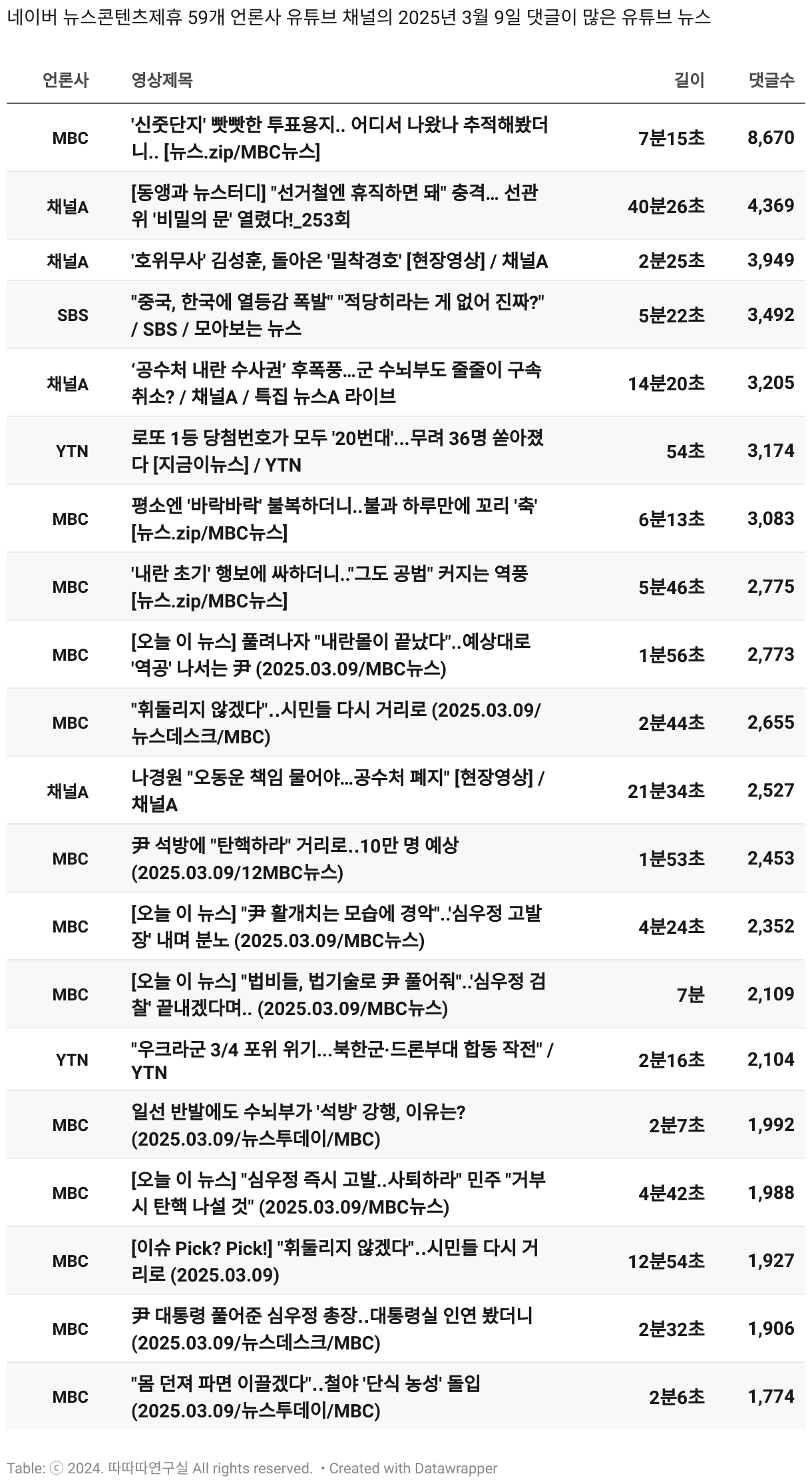 2025년 03월 10일 읽는데 107분 걸림 일간분석 일간 흥한 뉴스 - 3월 9일 일요일 네이버와 유튜브 뉴스 데이터로 매일매일 흥한 뉴스를 확인해보세요! 댓글수 조회수 좋아요 댓글수 조회수 좋아요 따따따연구실의 멤버가 되어주세요! 새로운 미디어 분석 소식을 업데이트 해 드립니다. 회원가입 Email sent! Check your inbox to complete your signup.