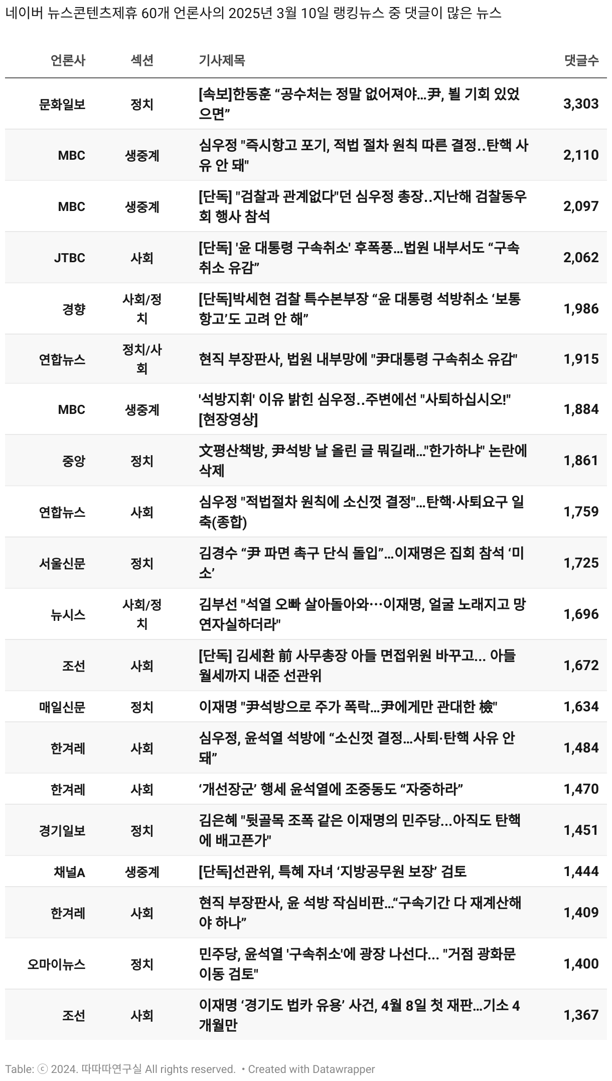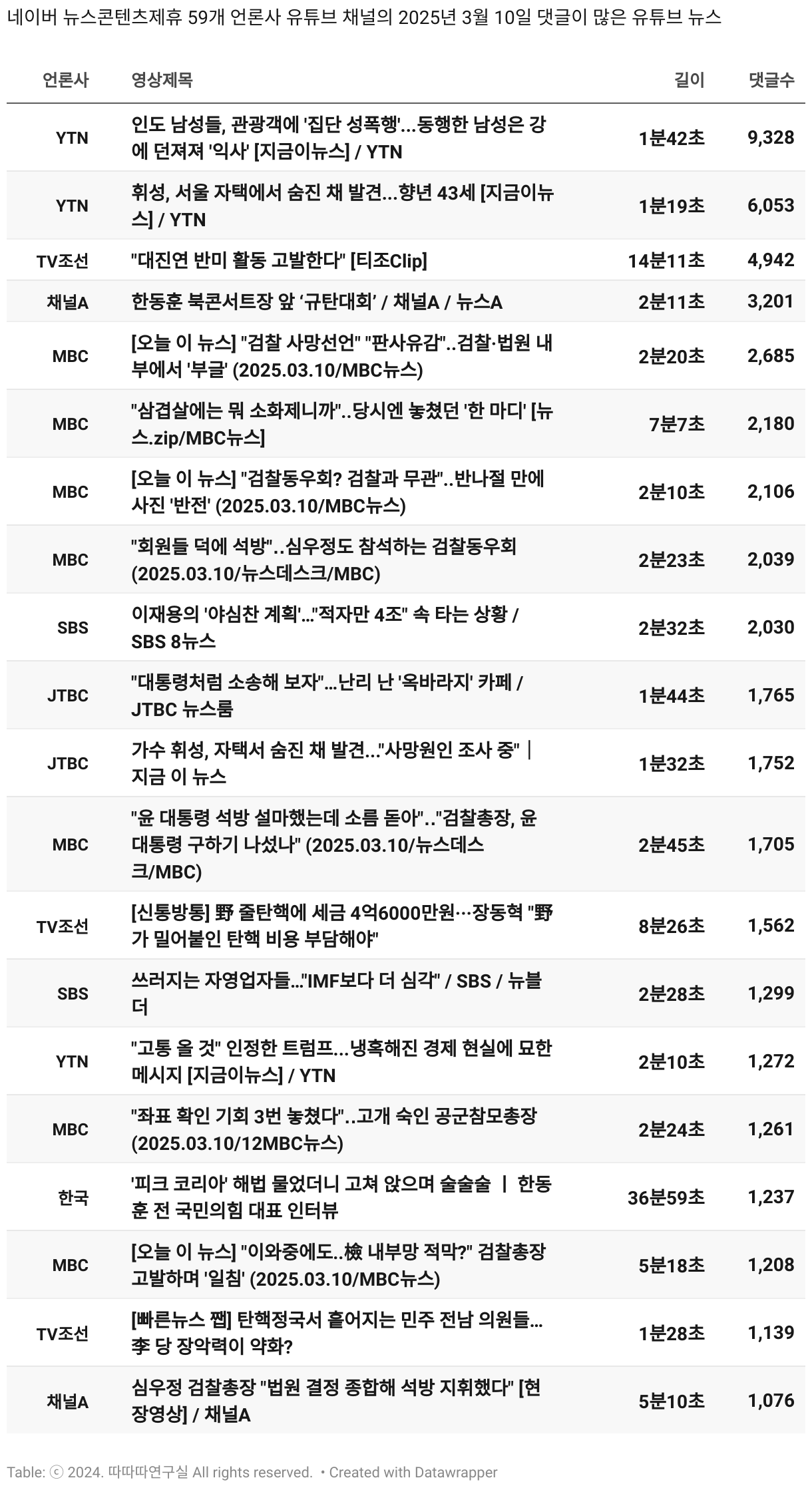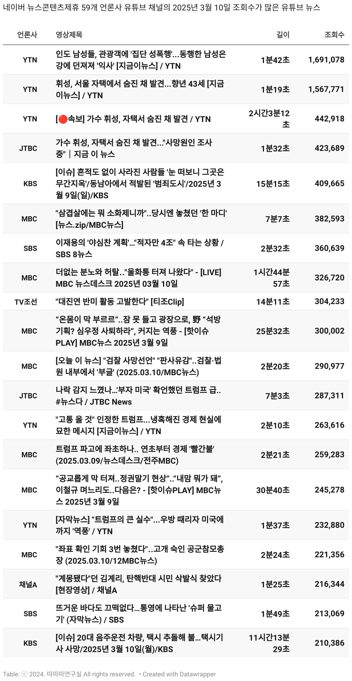 2025년 03월 11일 읽는데 104분 걸림 일간분석 일간 흥한 뉴스 - 3월 10일 월요일 네이버와 유튜브 뉴스 데이터로 매일매일 흥한 뉴스를 확인해보세요! 댓글수 조회수 좋아요 댓글수 조회수 좋아요 따따따연구실의 멤버가 되어주세요! 새로운 미디어 분석 소식을 업데이트 해 드립니다. 회원가입 Email sent! Check your inbox to complete your signup.