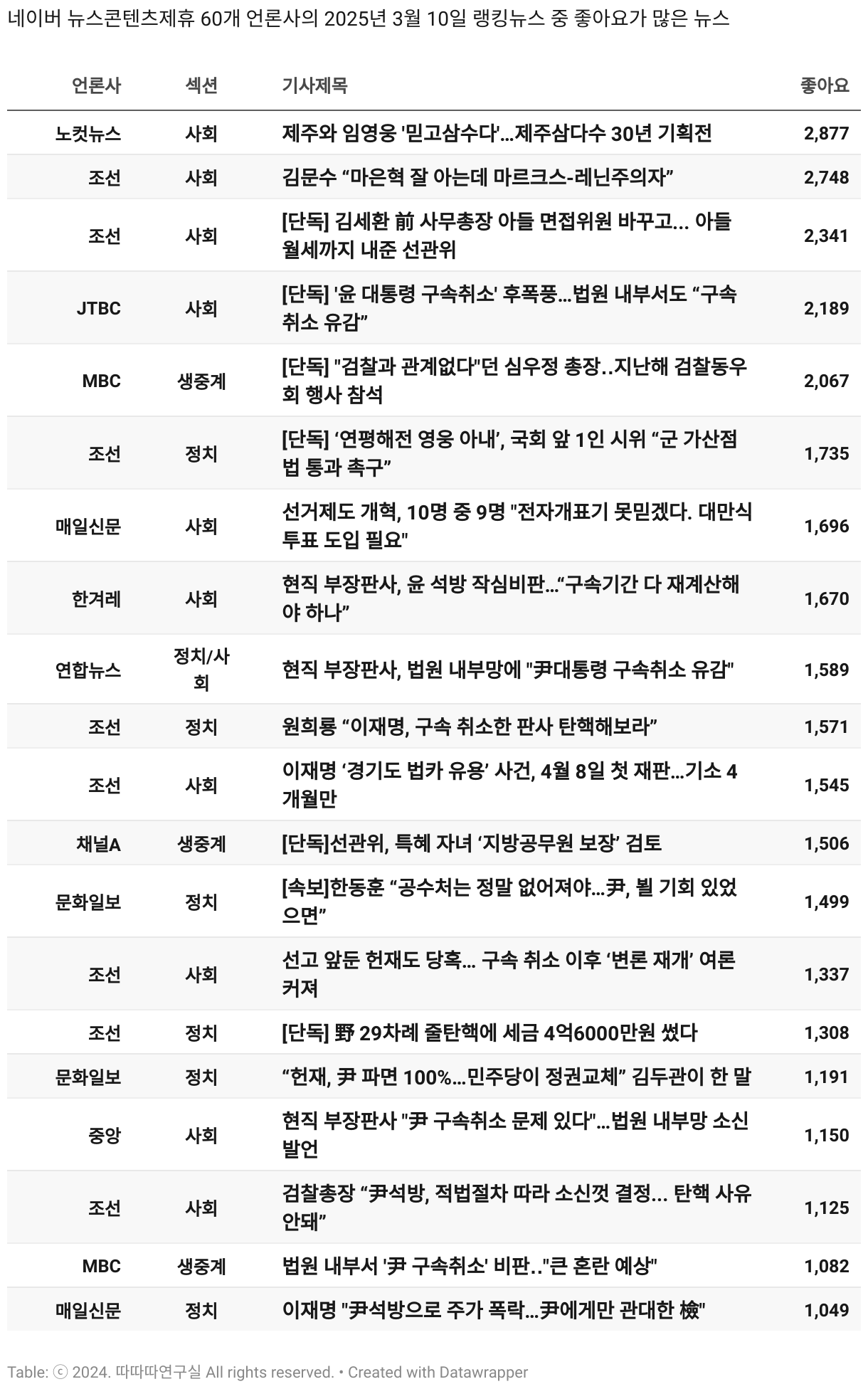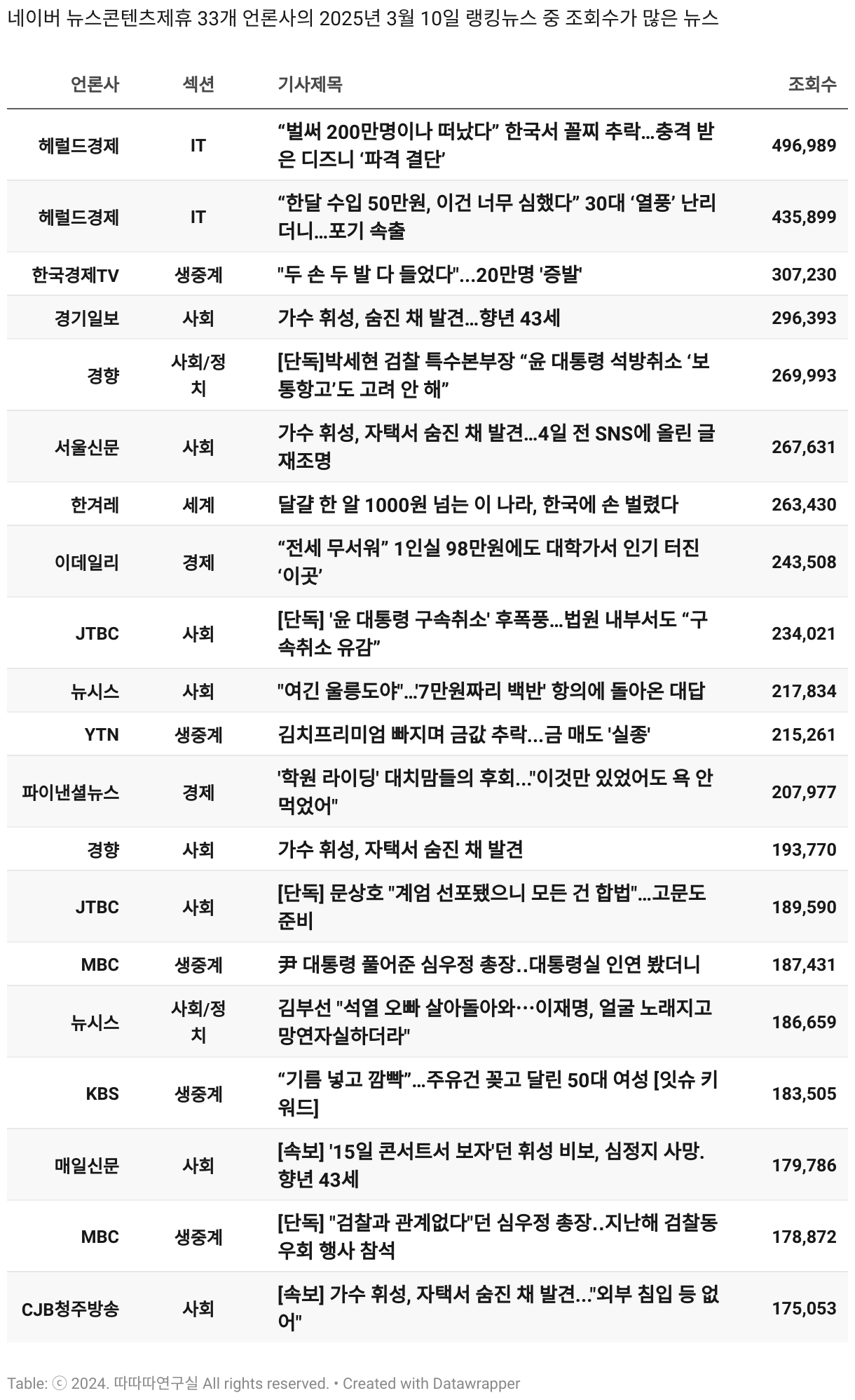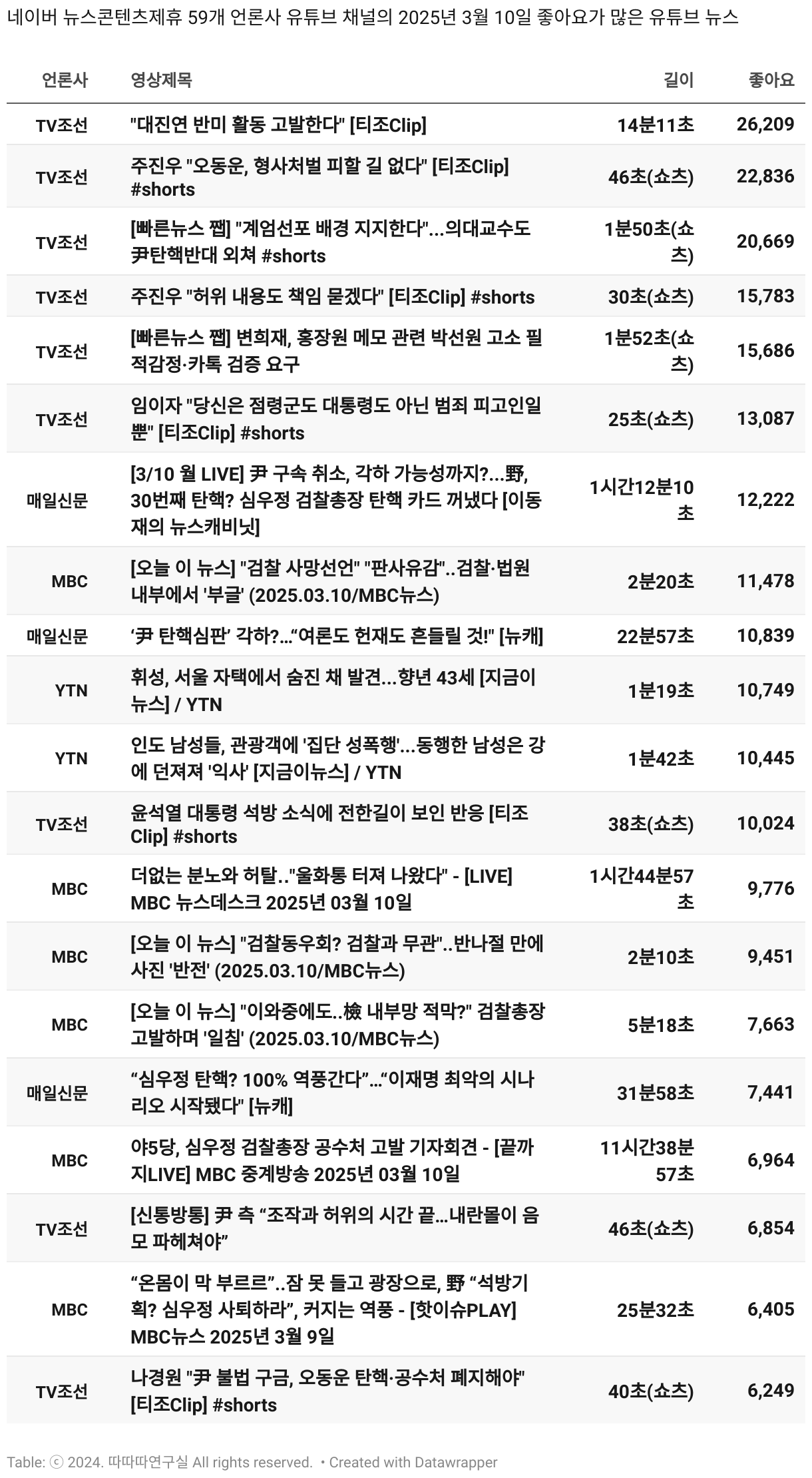 2025년 03월 11일 읽는데 104분 걸림 일간분석 일간 흥한 뉴스 - 3월 10일 월요일 네이버와 유튜브 뉴스 데이터로 매일매일 흥한 뉴스를 확인해보세요! 댓글수 조회수 좋아요 댓글수 조회수 좋아요 따따따연구실의 멤버가 되어주세요! 새로운 미디어 분석 소식을 업데이트 해 드립니다. 회원가입 Email sent! Check your inbox to complete your signup.