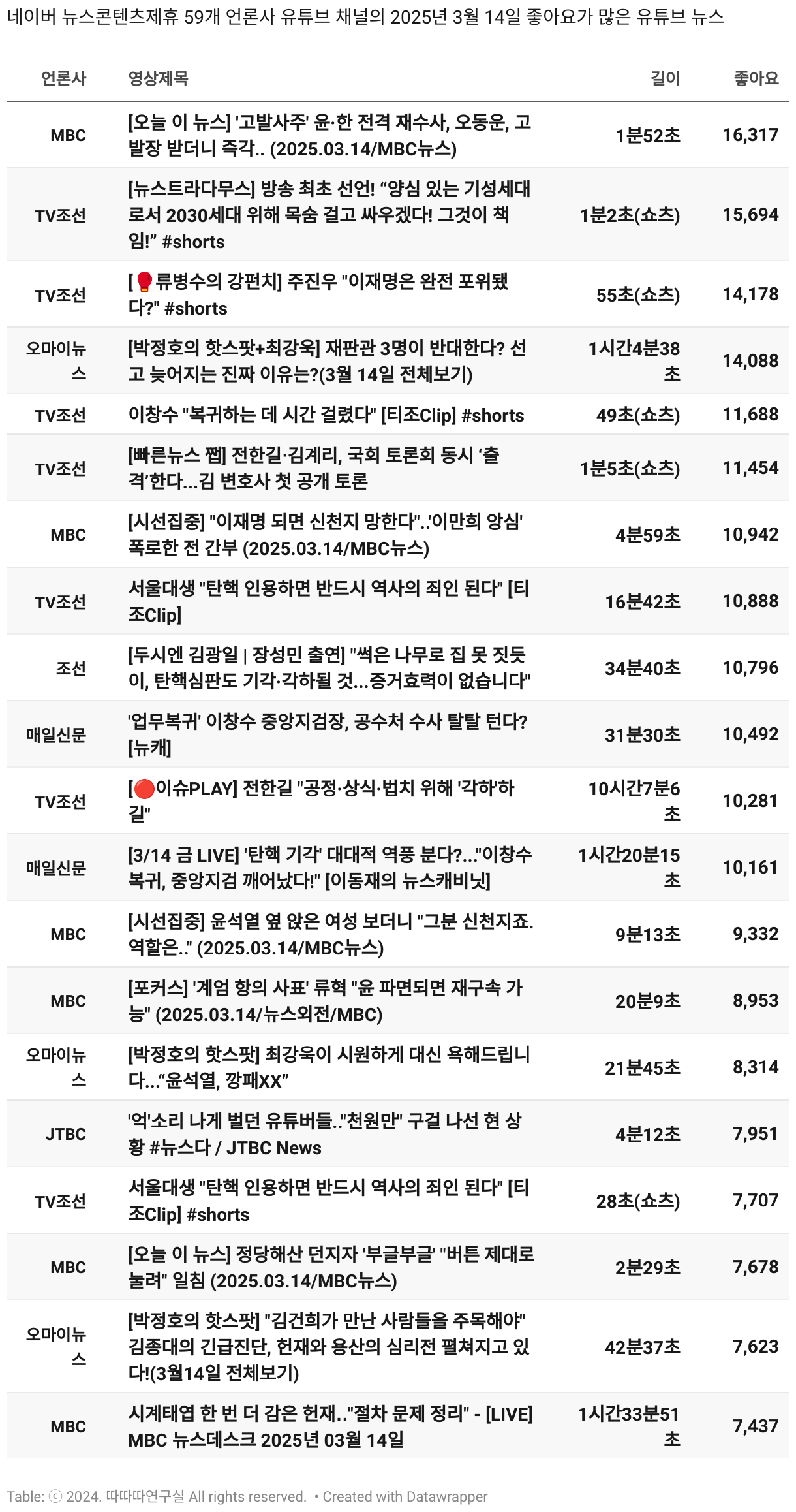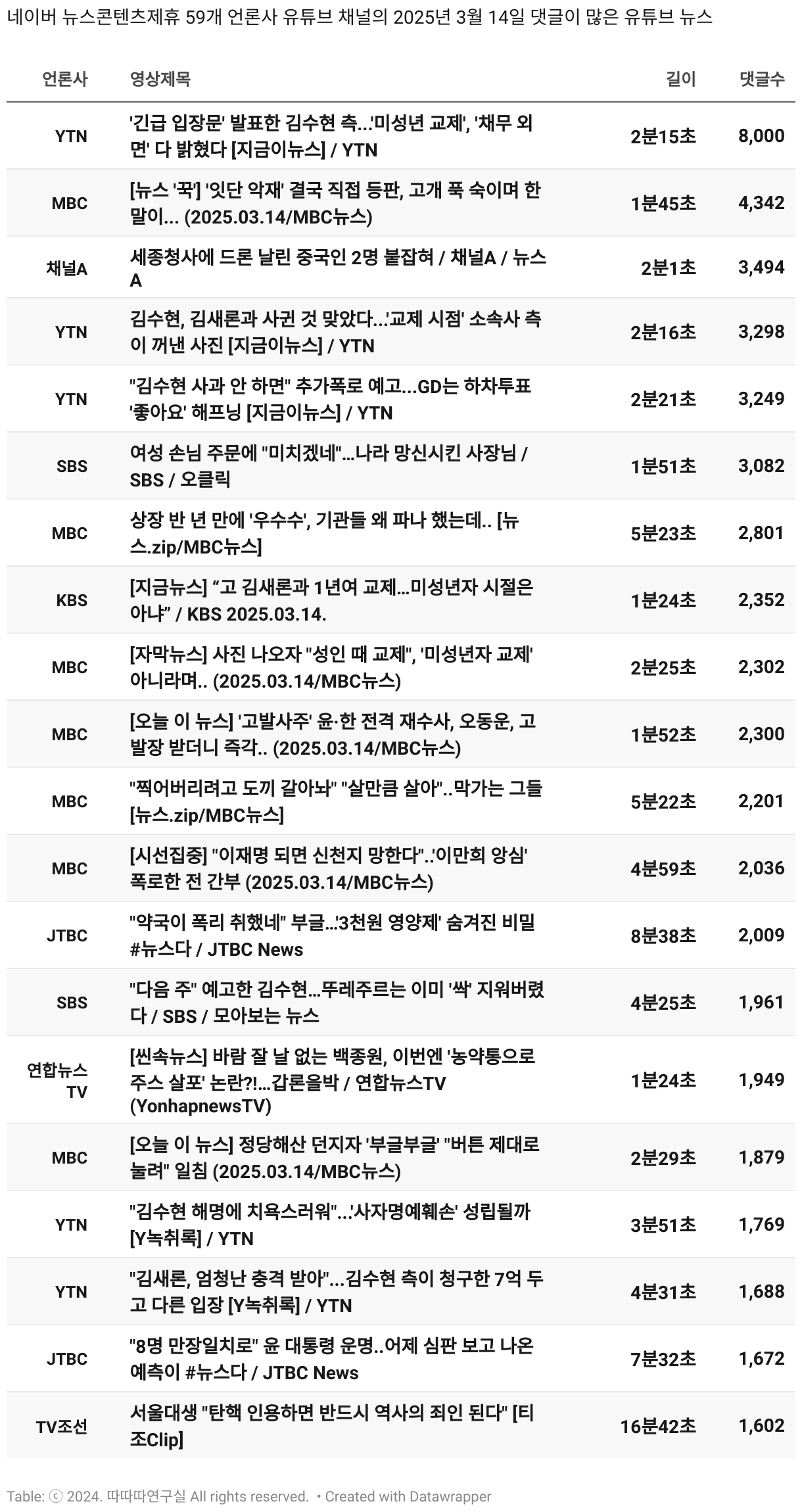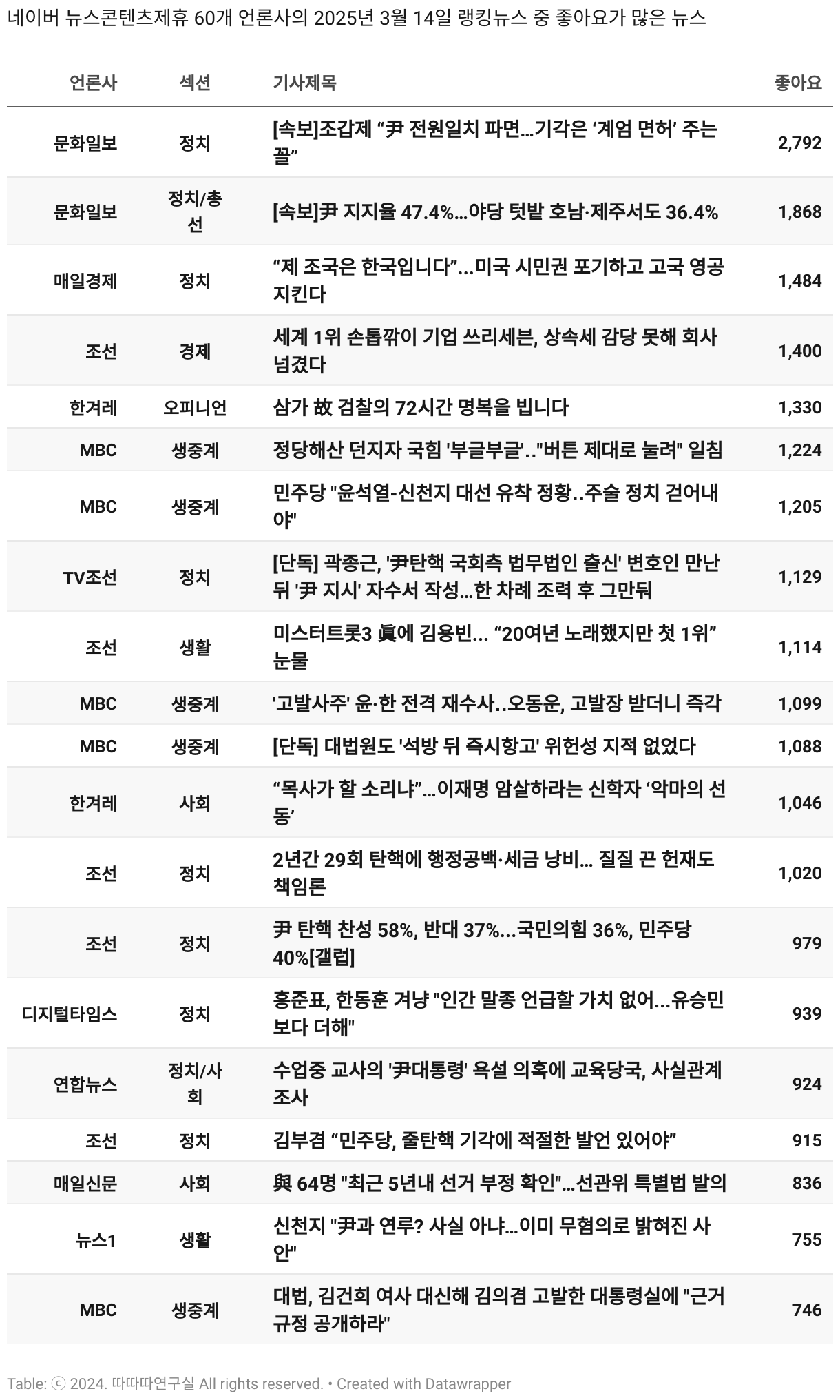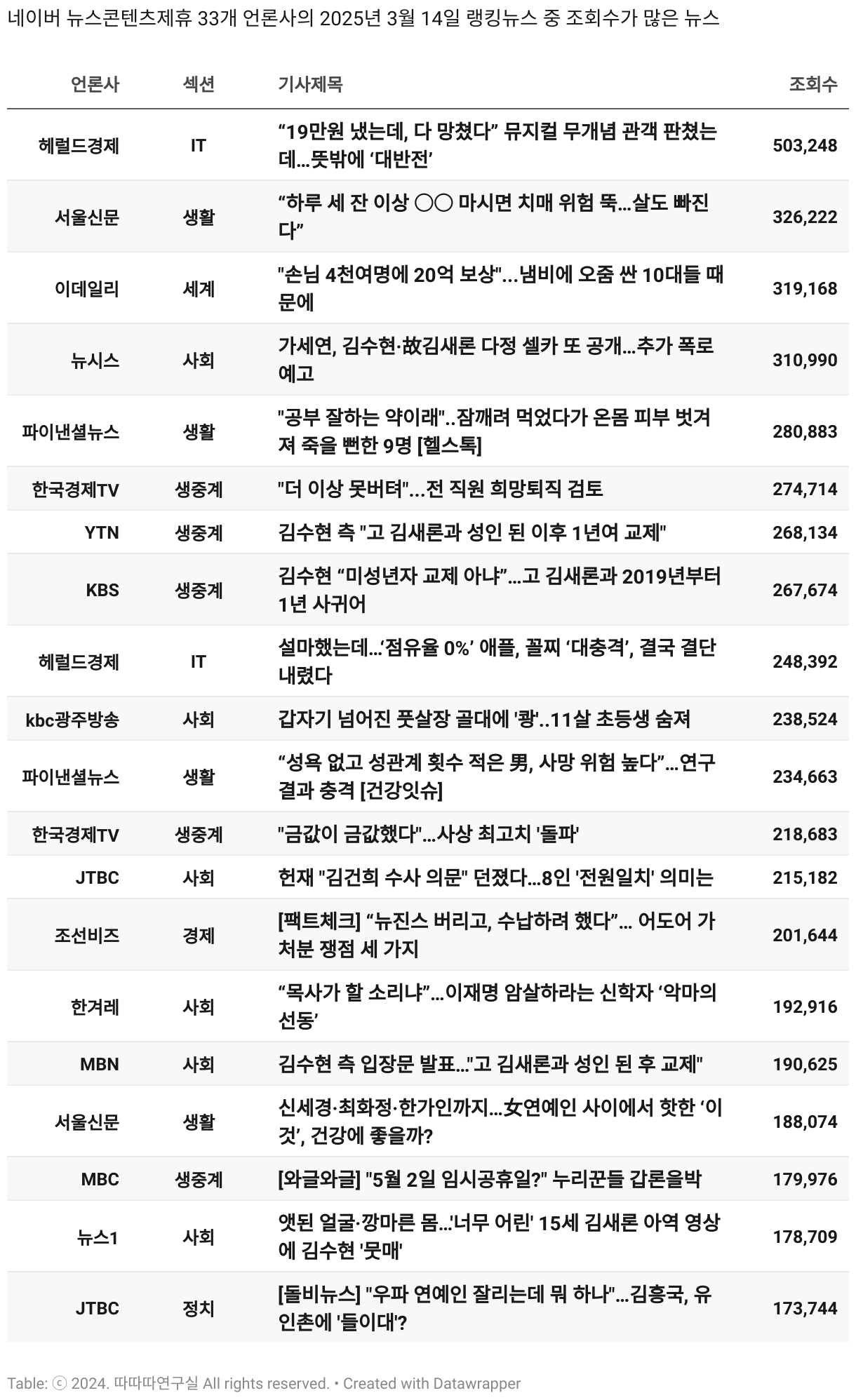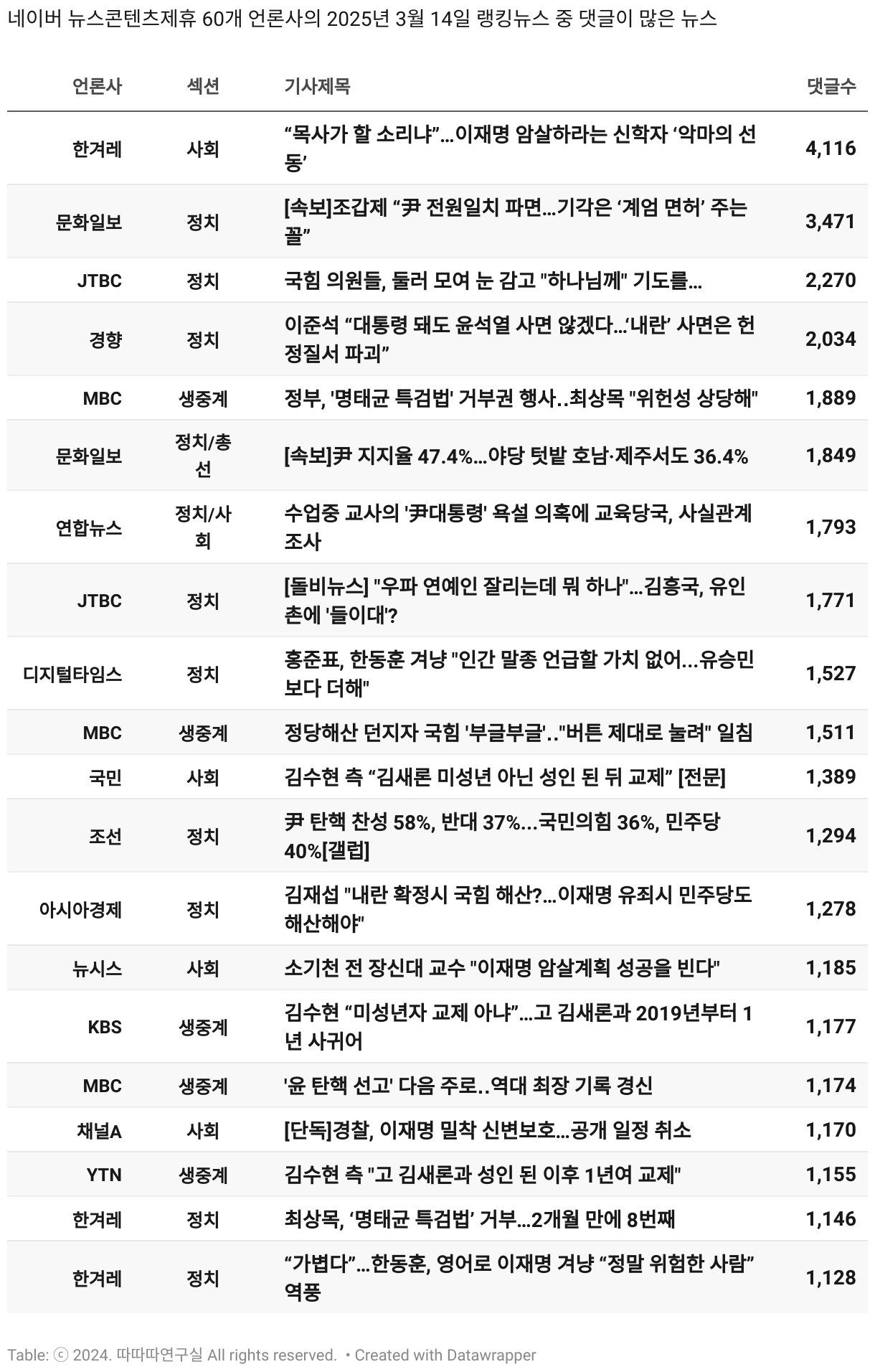*데이터 수집 기간 : 2024년 6월 10일 *데이터 수집 대상 : 네이버 뉴스콘텐츠제휴 60개 언론사. 종합일간지 10개(경향신문, 국민일보, 동아일보, 문화일보, 서울신문, 세계일보, 조선일보, 중앙일보, 한겨레신문, 한국일보), 방송/통신사 14개(뉴스1, 뉴시스, 연합뉴스, 연합뉴스TV, 채널A, 한국경제TV, JTBC, KBS, MBC, MBN, SBS, SBS BIZ, TV조선, YTN), 경제지 11개(매일경제, 머니투데이, 비즈워치, 서울경제, 아시아경제, 이데일리, 조선비즈, 조세일보, 파이낸셜뉴스, 한국경제(유튜브제외), 헤럴드경제) 인터넷 8개(노컷뉴스, 더팩트, 데일리안, 머니S, 미디어오늘, 아이뉴스24, 오마이뉴스, 프레시안), IT 5개(디지털데일리,디지털타임스, 블로터, 전자신문, 지디넷코리아), 지역 12개(강원도민일보, 강원일보, 경기일보, 국제신문, 대구MBC, 대전일보, 매일신문, 부산일보, 전주MBC, CJB청주방송, JIBS, kbc광주방송)