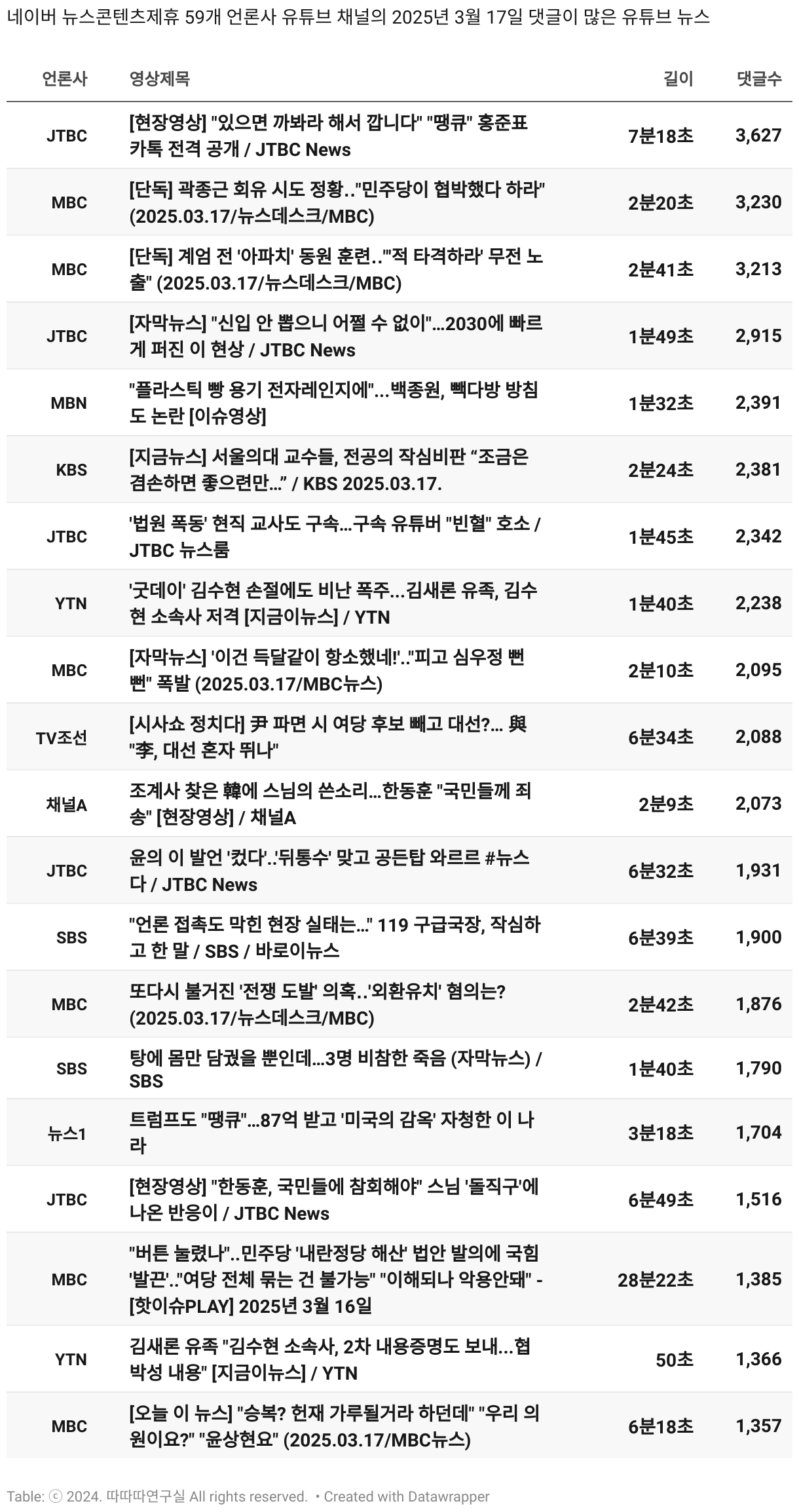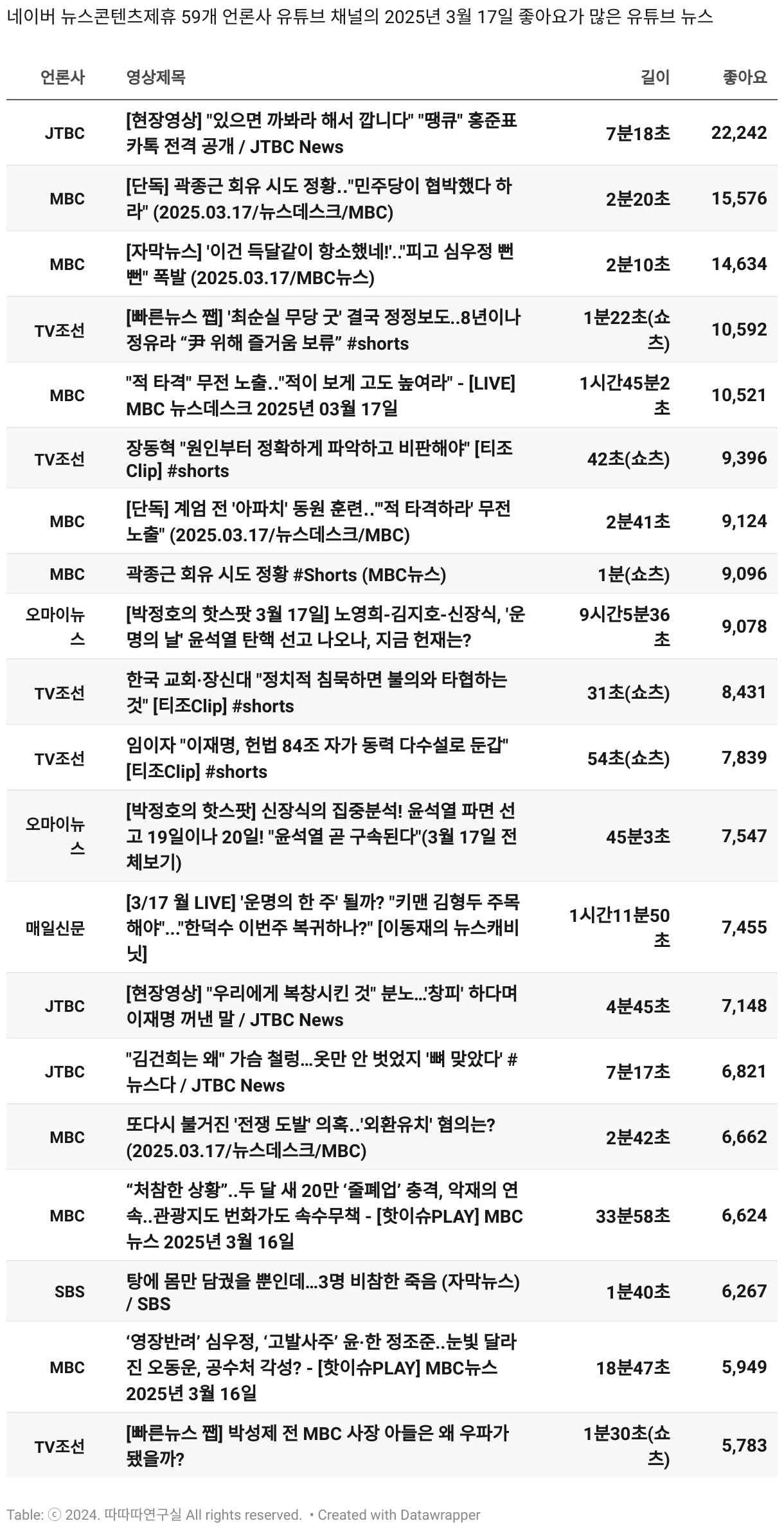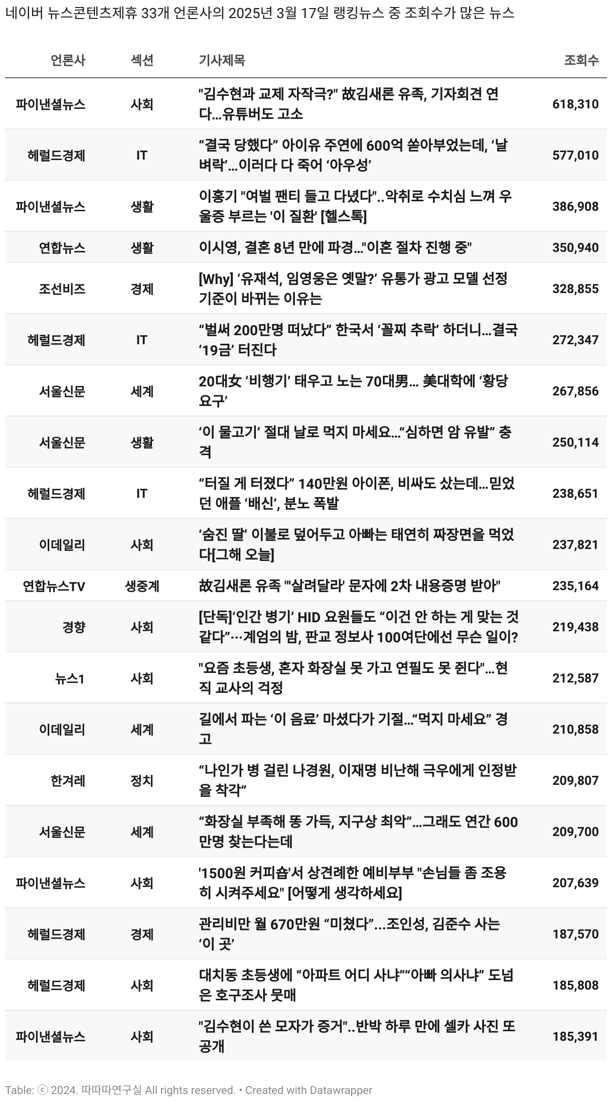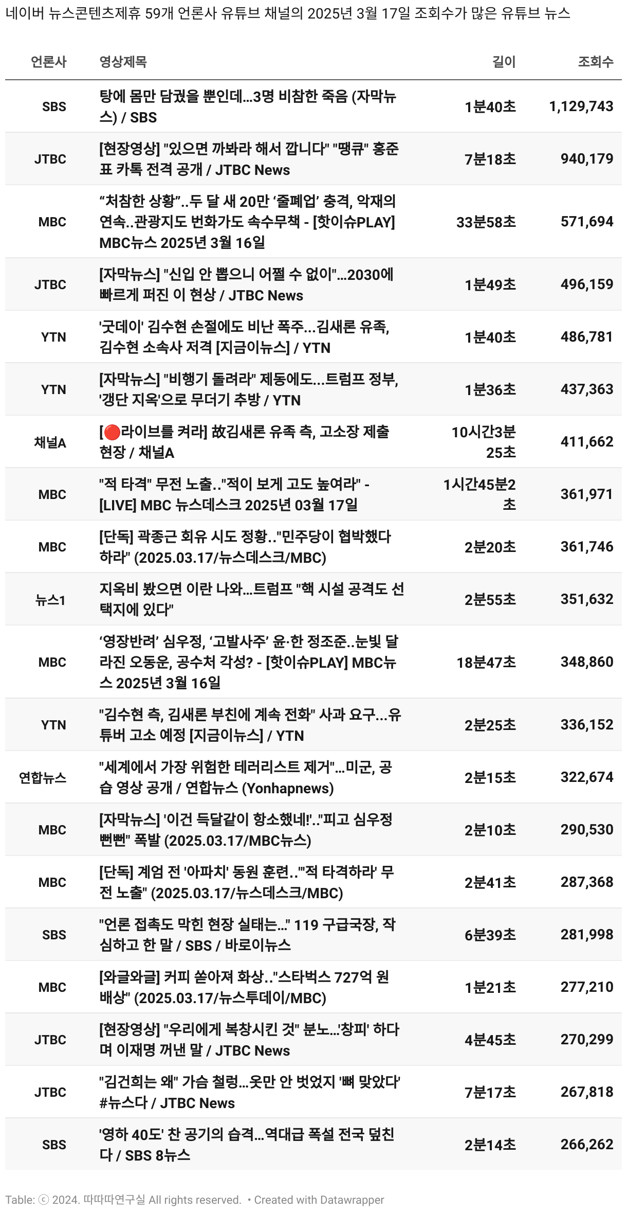 *데이터 수집 기간 : 2024년 6월 10일 *데이터 수집 대상 : 네이버 뉴스콘텐츠제휴 60개 언론사. 종합일간지 10개(경향신문, 국민일보, 동아일보, 문화일보, 서울신문, 세계일보, 조선일보, 중앙일보, 한겨레신문, 한국일보), 방송/통신사 14개(뉴스1, 뉴시스, 연합뉴스, 연합뉴스TV, 채널A, 한국경제TV, JTBC, KBS, MBC, MBN, SBS, SBS BIZ, TV조선, YTN), 경제지 11개(매일경제, 머니투데이, 비즈워치, 서울경제, 아시아경제, 이데일리, 조선비즈, 조세일보, 파이낸셜뉴스, 한국경제(유튜브제외), 헤럴드경제) 인터넷 8개(노컷뉴스, 더팩트, 데일리안, 머니S, 미디어오늘, 아이뉴스24, 오마이뉴스, 프레시안), IT 5개(디지털데일리,디지털타임스, 블로터, 전자신문, 지디넷코리아), 지역 12개(강원도민일보, 강원일보, 경기일보, 국제신문, 대구MBC, 대전일보, 매일신문, 부산일보, 전주MBC, CJB청주방송, JIBS, kbc광주방송)