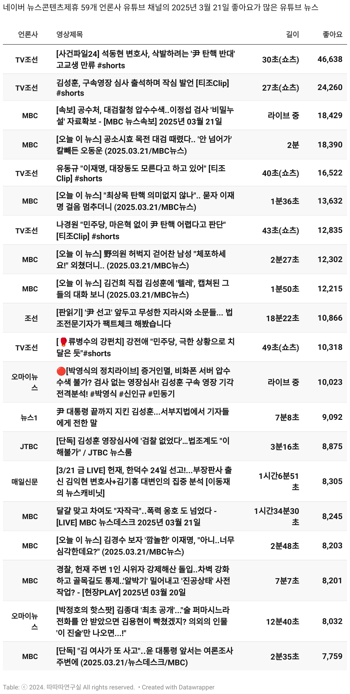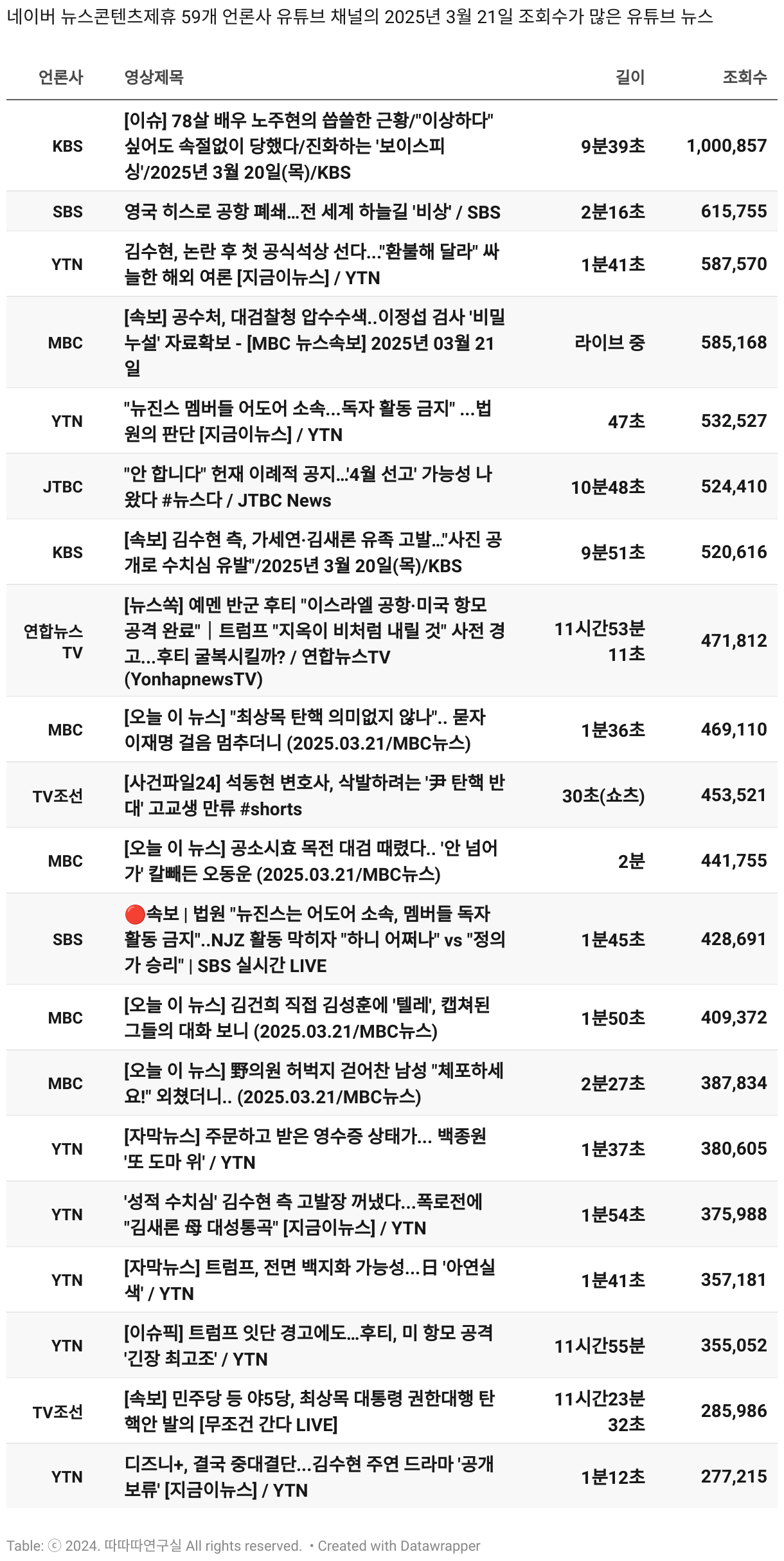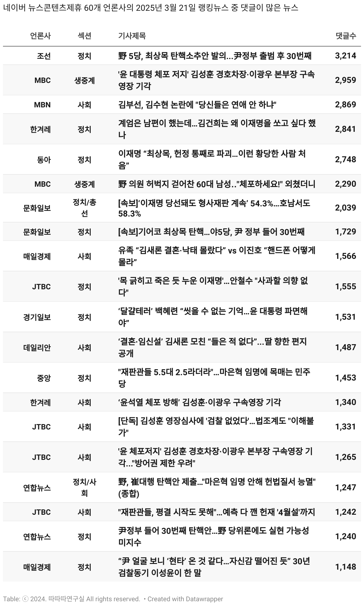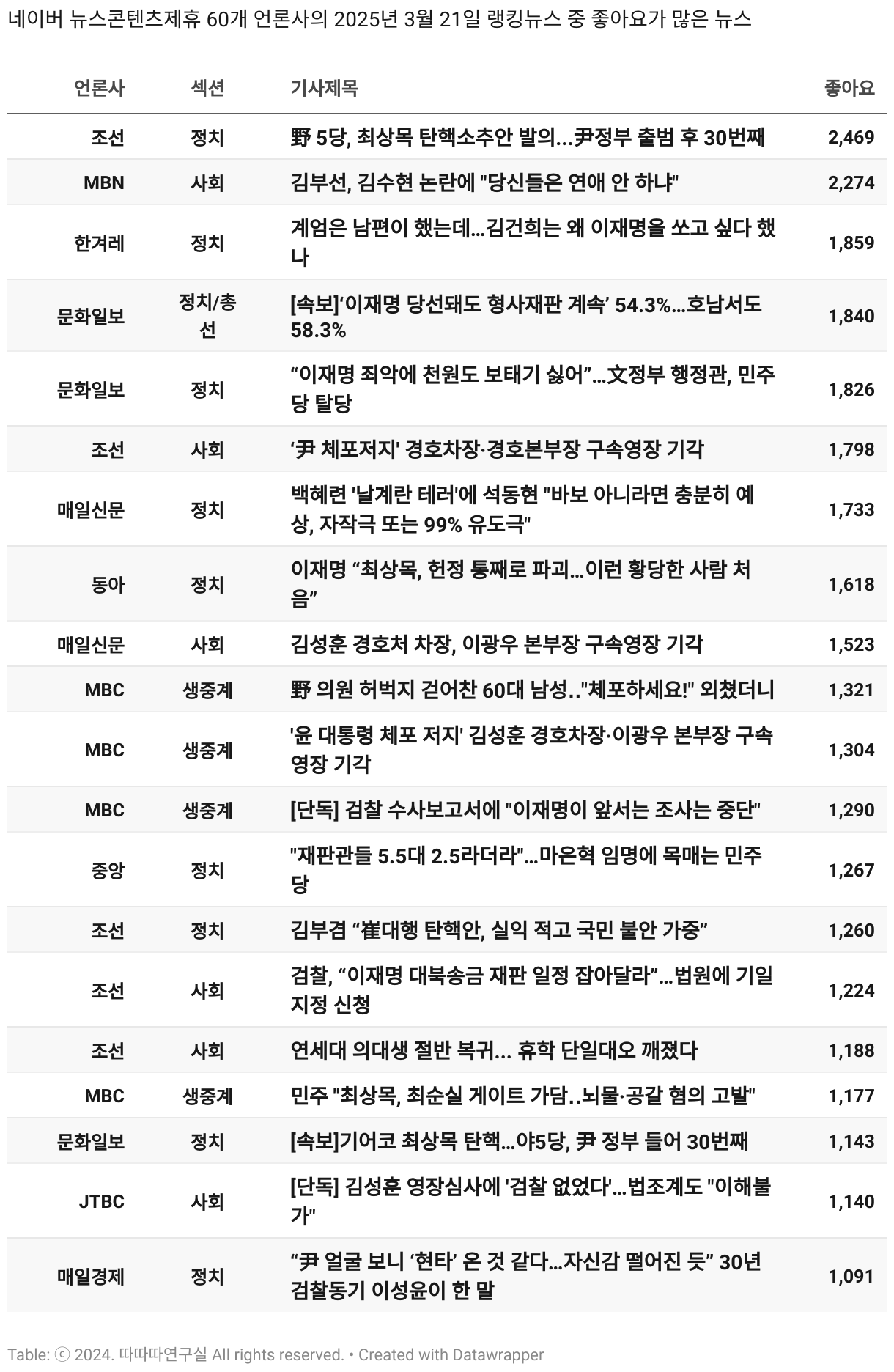 *데이터 수집 기간 : 2024년 6월 10일 *데이터 수집 대상 : 네이버 뉴스콘텐츠제휴 60개 언론사. 종합일간지 10개(경향신문, 국민일보, 동아일보, 문화일보, 서울신문, 세계일보, 조선일보, 중앙일보, 한겨레신문, 한국일보), 방송/통신사 14개(뉴스1, 뉴시스, 연합뉴스, 연합뉴스TV, 채널A, 한국경제TV, JTBC, KBS, MBC, MBN, SBS, SBS BIZ, TV조선, YTN), 경제지 11개(매일경제, 머니투데이, 비즈워치, 서울경제, 아시아경제, 이데일리, 조선비즈, 조세일보, 파이낸셜뉴스, 한국경제(유튜브제외), 헤럴드경제) 인터넷 8개(노컷뉴스, 더팩트, 데일리안, 머니S, 미디어오늘, 아이뉴스24, 오마이뉴스, 프레시안), IT 5개(디지털데일리,디지털타임스, 블로터, 전자신문, 지디넷코리아), 지역 12개(강원도민일보, 강원일보, 경기일보, 국제신문, 대구MBC, 대전일보, 매일신문, 부산일보, 전주MBC, CJB청주방송, JIBS, kbc광주방송)