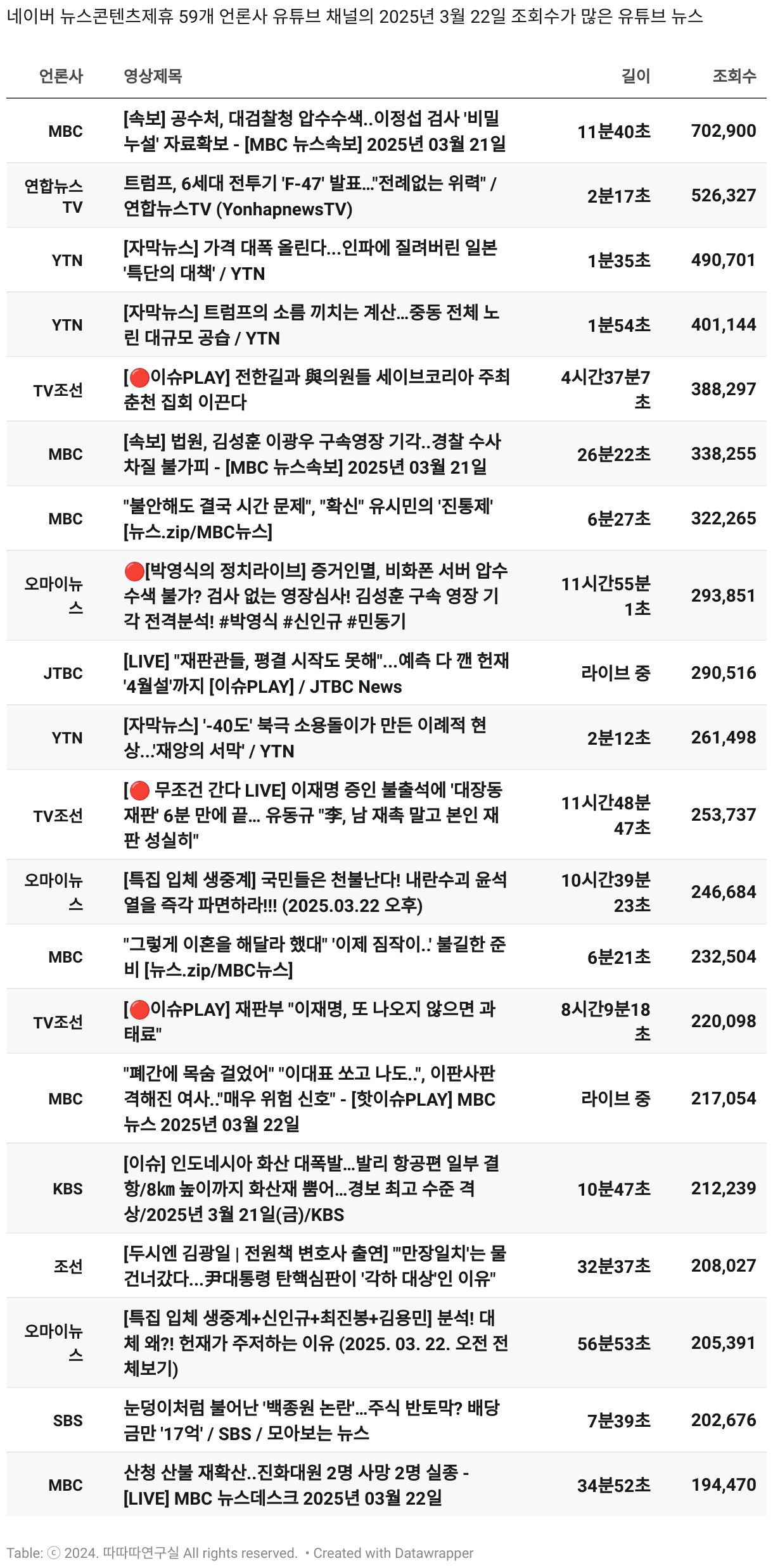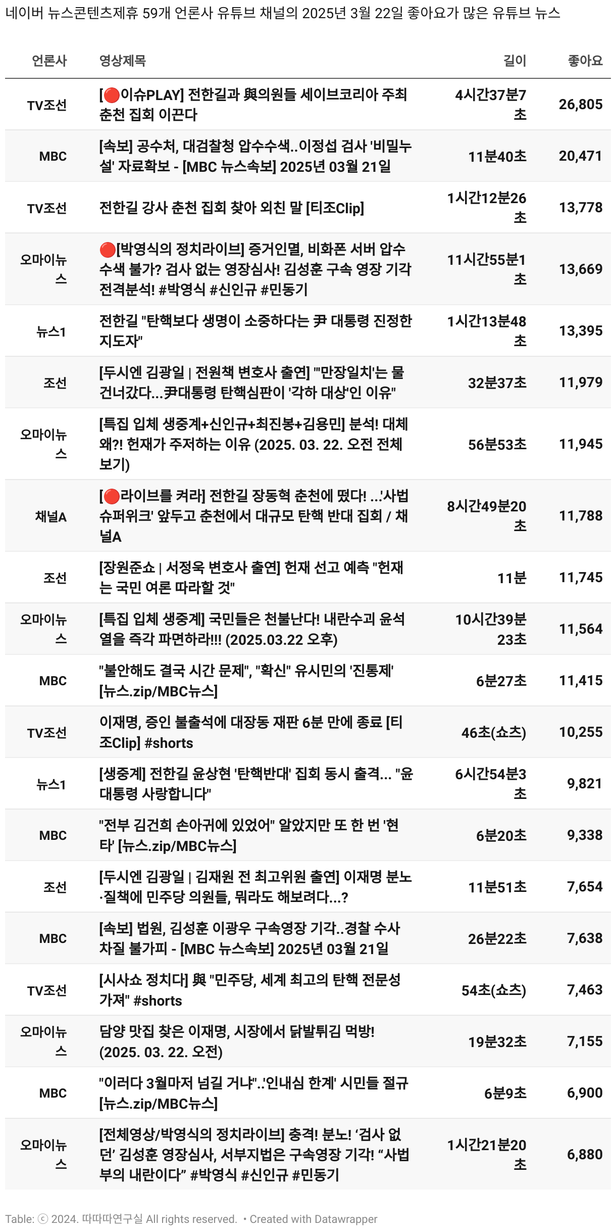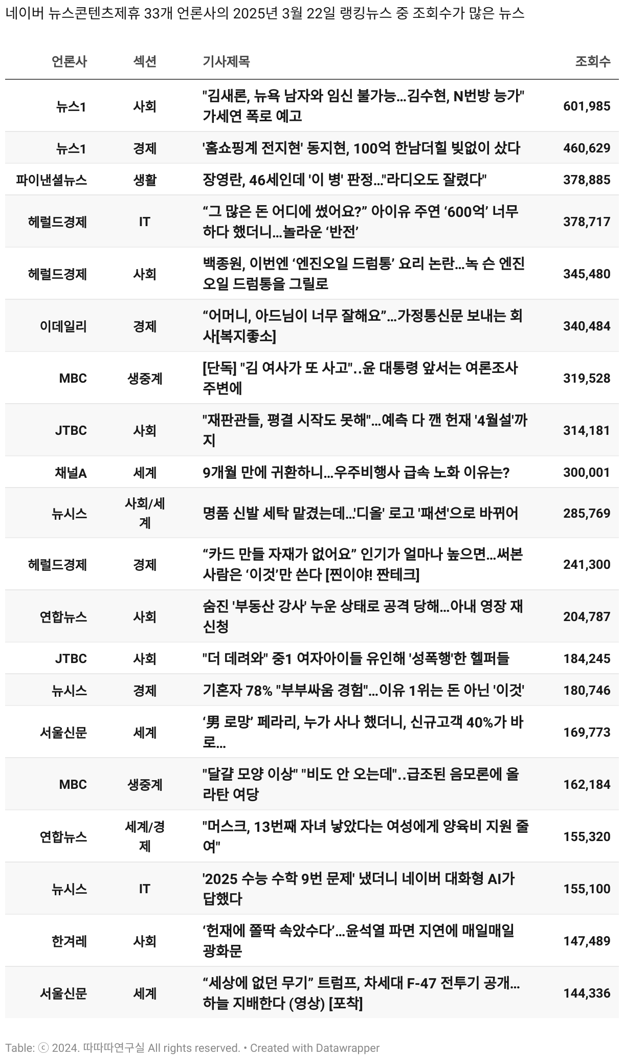 *데이터 수집 기간 : 2024년 6월 10일 *데이터 수집 대상 : 네이버 뉴스콘텐츠제휴 60개 언론사. 종합일간지 10개(경향신문, 국민일보, 동아일보, 문화일보, 서울신문, 세계일보, 조선일보, 중앙일보, 한겨레신문, 한국일보), 방송/통신사 14개(뉴스1, 뉴시스, 연합뉴스, 연합뉴스TV, 채널A, 한국경제TV, JTBC, KBS, MBC, MBN, SBS, SBS BIZ, TV조선, YTN), 경제지 11개(매일경제, 머니투데이, 비즈워치, 서울경제, 아시아경제, 이데일리, 조선비즈, 조세일보, 파이낸셜뉴스, 한국경제(유튜브제외), 헤럴드경제) 인터넷 8개(노컷뉴스, 더팩트, 데일리안, 머니S, 미디어오늘, 아이뉴스24, 오마이뉴스, 프레시안), IT 5개(디지털데일리,디지털타임스, 블로터, 전자신문, 지디넷코리아), 지역 12개(강원도민일보, 강원일보, 경기일보, 국제신문, 대구MBC, 대전일보, 매일신문, 부산일보, 전주MBC, CJB청주방송, JIBS, kbc광주방송)