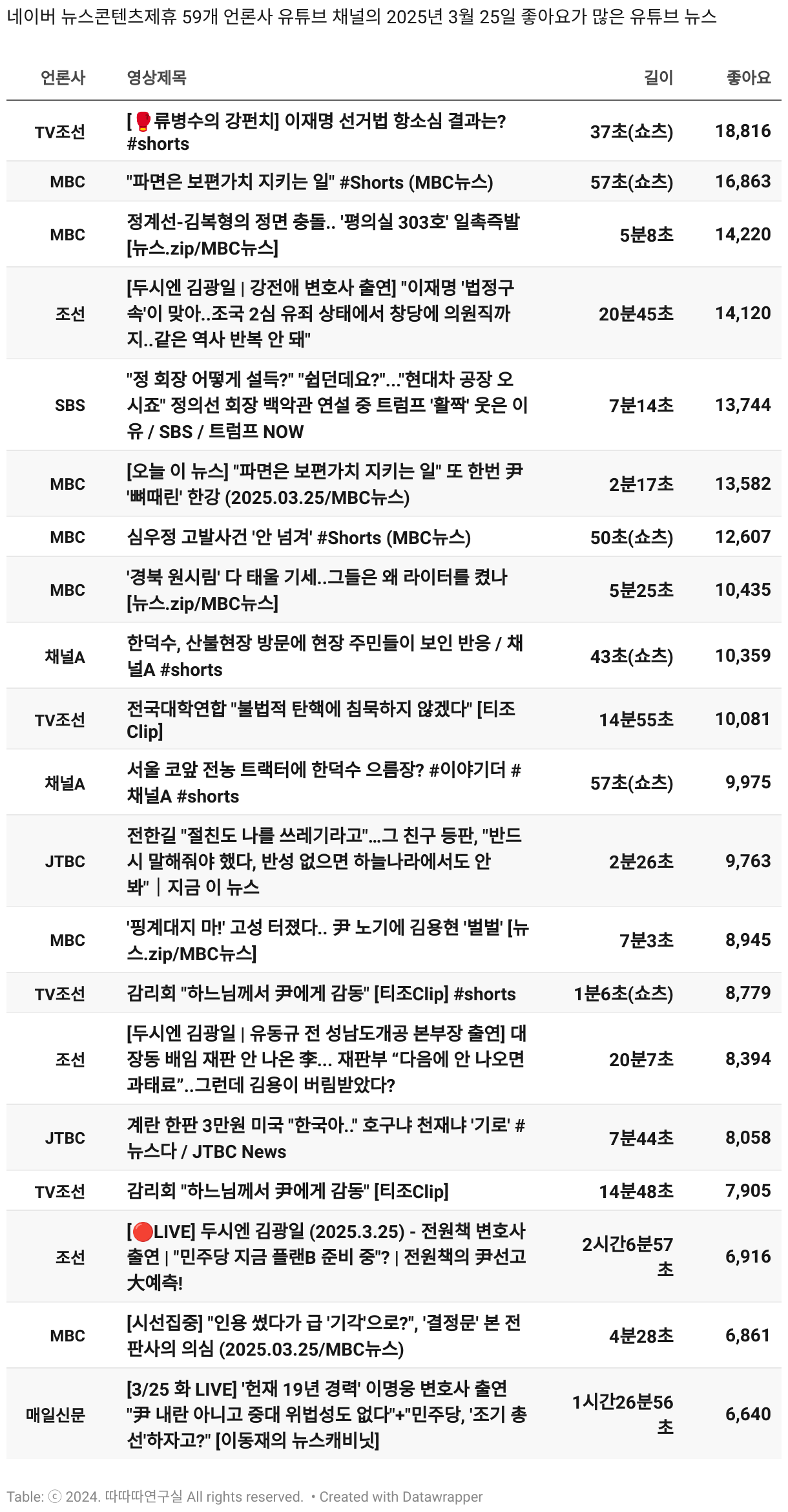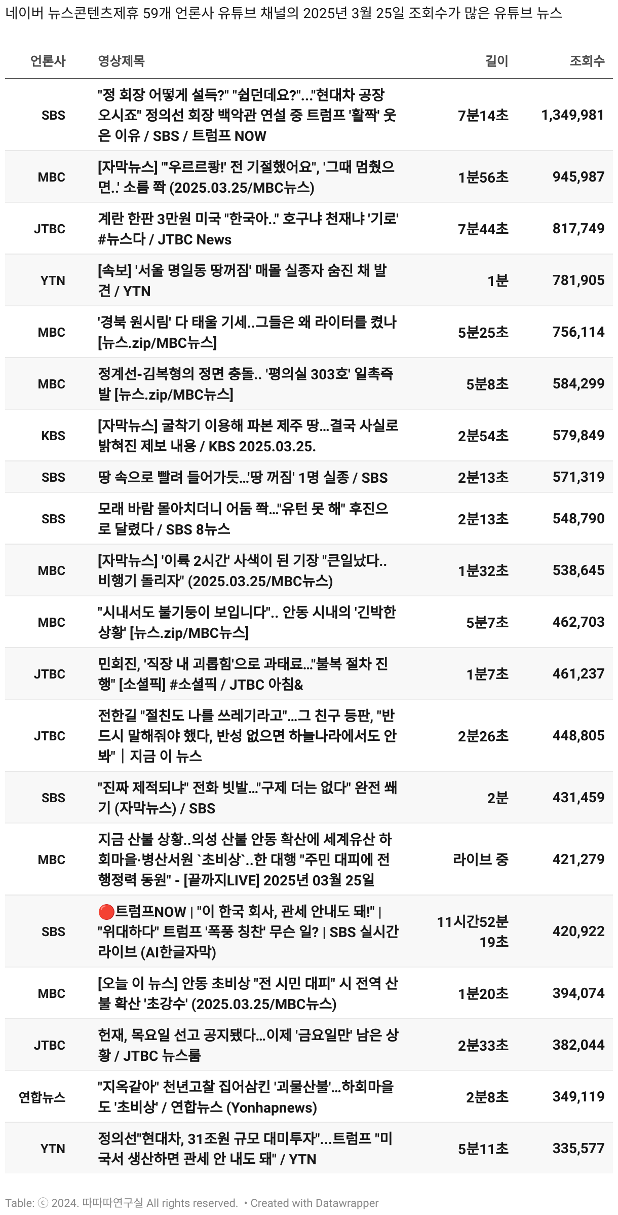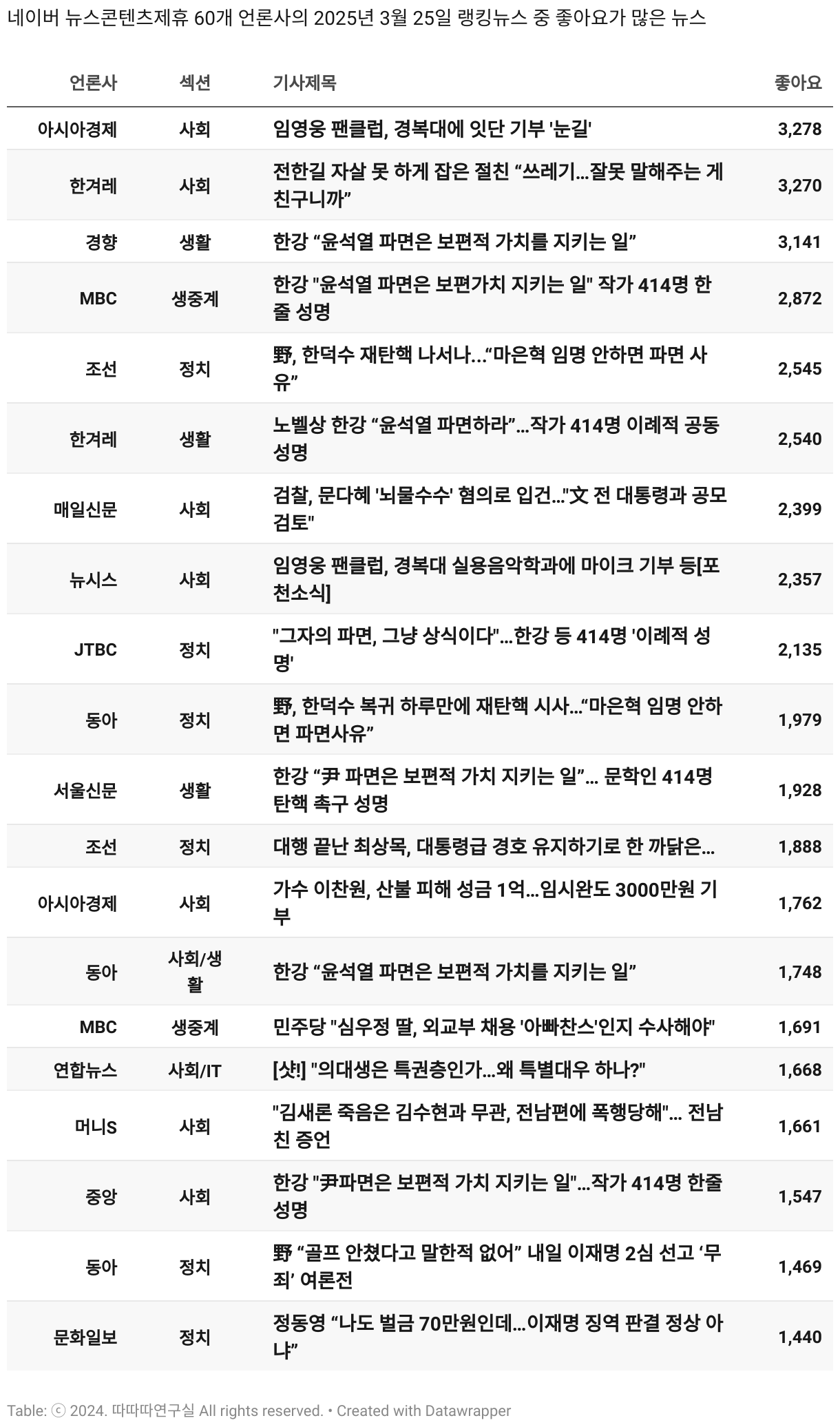 *데이터 수집 기간 : 2024년 6월 10일 *데이터 수집 대상 : 네이버 뉴스콘텐츠제휴 60개 언론사. 종합일간지 10개(경향신문, 국민일보, 동아일보, 문화일보, 서울신문, 세계일보, 조선일보, 중앙일보, 한겨레신문, 한국일보), 방송/통신사 14개(뉴스1, 뉴시스, 연합뉴스, 연합뉴스TV, 채널A, 한국경제TV, JTBC, KBS, MBC, MBN, SBS, SBS BIZ, TV조선, YTN), 경제지 11개(매일경제, 머니투데이, 비즈워치, 서울경제, 아시아경제, 이데일리, 조선비즈, 조세일보, 파이낸셜뉴스, 한국경제(유튜브제외), 헤럴드경제) 인터넷 8개(노컷뉴스, 더팩트, 데일리안, 머니S, 미디어오늘, 아이뉴스24, 오마이뉴스, 프레시안), IT 5개(디지털데일리,디지털타임스, 블로터, 전자신문, 지디넷코리아), 지역 12개(강원도민일보, 강원일보, 경기일보, 국제신문, 대구MBC, 대전일보, 매일신문, 부산일보, 전주MBC, CJB청주방송, JIBS, kbc광주방송)