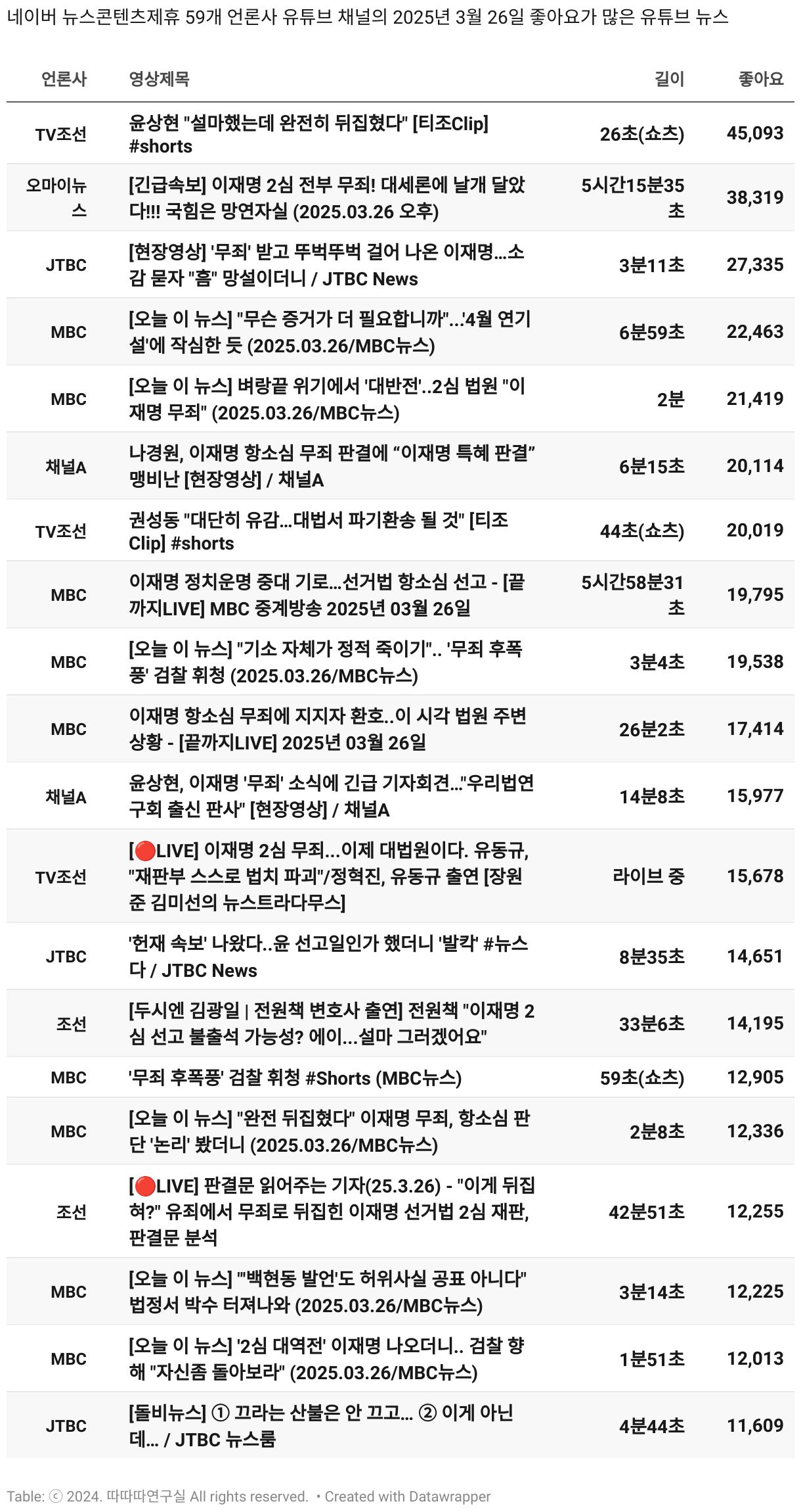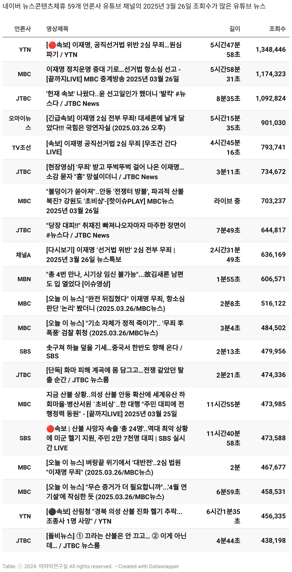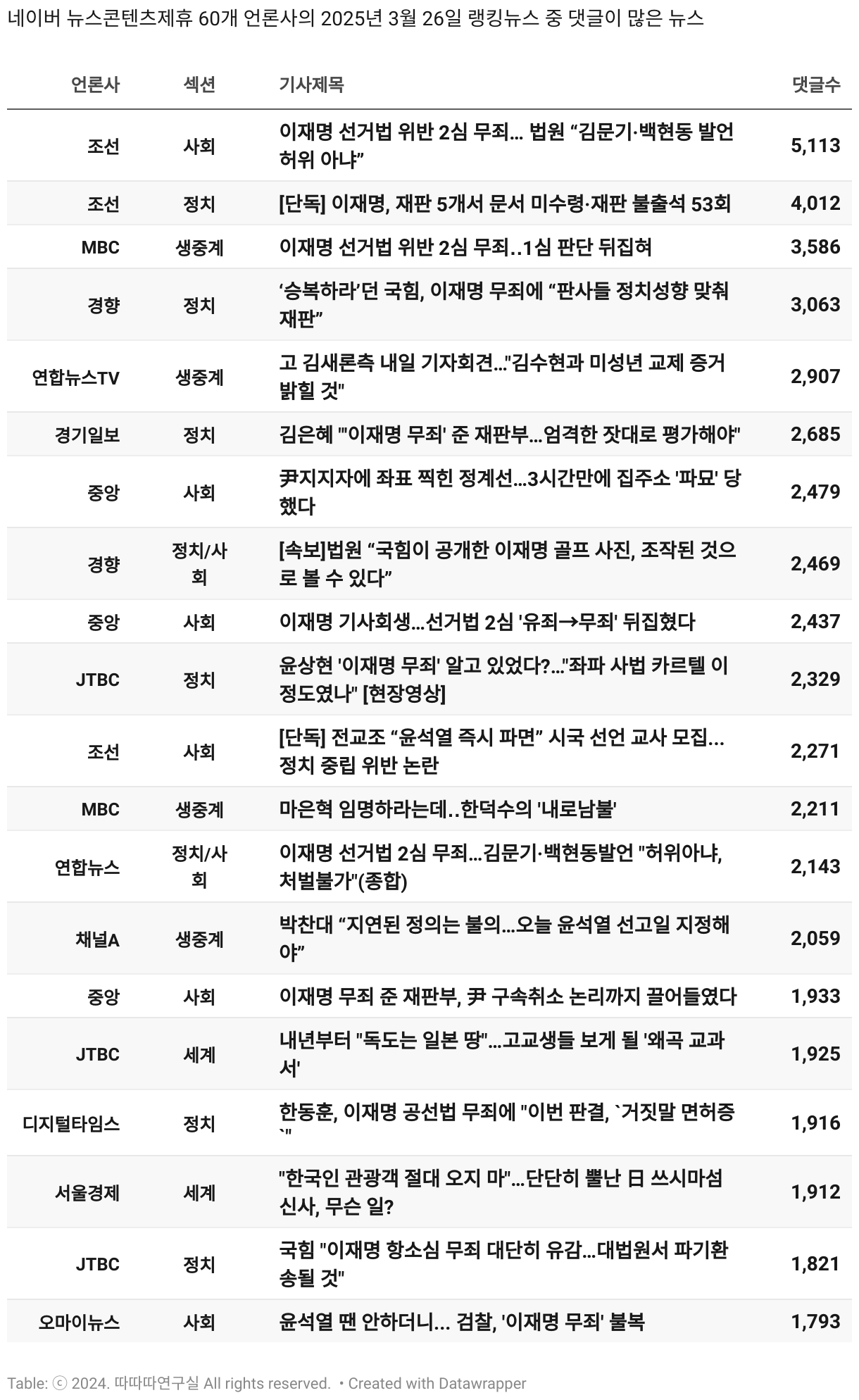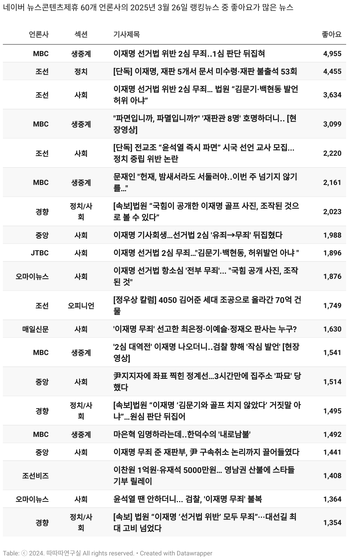 *데이터 수집 기간 : 2024년 6월 10일 *데이터 수집 대상 : 네이버 뉴스콘텐츠제휴 60개 언론사. 종합일간지 10개(경향신문, 국민일보, 동아일보, 문화일보, 서울신문, 세계일보, 조선일보, 중앙일보, 한겨레신문, 한국일보), 방송/통신사 14개(뉴스1, 뉴시스, 연합뉴스, 연합뉴스TV, 채널A, 한국경제TV, JTBC, KBS, MBC, MBN, SBS, SBS BIZ, TV조선, YTN), 경제지 11개(매일경제, 머니투데이, 비즈워치, 서울경제, 아시아경제, 이데일리, 조선비즈, 조세일보, 파이낸셜뉴스, 한국경제(유튜브제외), 헤럴드경제) 인터넷 8개(노컷뉴스, 더팩트, 데일리안, 머니S, 미디어오늘, 아이뉴스24, 오마이뉴스, 프레시안), IT 5개(디지털데일리,디지털타임스, 블로터, 전자신문, 지디넷코리아), 지역 12개(강원도민일보, 강원일보, 경기일보, 국제신문, 대구MBC, 대전일보, 매일신문, 부산일보, 전주MBC, CJB청주방송, JIBS, kbc광주방송)