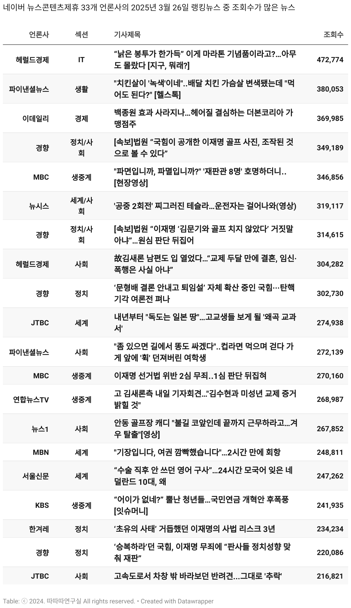 보도 시간대 기준 가장 흥한 기사 3건이 표시됩니다.