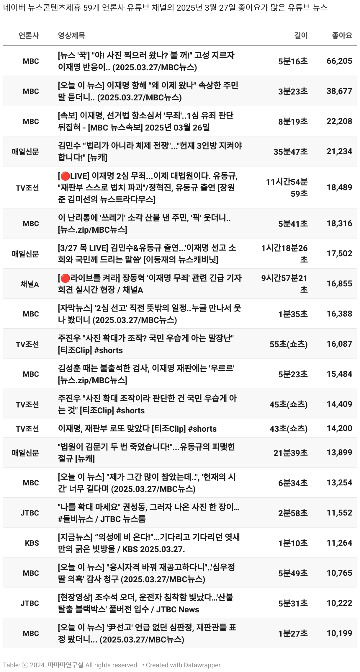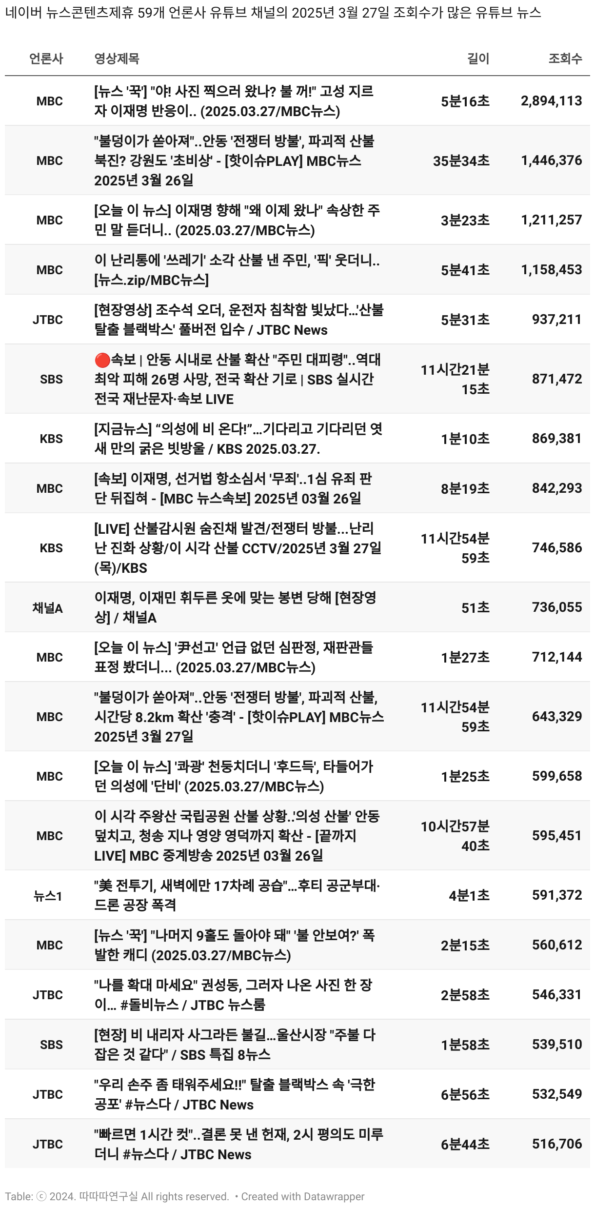 *데이터 수집 기간 : 2024년 6월 10일 *데이터 수집 대상 : 네이버 뉴스콘텐츠제휴 60개 언론사. 종합일간지 10개(경향신문, 국민일보, 동아일보, 문화일보, 서울신문, 세계일보, 조선일보, 중앙일보, 한겨레신문, 한국일보), 방송/통신사 14개(뉴스1, 뉴시스, 연합뉴스, 연합뉴스TV, 채널A, 한국경제TV, JTBC, KBS, MBC, MBN, SBS, SBS BIZ, TV조선, YTN), 경제지 11개(매일경제, 머니투데이, 비즈워치, 서울경제, 아시아경제, 이데일리, 조선비즈, 조세일보, 파이낸셜뉴스, 한국경제(유튜브제외), 헤럴드경제) 인터넷 8개(노컷뉴스, 더팩트, 데일리안, 머니S, 미디어오늘, 아이뉴스24, 오마이뉴스, 프레시안), IT 5개(디지털데일리,디지털타임스, 블로터, 전자신문, 지디넷코리아), 지역 12개(강원도민일보, 강원일보, 경기일보, 국제신문, 대구MBC, 대전일보, 매일신문, 부산일보, 전주MBC, CJB청주방송, JIBS, kbc광주방송)