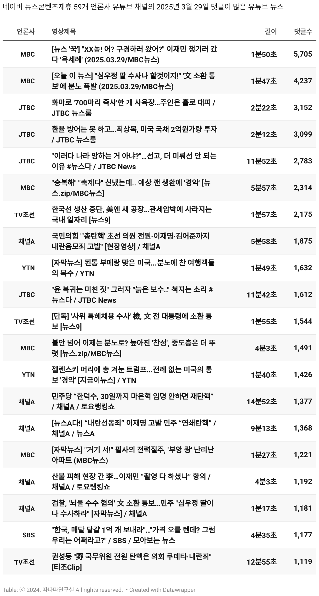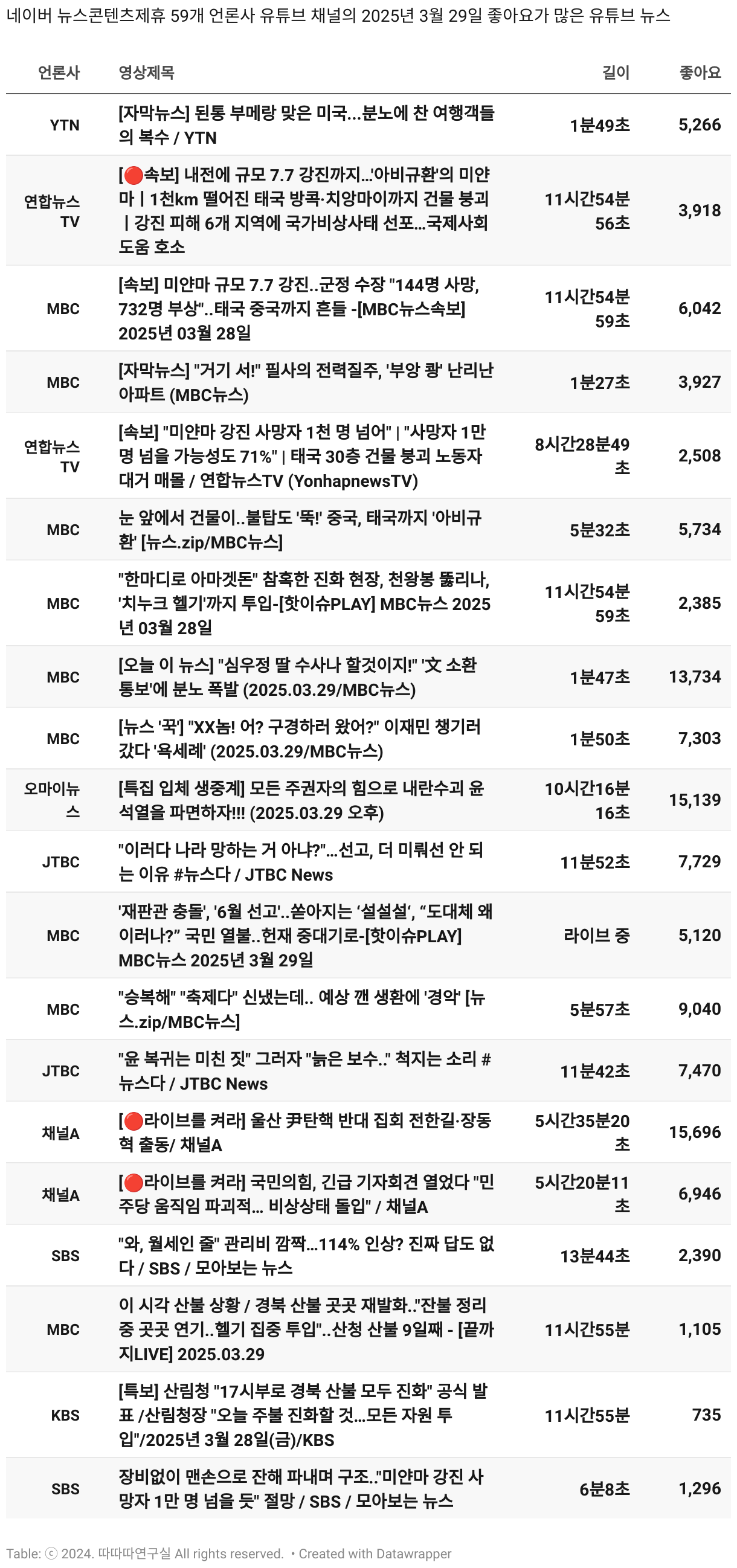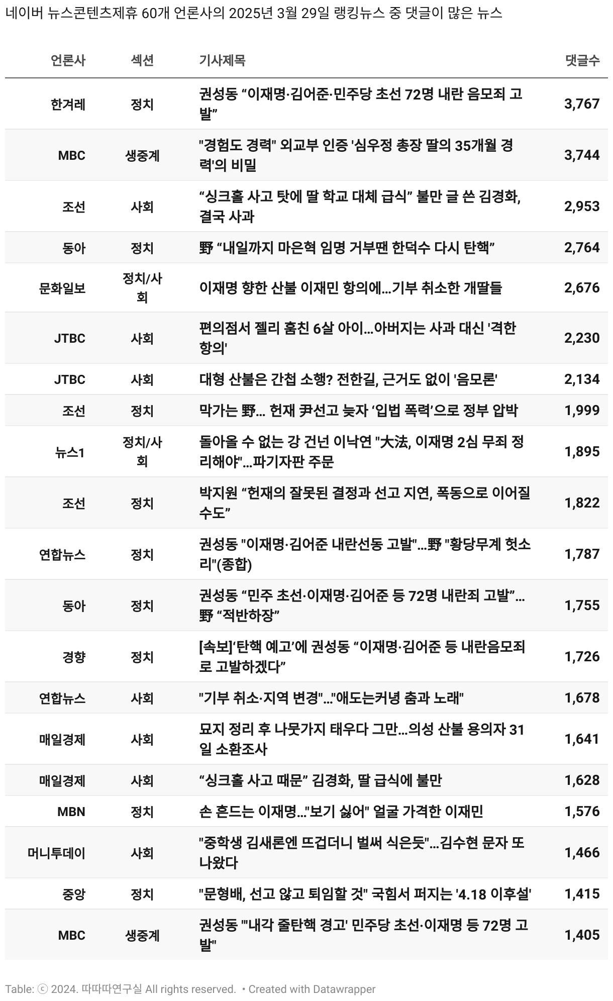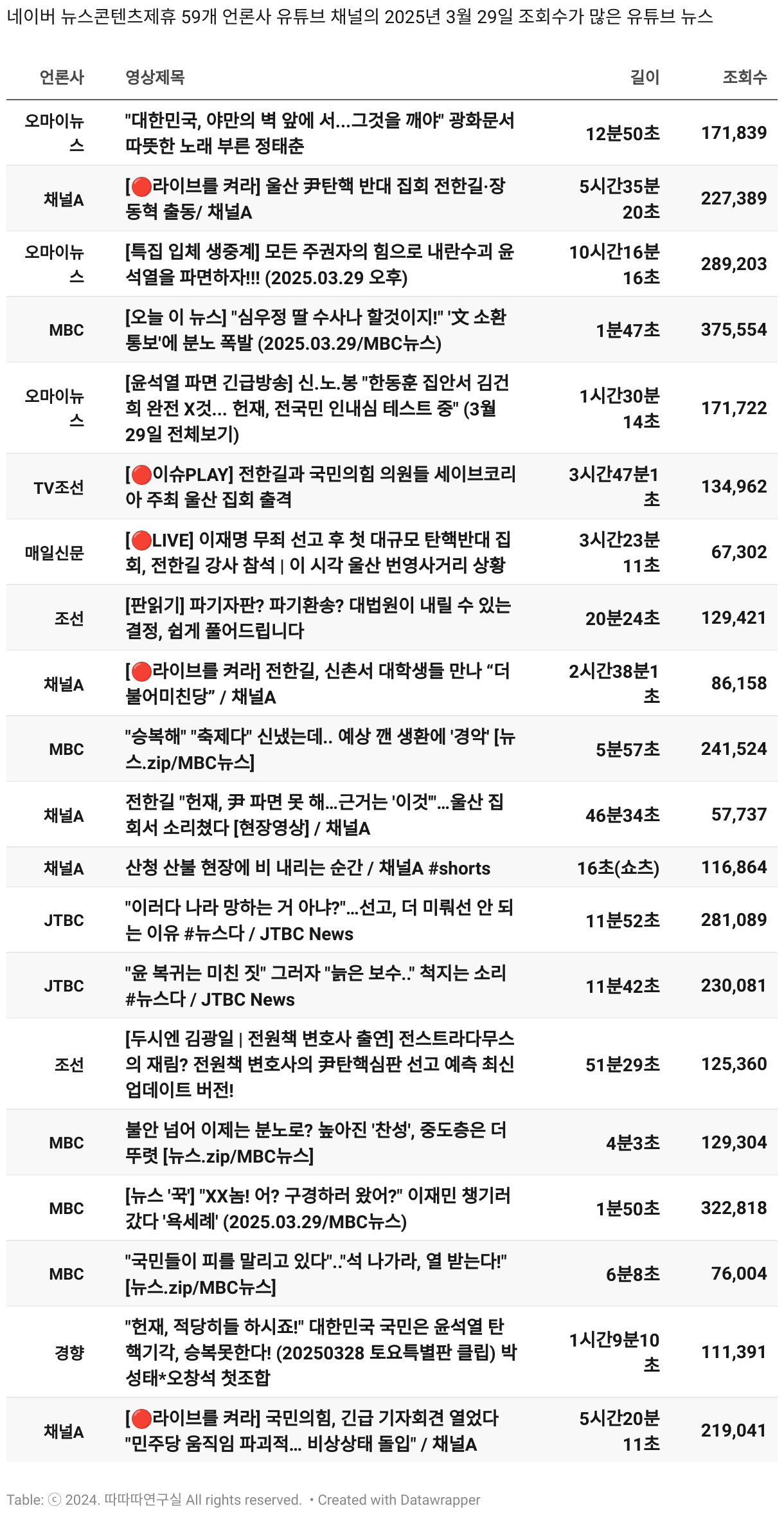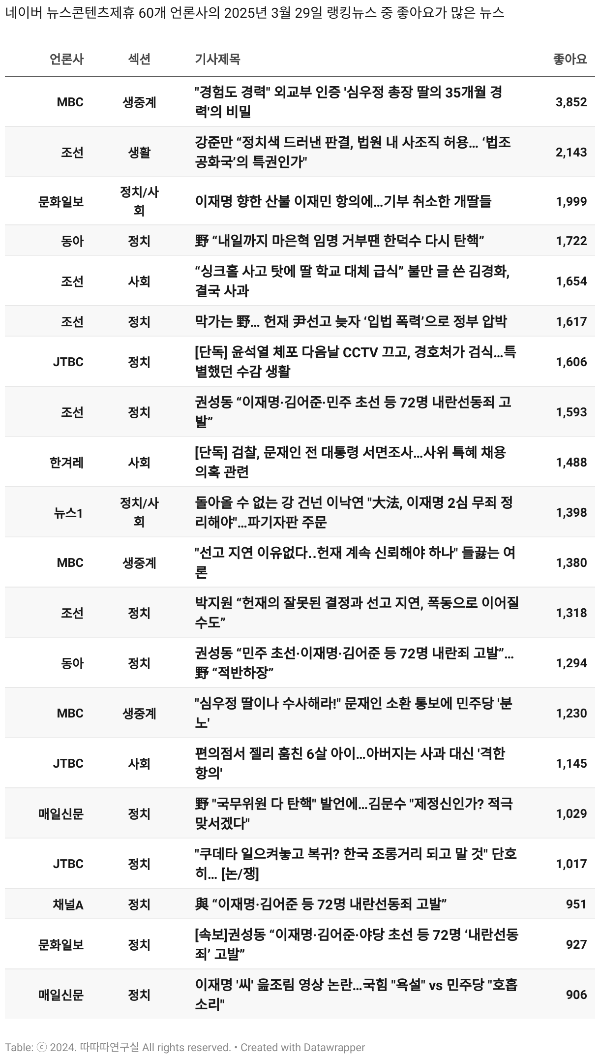 *데이터 수집 기간 : 2024년 6월 10일 *데이터 수집 대상 : 네이버 뉴스콘텐츠제휴 60개 언론사. 종합일간지 10개(경향신문, 국민일보, 동아일보, 문화일보, 서울신문, 세계일보, 조선일보, 중앙일보, 한겨레신문, 한국일보), 방송/통신사 14개(뉴스1, 뉴시스, 연합뉴스, 연합뉴스TV, 채널A, 한국경제TV, JTBC, KBS, MBC, MBN, SBS, SBS BIZ, TV조선, YTN), 경제지 11개(매일경제, 머니투데이, 비즈워치, 서울경제, 아시아경제, 이데일리, 조선비즈, 조세일보, 파이낸셜뉴스, 한국경제(유튜브제외), 헤럴드경제) 인터넷 8개(노컷뉴스, 더팩트, 데일리안, 머니S, 미디어오늘, 아이뉴스24, 오마이뉴스, 프레시안), IT 5개(디지털데일리,디지털타임스, 블로터, 전자신문, 지디넷코리아), 지역 12개(강원도민일보, 강원일보, 경기일보, 국제신문, 대구MBC, 대전일보, 매일신문, 부산일보, 전주MBC, CJB청주방송, JIBS, kbc광주방송)