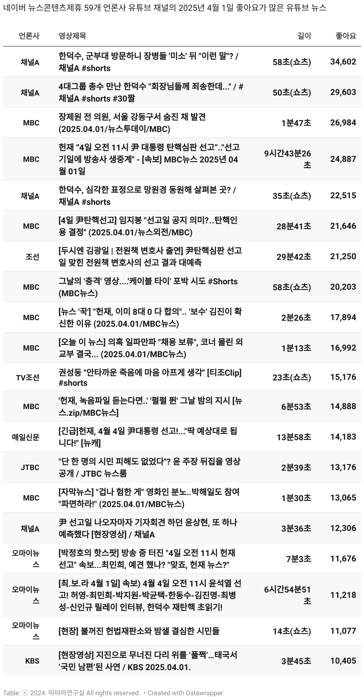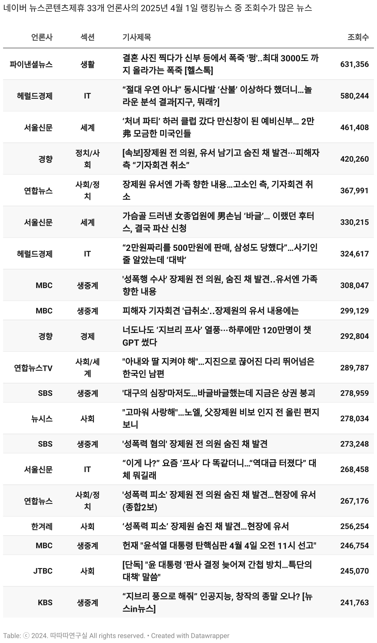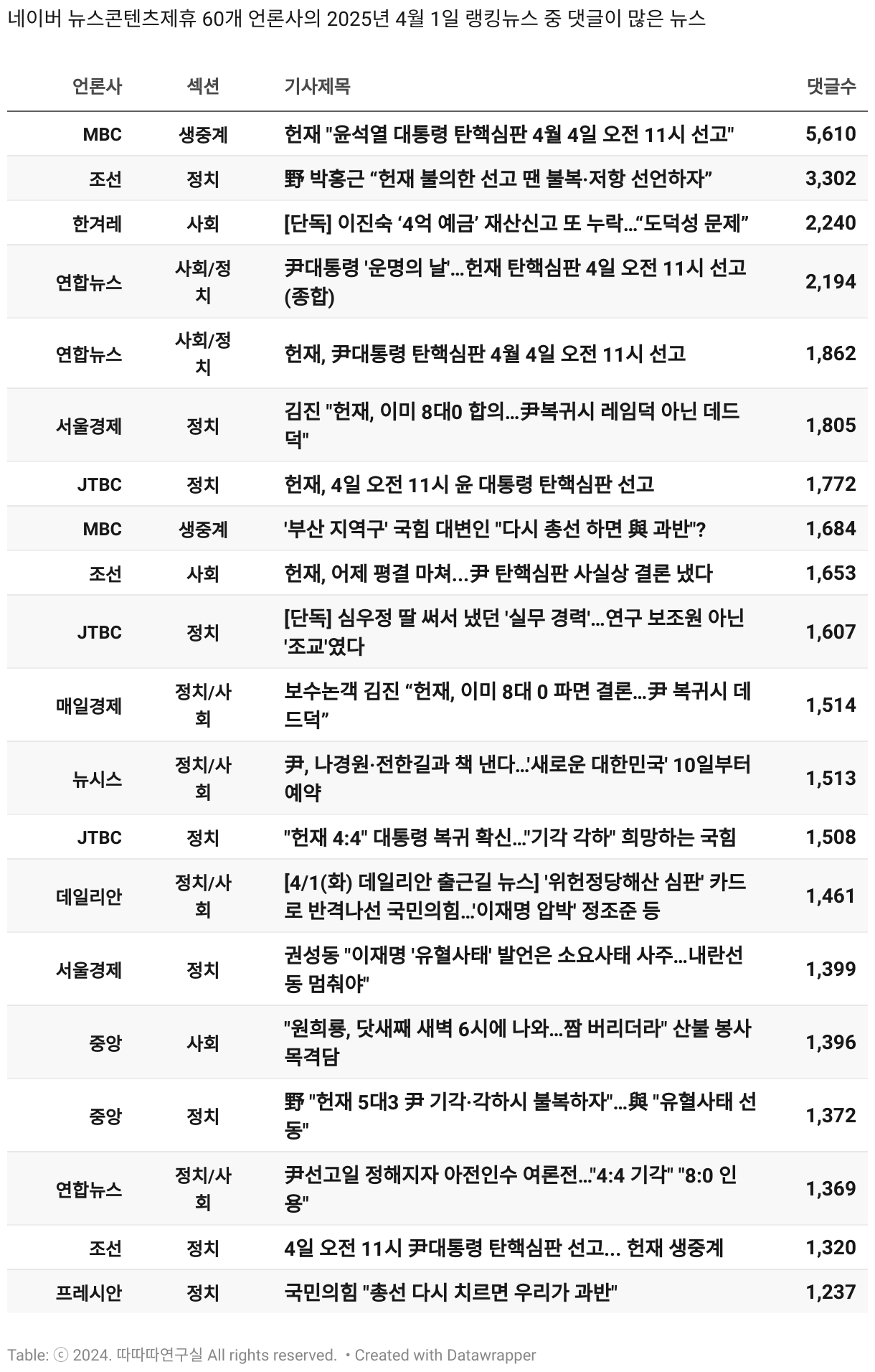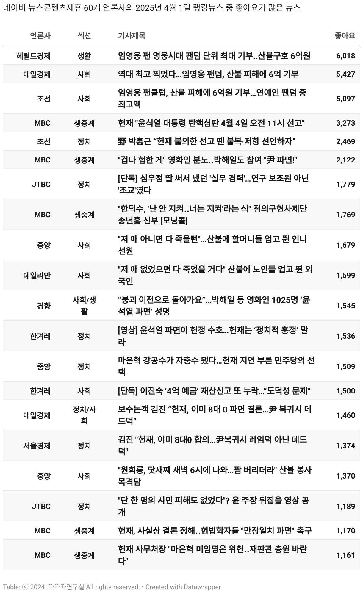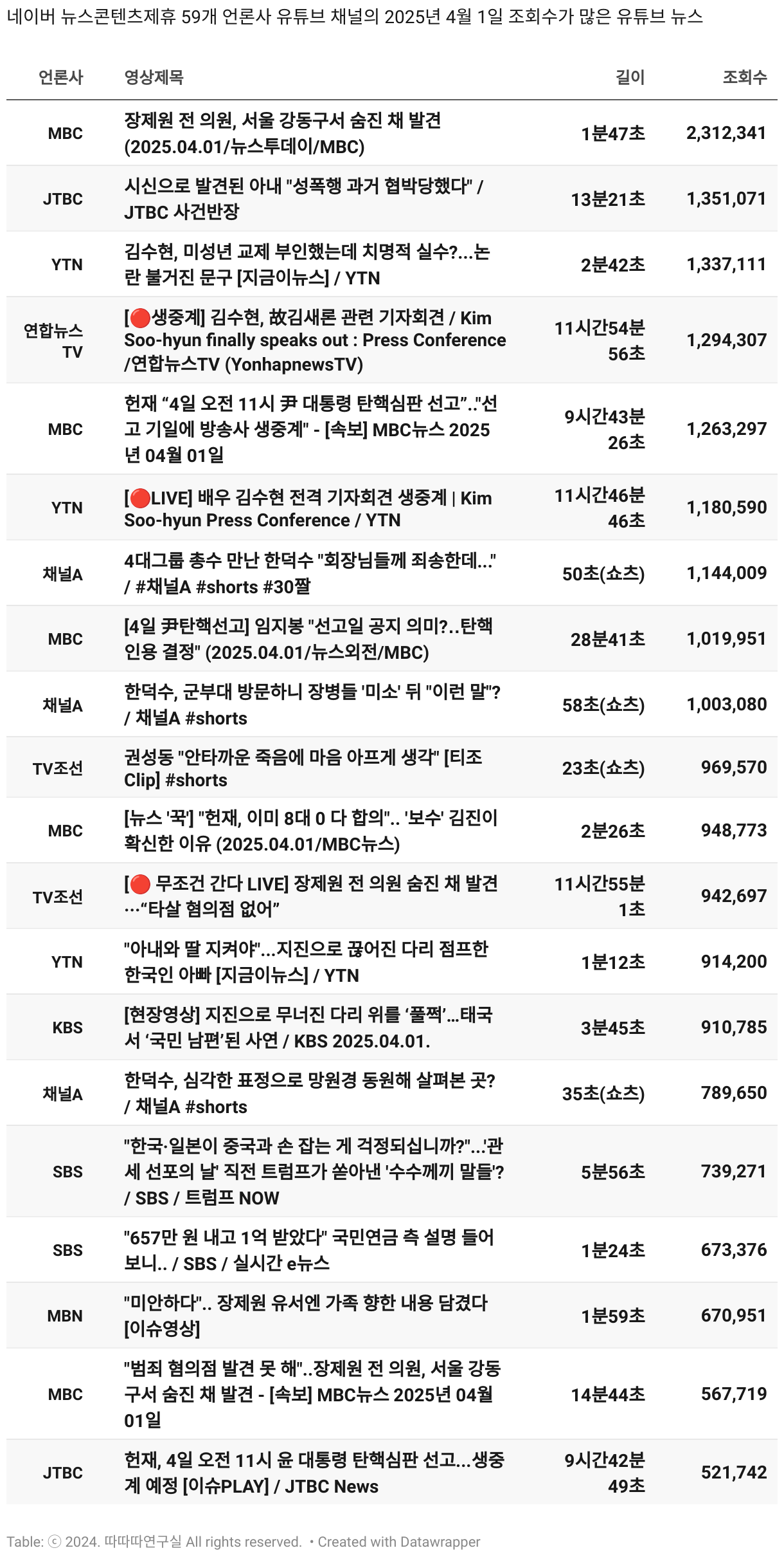 *데이터 수집 기간 : 2024년 6월 10일 *데이터 수집 대상 : 네이버 뉴스콘텐츠제휴 60개 언론사. 종합일간지 10개(경향신문, 국민일보, 동아일보, 문화일보, 서울신문, 세계일보, 조선일보, 중앙일보, 한겨레신문, 한국일보), 방송/통신사 14개(뉴스1, 뉴시스, 연합뉴스, 연합뉴스TV, 채널A, 한국경제TV, JTBC, KBS, MBC, MBN, SBS, SBS BIZ, TV조선, YTN), 경제지 11개(매일경제, 머니투데이, 비즈워치, 서울경제, 아시아경제, 이데일리, 조선비즈, 조세일보, 파이낸셜뉴스, 한국경제(유튜브제외), 헤럴드경제) 인터넷 8개(노컷뉴스, 더팩트, 데일리안, 머니S, 미디어오늘, 아이뉴스24, 오마이뉴스, 프레시안), IT 5개(디지털데일리,디지털타임스, 블로터, 전자신문, 지디넷코리아), 지역 12개(강원도민일보, 강원일보, 경기일보, 국제신문, 대구MBC, 대전일보, 매일신문, 부산일보, 전주MBC, CJB청주방송, JIBS, kbc광주방송)