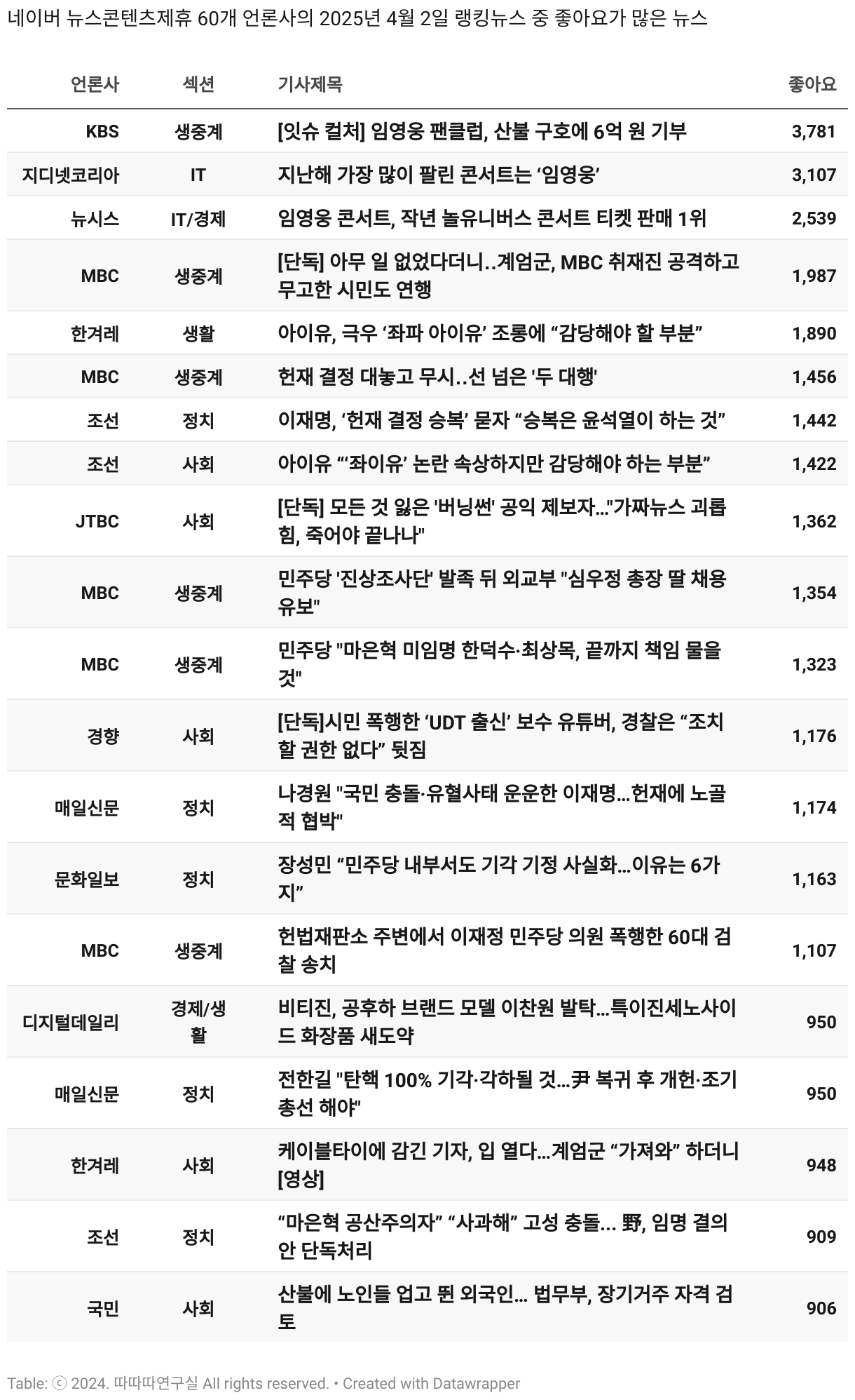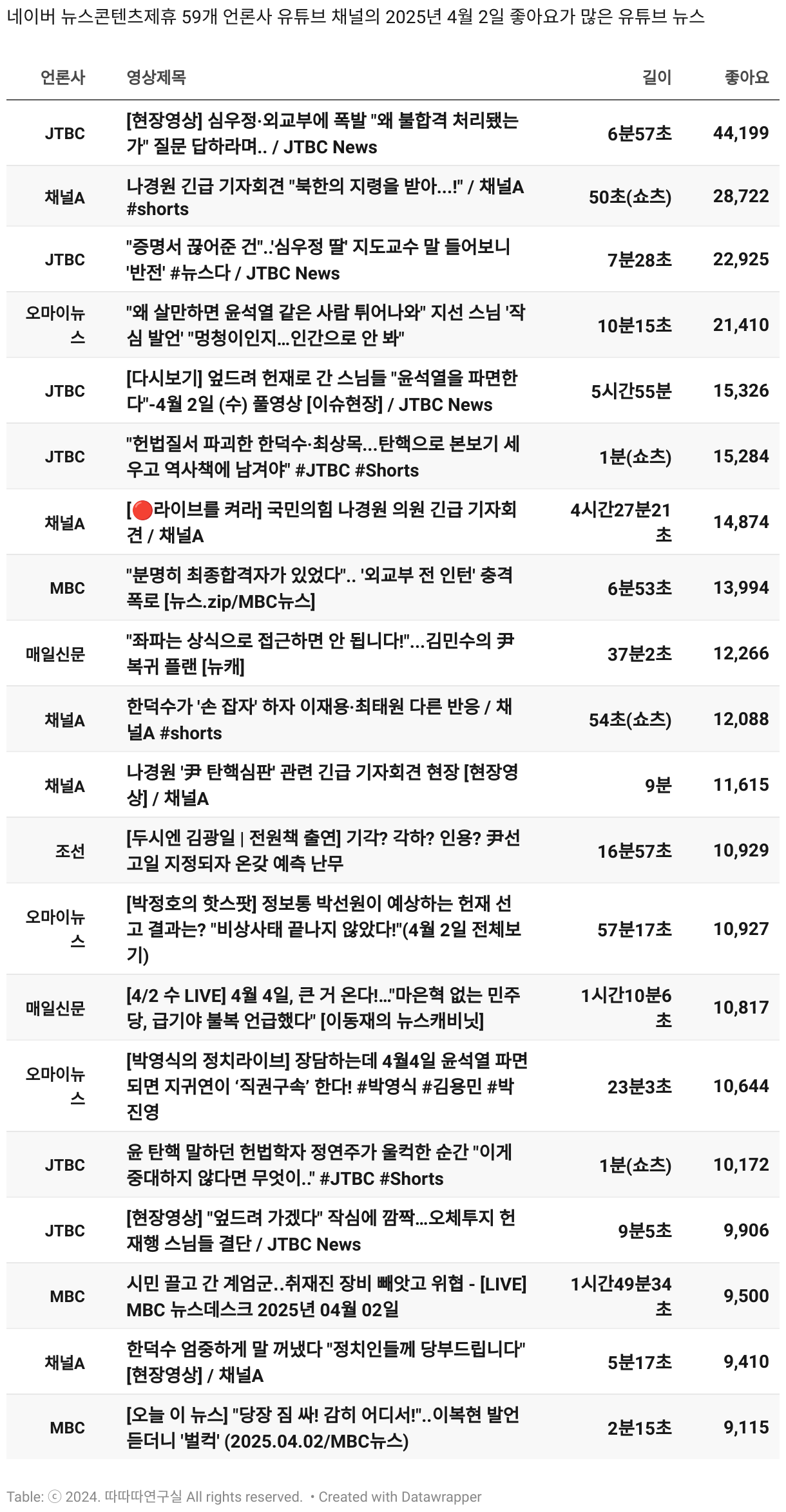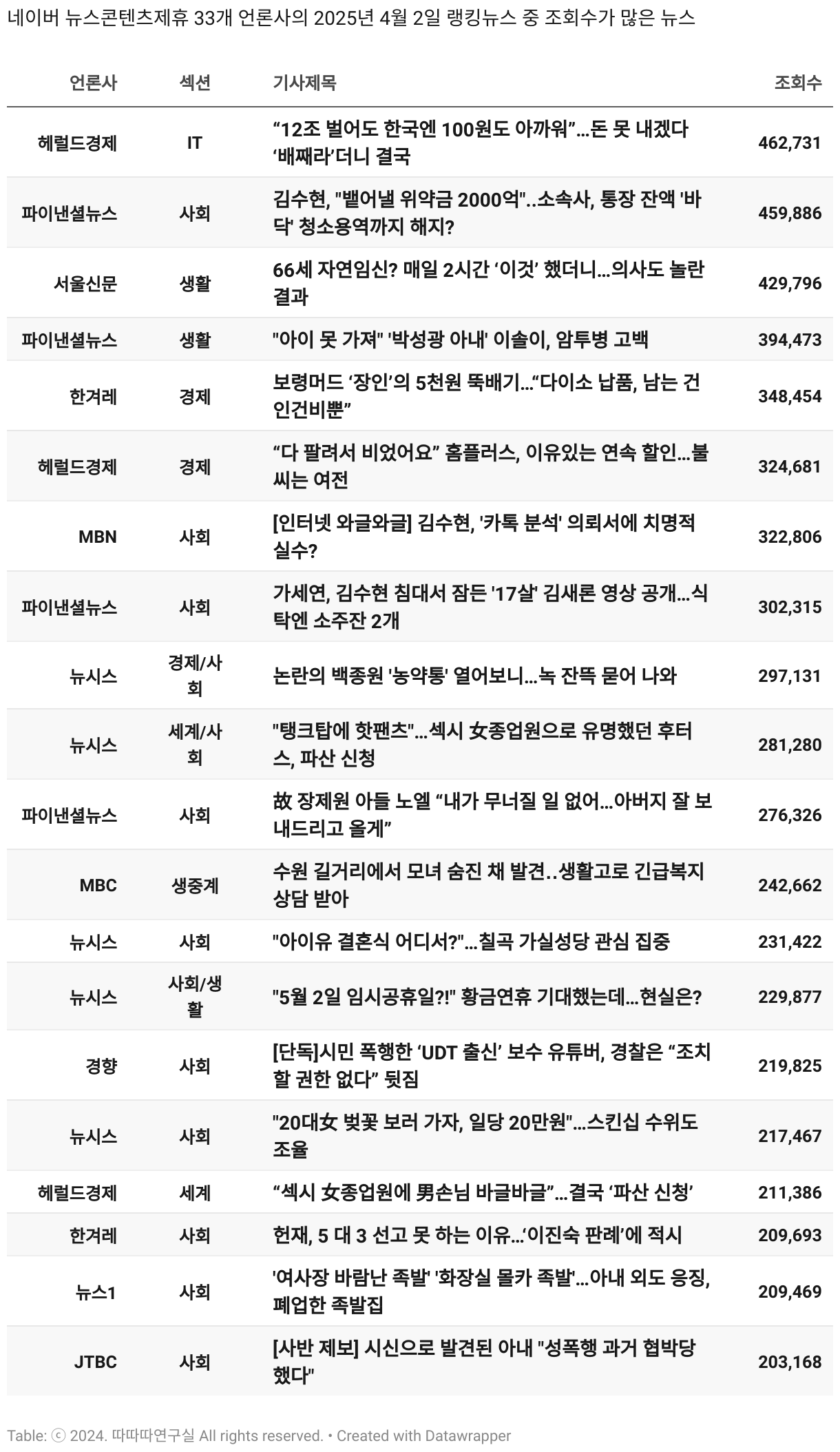*데이터 수집 기간 : 2024년 6월 10일 *데이터 수집 대상 : 네이버 뉴스콘텐츠제휴 60개 언론사. 종합일간지 10개(경향신문, 국민일보, 동아일보, 문화일보, 서울신문, 세계일보, 조선일보, 중앙일보, 한겨레신문, 한국일보), 방송/통신사 14개(뉴스1, 뉴시스, 연합뉴스, 연합뉴스TV, 채널A, 한국경제TV, JTBC, KBS, MBC, MBN, SBS, SBS BIZ, TV조선, YTN), 경제지 11개(매일경제, 머니투데이, 비즈워치, 서울경제, 아시아경제, 이데일리, 조선비즈, 조세일보, 파이낸셜뉴스, 한국경제(유튜브제외), 헤럴드경제) 인터넷 8개(노컷뉴스, 더팩트, 데일리안, 머니S, 미디어오늘, 아이뉴스24, 오마이뉴스, 프레시안), IT 5개(디지털데일리,디지털타임스, 블로터, 전자신문, 지디넷코리아), 지역 12개(강원도민일보, 강원일보, 경기일보, 국제신문, 대구MBC, 대전일보, 매일신문, 부산일보, 전주MBC, CJB청주방송, JIBS, kbc광주방송)