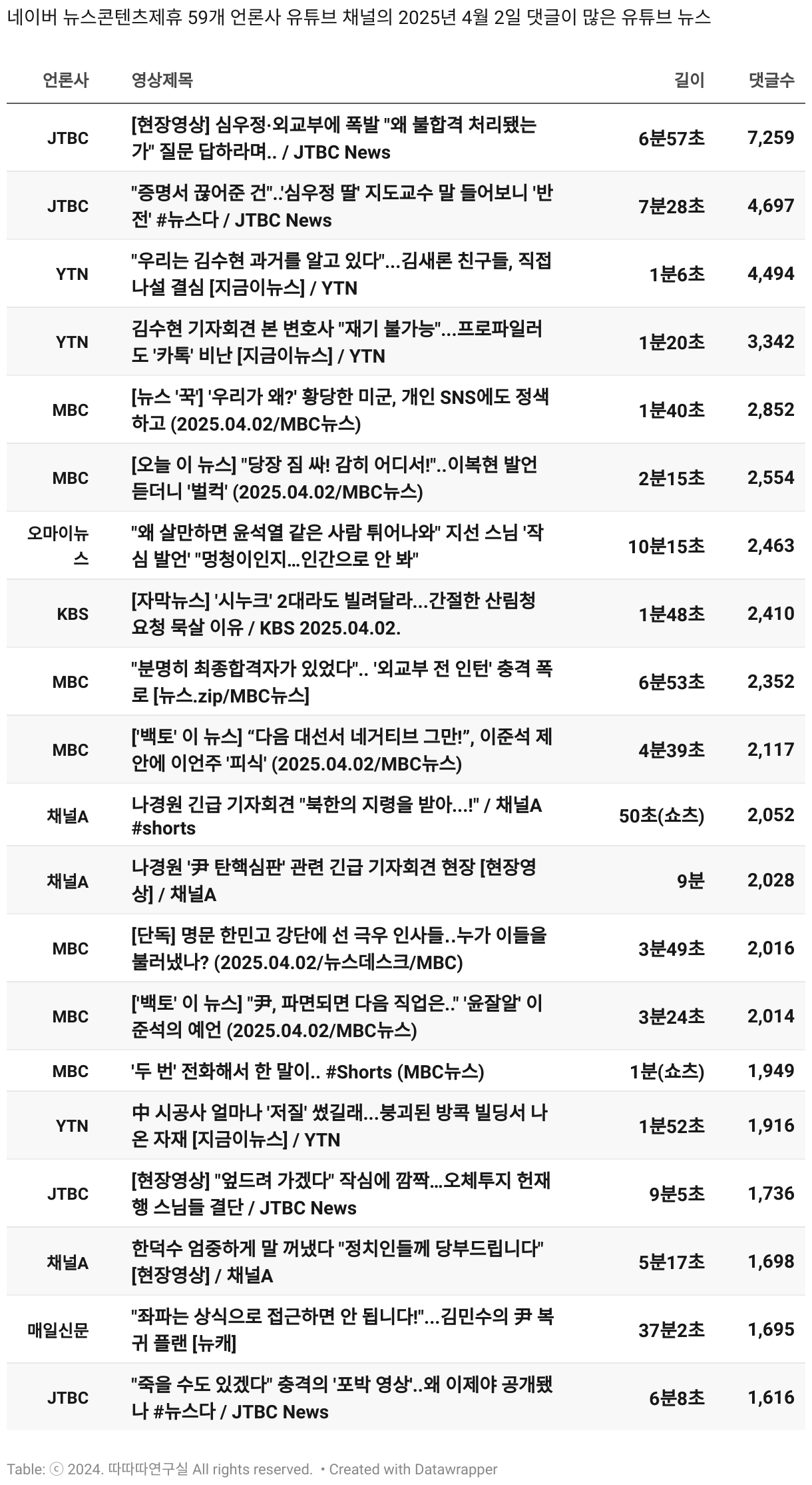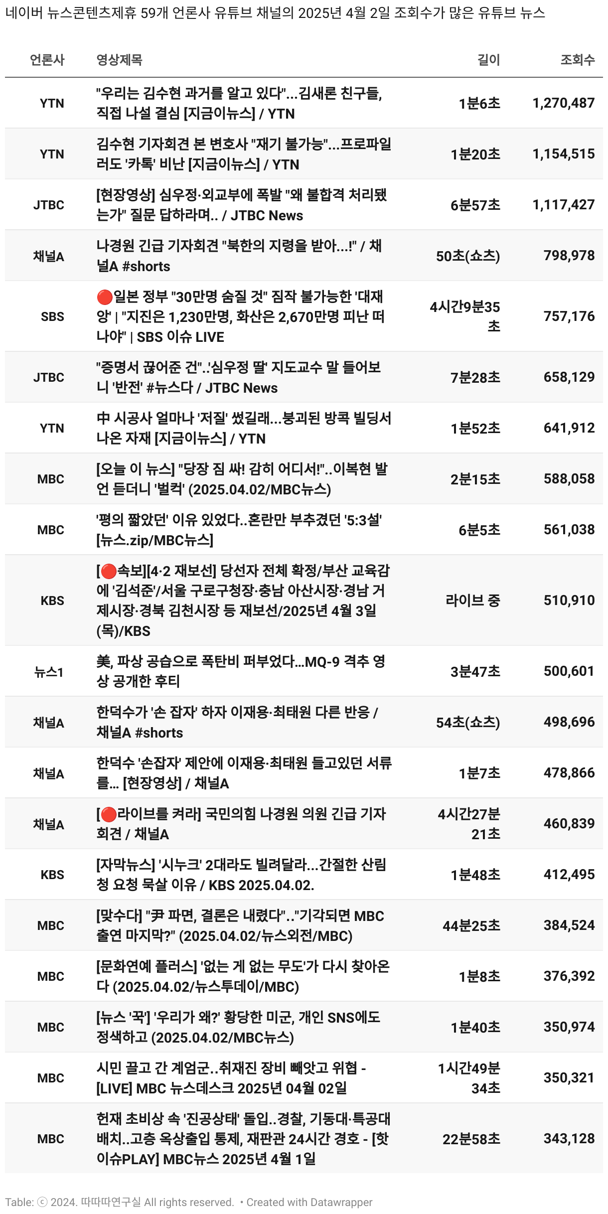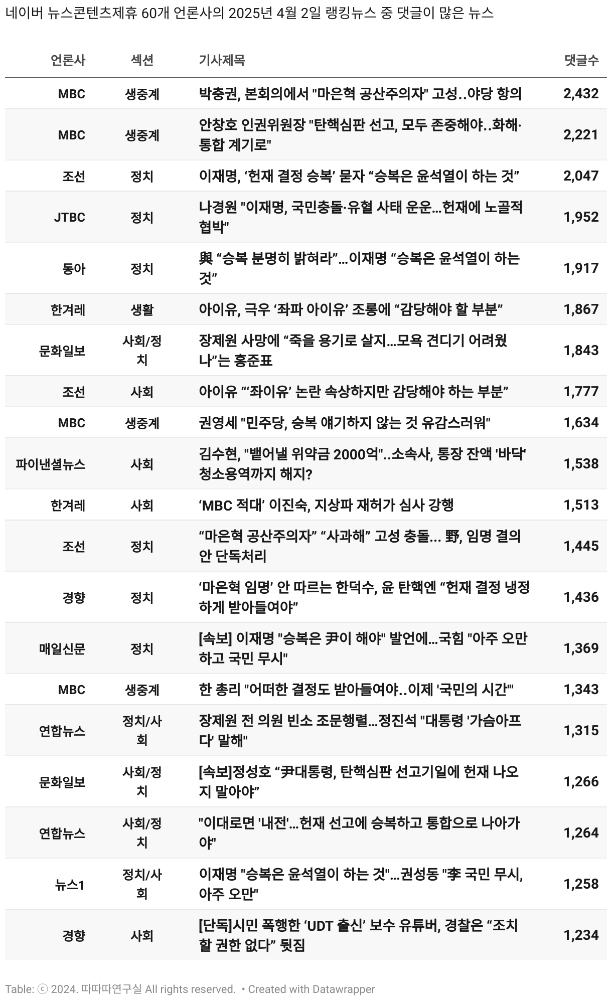 *데이터 수집 기간 : 2024년 6월 10일 *데이터 수집 대상 : 네이버 뉴스콘텐츠제휴 60개 언론사. 종합일간지 10개(경향신문, 국민일보, 동아일보, 문화일보, 서울신문, 세계일보, 조선일보, 중앙일보, 한겨레신문, 한국일보), 방송/통신사 14개(뉴스1, 뉴시스, 연합뉴스, 연합뉴스TV, 채널A, 한국경제TV, JTBC, KBS, MBC, MBN, SBS, SBS BIZ, TV조선, YTN), 경제지 11개(매일경제, 머니투데이, 비즈워치, 서울경제, 아시아경제, 이데일리, 조선비즈, 조세일보, 파이낸셜뉴스, 한국경제(유튜브제외), 헤럴드경제) 인터넷 8개(노컷뉴스, 더팩트, 데일리안, 머니S, 미디어오늘, 아이뉴스24, 오마이뉴스, 프레시안), IT 5개(디지털데일리,디지털타임스, 블로터, 전자신문, 지디넷코리아), 지역 12개(강원도민일보, 강원일보, 경기일보, 국제신문, 대구MBC, 대전일보, 매일신문, 부산일보, 전주MBC, CJB청주방송, JIBS, kbc광주방송)