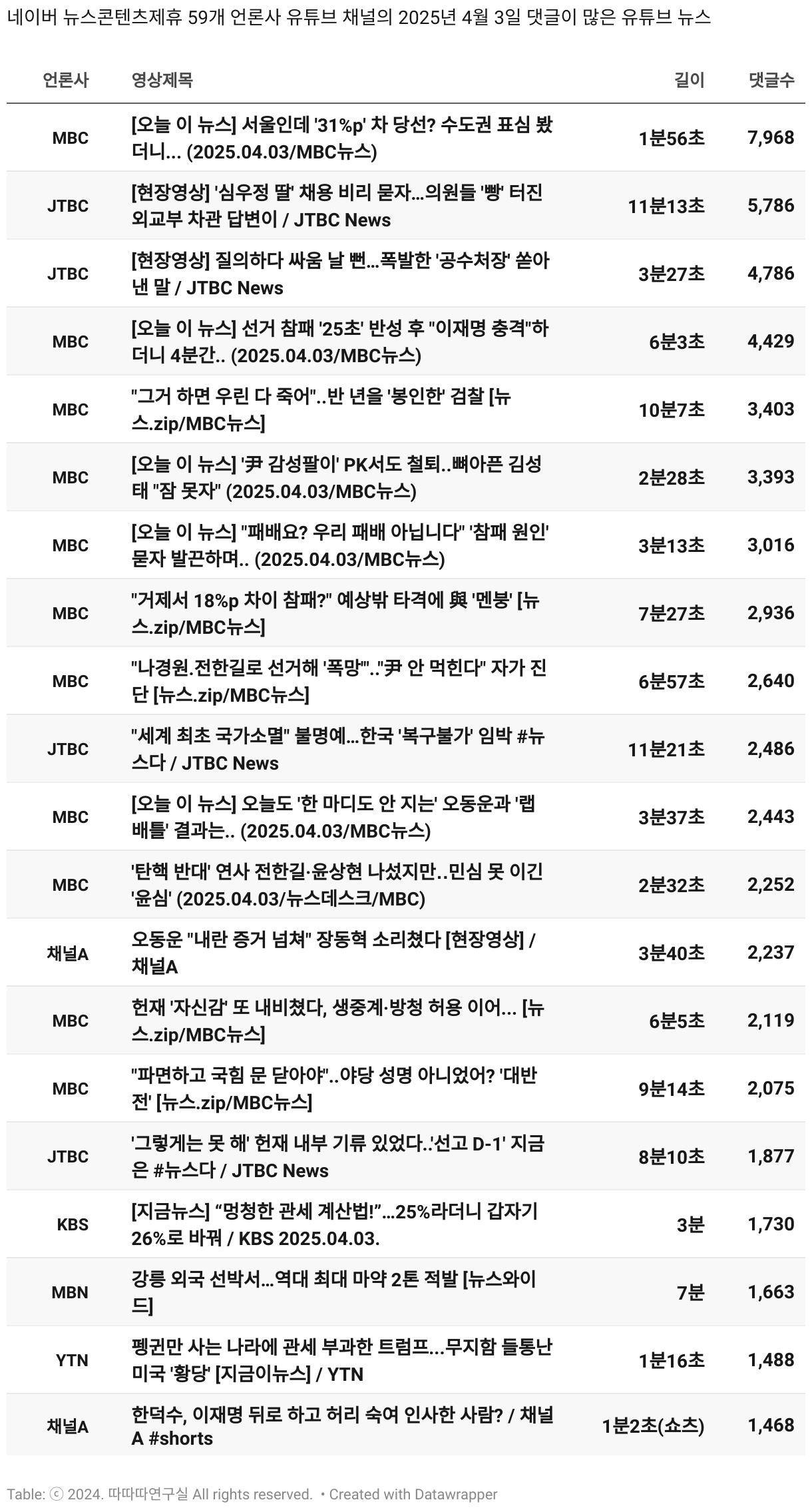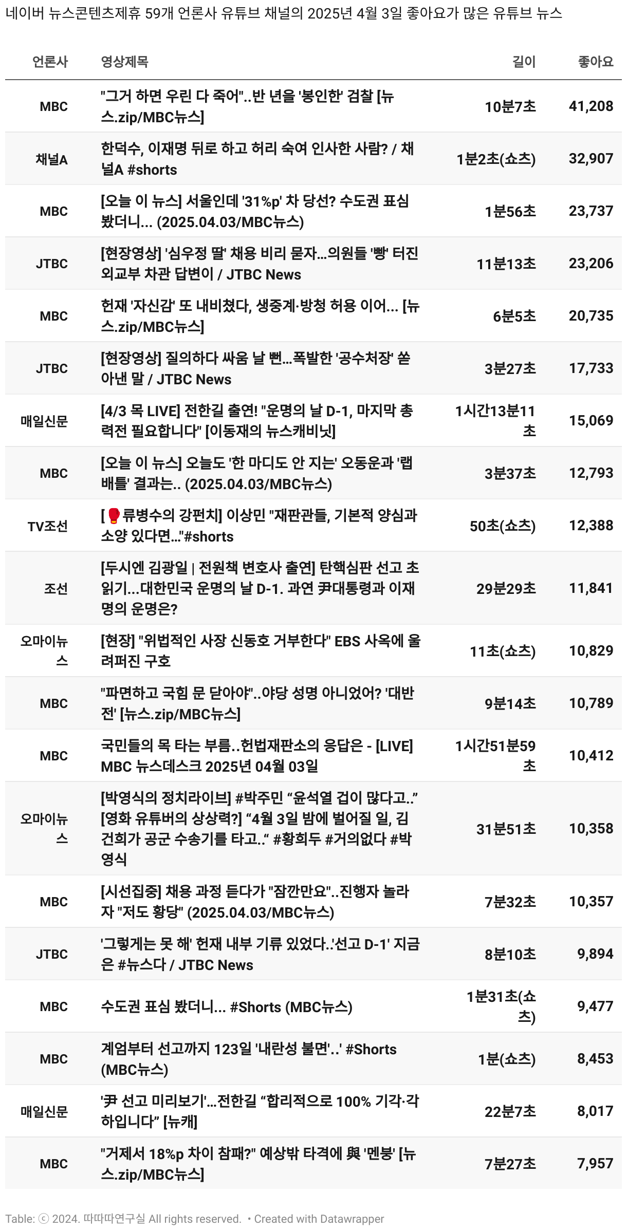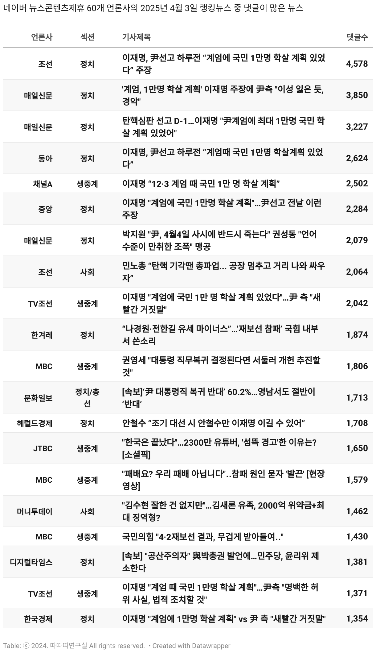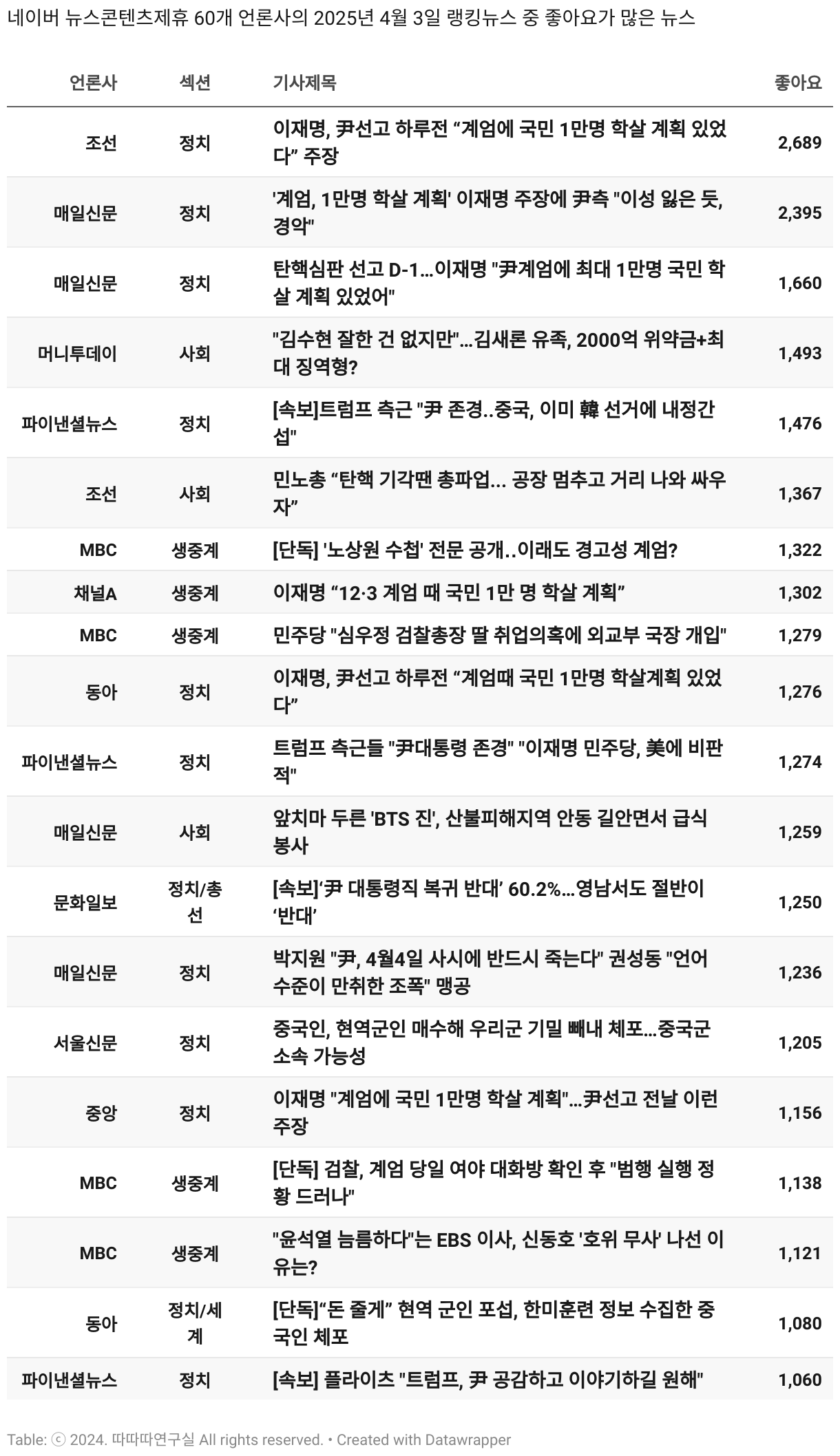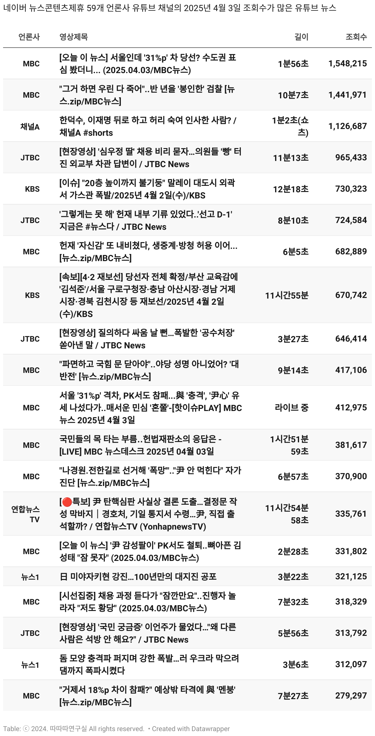 *데이터 수집 기간 : 2024년 6월 10일 *데이터 수집 대상 : 네이버 뉴스콘텐츠제휴 60개 언론사. 종합일간지 10개(경향신문, 국민일보, 동아일보, 문화일보, 서울신문, 세계일보, 조선일보, 중앙일보, 한겨레신문, 한국일보), 방송/통신사 14개(뉴스1, 뉴시스, 연합뉴스, 연합뉴스TV, 채널A, 한국경제TV, JTBC, KBS, MBC, MBN, SBS, SBS BIZ, TV조선, YTN), 경제지 11개(매일경제, 머니투데이, 비즈워치, 서울경제, 아시아경제, 이데일리, 조선비즈, 조세일보, 파이낸셜뉴스, 한국경제(유튜브제외), 헤럴드경제) 인터넷 8개(노컷뉴스, 더팩트, 데일리안, 머니S, 미디어오늘, 아이뉴스24, 오마이뉴스, 프레시안), IT 5개(디지털데일리,디지털타임스, 블로터, 전자신문, 지디넷코리아), 지역 12개(강원도민일보, 강원일보, 경기일보, 국제신문, 대구MBC, 대전일보, 매일신문, 부산일보, 전주MBC, CJB청주방송, JIBS, kbc광주방송)