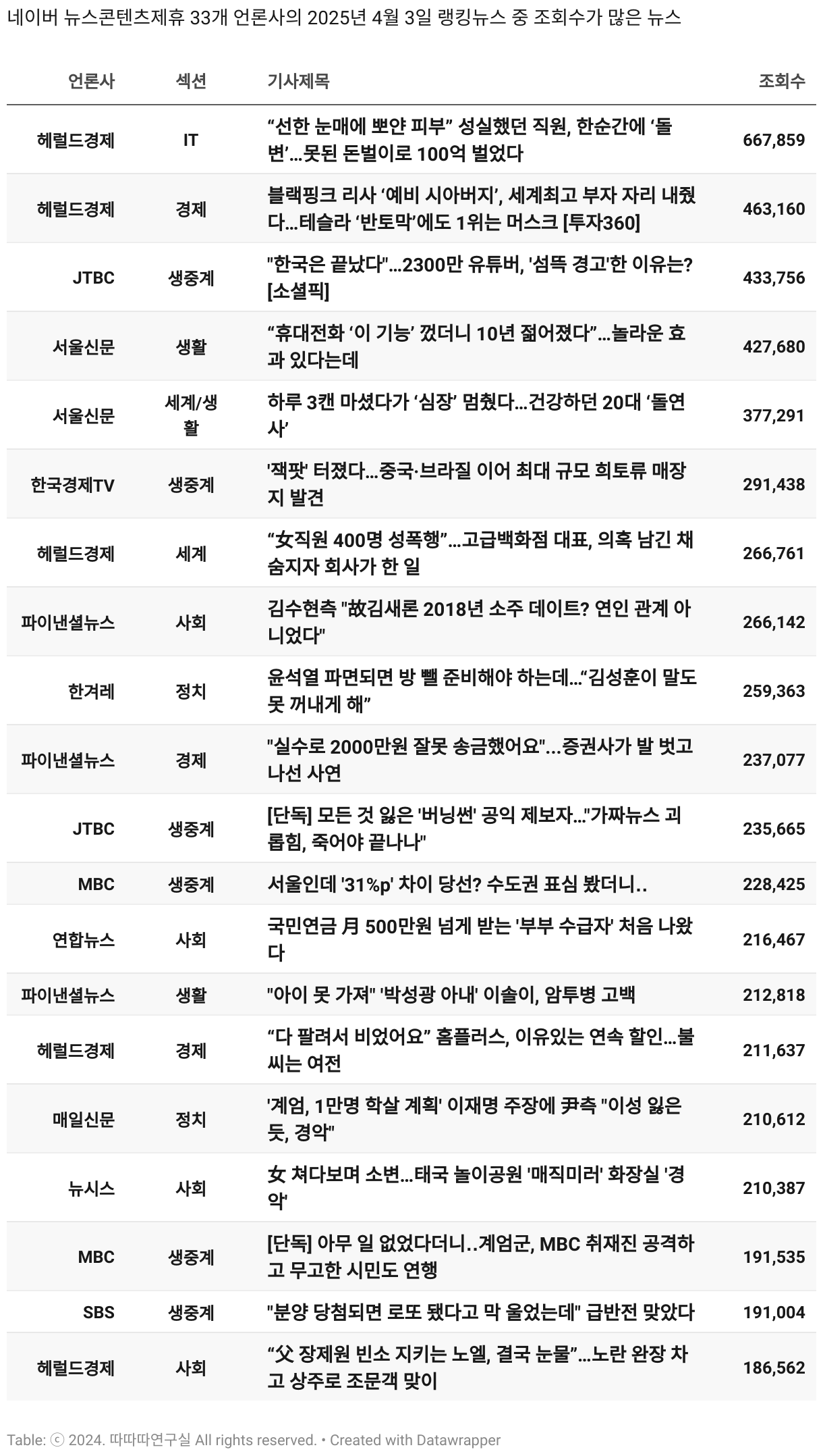 보도 시간대 기준 가장 흥한 기사 3건이 표시됩니다.
