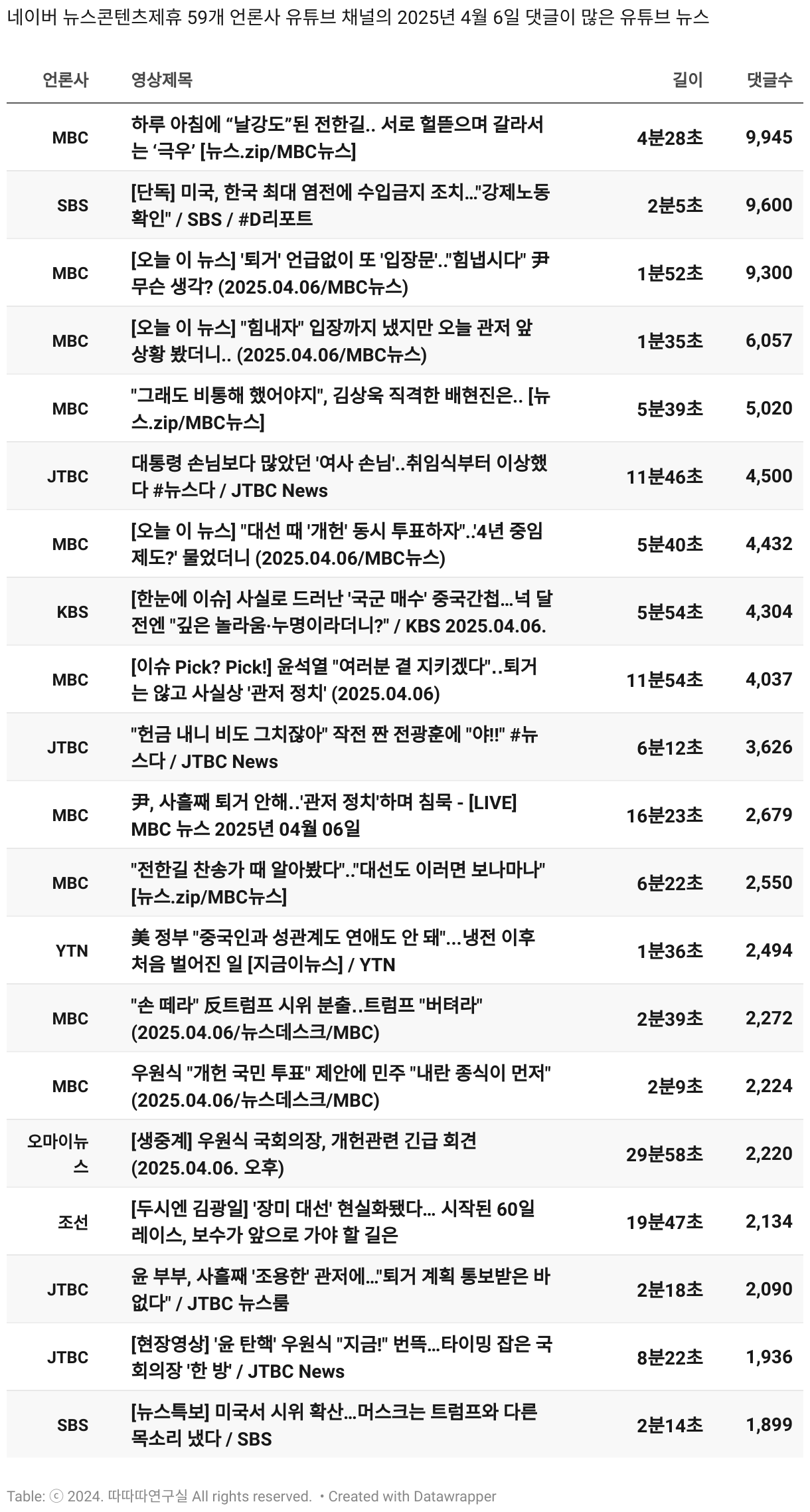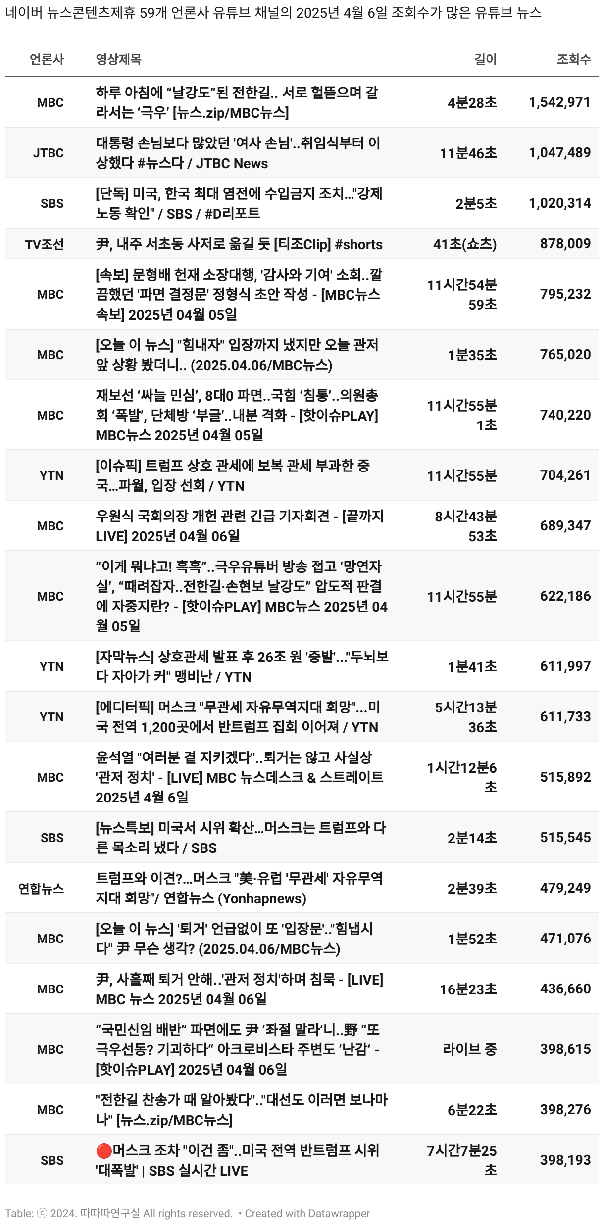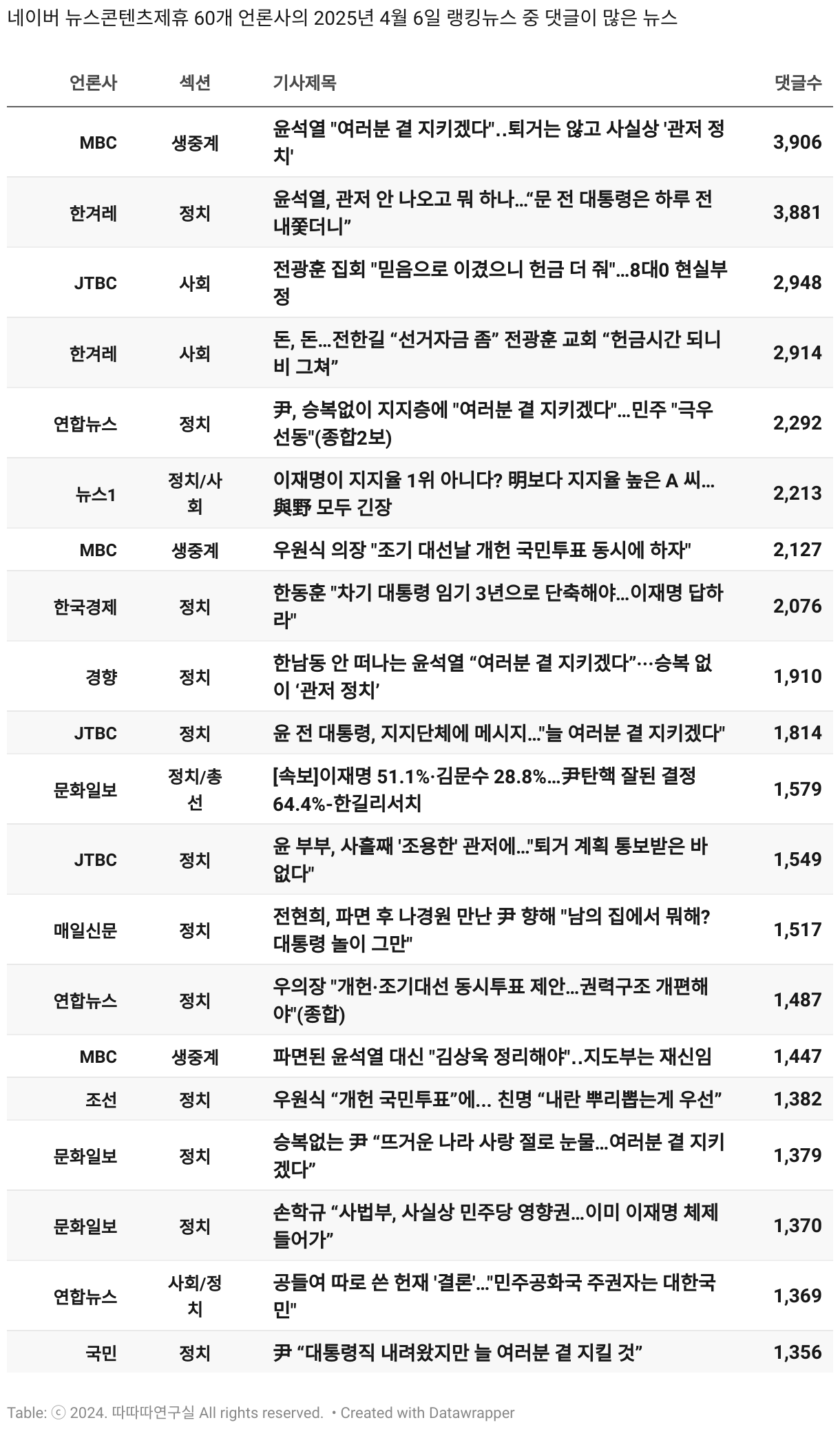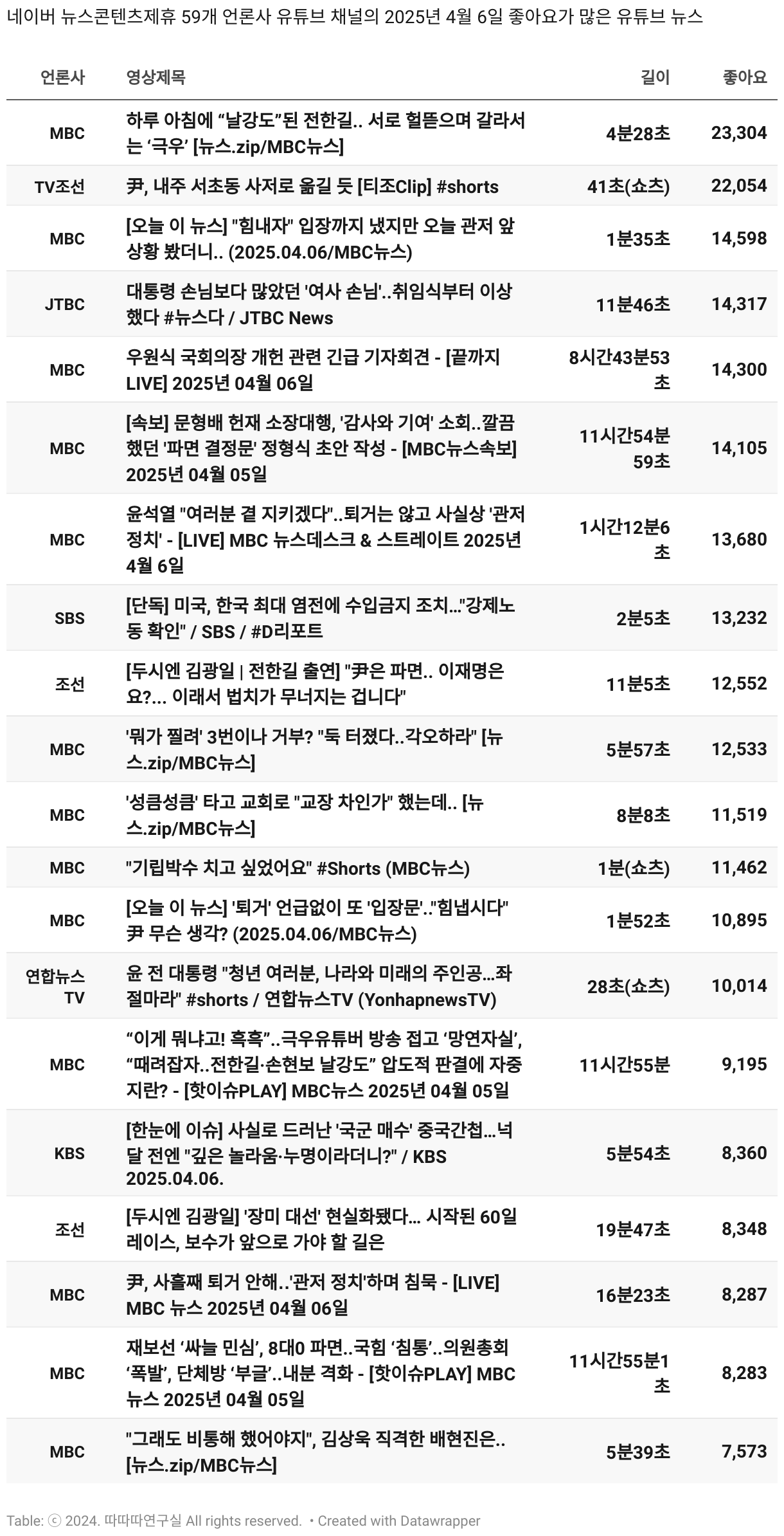 *데이터 수집 기간 : 2024년 6월 10일 *데이터 수집 대상 : 네이버 뉴스콘텐츠제휴 60개 언론사. 종합일간지 10개(경향신문, 국민일보, 동아일보, 문화일보, 서울신문, 세계일보, 조선일보, 중앙일보, 한겨레신문, 한국일보), 방송/통신사 14개(뉴스1, 뉴시스, 연합뉴스, 연합뉴스TV, 채널A, 한국경제TV, JTBC, KBS, MBC, MBN, SBS, SBS BIZ, TV조선, YTN), 경제지 11개(매일경제, 머니투데이, 비즈워치, 서울경제, 아시아경제, 이데일리, 조선비즈, 조세일보, 파이낸셜뉴스, 한국경제(유튜브제외), 헤럴드경제) 인터넷 8개(노컷뉴스, 더팩트, 데일리안, 머니S, 미디어오늘, 아이뉴스24, 오마이뉴스, 프레시안), IT 5개(디지털데일리,디지털타임스, 블로터, 전자신문, 지디넷코리아), 지역 12개(강원도민일보, 강원일보, 경기일보, 국제신문, 대구MBC, 대전일보, 매일신문, 부산일보, 전주MBC, CJB청주방송, JIBS, kbc광주방송)