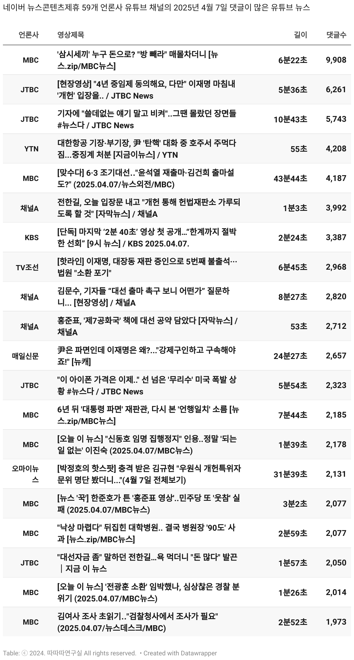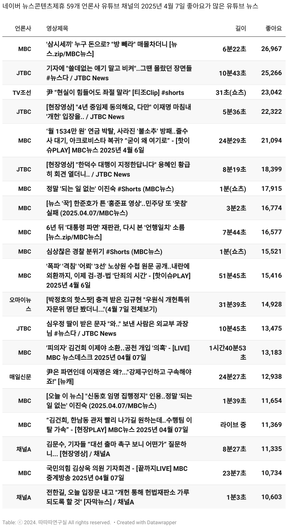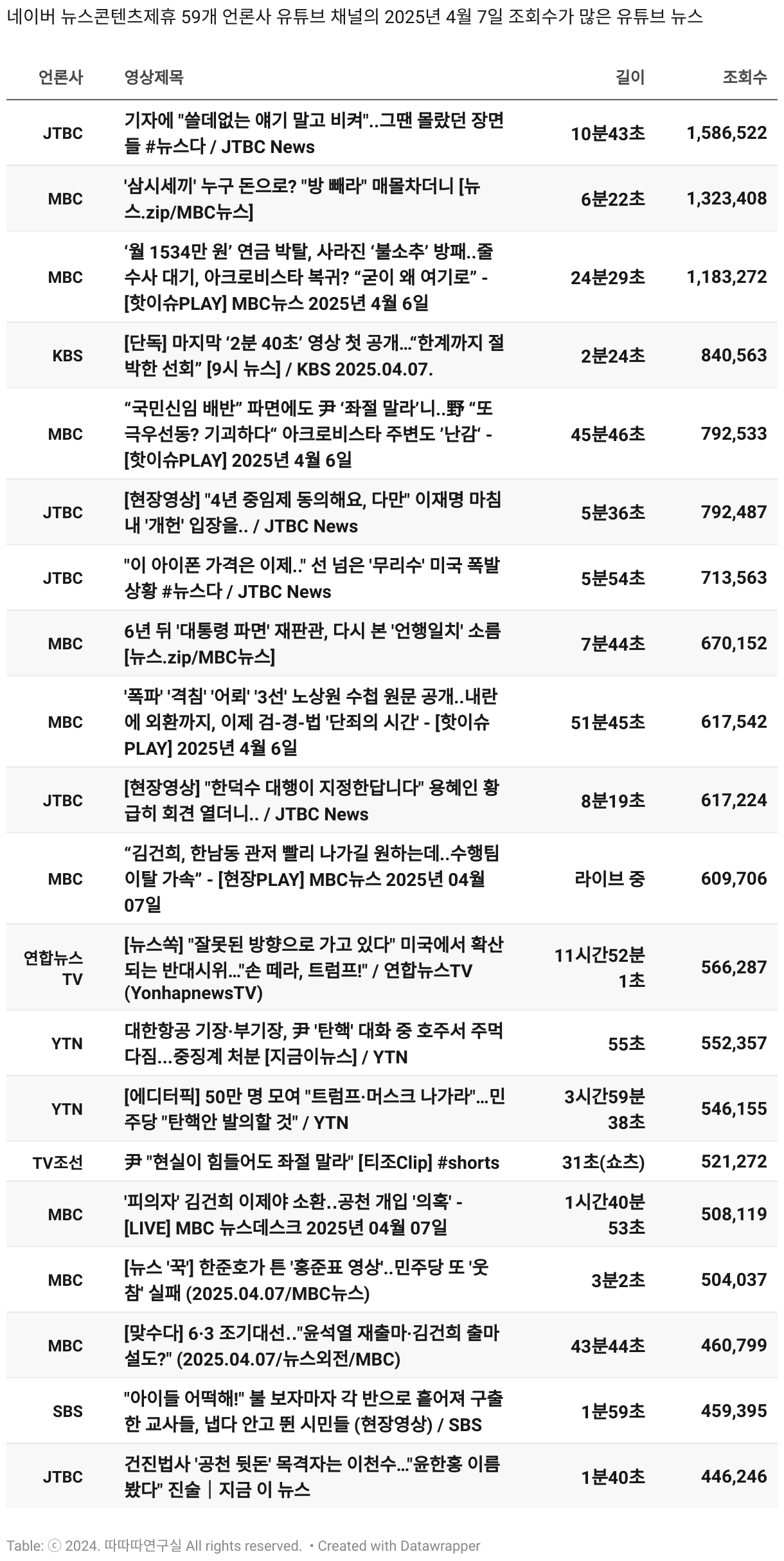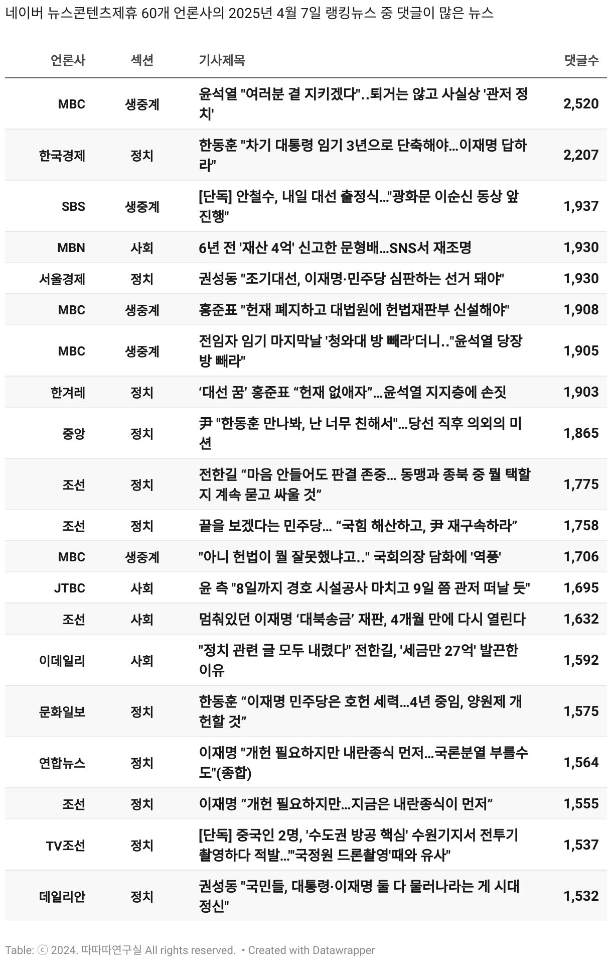 *데이터 수집 기간 : 2024년 6월 10일 *데이터 수집 대상 : 네이버 뉴스콘텐츠제휴 60개 언론사. 종합일간지 10개(경향신문, 국민일보, 동아일보, 문화일보, 서울신문, 세계일보, 조선일보, 중앙일보, 한겨레신문, 한국일보), 방송/통신사 14개(뉴스1, 뉴시스, 연합뉴스, 연합뉴스TV, 채널A, 한국경제TV, JTBC, KBS, MBC, MBN, SBS, SBS BIZ, TV조선, YTN), 경제지 11개(매일경제, 머니투데이, 비즈워치, 서울경제, 아시아경제, 이데일리, 조선비즈, 조세일보, 파이낸셜뉴스, 한국경제(유튜브제외), 헤럴드경제) 인터넷 8개(노컷뉴스, 더팩트, 데일리안, 머니S, 미디어오늘, 아이뉴스24, 오마이뉴스, 프레시안), IT 5개(디지털데일리,디지털타임스, 블로터, 전자신문, 지디넷코리아), 지역 12개(강원도민일보, 강원일보, 경기일보, 국제신문, 대구MBC, 대전일보, 매일신문, 부산일보, 전주MBC, CJB청주방송, JIBS, kbc광주방송)