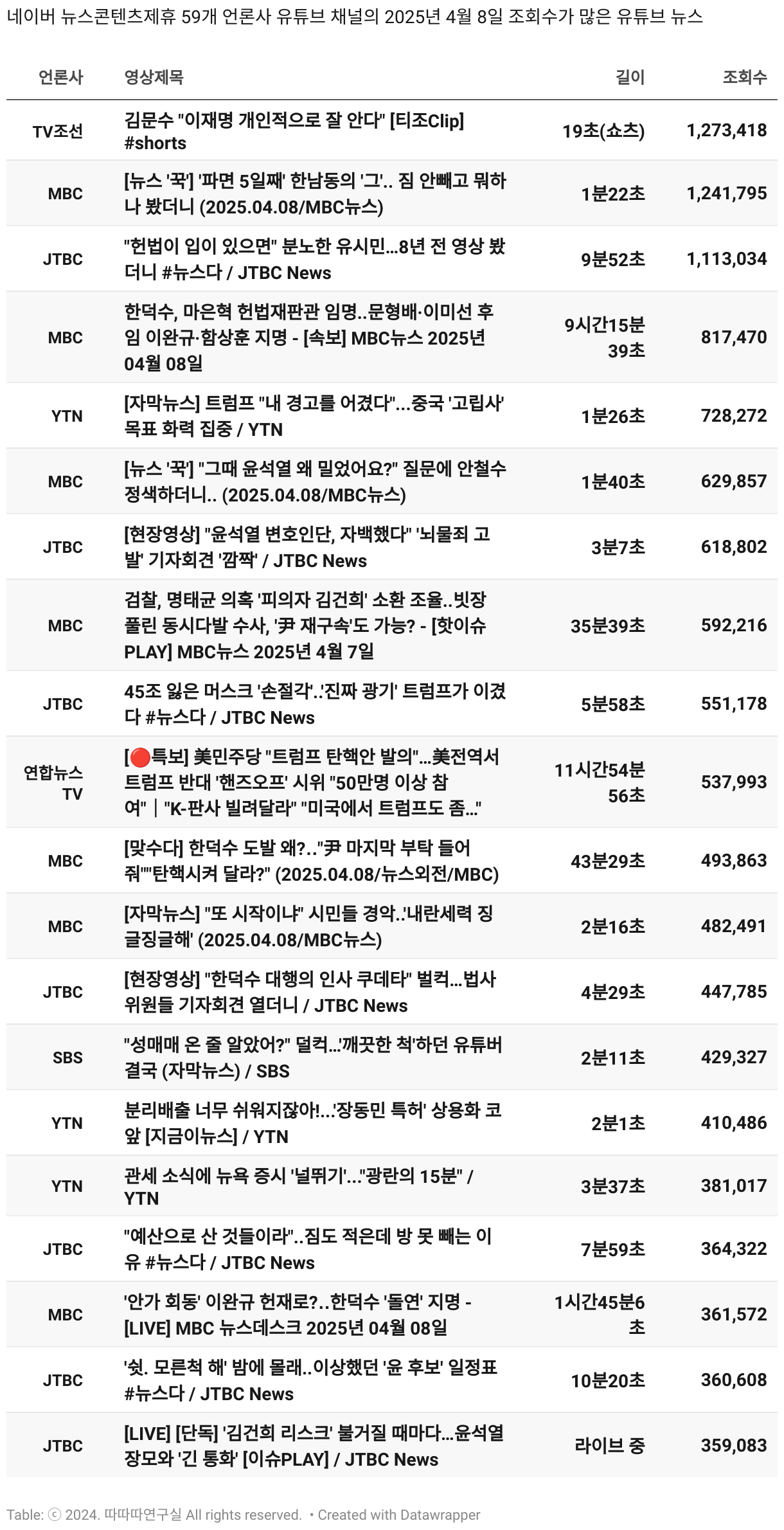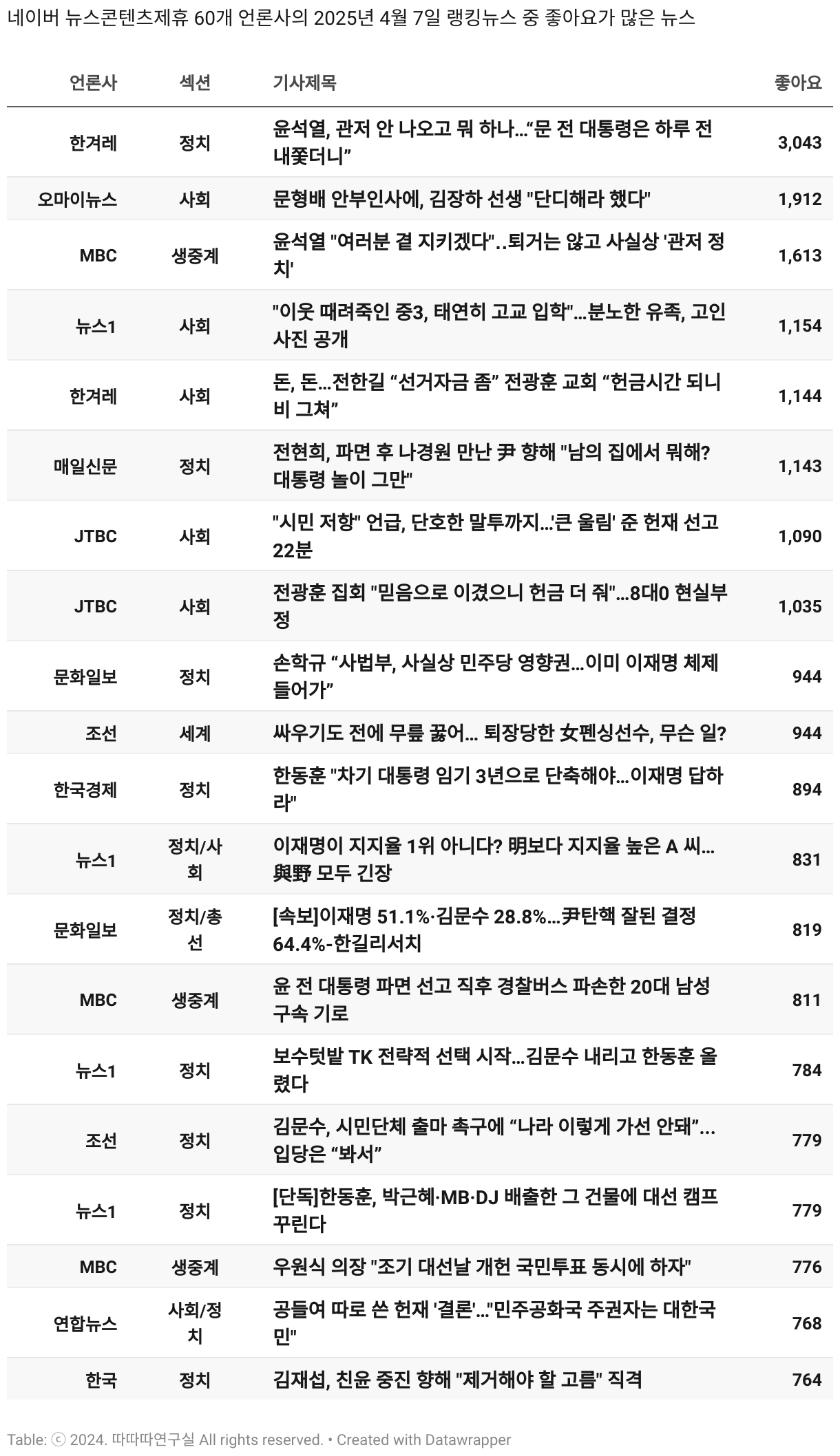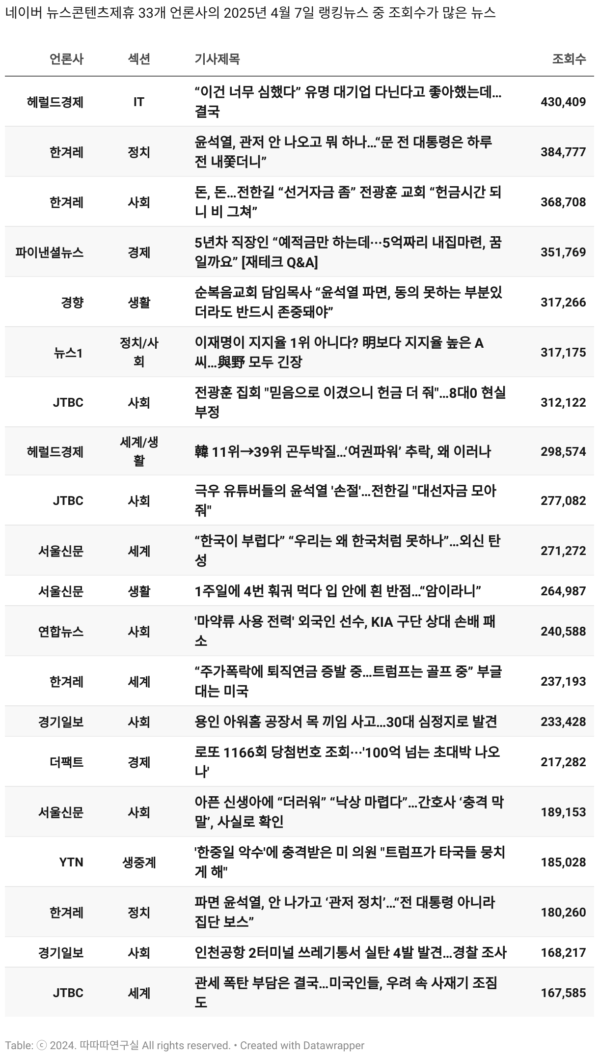 *데이터 수집 기간 : 2024년 6월 10일 *데이터 수집 대상 : 네이버 뉴스콘텐츠제휴 60개 언론사. 종합일간지 10개(경향신문, 국민일보, 동아일보, 문화일보, 서울신문, 세계일보, 조선일보, 중앙일보, 한겨레신문, 한국일보), 방송/통신사 14개(뉴스1, 뉴시스, 연합뉴스, 연합뉴스TV, 채널A, 한국경제TV, JTBC, KBS, MBC, MBN, SBS, SBS BIZ, TV조선, YTN), 경제지 11개(매일경제, 머니투데이, 비즈워치, 서울경제, 아시아경제, 이데일리, 조선비즈, 조세일보, 파이낸셜뉴스, 한국경제(유튜브제외), 헤럴드경제) 인터넷 8개(노컷뉴스, 더팩트, 데일리안, 머니S, 미디어오늘, 아이뉴스24, 오마이뉴스, 프레시안), IT 5개(디지털데일리,디지털타임스, 블로터, 전자신문, 지디넷코리아), 지역 12개(강원도민일보, 강원일보, 경기일보, 국제신문, 대구MBC, 대전일보, 매일신문, 부산일보, 전주MBC, CJB청주방송, JIBS, kbc광주방송)