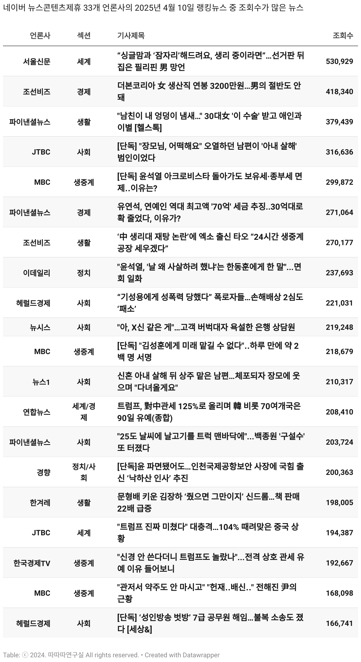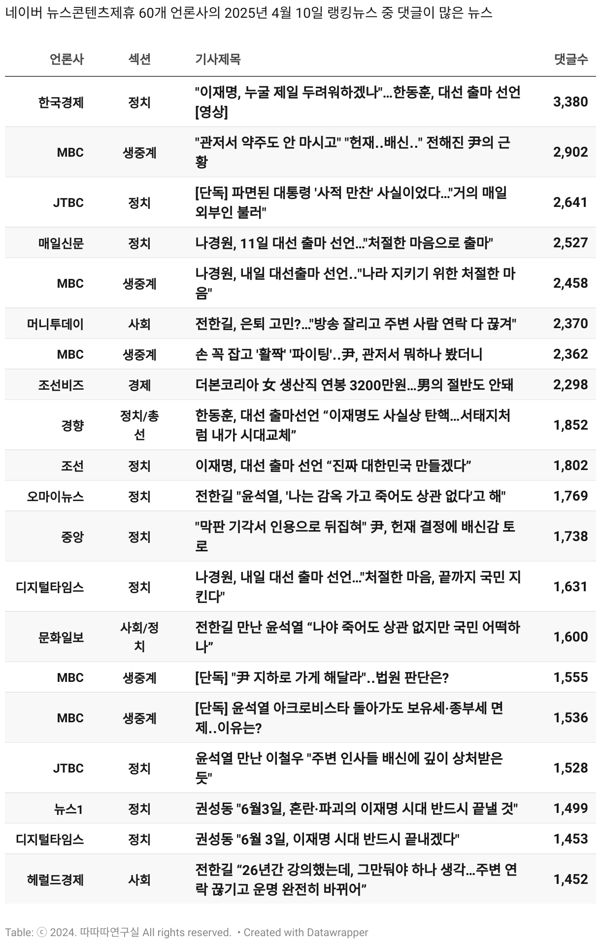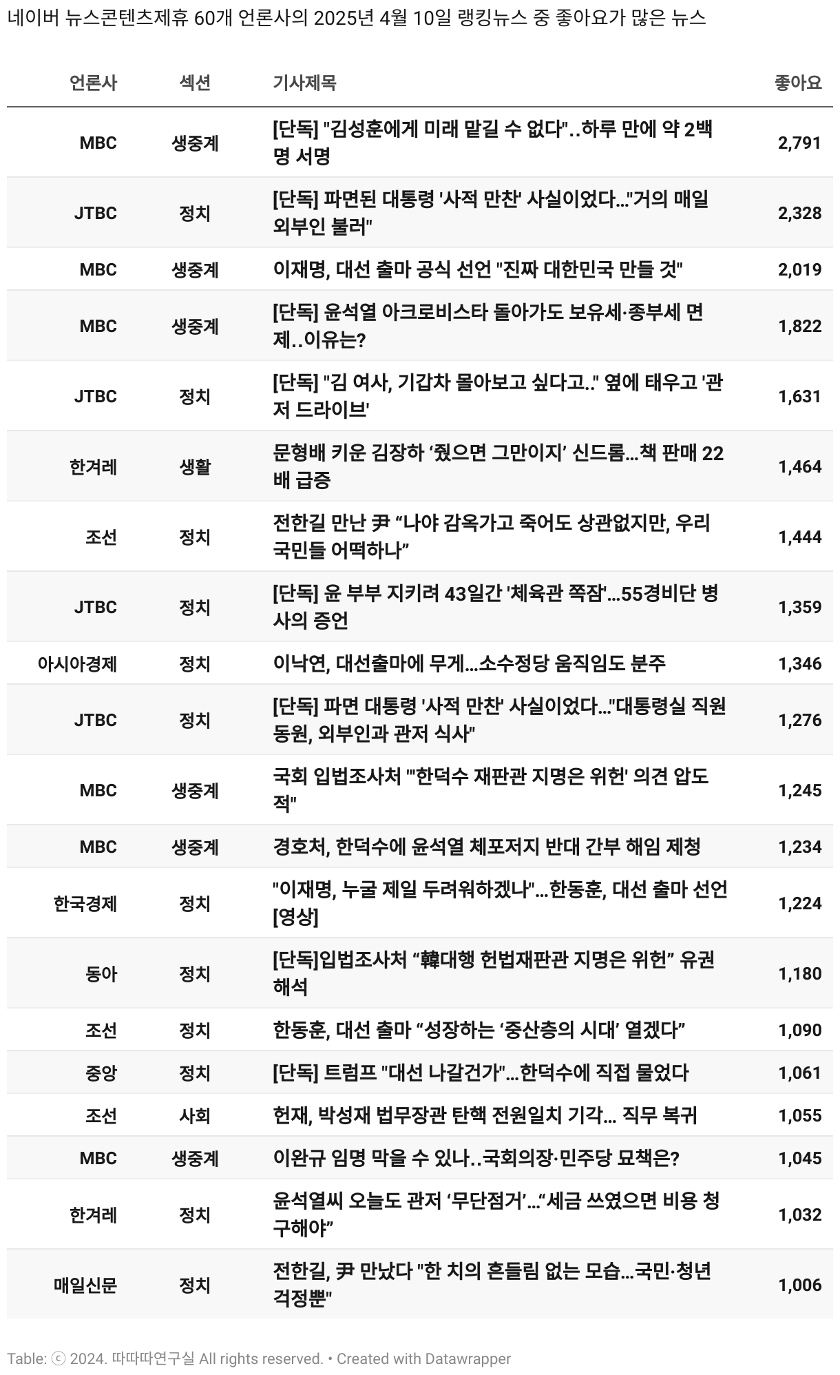 *데이터 수집 기간 : 2024년 6월 10일 *데이터 수집 대상 : 네이버 뉴스콘텐츠제휴 60개 언론사. 종합일간지 10개(경향신문, 국민일보, 동아일보, 문화일보, 서울신문, 세계일보, 조선일보, 중앙일보, 한겨레신문, 한국일보), 방송/통신사 14개(뉴스1, 뉴시스, 연합뉴스, 연합뉴스TV, 채널A, 한국경제TV, JTBC, KBS, MBC, MBN, SBS, SBS BIZ, TV조선, YTN), 경제지 11개(매일경제, 머니투데이, 비즈워치, 서울경제, 아시아경제, 이데일리, 조선비즈, 조세일보, 파이낸셜뉴스, 한국경제(유튜브제외), 헤럴드경제) 인터넷 8개(노컷뉴스, 더팩트, 데일리안, 머니S, 미디어오늘, 아이뉴스24, 오마이뉴스, 프레시안), IT 5개(디지털데일리,디지털타임스, 블로터, 전자신문, 지디넷코리아), 지역 12개(강원도민일보, 강원일보, 경기일보, 국제신문, 대구MBC, 대전일보, 매일신문, 부산일보, 전주MBC, CJB청주방송, JIBS, kbc광주방송)