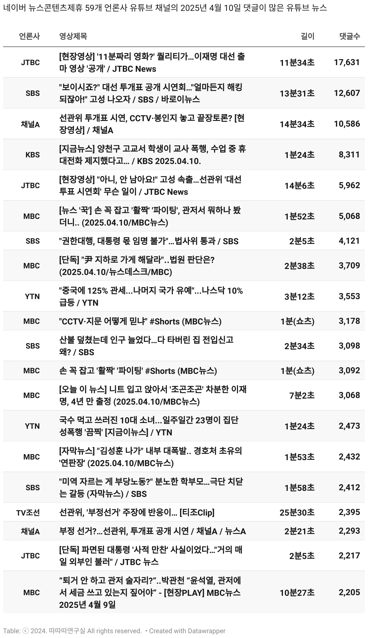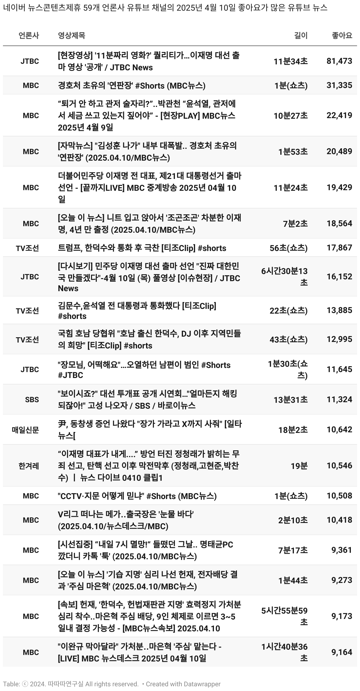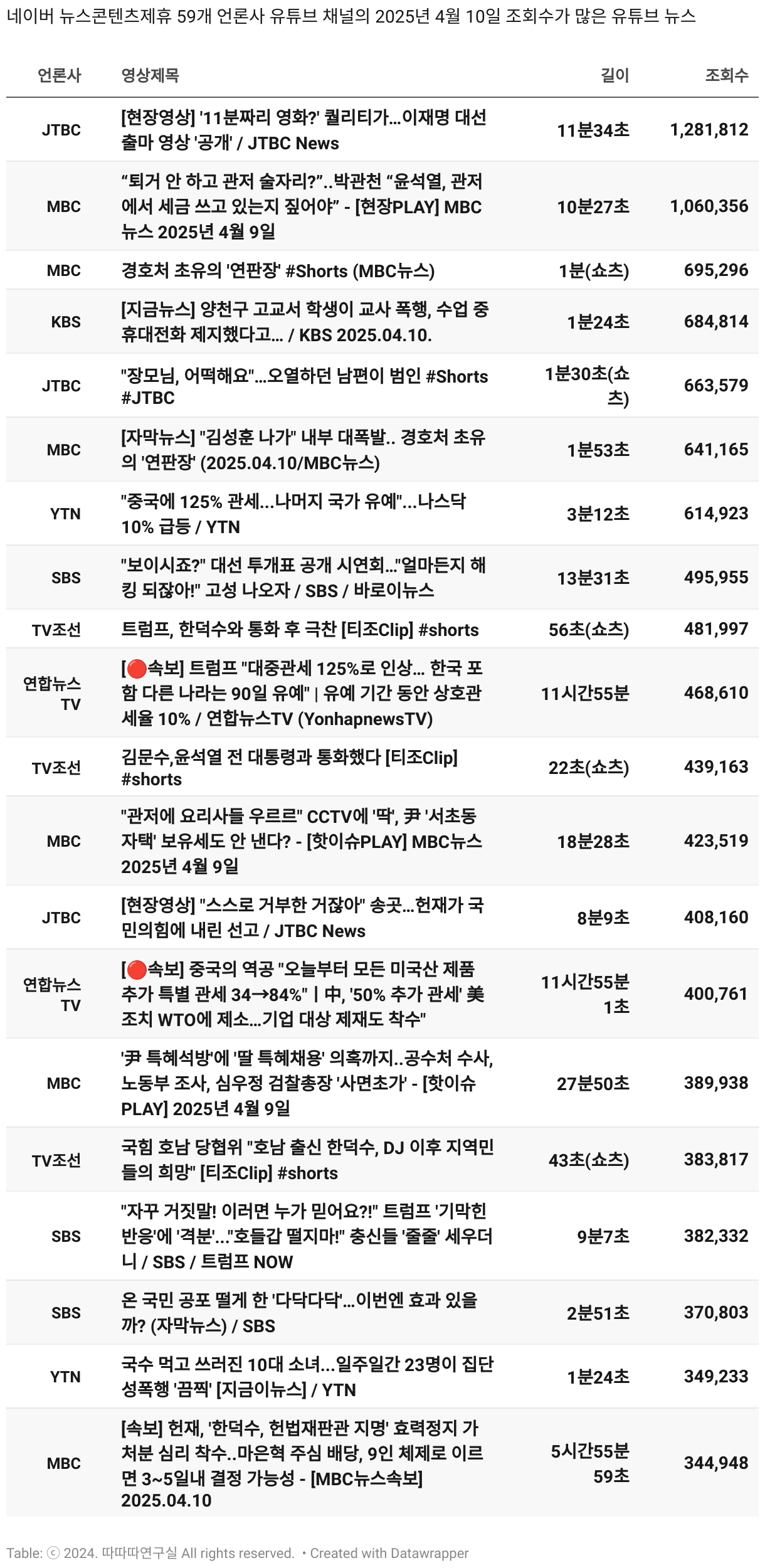 *데이터 수집 기간 : 2024년 6월 10일 *데이터 수집 대상 : 네이버 뉴스콘텐츠제휴 60개 언론사. 종합일간지 10개(경향신문, 국민일보, 동아일보, 문화일보, 서울신문, 세계일보, 조선일보, 중앙일보, 한겨레신문, 한국일보), 방송/통신사 14개(뉴스1, 뉴시스, 연합뉴스, 연합뉴스TV, 채널A, 한국경제TV, JTBC, KBS, MBC, MBN, SBS, SBS BIZ, TV조선, YTN), 경제지 11개(매일경제, 머니투데이, 비즈워치, 서울경제, 아시아경제, 이데일리, 조선비즈, 조세일보, 파이낸셜뉴스, 한국경제(유튜브제외), 헤럴드경제) 인터넷 8개(노컷뉴스, 더팩트, 데일리안, 머니S, 미디어오늘, 아이뉴스24, 오마이뉴스, 프레시안), IT 5개(디지털데일리,디지털타임스, 블로터, 전자신문, 지디넷코리아), 지역 12개(강원도민일보, 강원일보, 경기일보, 국제신문, 대구MBC, 대전일보, 매일신문, 부산일보, 전주MBC, CJB청주방송, JIBS, kbc광주방송)