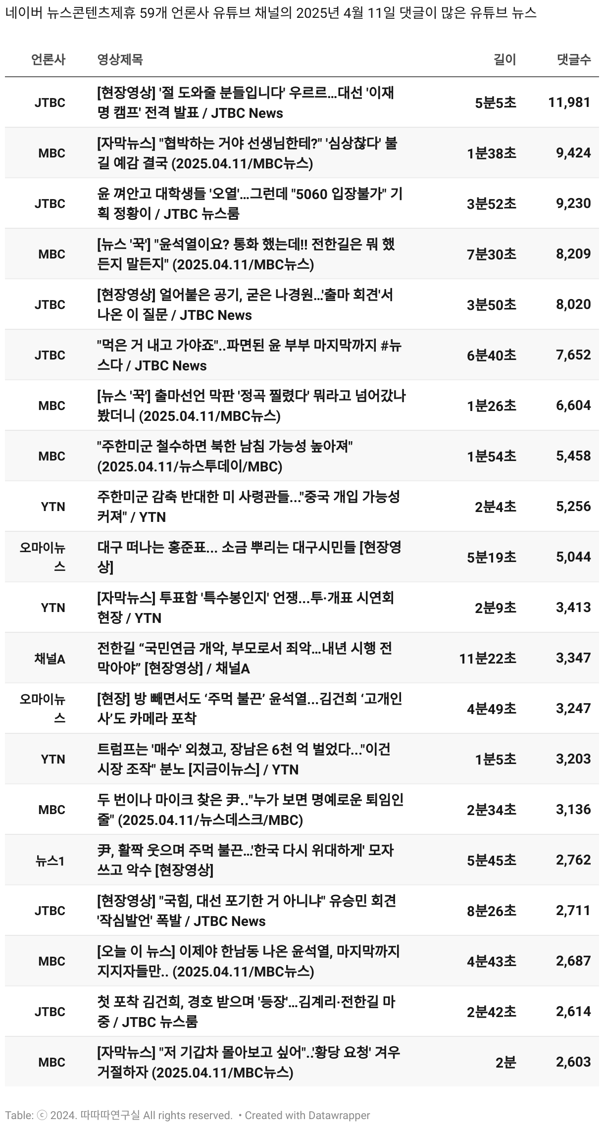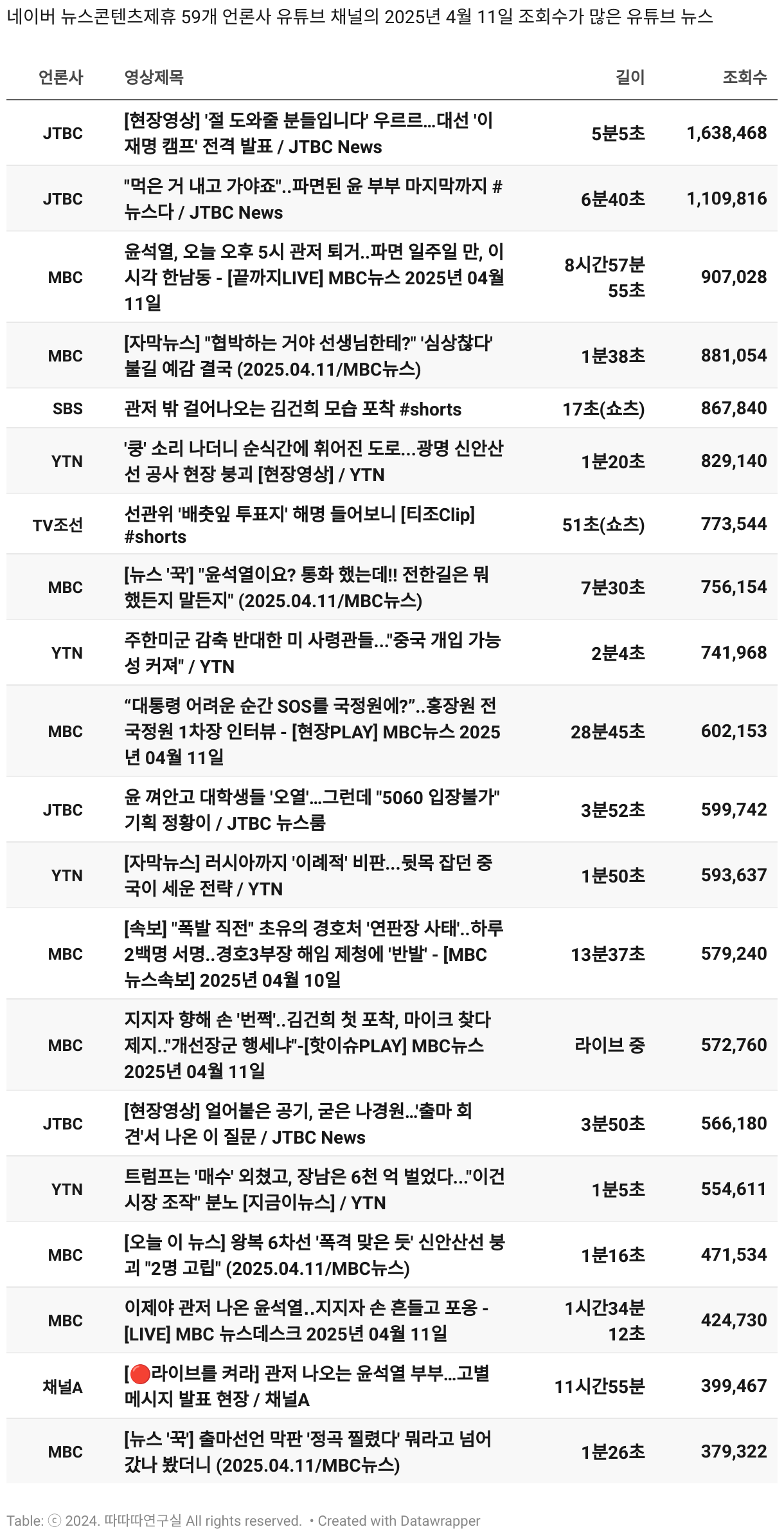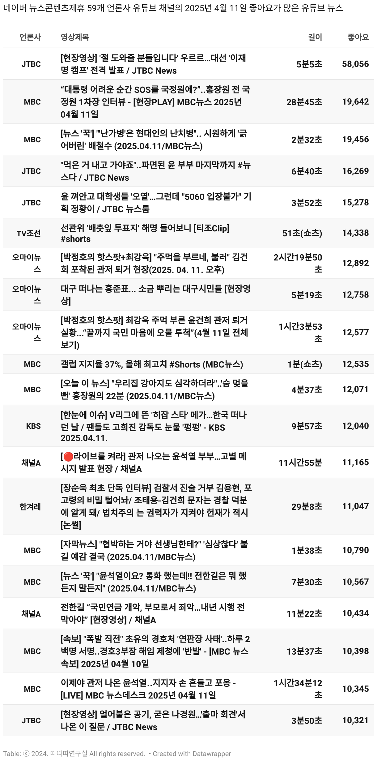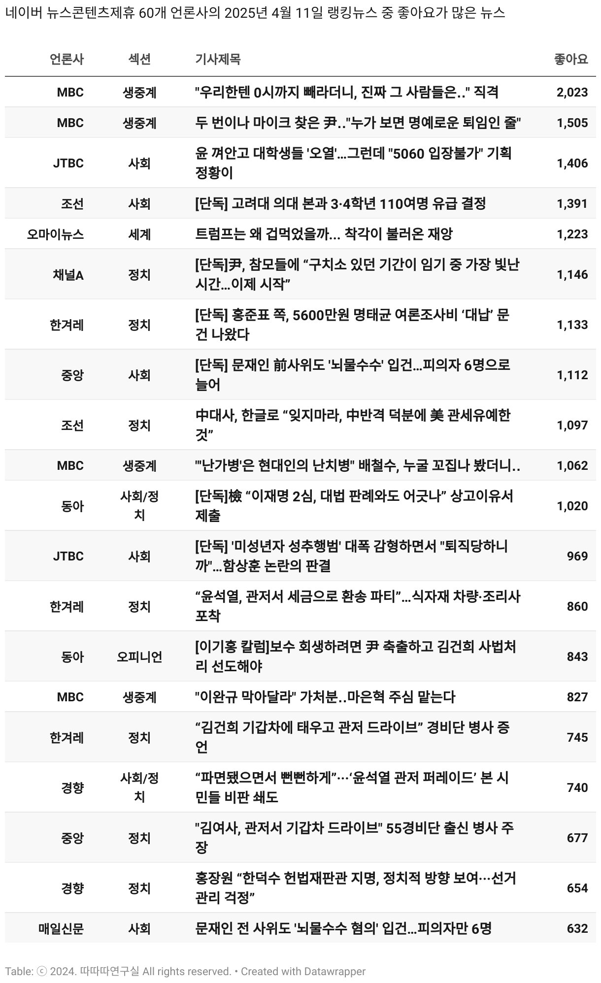 *데이터 수집 기간 : 2024년 6월 10일 *데이터 수집 대상 : 네이버 뉴스콘텐츠제휴 60개 언론사. 종합일간지 10개(경향신문, 국민일보, 동아일보, 문화일보, 서울신문, 세계일보, 조선일보, 중앙일보, 한겨레신문, 한국일보), 방송/통신사 14개(뉴스1, 뉴시스, 연합뉴스, 연합뉴스TV, 채널A, 한국경제TV, JTBC, KBS, MBC, MBN, SBS, SBS BIZ, TV조선, YTN), 경제지 11개(매일경제, 머니투데이, 비즈워치, 서울경제, 아시아경제, 이데일리, 조선비즈, 조세일보, 파이낸셜뉴스, 한국경제(유튜브제외), 헤럴드경제) 인터넷 8개(노컷뉴스, 더팩트, 데일리안, 머니S, 미디어오늘, 아이뉴스24, 오마이뉴스, 프레시안), IT 5개(디지털데일리,디지털타임스, 블로터, 전자신문, 지디넷코리아), 지역 12개(강원도민일보, 강원일보, 경기일보, 국제신문, 대구MBC, 대전일보, 매일신문, 부산일보, 전주MBC, CJB청주방송, JIBS, kbc광주방송)