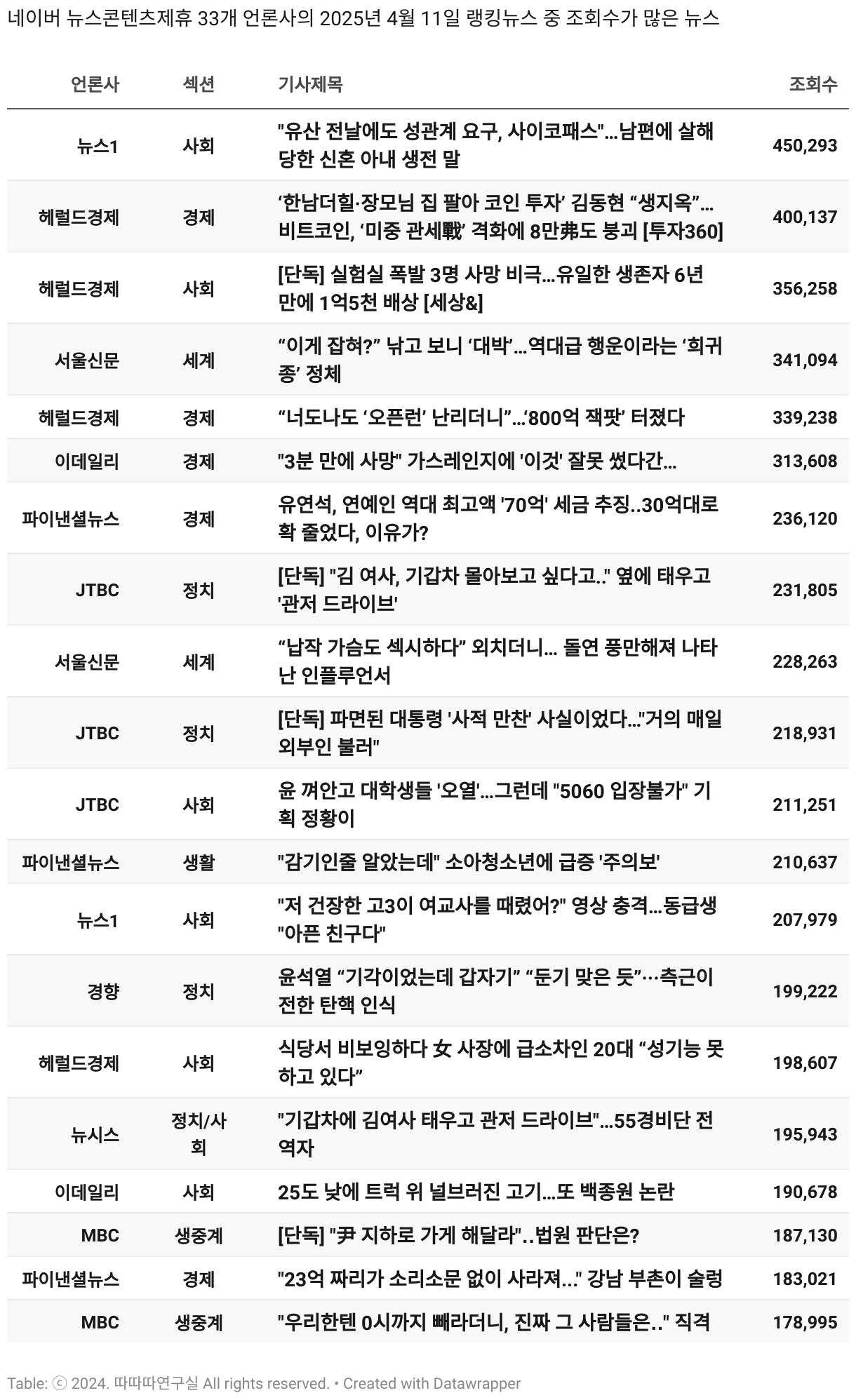 보도 시간대 기준 가장 흥한 기사 3건이 표시됩니다.