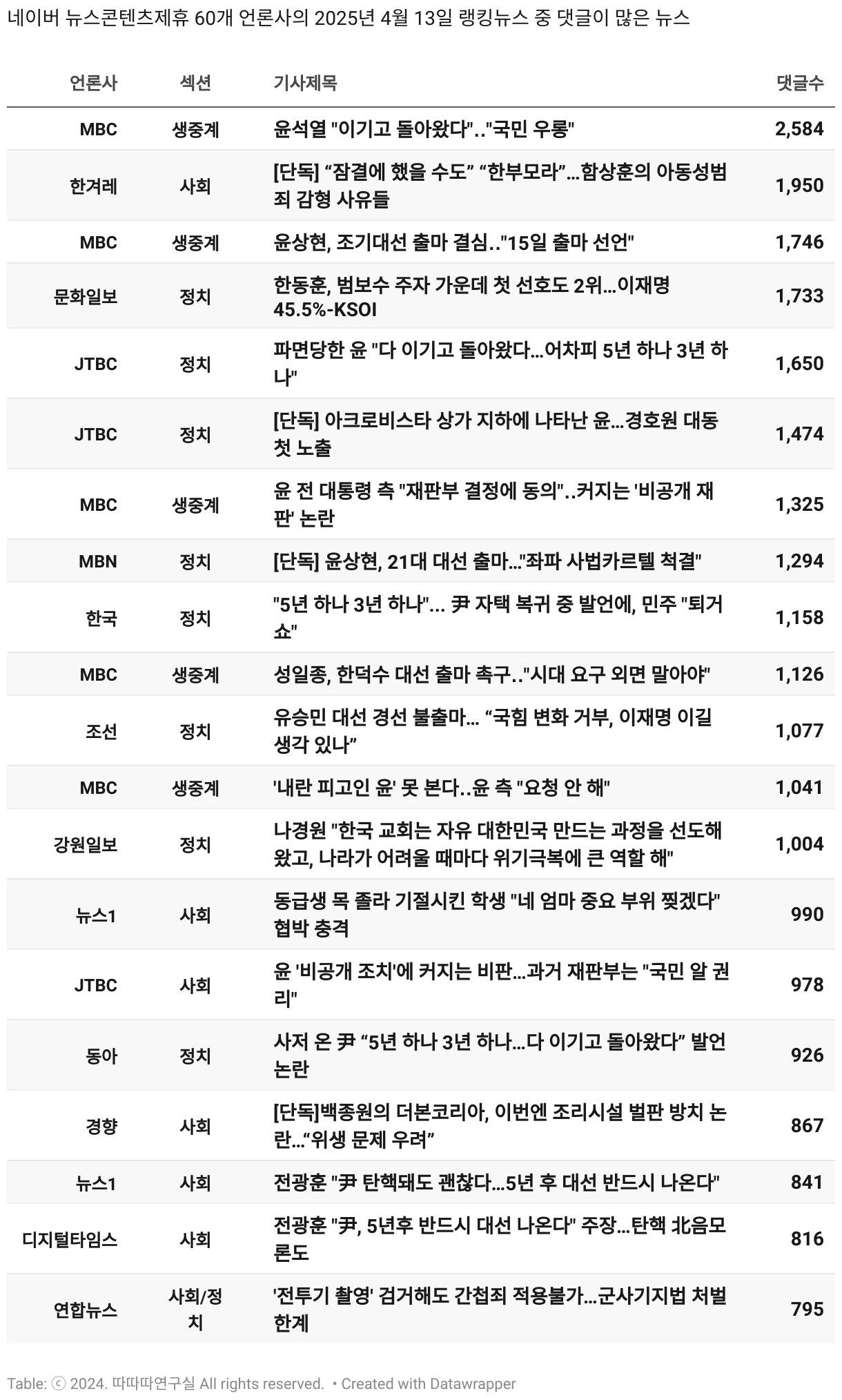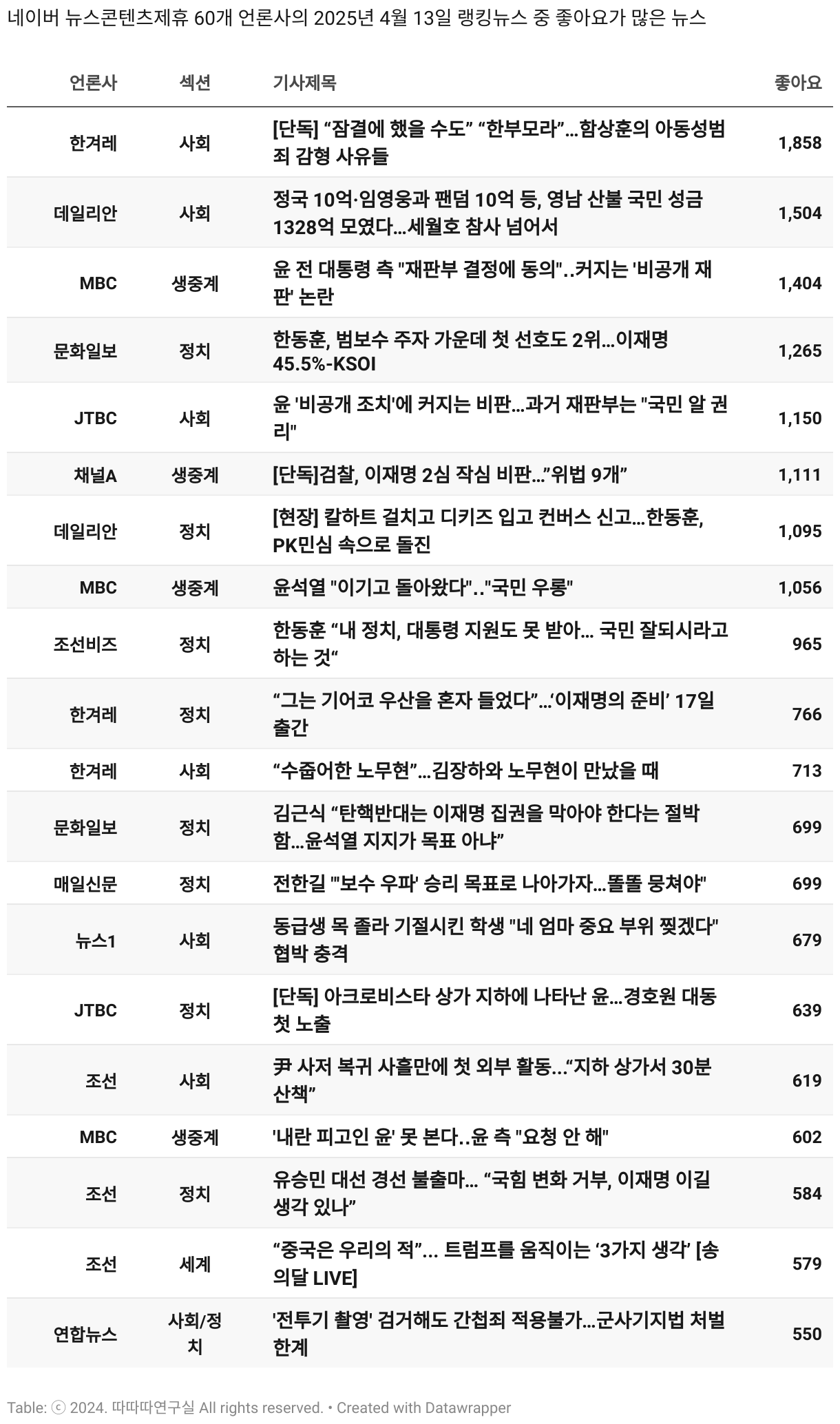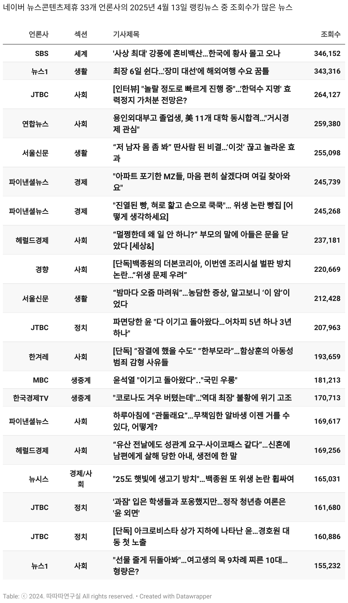 *데이터 수집 기간 : 2024년 6월 10일 *데이터 수집 대상 : 네이버 뉴스콘텐츠제휴 60개 언론사. 종합일간지 10개(경향신문, 국민일보, 동아일보, 문화일보, 서울신문, 세계일보, 조선일보, 중앙일보, 한겨레신문, 한국일보), 방송/통신사 14개(뉴스1, 뉴시스, 연합뉴스, 연합뉴스TV, 채널A, 한국경제TV, JTBC, KBS, MBC, MBN, SBS, SBS BIZ, TV조선, YTN), 경제지 11개(매일경제, 머니투데이, 비즈워치, 서울경제, 아시아경제, 이데일리, 조선비즈, 조세일보, 파이낸셜뉴스, 한국경제(유튜브제외), 헤럴드경제) 인터넷 8개(노컷뉴스, 더팩트, 데일리안, 머니S, 미디어오늘, 아이뉴스24, 오마이뉴스, 프레시안), IT 5개(디지털데일리,디지털타임스, 블로터, 전자신문, 지디넷코리아), 지역 12개(강원도민일보, 강원일보, 경기일보, 국제신문, 대구MBC, 대전일보, 매일신문, 부산일보, 전주MBC, CJB청주방송, JIBS, kbc광주방송)