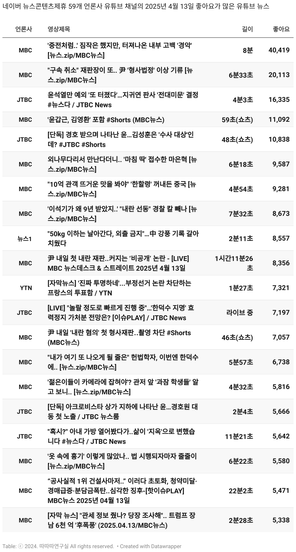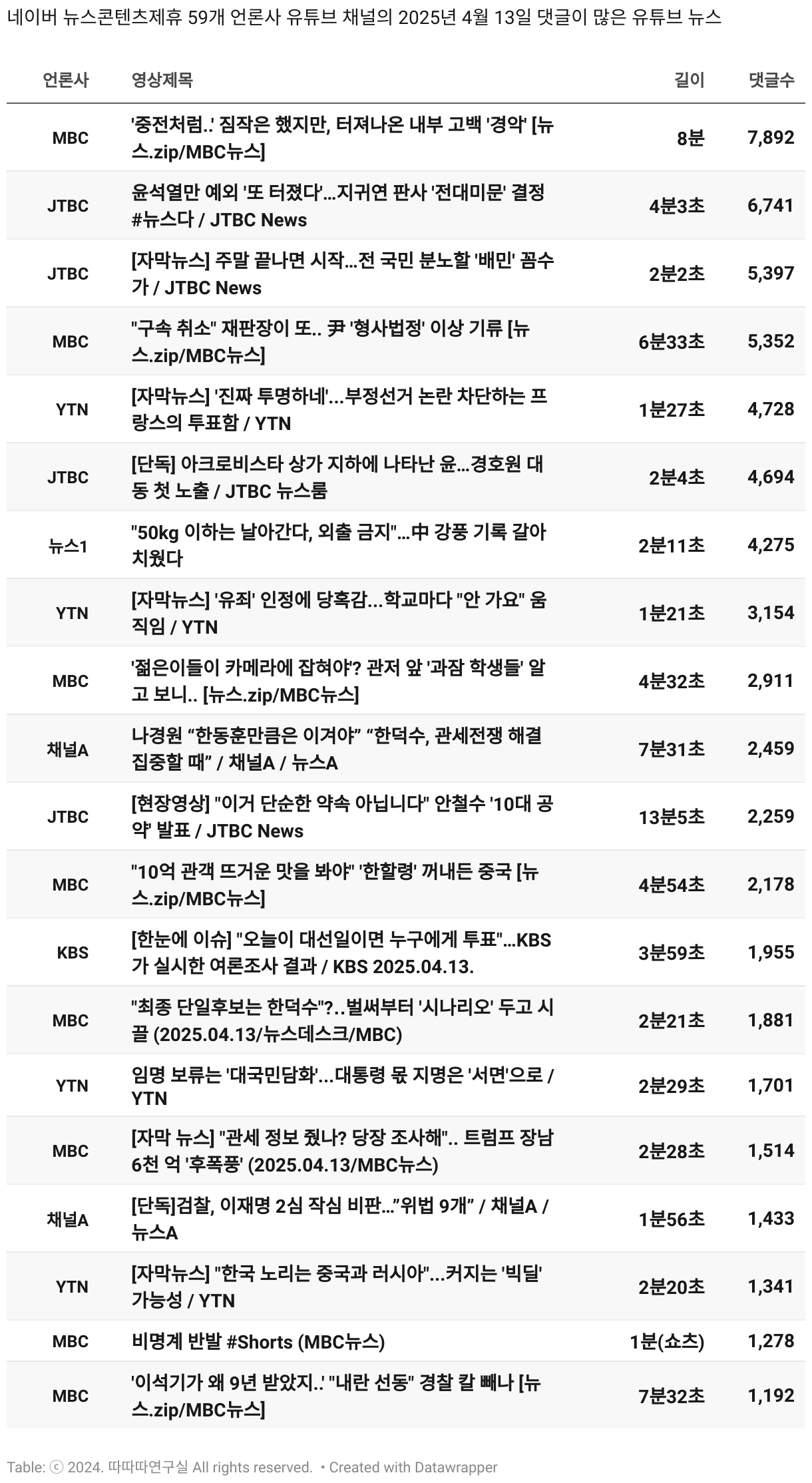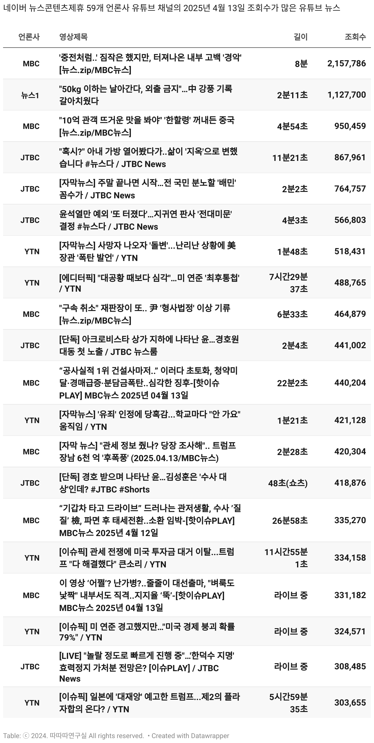 *데이터 수집 기간 : 2024년 6월 10일 *데이터 수집 대상 : 네이버 뉴스콘텐츠제휴 60개 언론사. 종합일간지 10개(경향신문, 국민일보, 동아일보, 문화일보, 서울신문, 세계일보, 조선일보, 중앙일보, 한겨레신문, 한국일보), 방송/통신사 14개(뉴스1, 뉴시스, 연합뉴스, 연합뉴스TV, 채널A, 한국경제TV, JTBC, KBS, MBC, MBN, SBS, SBS BIZ, TV조선, YTN), 경제지 11개(매일경제, 머니투데이, 비즈워치, 서울경제, 아시아경제, 이데일리, 조선비즈, 조세일보, 파이낸셜뉴스, 한국경제(유튜브제외), 헤럴드경제) 인터넷 8개(노컷뉴스, 더팩트, 데일리안, 머니S, 미디어오늘, 아이뉴스24, 오마이뉴스, 프레시안), IT 5개(디지털데일리,디지털타임스, 블로터, 전자신문, 지디넷코리아), 지역 12개(강원도민일보, 강원일보, 경기일보, 국제신문, 대구MBC, 대전일보, 매일신문, 부산일보, 전주MBC, CJB청주방송, JIBS, kbc광주방송)