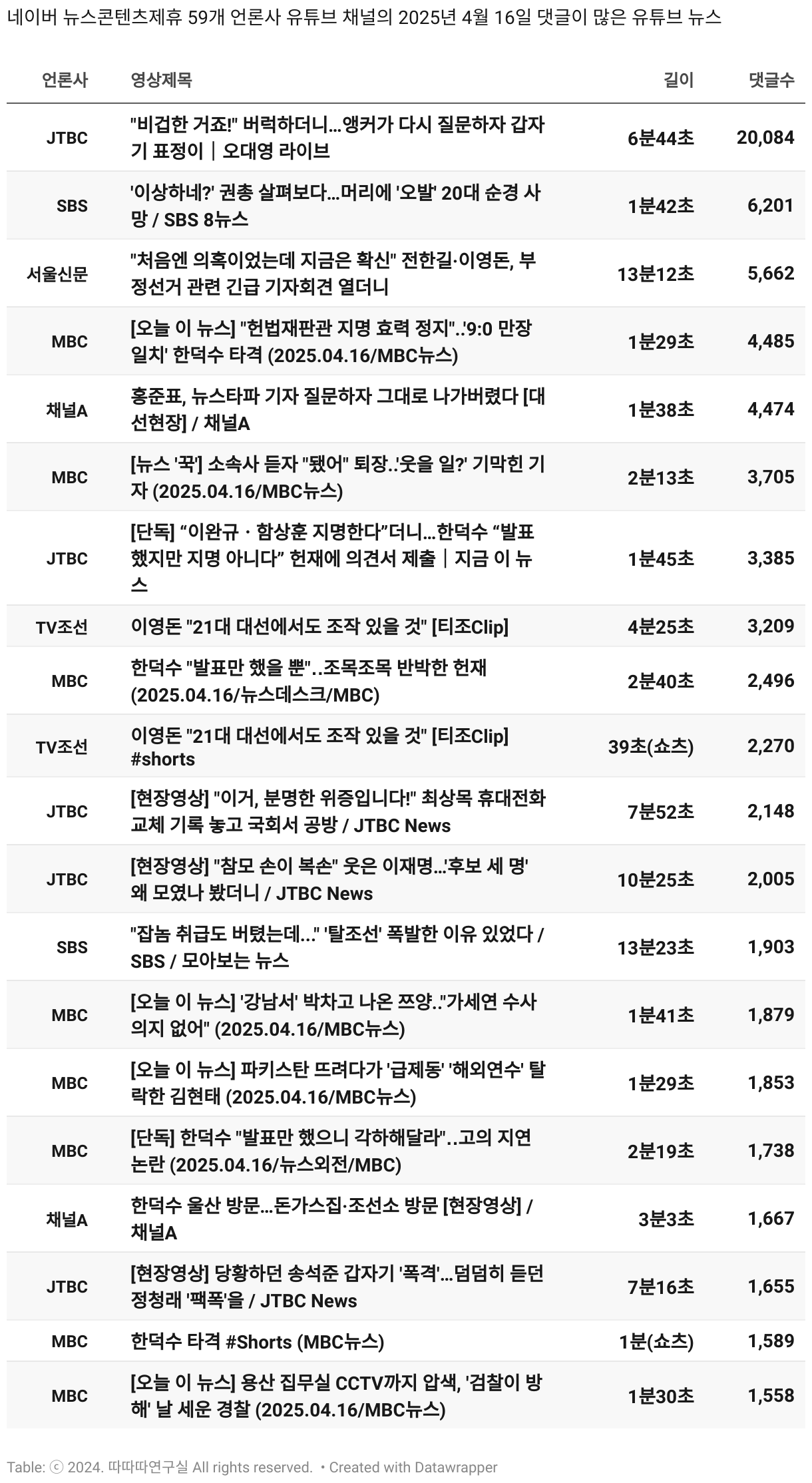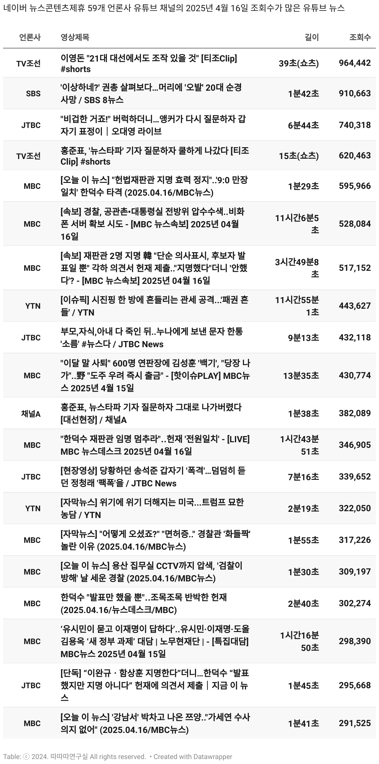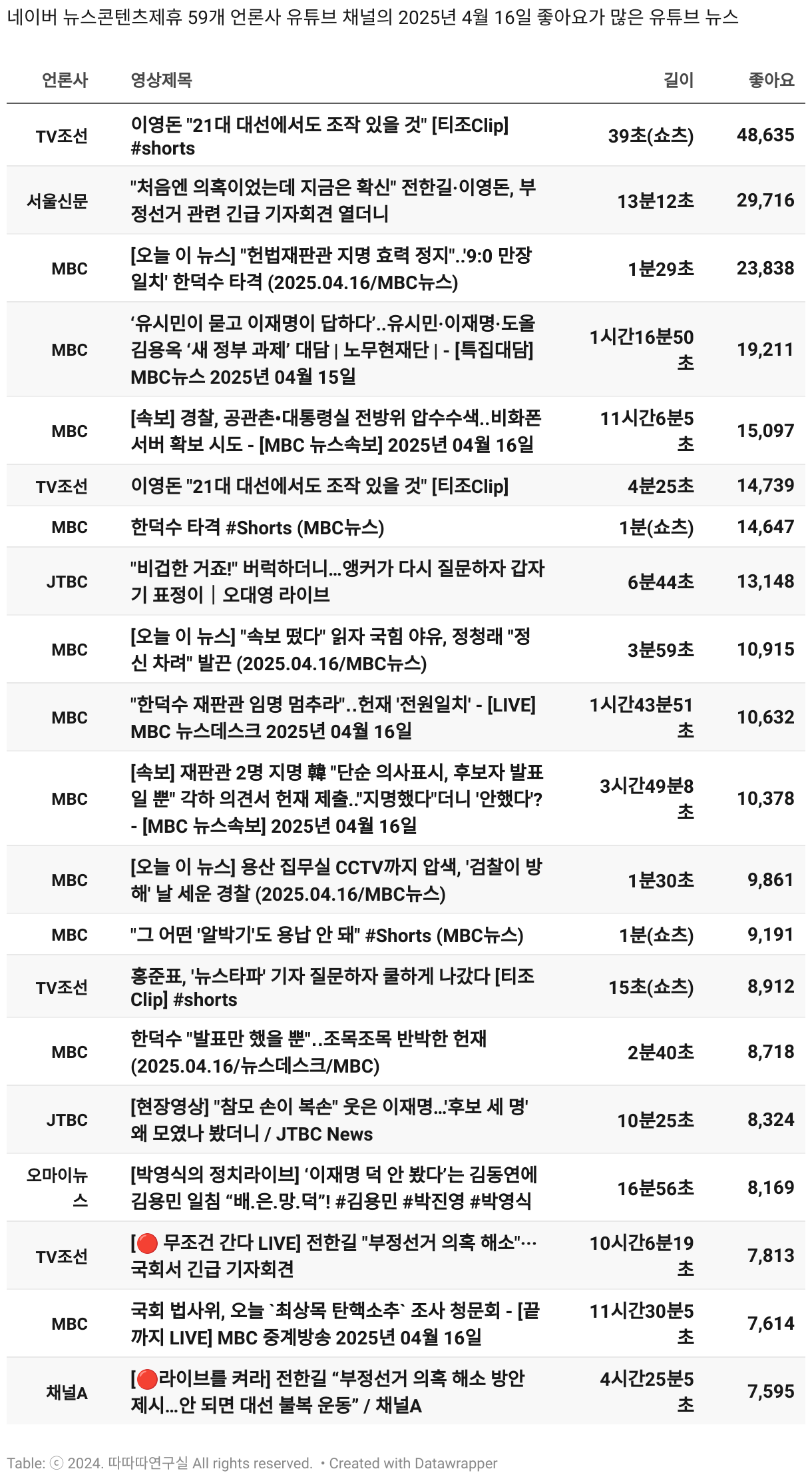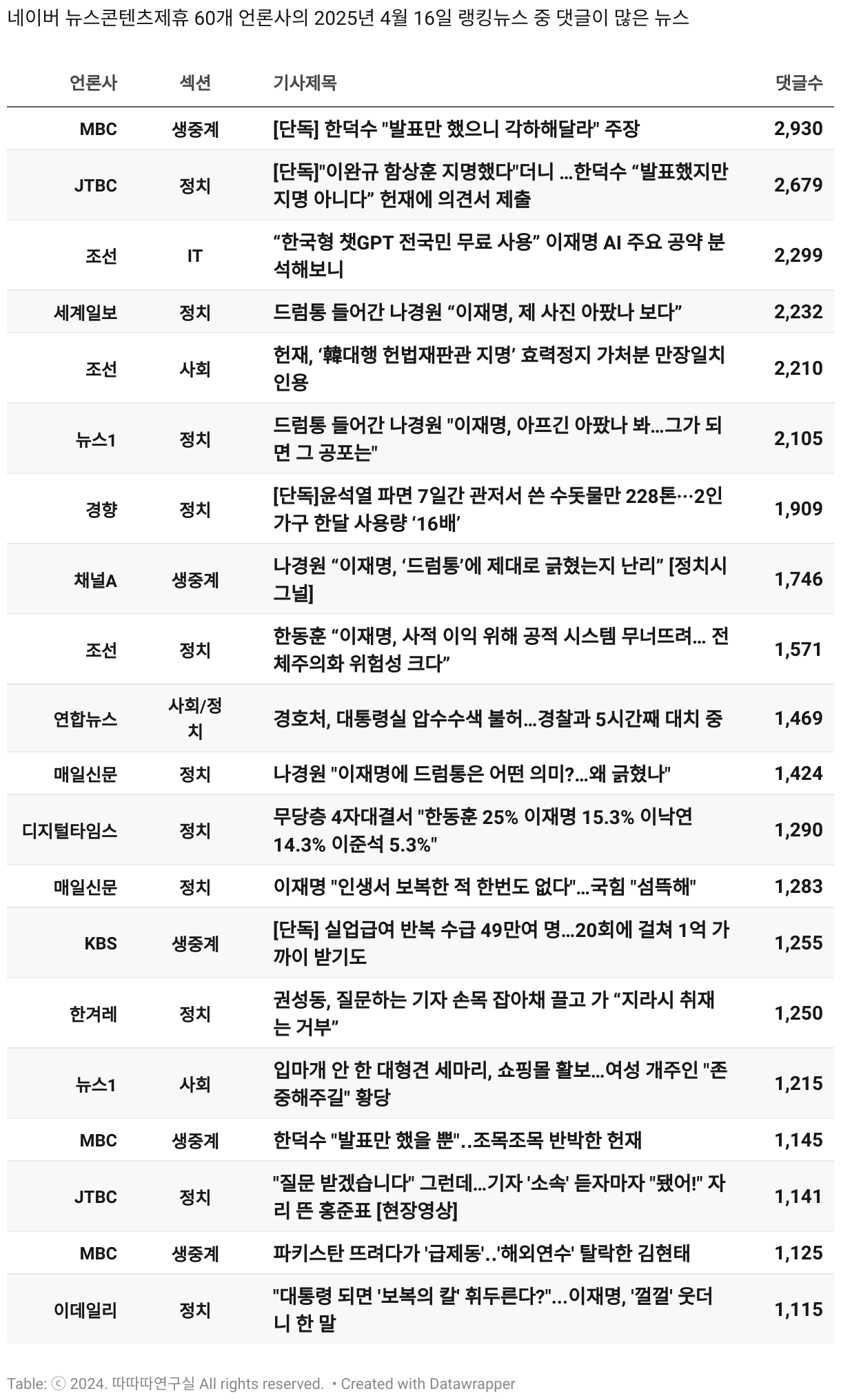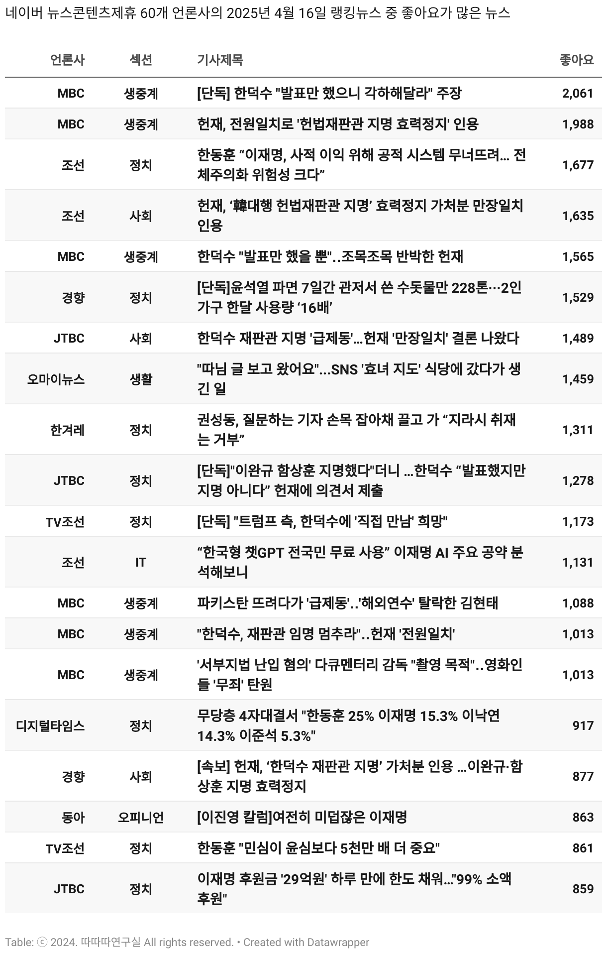 *데이터 수집 기간 : 2024년 6월 10일 *데이터 수집 대상 : 네이버 뉴스콘텐츠제휴 60개 언론사. 종합일간지 10개(경향신문, 국민일보, 동아일보, 문화일보, 서울신문, 세계일보, 조선일보, 중앙일보, 한겨레신문, 한국일보), 방송/통신사 14개(뉴스1, 뉴시스, 연합뉴스, 연합뉴스TV, 채널A, 한국경제TV, JTBC, KBS, MBC, MBN, SBS, SBS BIZ, TV조선, YTN), 경제지 11개(매일경제, 머니투데이, 비즈워치, 서울경제, 아시아경제, 이데일리, 조선비즈, 조세일보, 파이낸셜뉴스, 한국경제(유튜브제외), 헤럴드경제) 인터넷 8개(노컷뉴스, 더팩트, 데일리안, 머니S, 미디어오늘, 아이뉴스24, 오마이뉴스, 프레시안), IT 5개(디지털데일리,디지털타임스, 블로터, 전자신문, 지디넷코리아), 지역 12개(강원도민일보, 강원일보, 경기일보, 국제신문, 대구MBC, 대전일보, 매일신문, 부산일보, 전주MBC, CJB청주방송, JIBS, kbc광주방송)