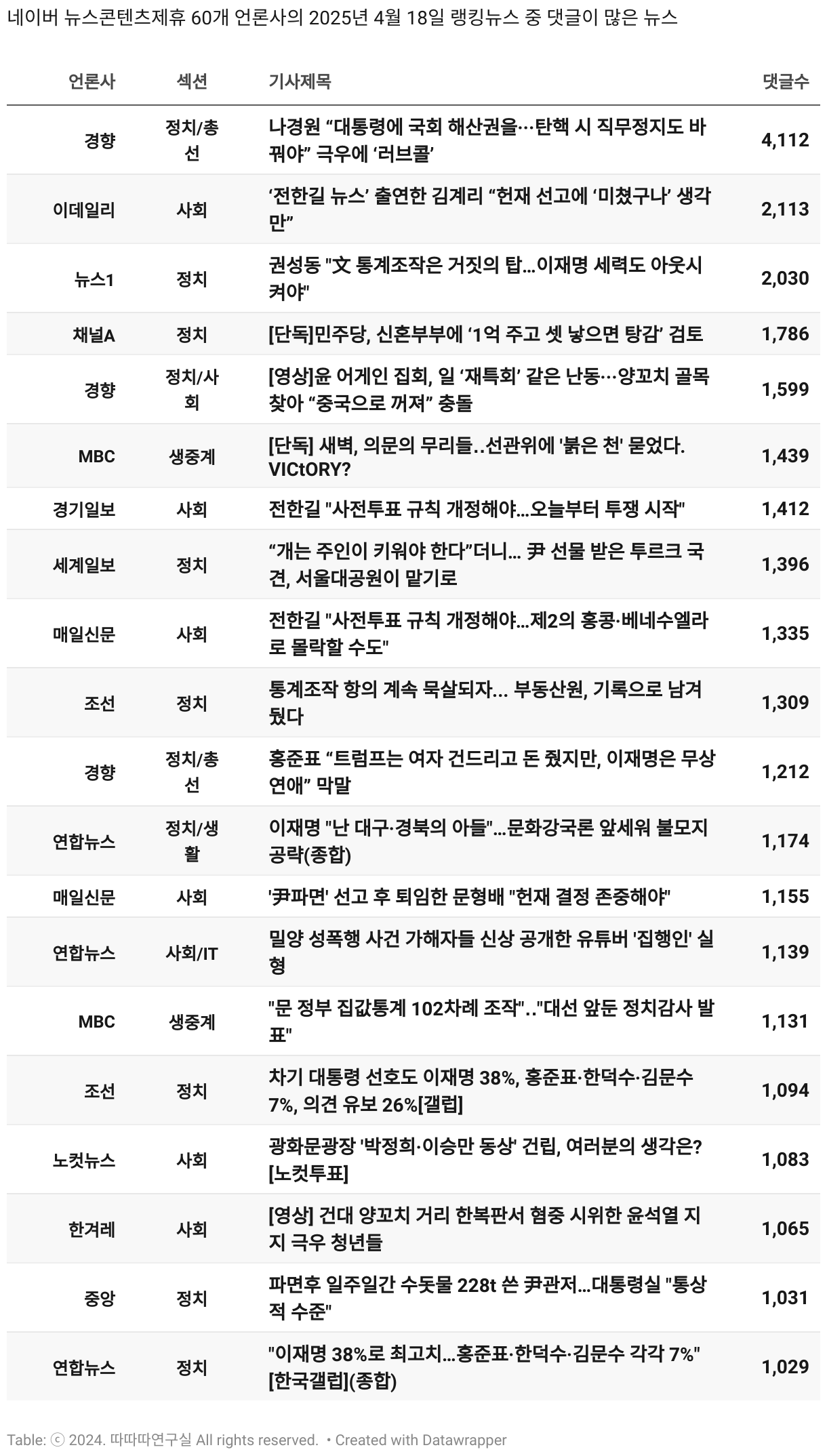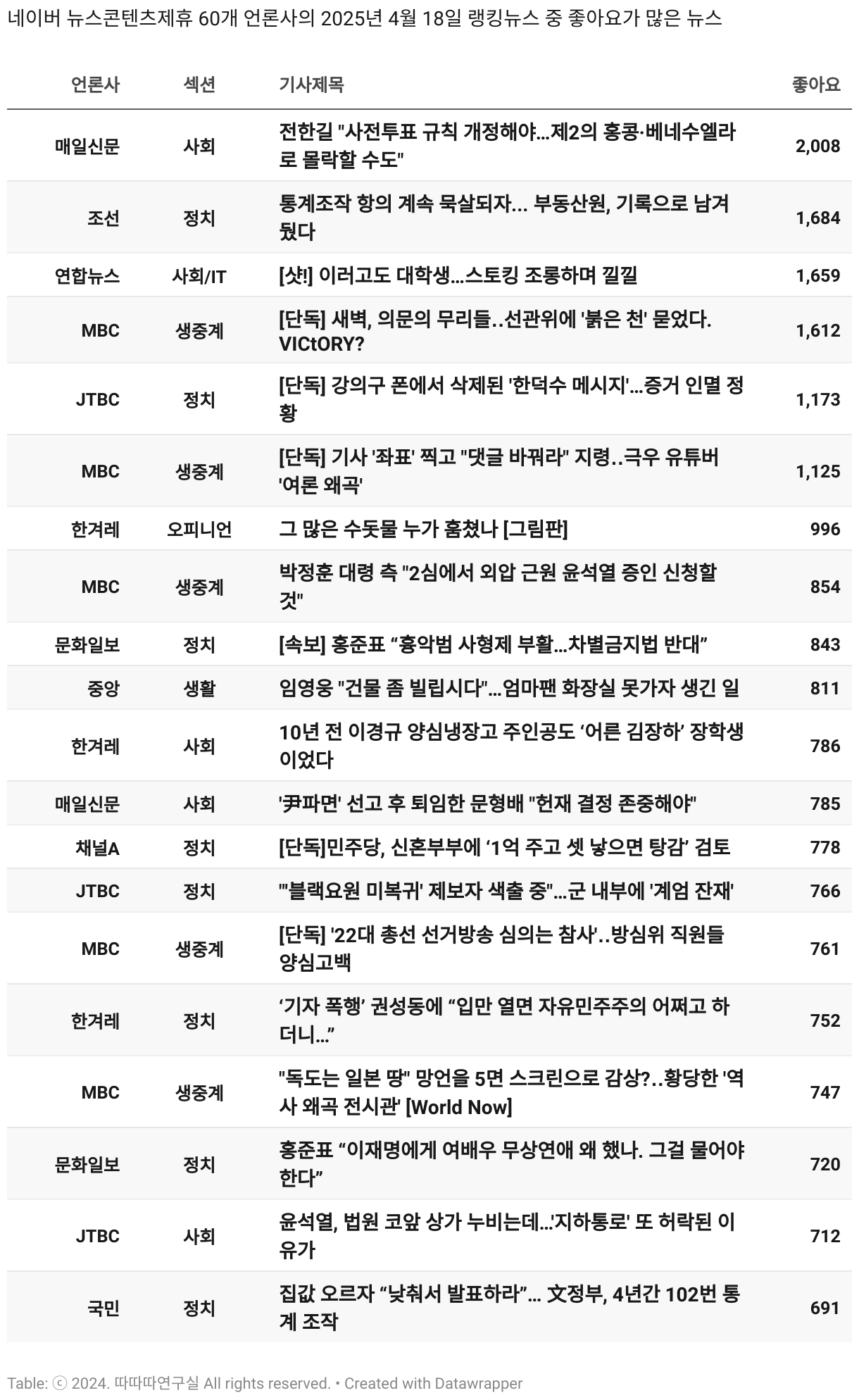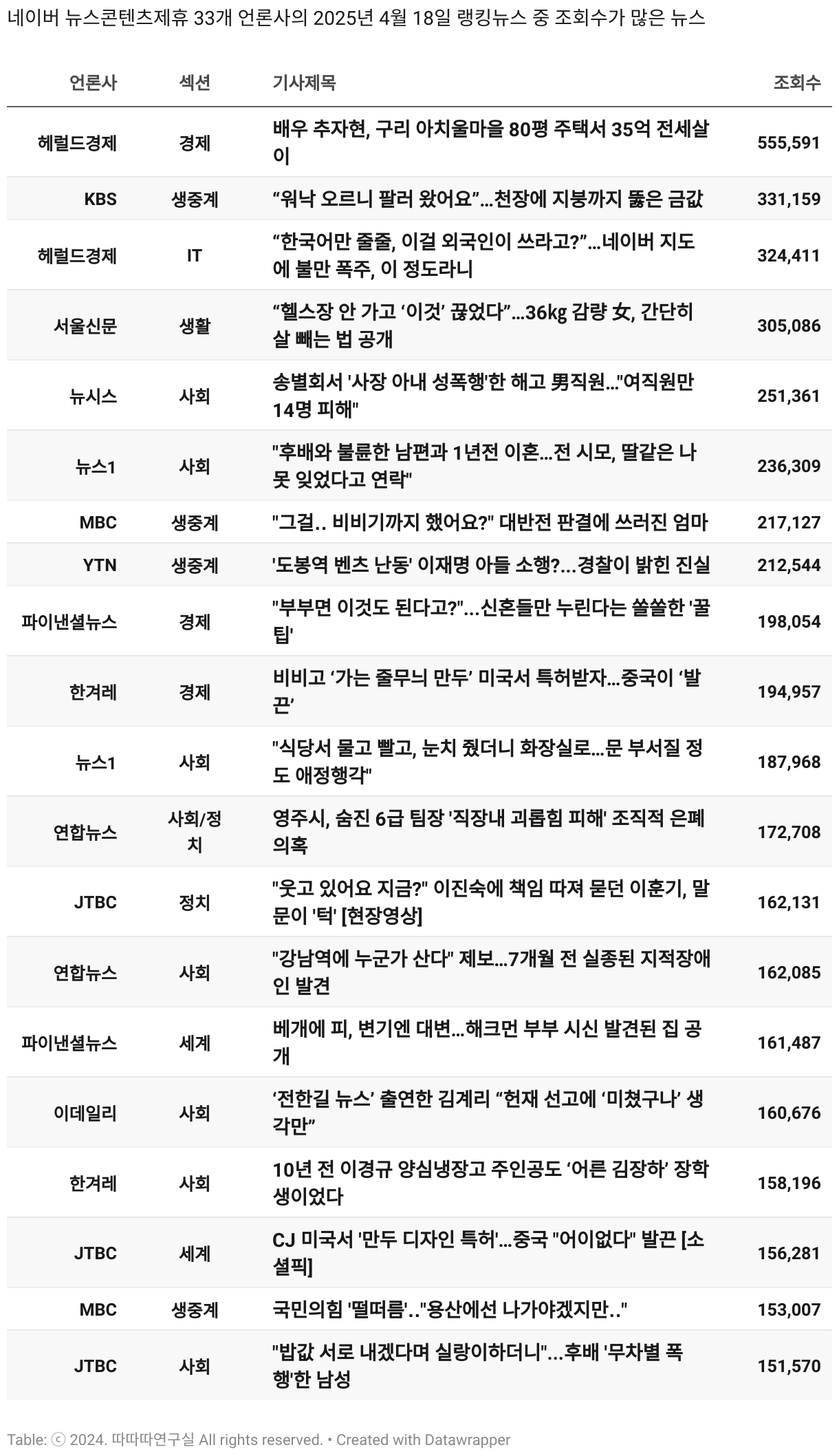 *데이터 수집 기간 : 2024년 6월 10일 *데이터 수집 대상 : 네이버 뉴스콘텐츠제휴 60개 언론사. 종합일간지 10개(경향신문, 국민일보, 동아일보, 문화일보, 서울신문, 세계일보, 조선일보, 중앙일보, 한겨레신문, 한국일보), 방송/통신사 14개(뉴스1, 뉴시스, 연합뉴스, 연합뉴스TV, 채널A, 한국경제TV, JTBC, KBS, MBC, MBN, SBS, SBS BIZ, TV조선, YTN), 경제지 11개(매일경제, 머니투데이, 비즈워치, 서울경제, 아시아경제, 이데일리, 조선비즈, 조세일보, 파이낸셜뉴스, 한국경제(유튜브제외), 헤럴드경제) 인터넷 8개(노컷뉴스, 더팩트, 데일리안, 머니S, 미디어오늘, 아이뉴스24, 오마이뉴스, 프레시안), IT 5개(디지털데일리,디지털타임스, 블로터, 전자신문, 지디넷코리아), 지역 12개(강원도민일보, 강원일보, 경기일보, 국제신문, 대구MBC, 대전일보, 매일신문, 부산일보, 전주MBC, CJB청주방송, JIBS, kbc광주방송)