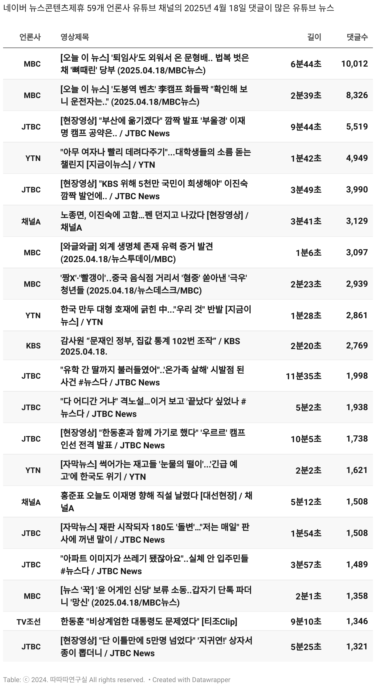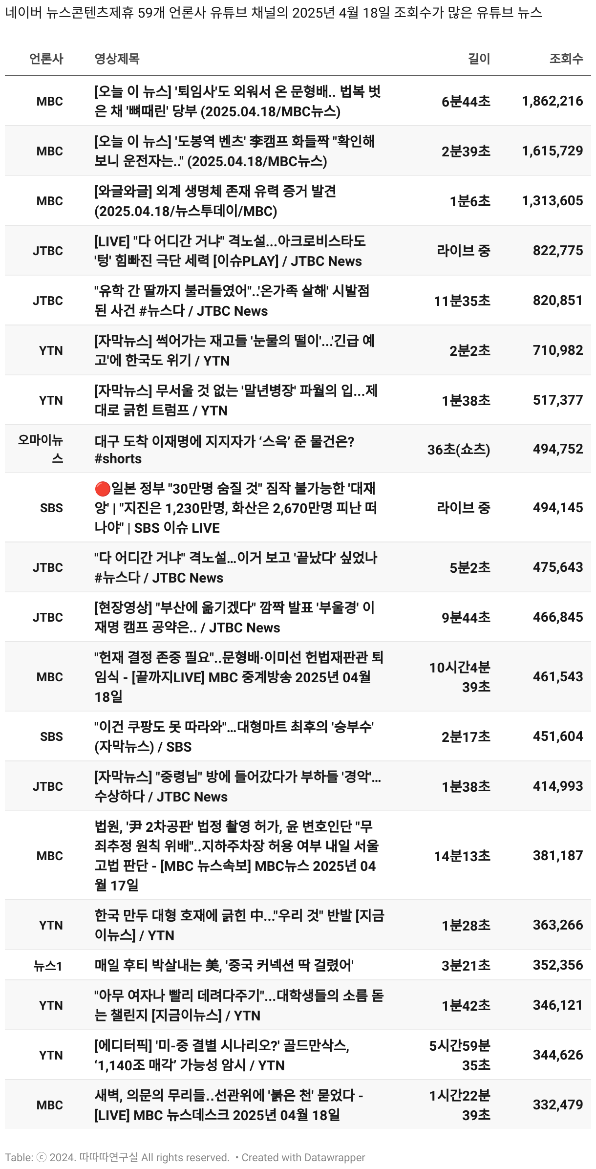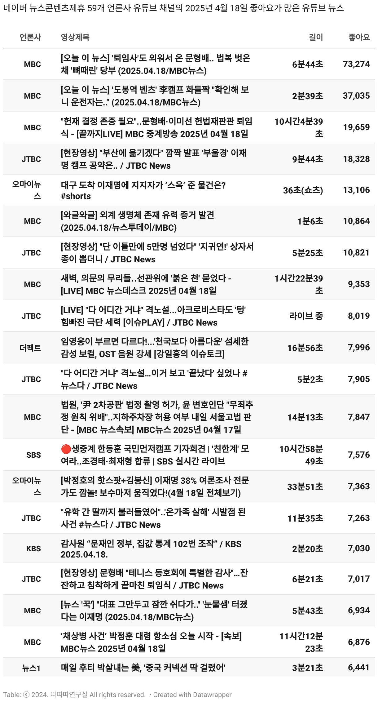 *데이터 수집 기간 : 2024년 6월 10일 *데이터 수집 대상 : 네이버 뉴스콘텐츠제휴 60개 언론사. 종합일간지 10개(경향신문, 국민일보, 동아일보, 문화일보, 서울신문, 세계일보, 조선일보, 중앙일보, 한겨레신문, 한국일보), 방송/통신사 14개(뉴스1, 뉴시스, 연합뉴스, 연합뉴스TV, 채널A, 한국경제TV, JTBC, KBS, MBC, MBN, SBS, SBS BIZ, TV조선, YTN), 경제지 11개(매일경제, 머니투데이, 비즈워치, 서울경제, 아시아경제, 이데일리, 조선비즈, 조세일보, 파이낸셜뉴스, 한국경제(유튜브제외), 헤럴드경제) 인터넷 8개(노컷뉴스, 더팩트, 데일리안, 머니S, 미디어오늘, 아이뉴스24, 오마이뉴스, 프레시안), IT 5개(디지털데일리,디지털타임스, 블로터, 전자신문, 지디넷코리아), 지역 12개(강원도민일보, 강원일보, 경기일보, 국제신문, 대구MBC, 대전일보, 매일신문, 부산일보, 전주MBC, CJB청주방송, JIBS, kbc광주방송)