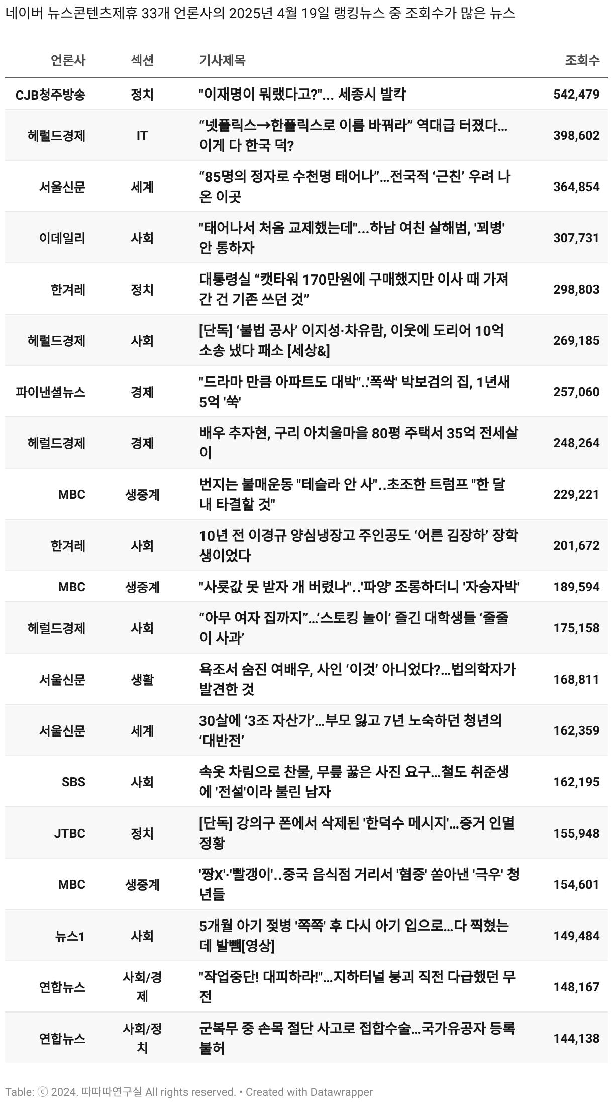 보도 시간대 기준 가장 흥한 기사 3건이 표시됩니다.