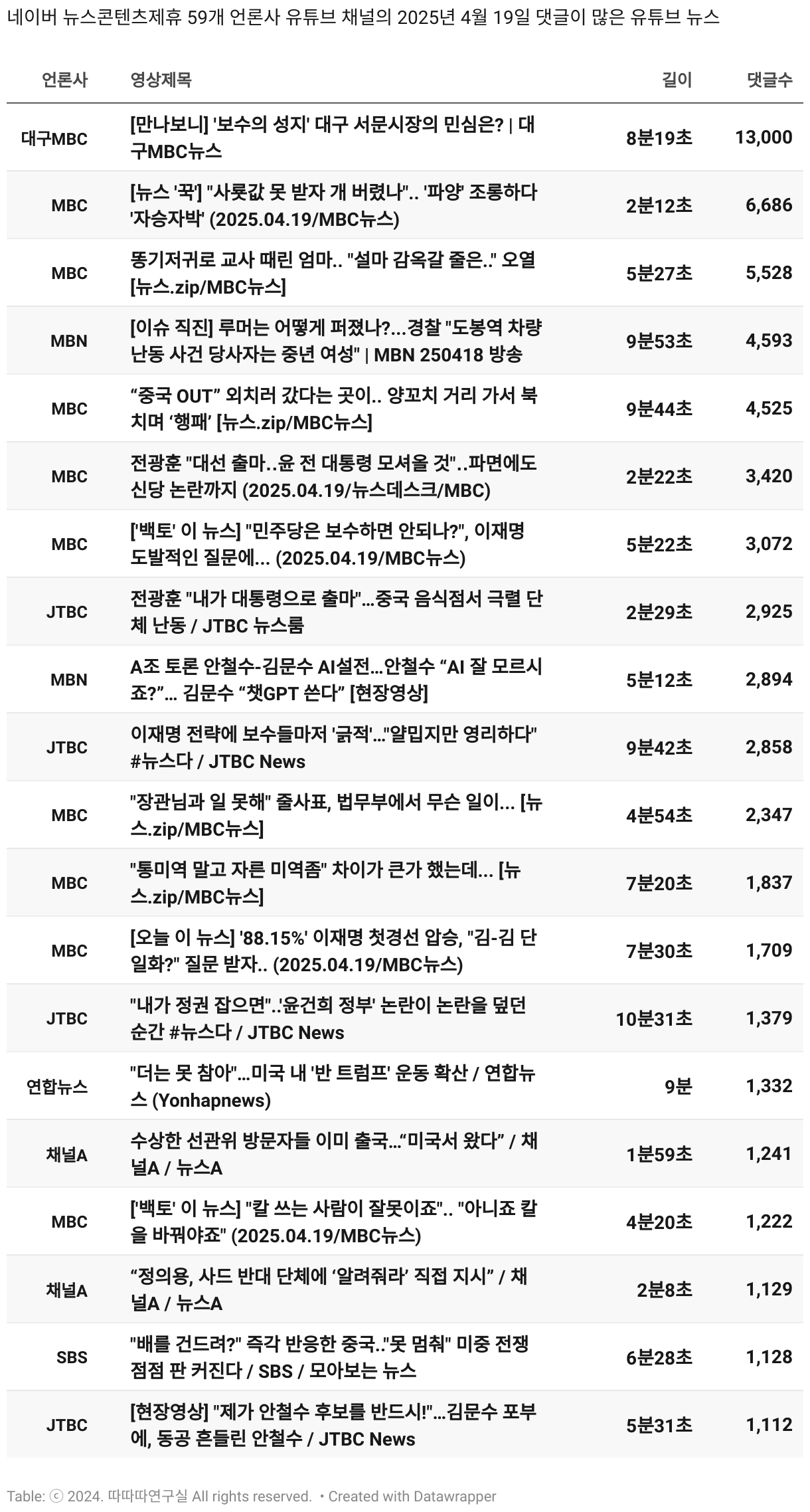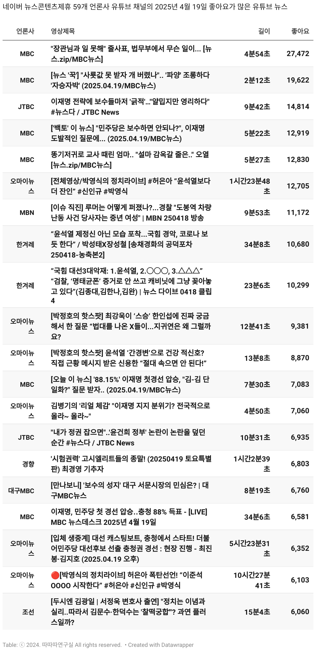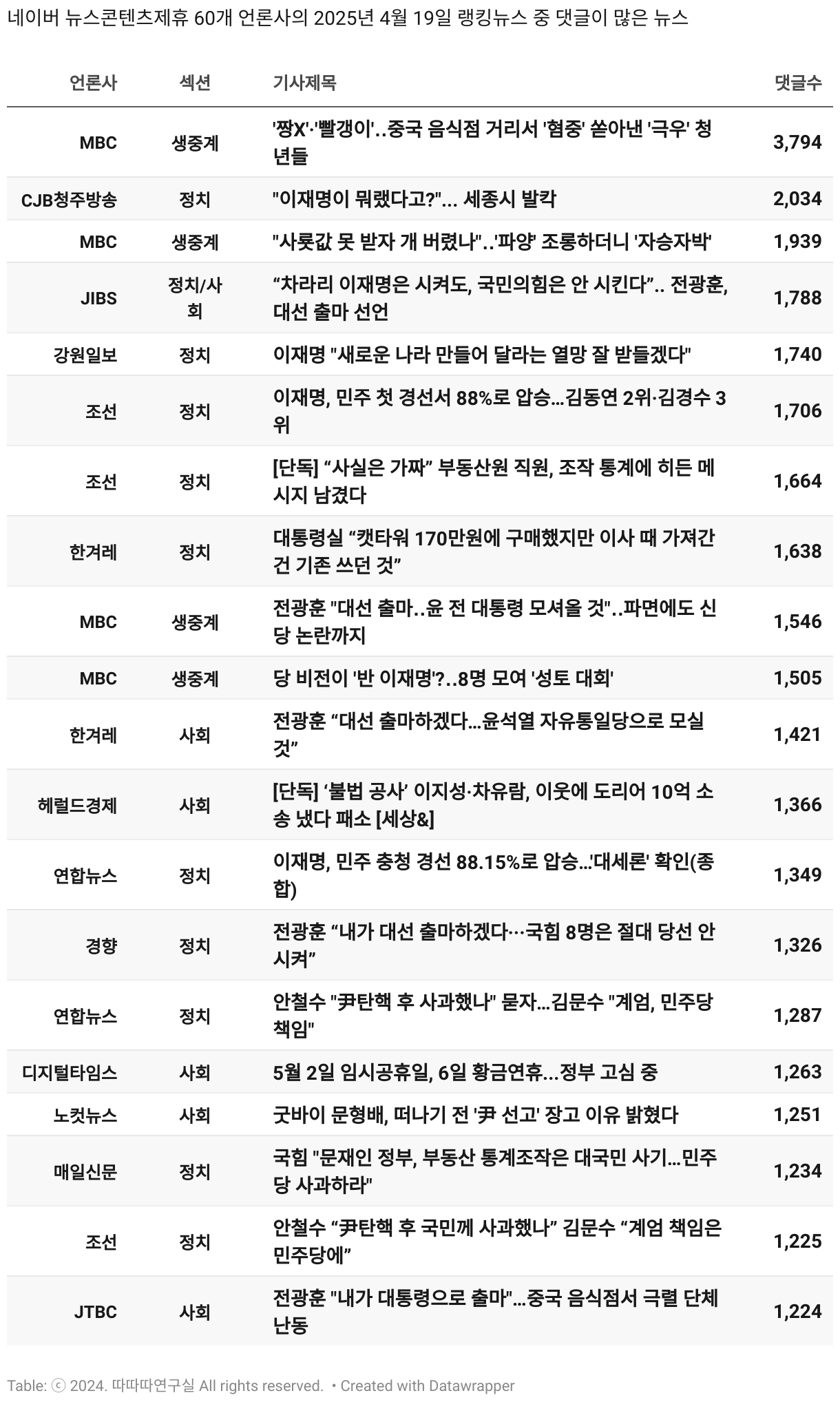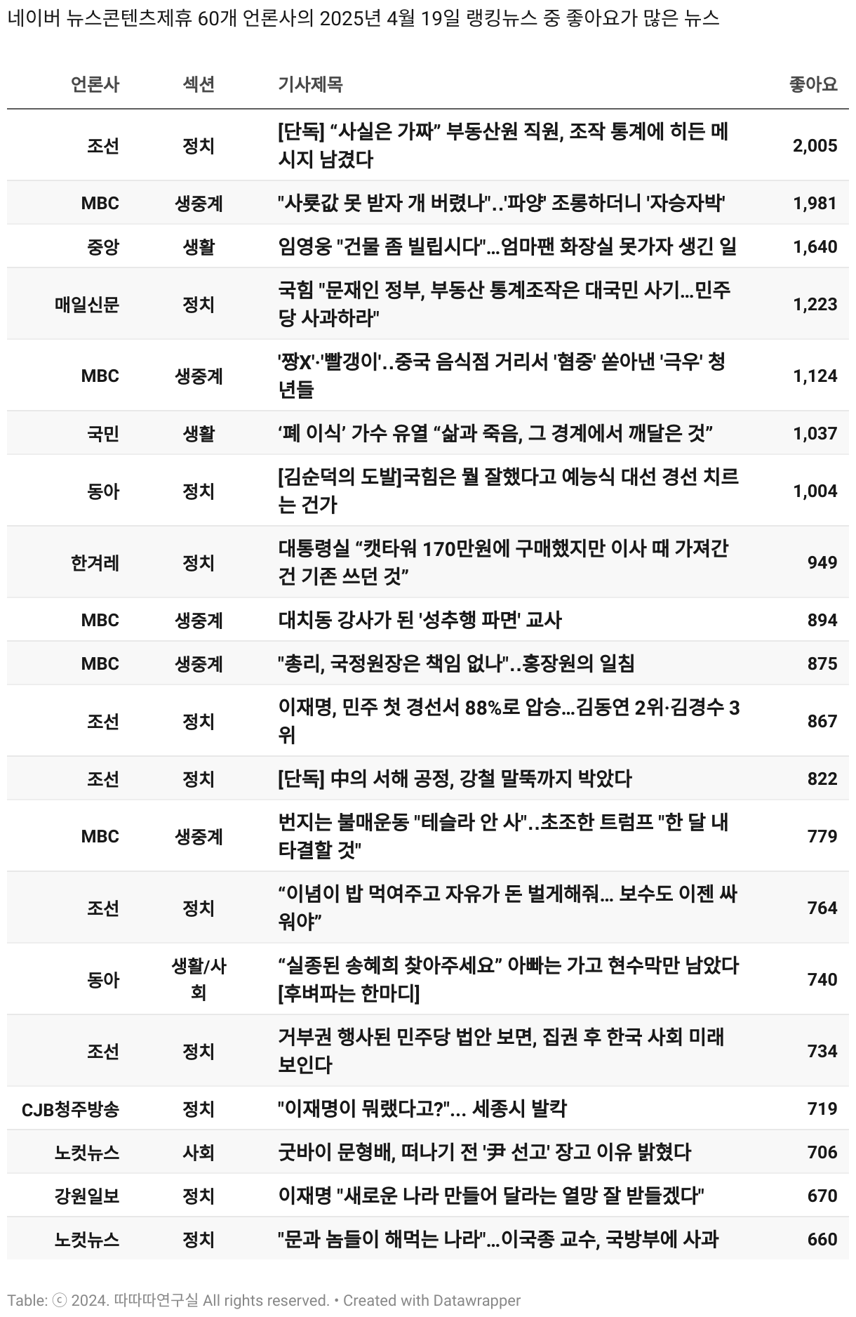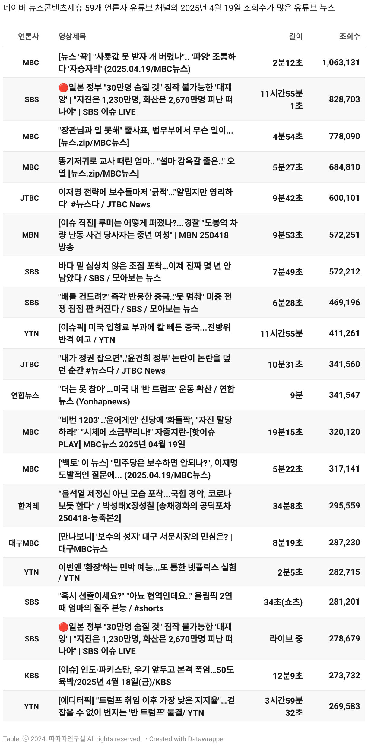 *데이터 수집 기간 : 2024년 6월 10일 *데이터 수집 대상 : 네이버 뉴스콘텐츠제휴 60개 언론사. 종합일간지 10개(경향신문, 국민일보, 동아일보, 문화일보, 서울신문, 세계일보, 조선일보, 중앙일보, 한겨레신문, 한국일보), 방송/통신사 14개(뉴스1, 뉴시스, 연합뉴스, 연합뉴스TV, 채널A, 한국경제TV, JTBC, KBS, MBC, MBN, SBS, SBS BIZ, TV조선, YTN), 경제지 11개(매일경제, 머니투데이, 비즈워치, 서울경제, 아시아경제, 이데일리, 조선비즈, 조세일보, 파이낸셜뉴스, 한국경제(유튜브제외), 헤럴드경제) 인터넷 8개(노컷뉴스, 더팩트, 데일리안, 머니S, 미디어오늘, 아이뉴스24, 오마이뉴스, 프레시안), IT 5개(디지털데일리,디지털타임스, 블로터, 전자신문, 지디넷코리아), 지역 12개(강원도민일보, 강원일보, 경기일보, 국제신문, 대구MBC, 대전일보, 매일신문, 부산일보, 전주MBC, CJB청주방송, JIBS, kbc광주방송)