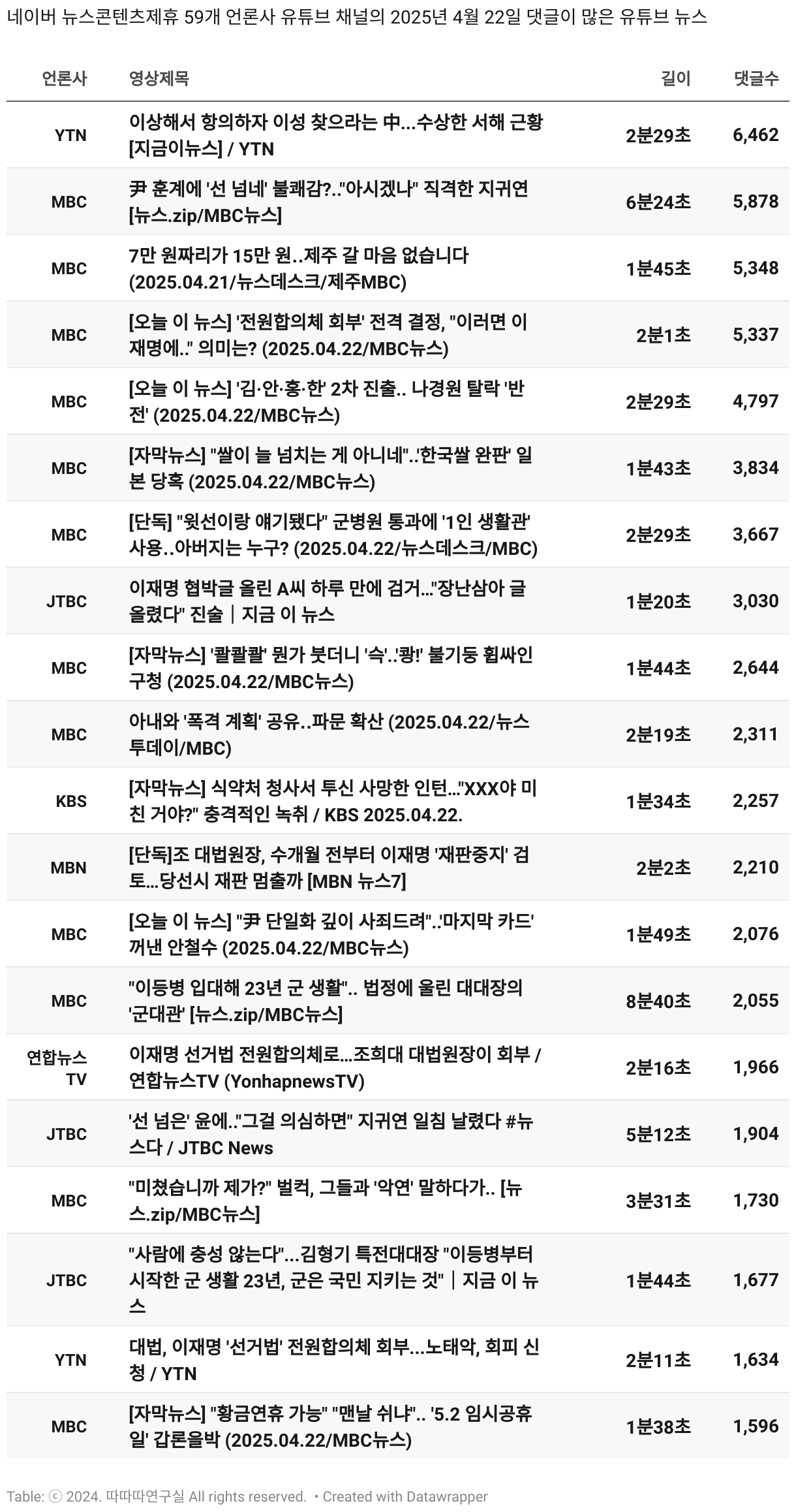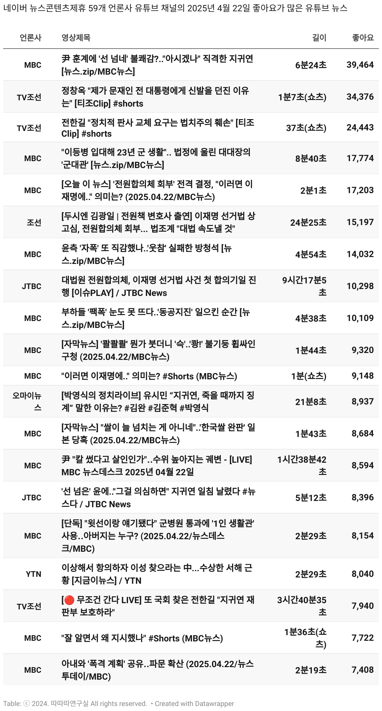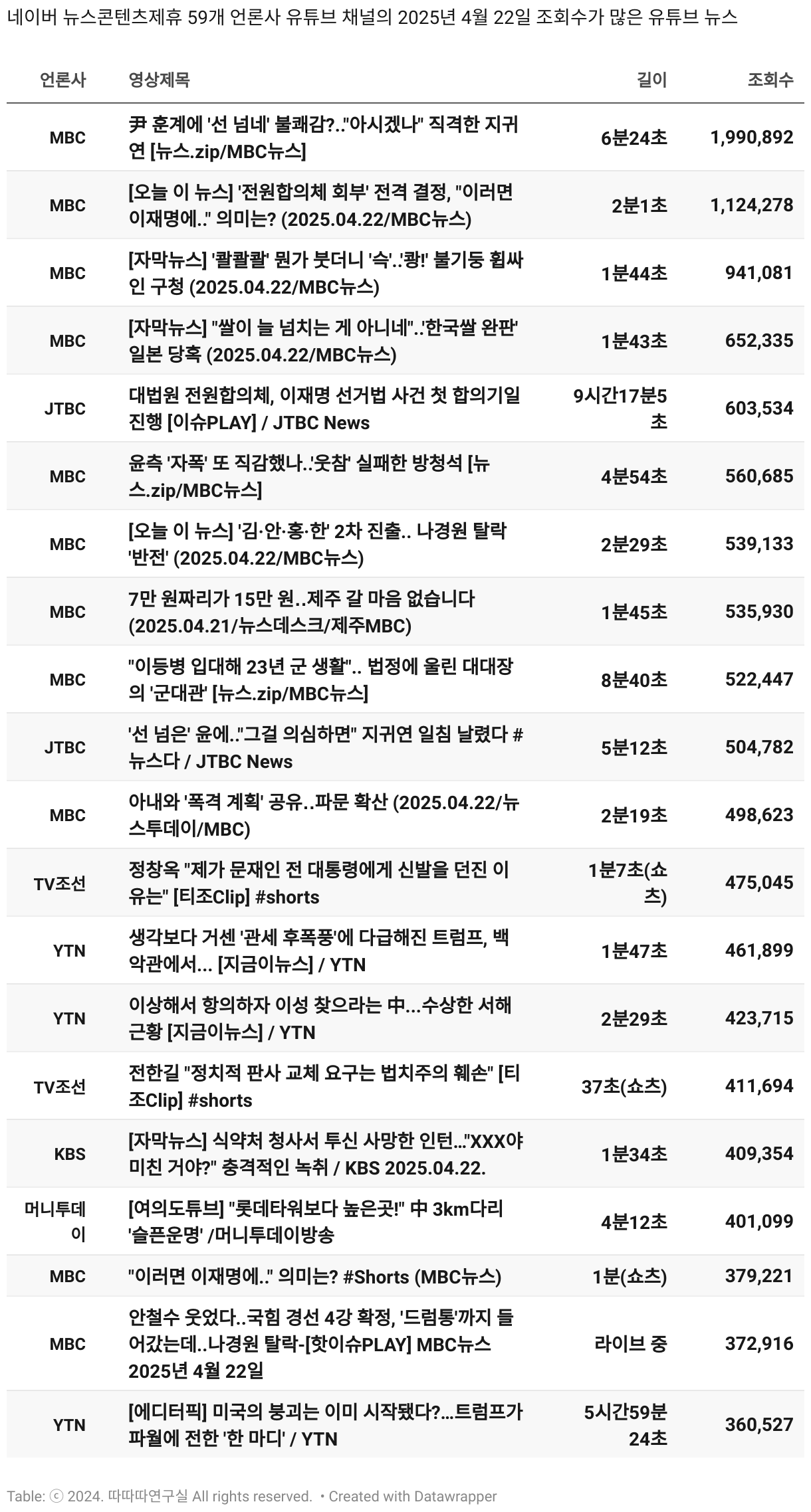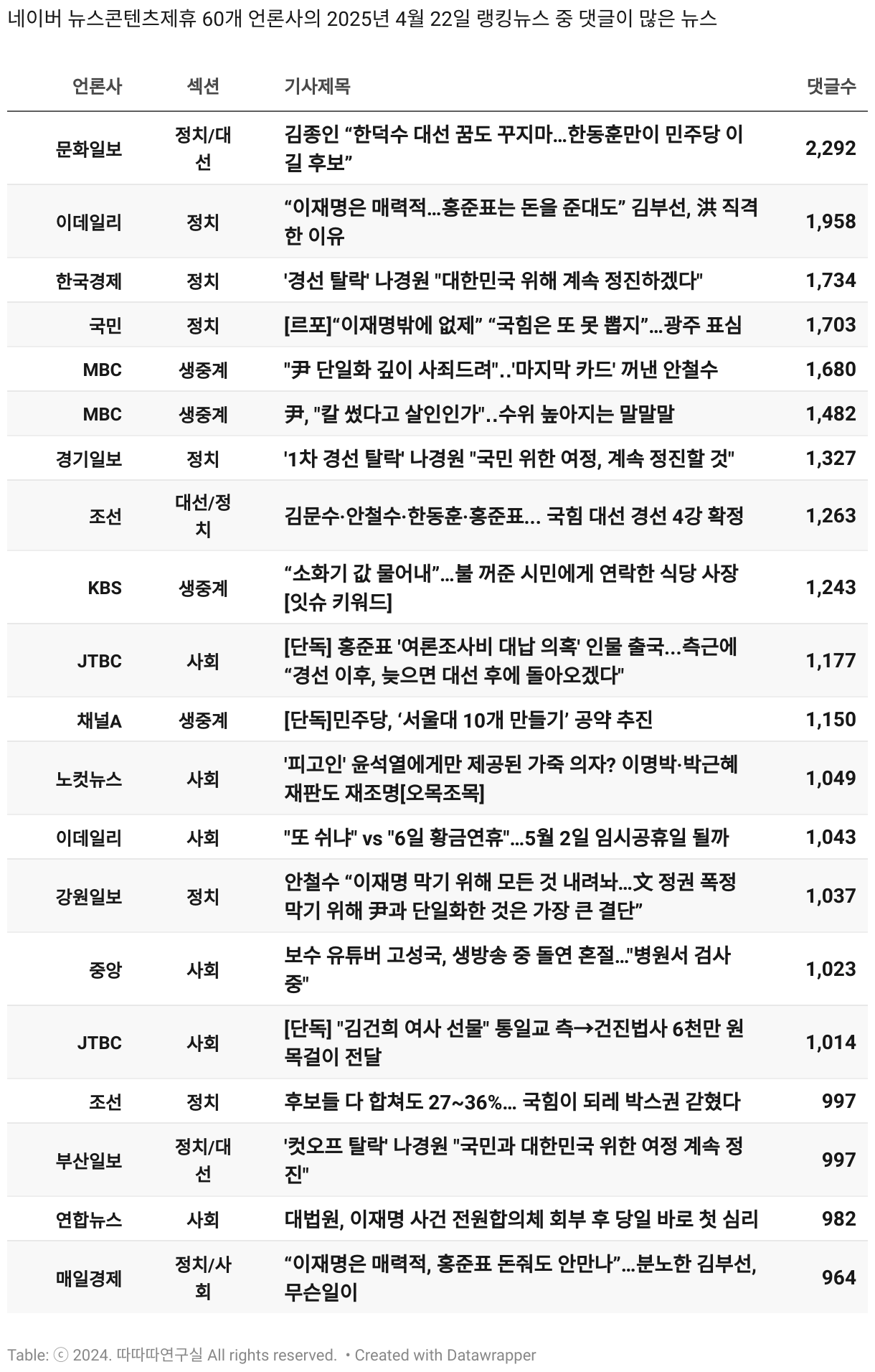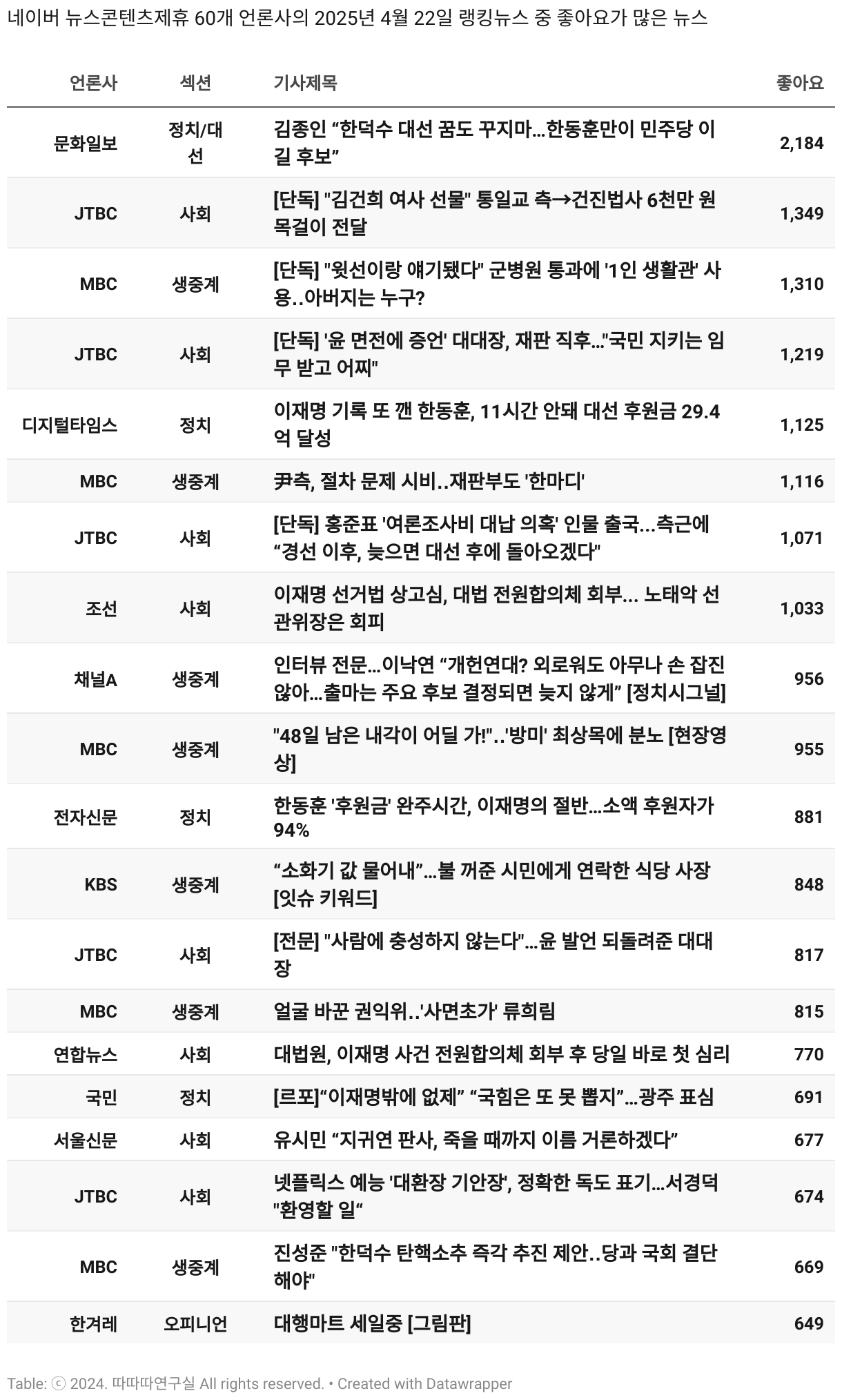 *데이터 수집 기간 : 2024년 6월 10일 *데이터 수집 대상 : 네이버 뉴스콘텐츠제휴 60개 언론사. 종합일간지 10개(경향신문, 국민일보, 동아일보, 문화일보, 서울신문, 세계일보, 조선일보, 중앙일보, 한겨레신문, 한국일보), 방송/통신사 14개(뉴스1, 뉴시스, 연합뉴스, 연합뉴스TV, 채널A, 한국경제TV, JTBC, KBS, MBC, MBN, SBS, SBS BIZ, TV조선, YTN), 경제지 11개(매일경제, 머니투데이, 비즈워치, 서울경제, 아시아경제, 이데일리, 조선비즈, 조세일보, 파이낸셜뉴스, 한국경제(유튜브제외), 헤럴드경제) 인터넷 8개(노컷뉴스, 더팩트, 데일리안, 머니S, 미디어오늘, 아이뉴스24, 오마이뉴스, 프레시안), IT 5개(디지털데일리,디지털타임스, 블로터, 전자신문, 지디넷코리아), 지역 12개(강원도민일보, 강원일보, 경기일보, 국제신문, 대구MBC, 대전일보, 매일신문, 부산일보, 전주MBC, CJB청주방송, JIBS, kbc광주방송)