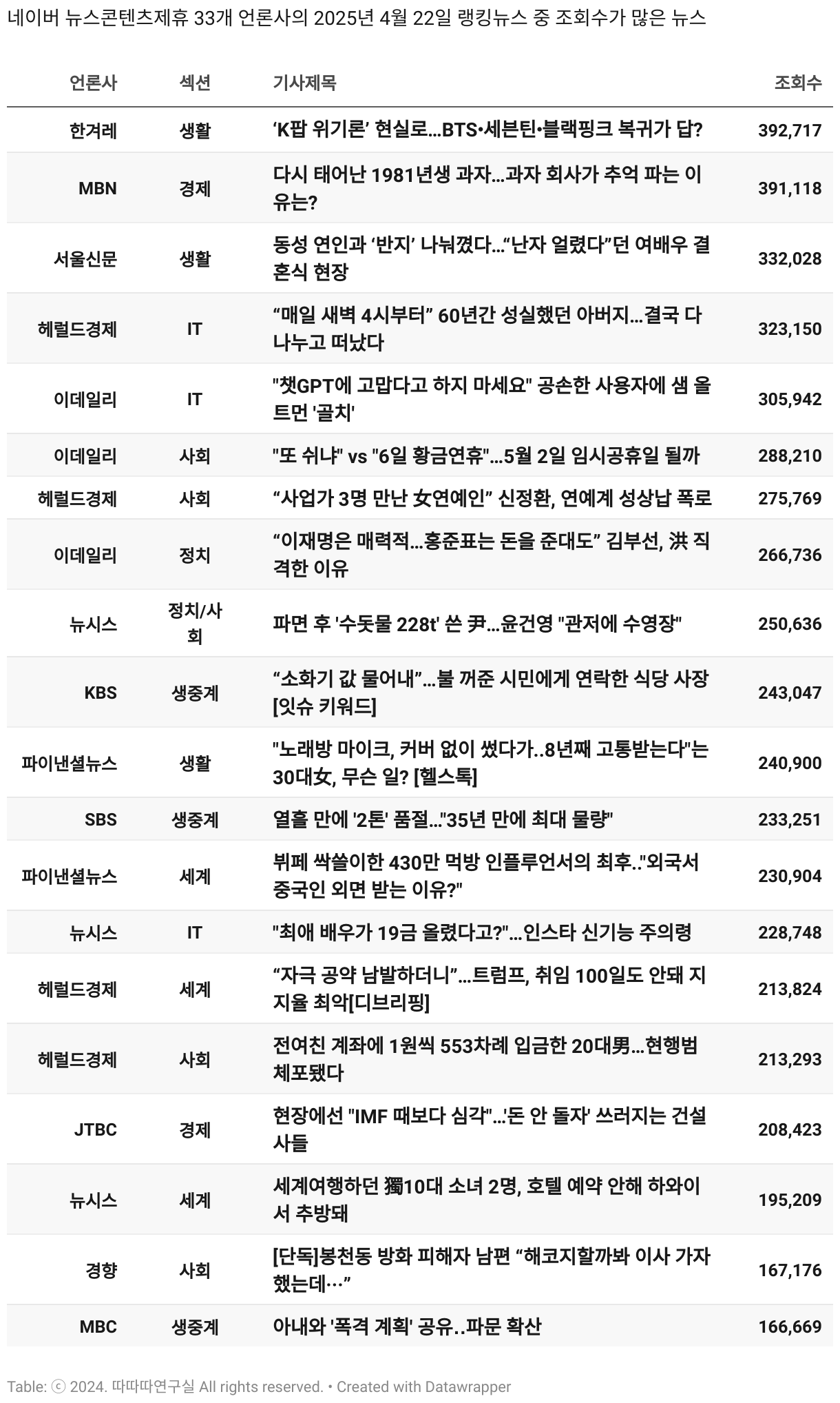 보도 시간대 기준 가장 흥한 기사 3건이 표시됩니다.